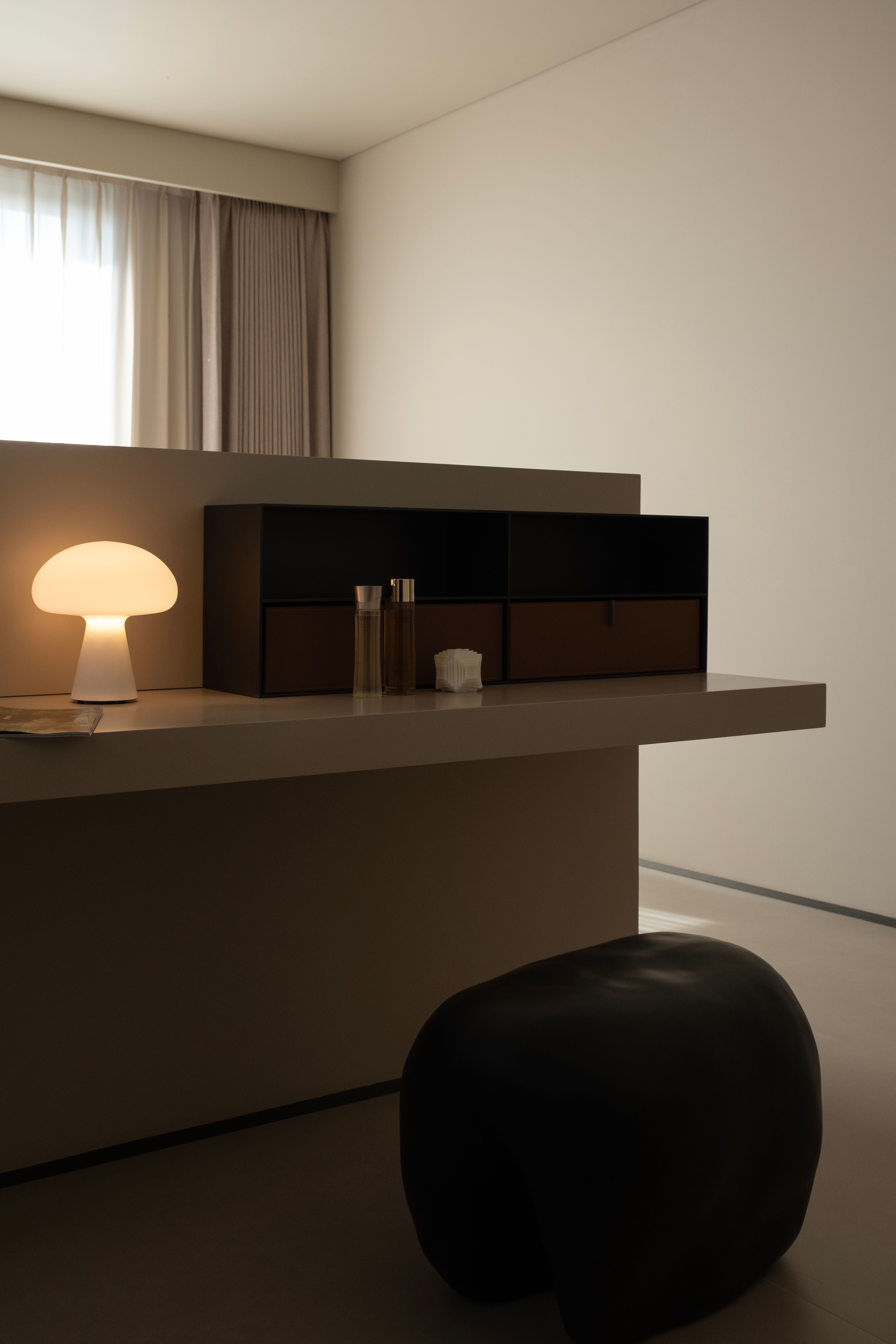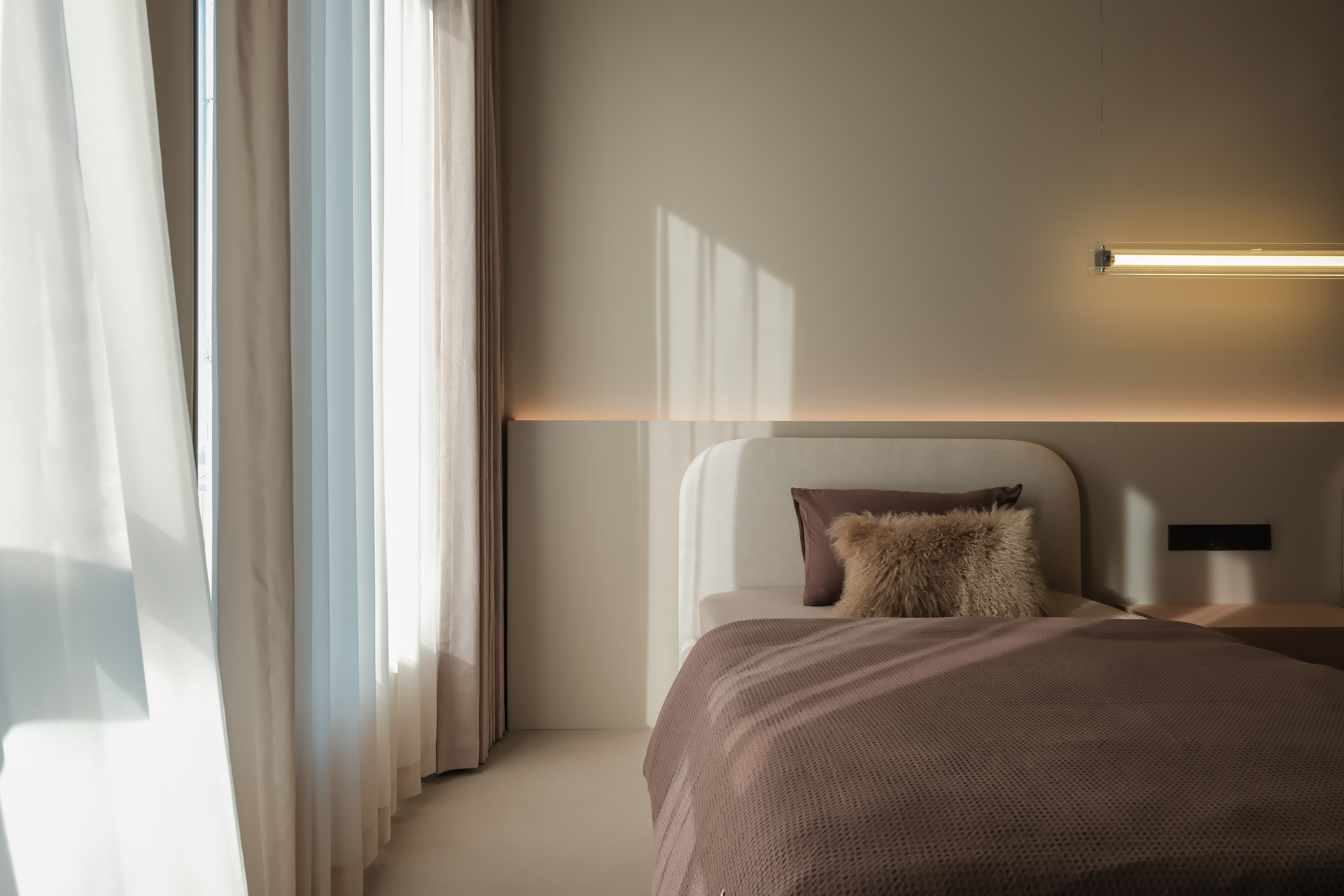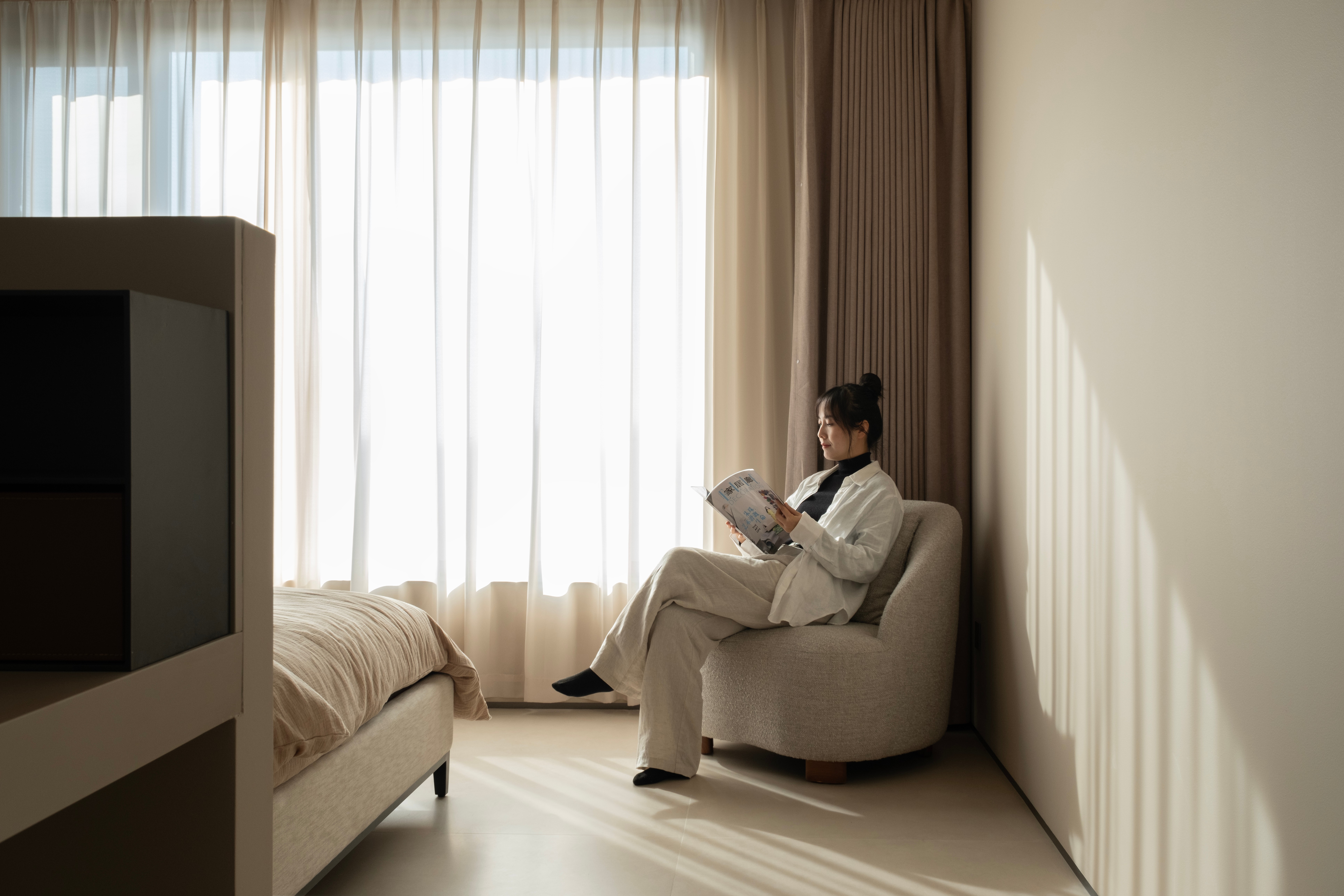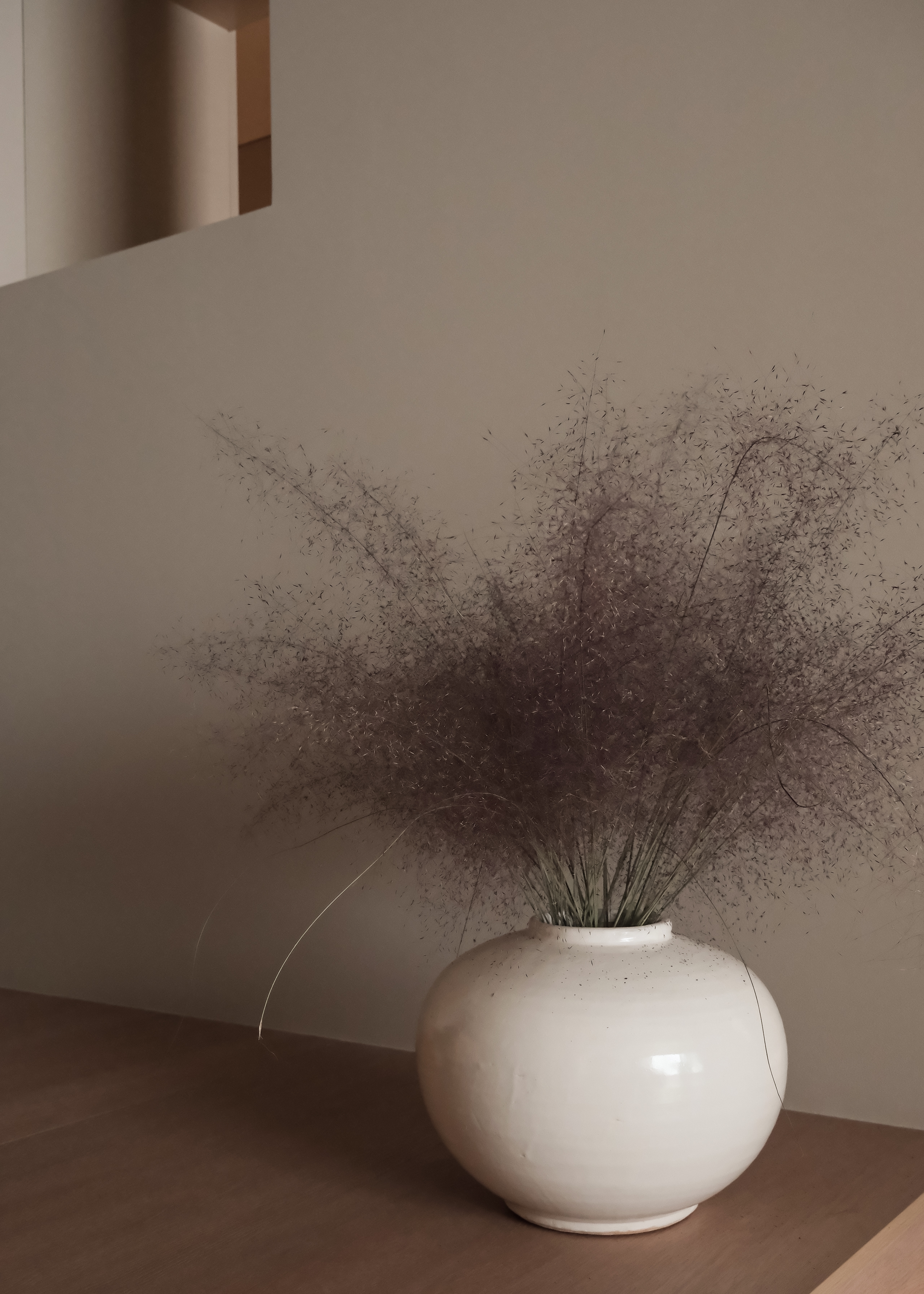 会客厅,从空间美学角度及功能性发想,兼顾到空间的温暖度和家的轻盈与轻松感,住宅中并没有皮质的家具。棉布及棉麻质地的织物面料出现在沙发、座椅等日常之物上,创造出温柔的使用场景。