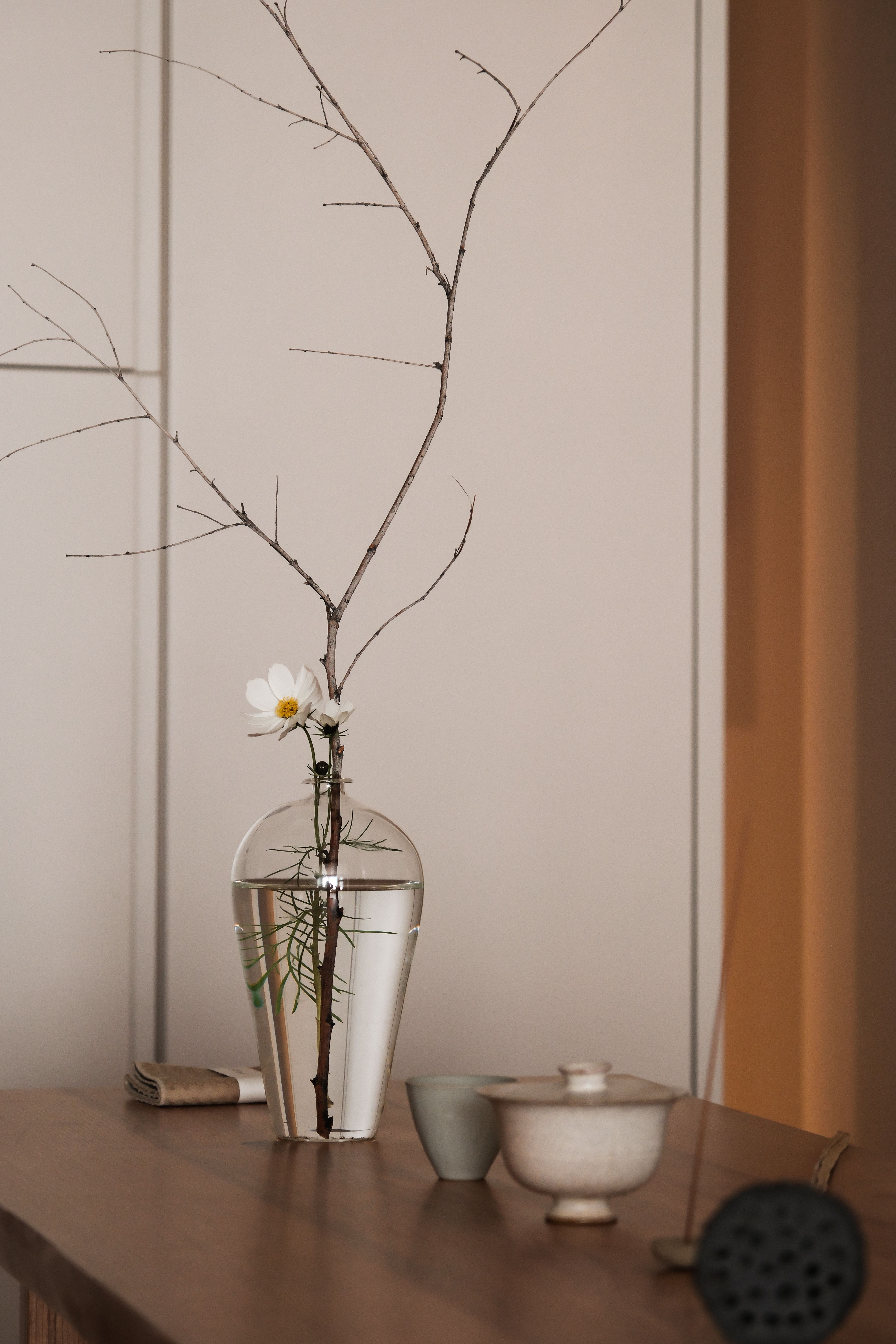 设计师亲自插花,从公园随手摘的树枝,还有格桑花。设计师李阳,亲自拍摄