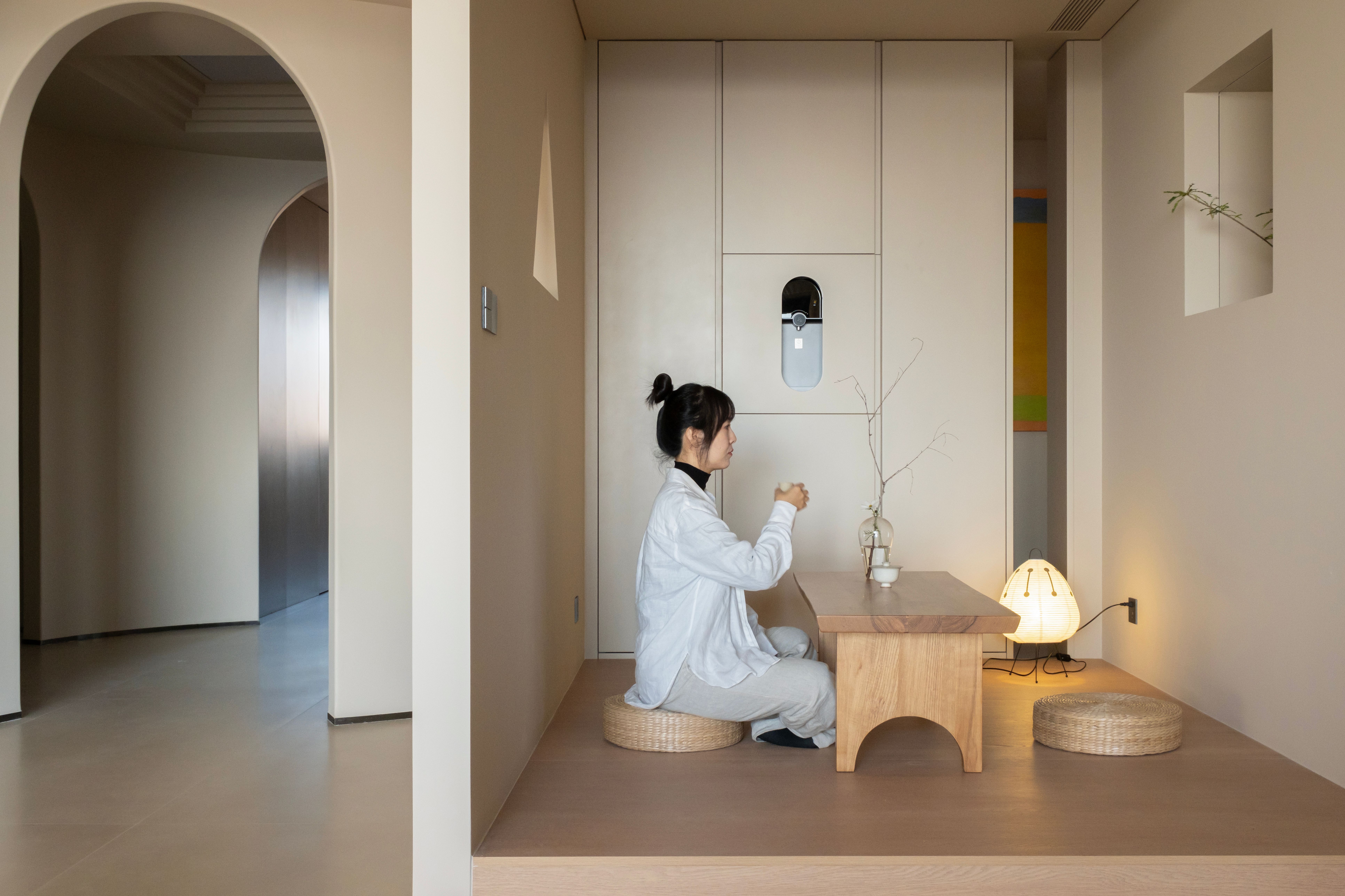 玄关,循门而入,木与漆之间,散发着自然温润的氛围。弧形的拱门,在虚与实之间构建新的空间秩序
