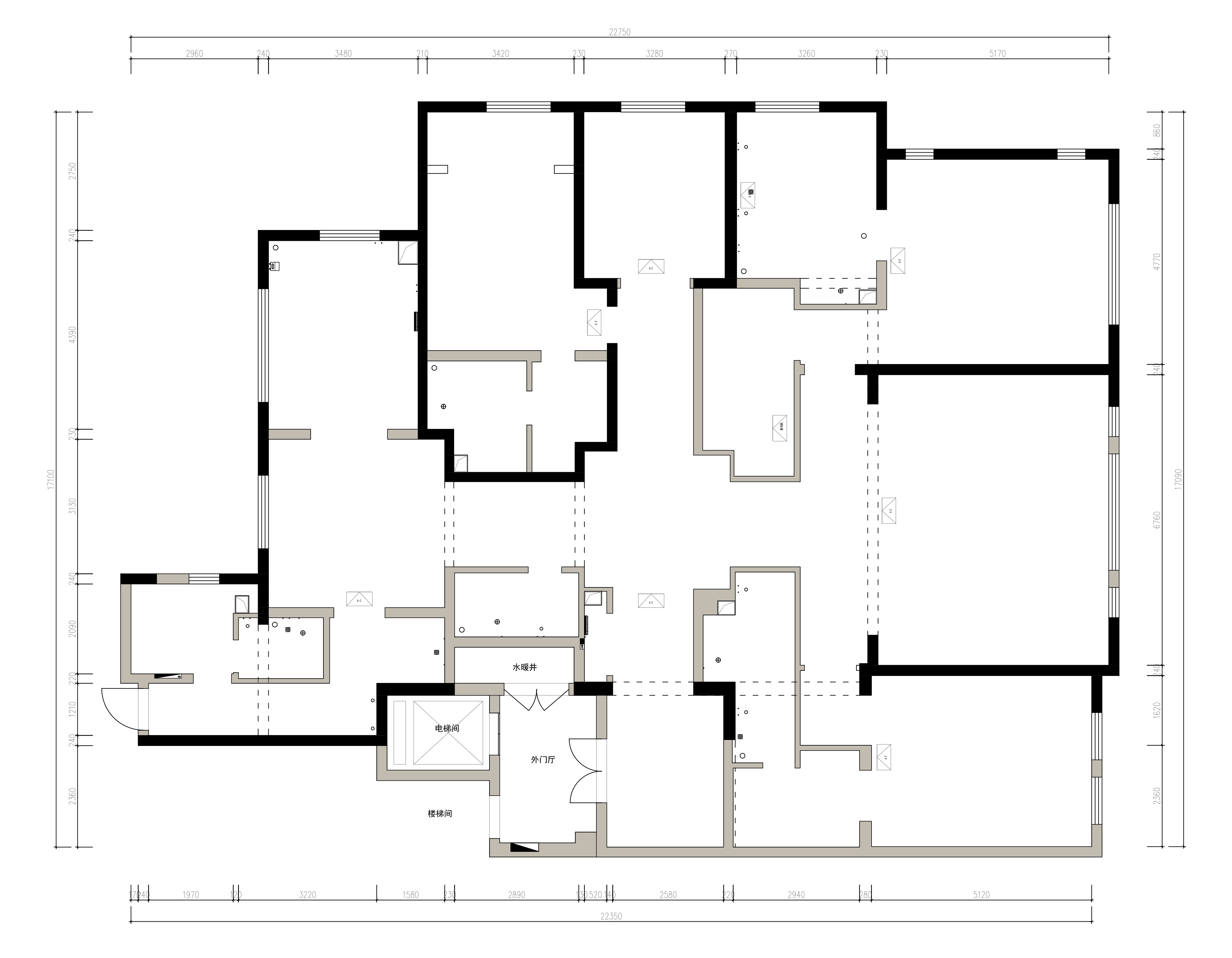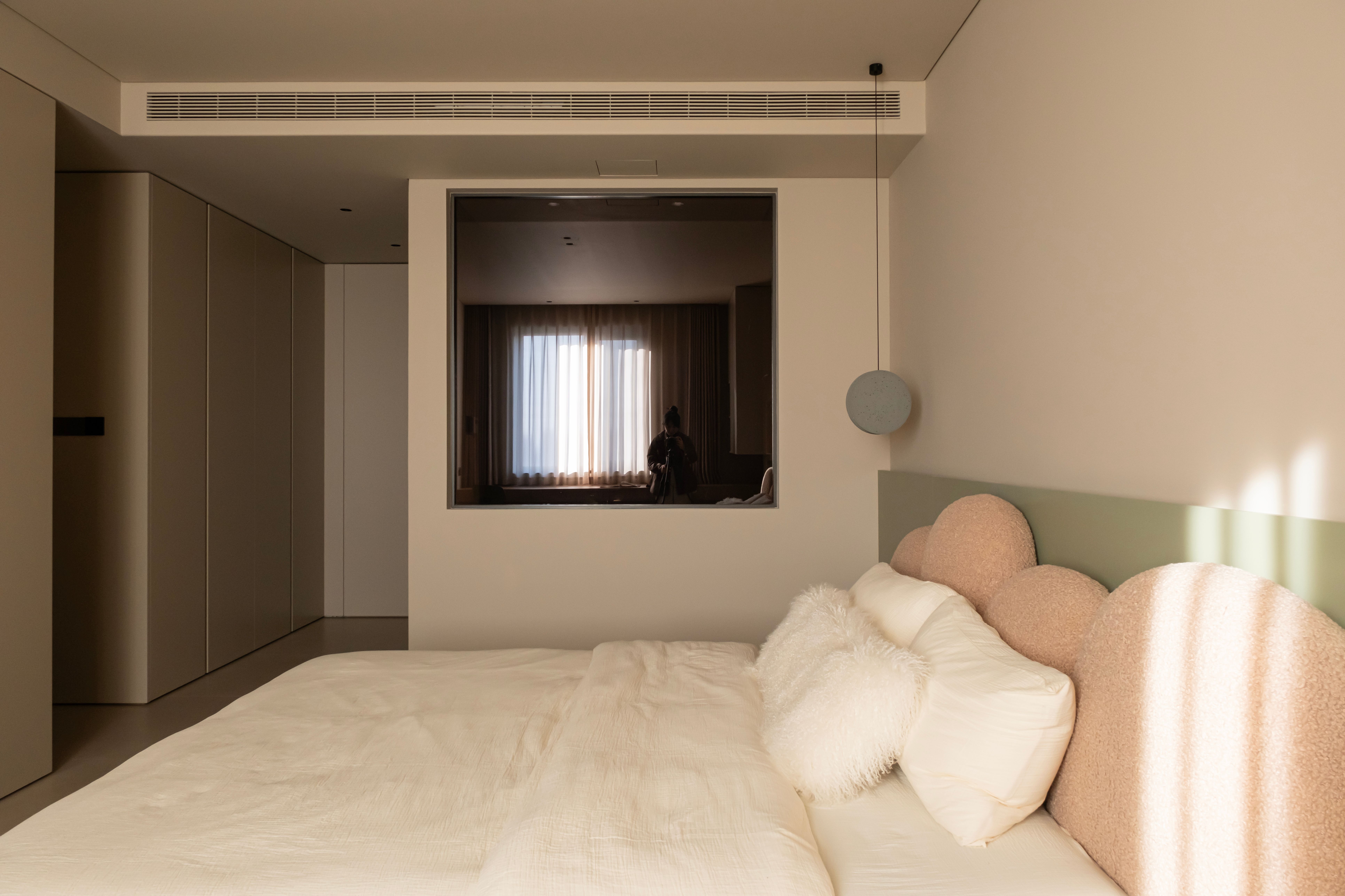 空间布局:为了破原始建筑格局的分隔模式,新的构思优化了布局上的限制,并加入优雅的线条,场所的物质性通过柔和的基调以及空间的艺术几何构成等形式来体现。打破传统的空间布局,拒绝单向动线,空间的动线都是以环绕型为主,双动线给空间带来了多样性,居住者有了更自由的功能方向。
