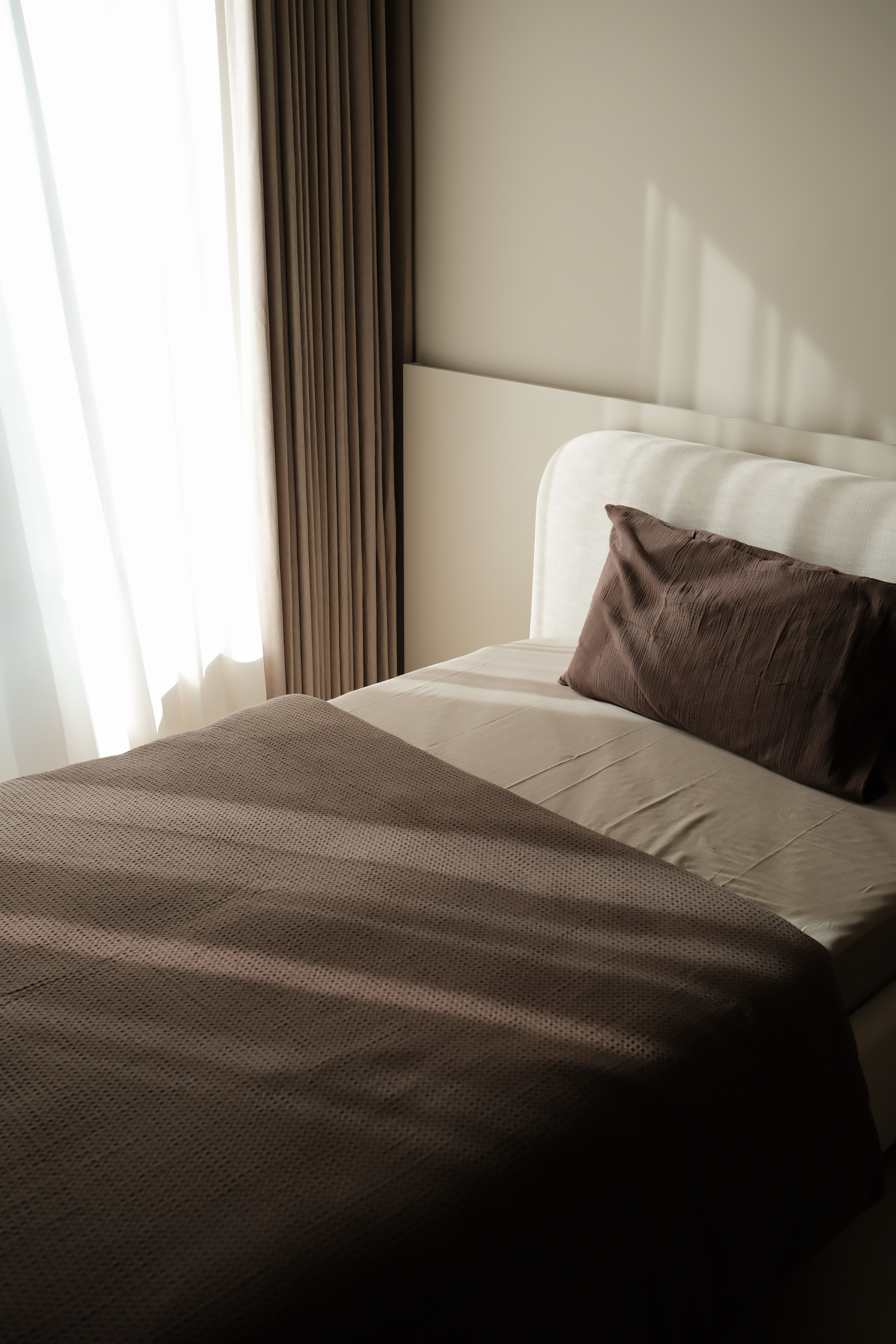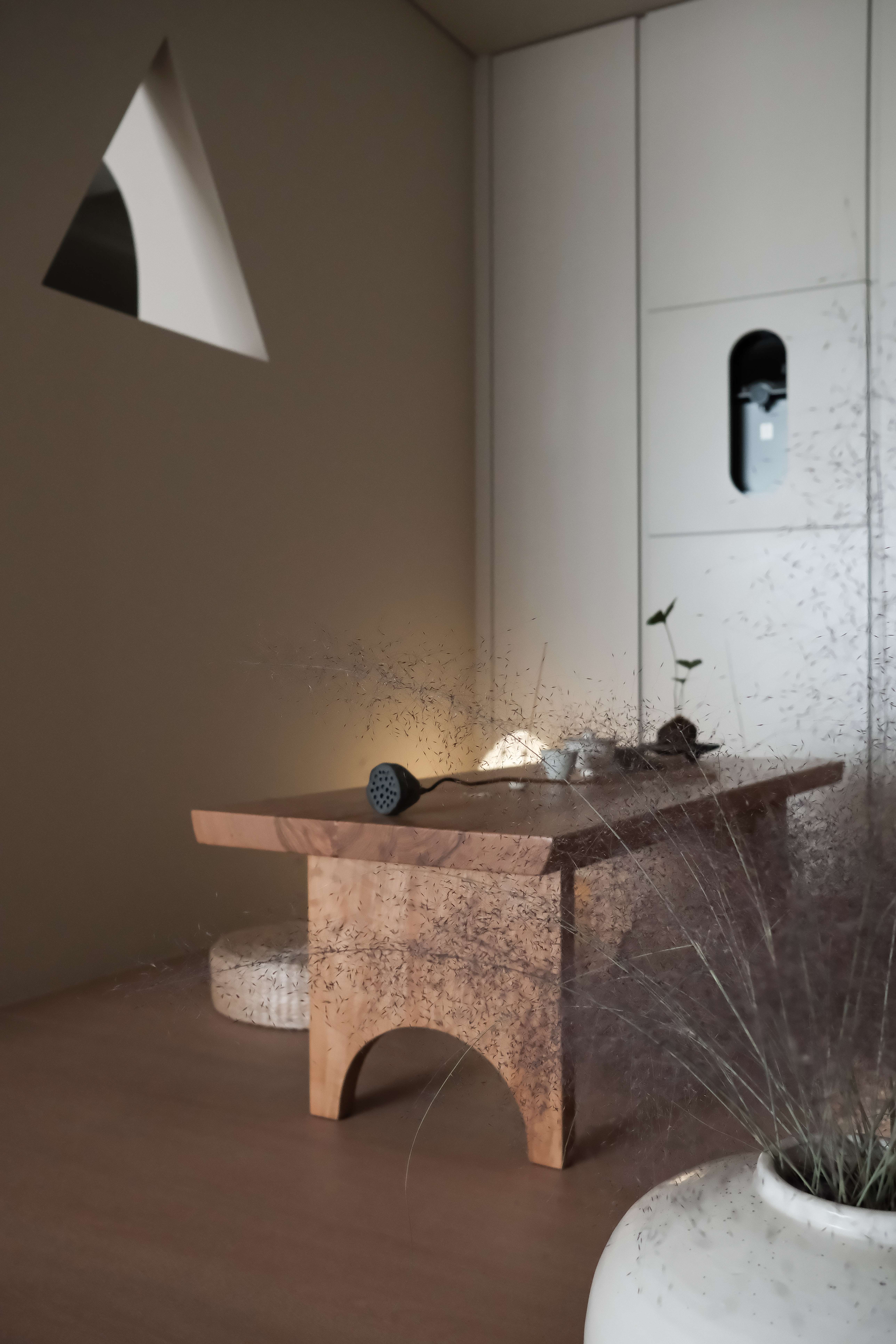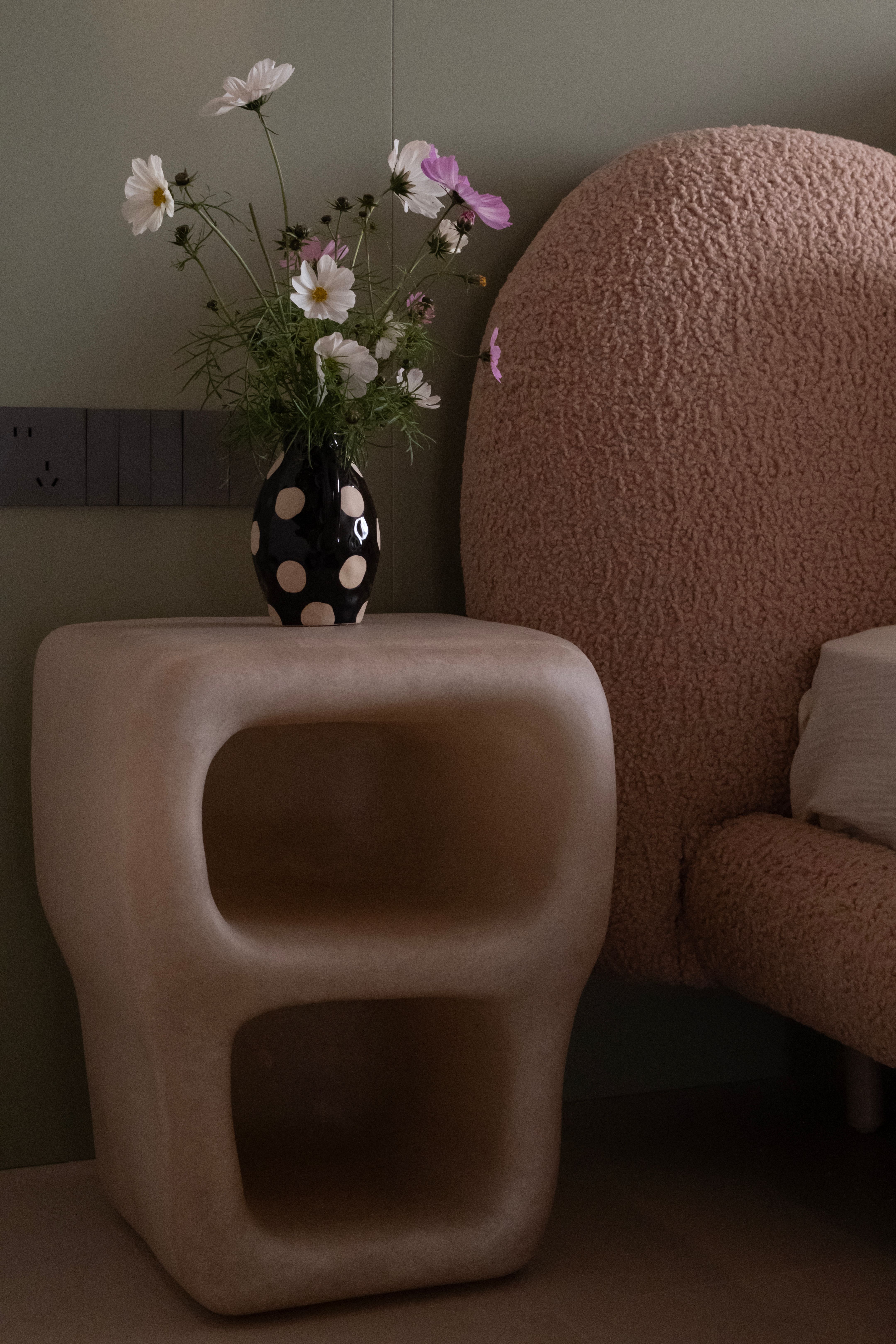 设计选材:从空间美学角度及功能性发想,兼顾到空间的温暖度和家的轻盈与轻松感,住宅中并没有皮质的家具,低碳环保的理念,软装多采用天然藤编及棉麻质地的织物面料出现在沙发、座椅等日常之物上,创造出温柔的使用场景,家具的单体也选择了以天然洞穴和人类智齿为主题的家具,更有可以循环利用可再生的材质,景观区我们跟业主一起造景,成本不到300元,石头是业主从贺兰山下挑选的,吸取了天地日月之精华的石头让我们得景观区更天然,就像把大自然搬进家里一样,花艺也是我们在公园采的格桑花和粉黛乱子草,因为天气马上冷了,这些花也可以发挥它们最后的力量,为我们的空间增添了色彩和浪漫,我一直认为减少浪费和节省预算成本并不矛盾冲突。