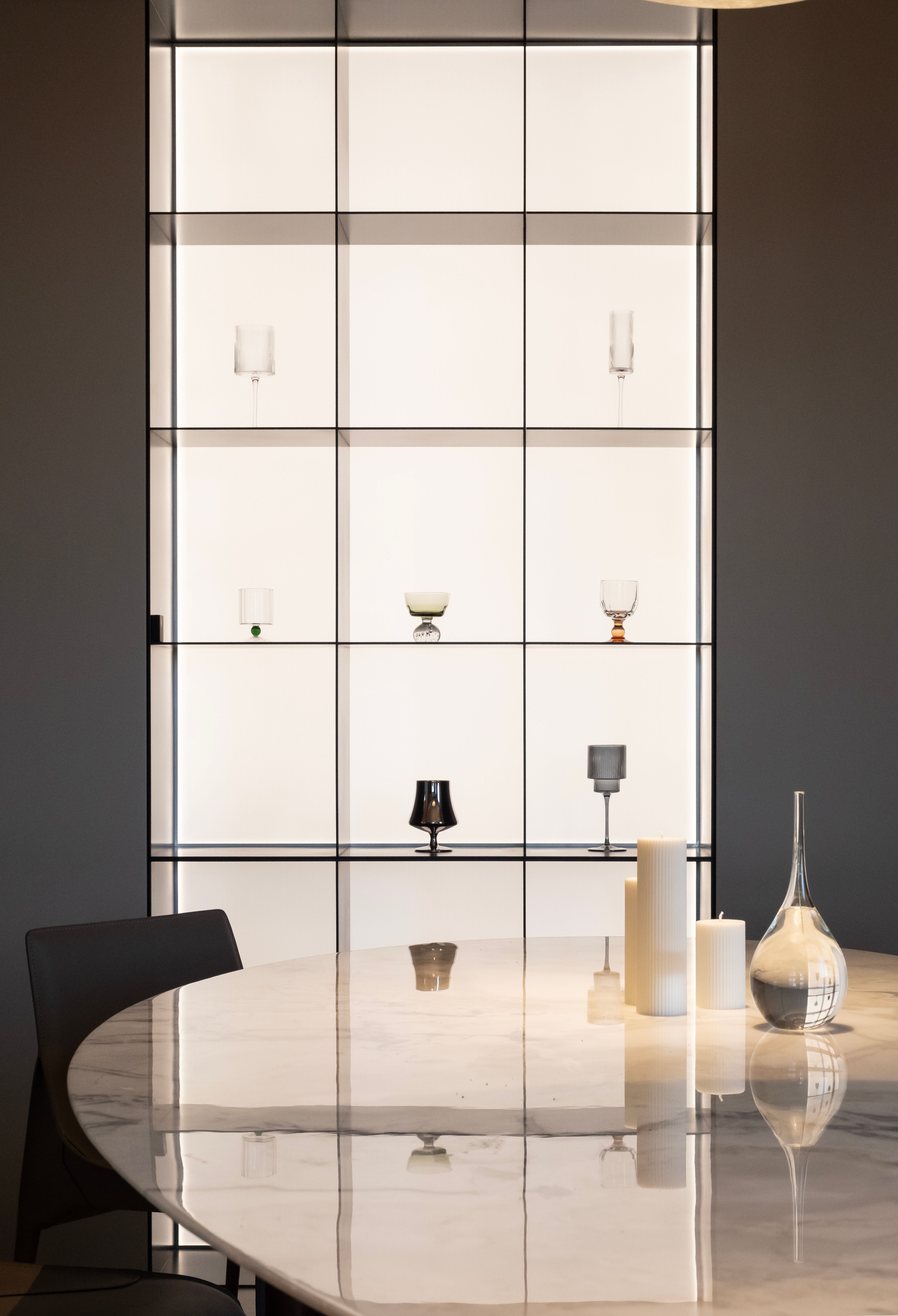 餐厅,在空间规划中充分考虑业主一家多样性需求,设计独立的中式厨房和餐厅一体的西厨空间,为生活预留更多可能性。弧形的餐桌与吊顶让空间达到一种微妙的呼应,呈现出柔性的视觉美感。