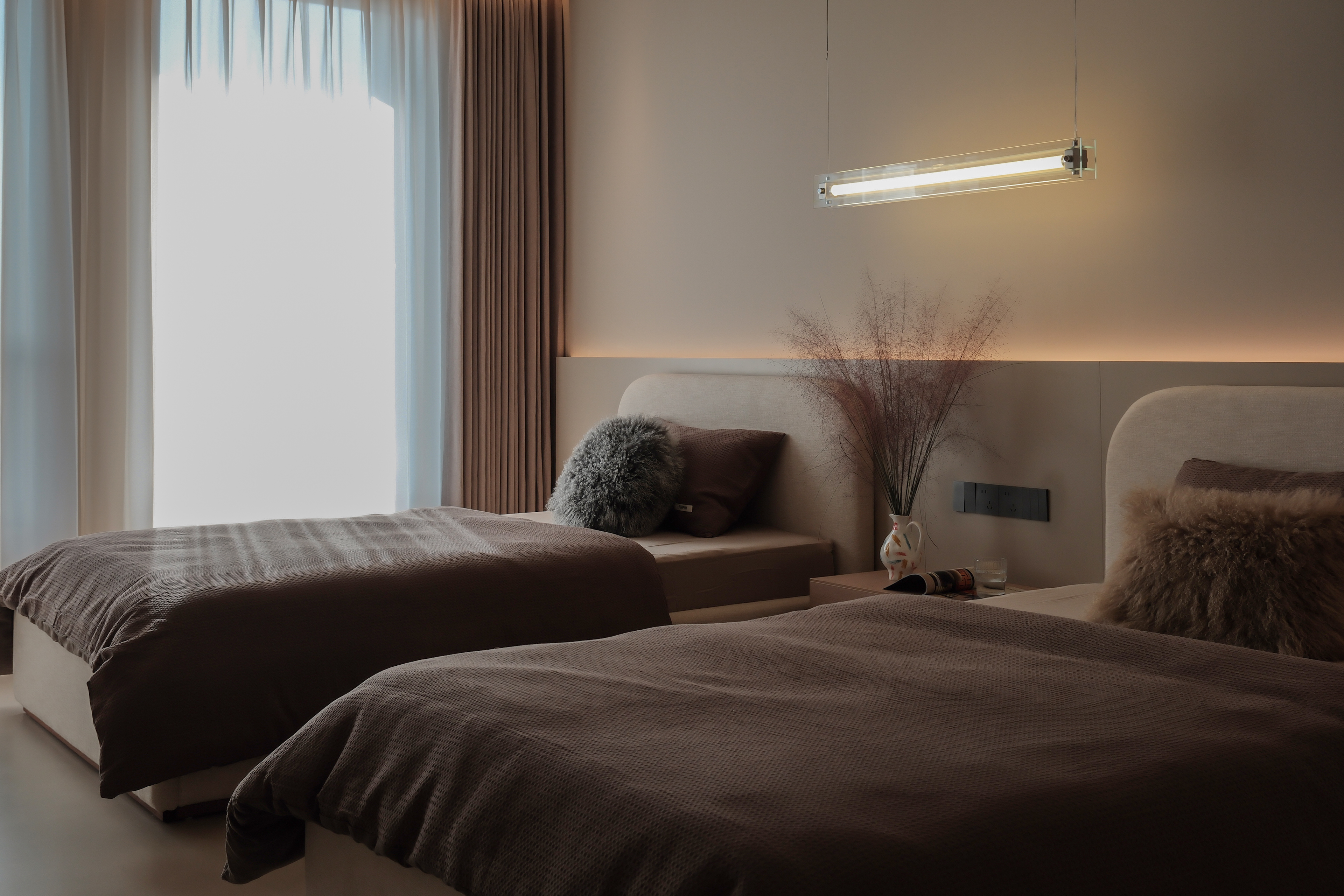 儿童房,打破墨守成规的的设计,当玉色撞上兰苕色,让孩童的梦留下无限的想象与创造力。单品的搭配,灵动的灯饰造型,颜色的构造,在给孩子创造童年的同时又留下了无限的想象力。