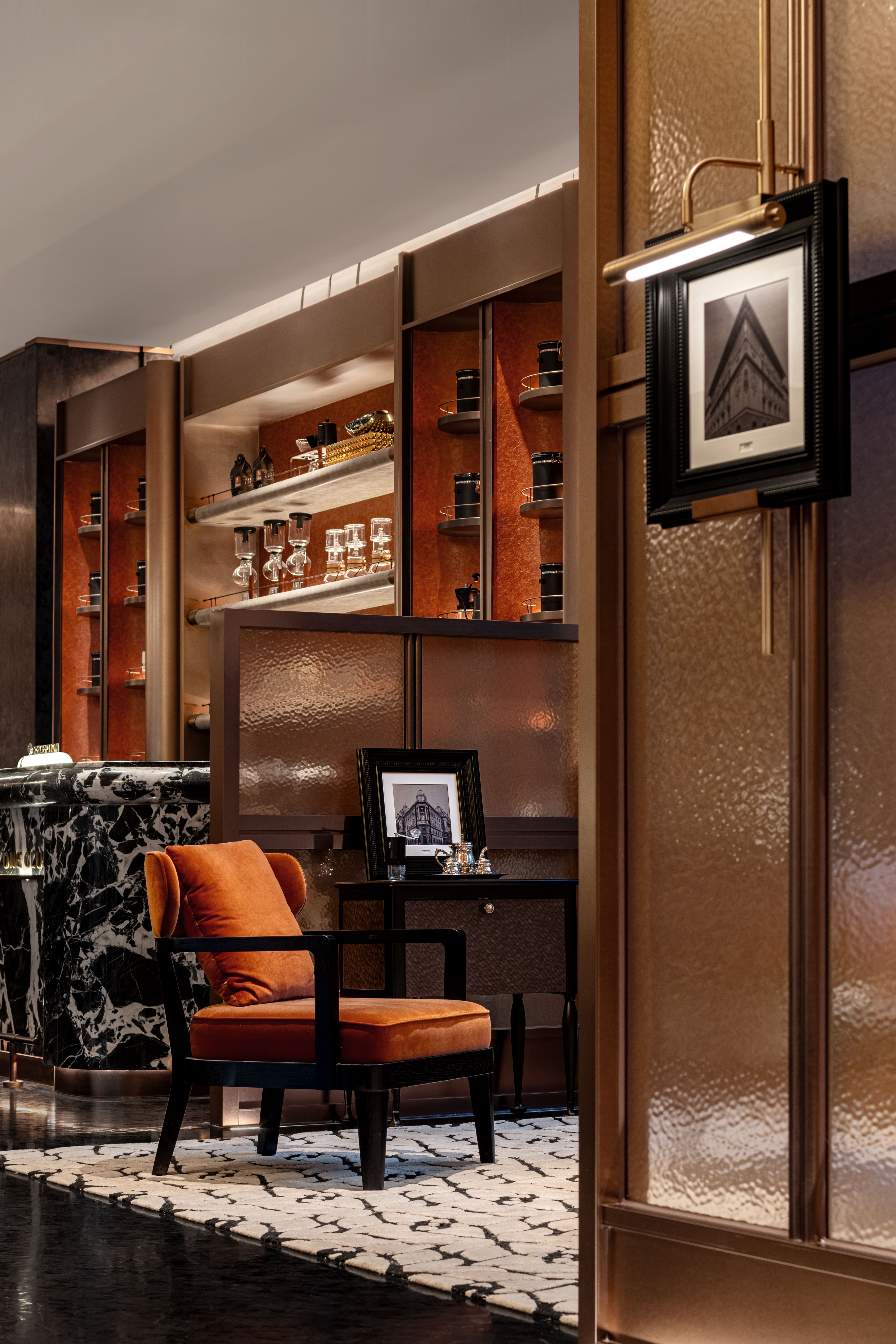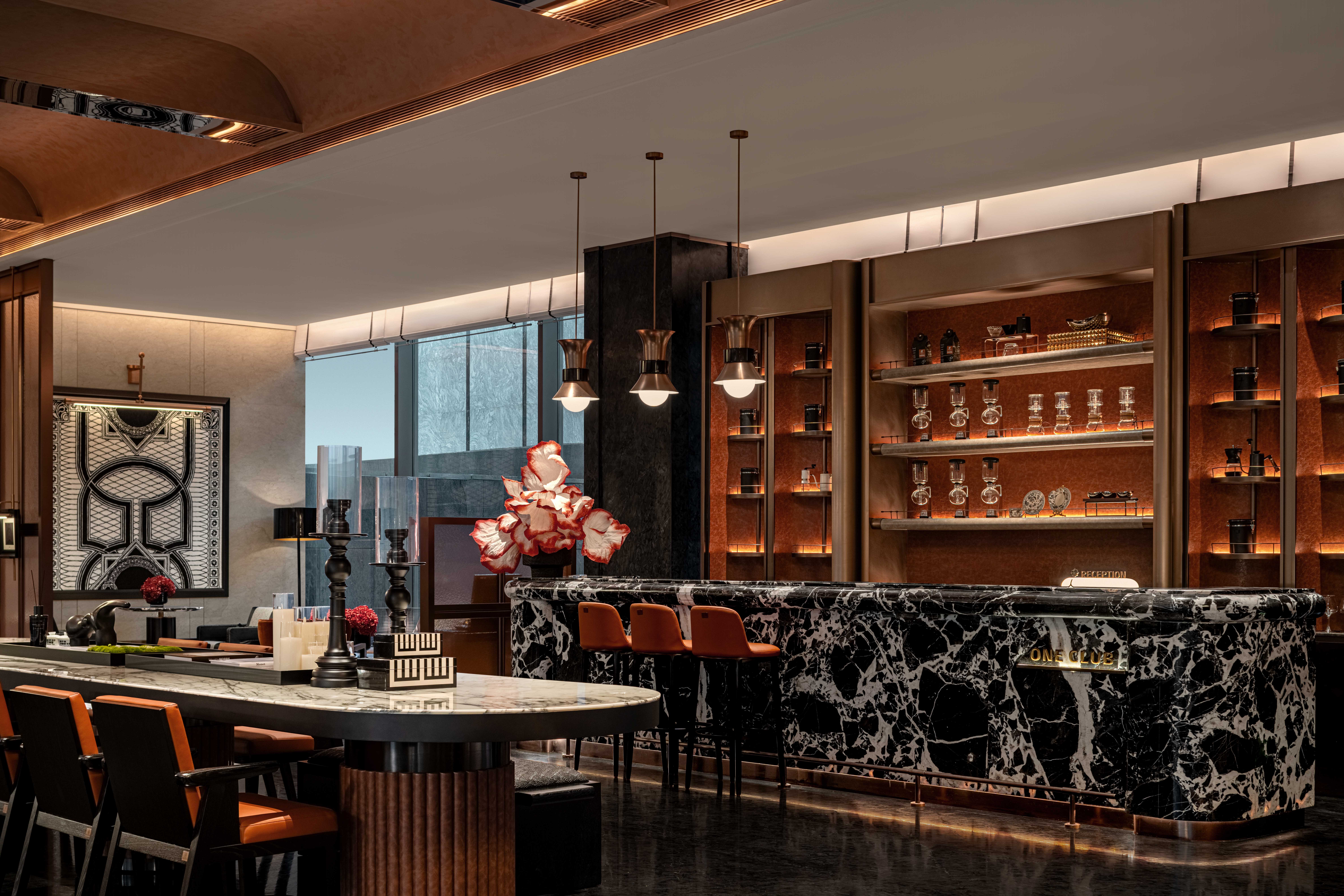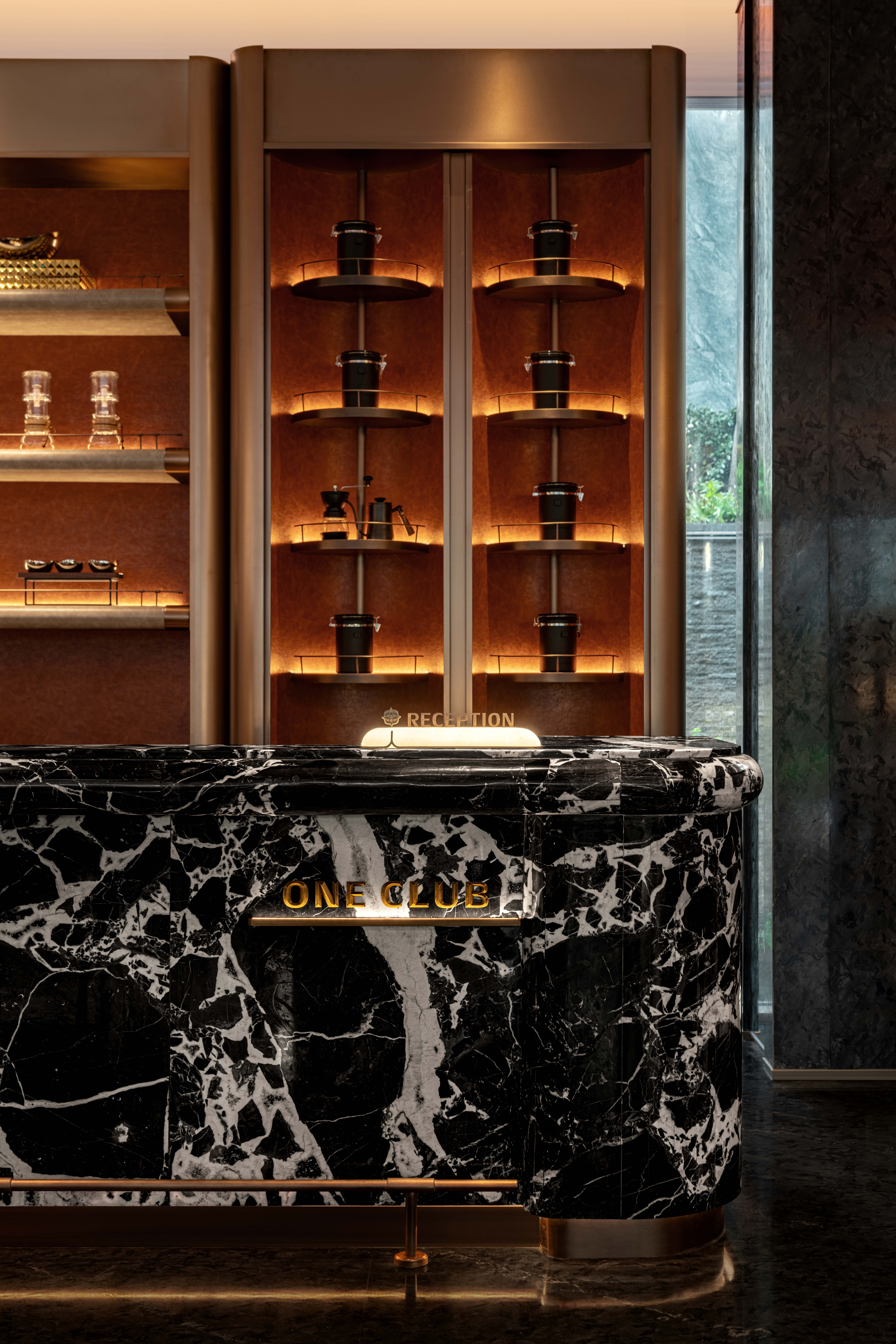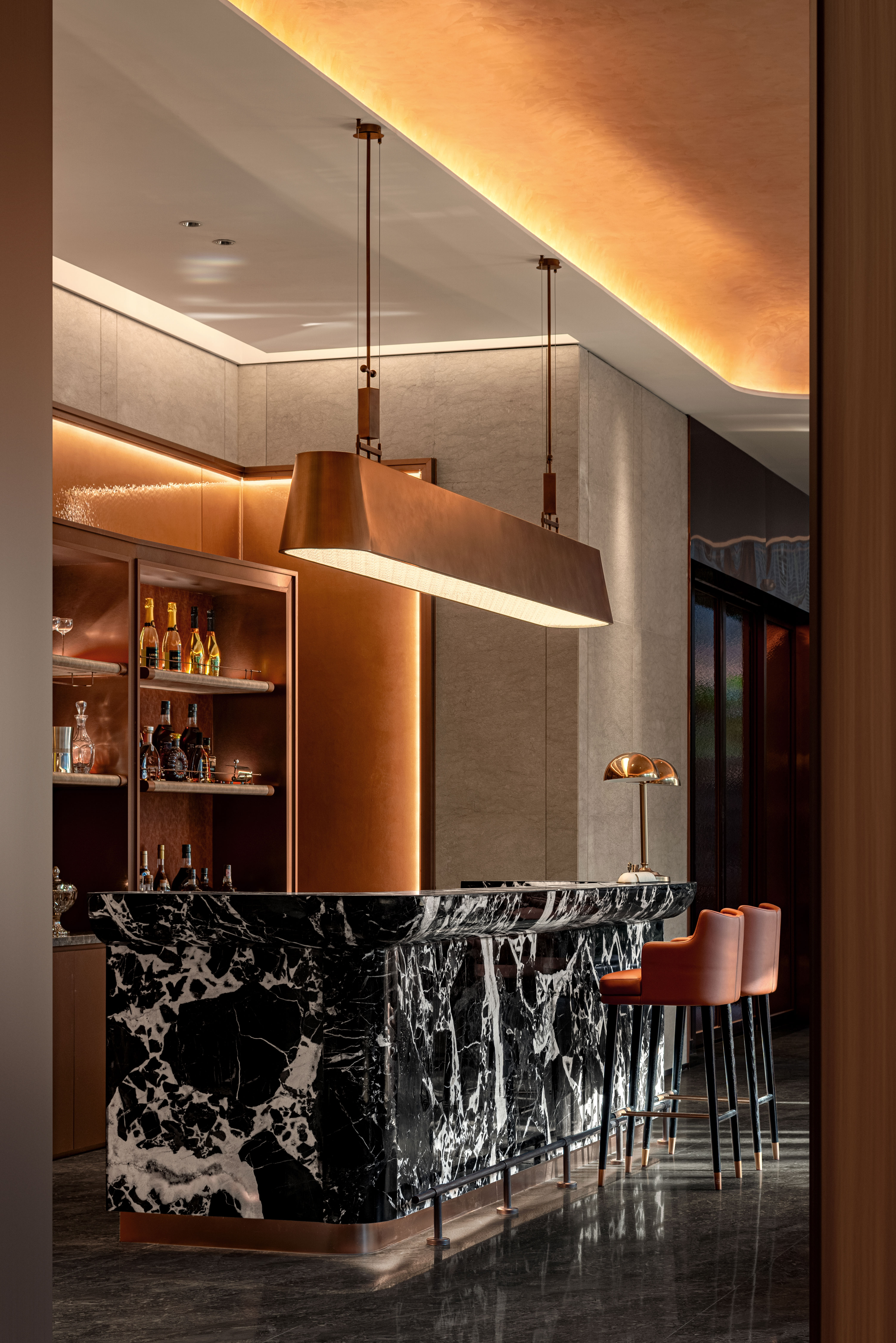 设计选材:通过排列有序的陈列区与展示墙,咖啡与美酒文化交织呈现,墙面米色石材与古铜金属细节巧妙呼应,水吧台选用宝格丽黑奢华石材,低调中透显奢华质感。