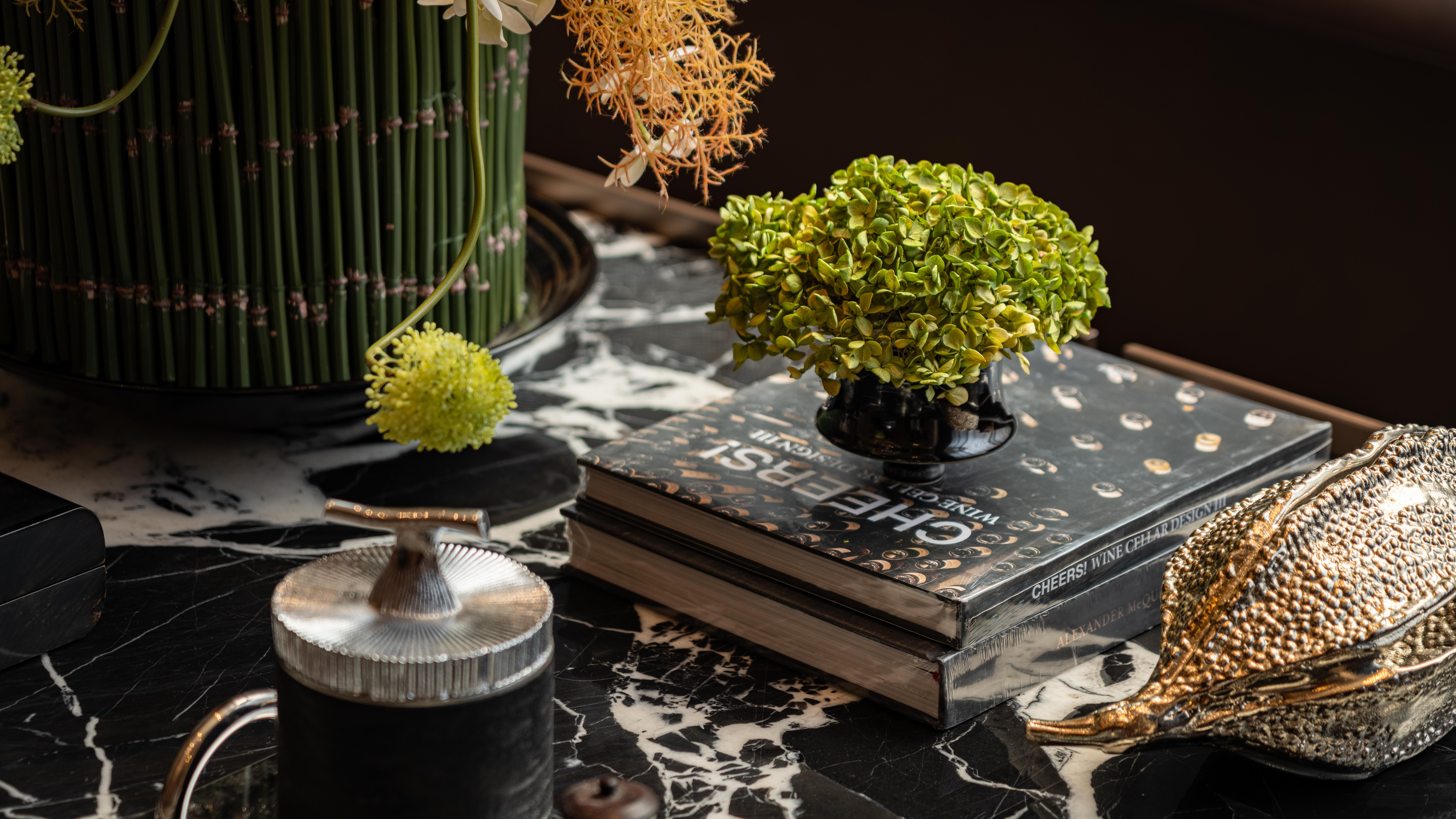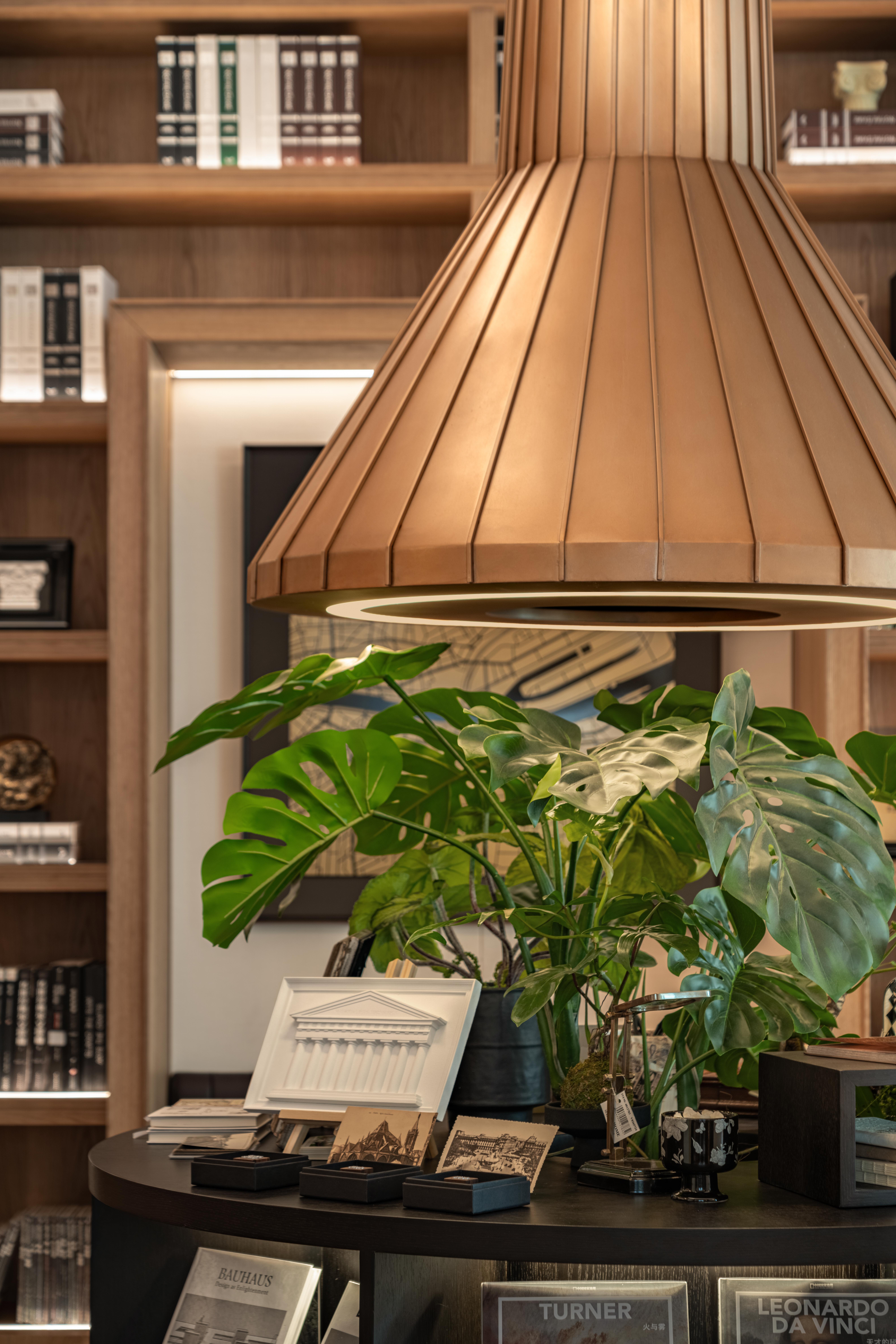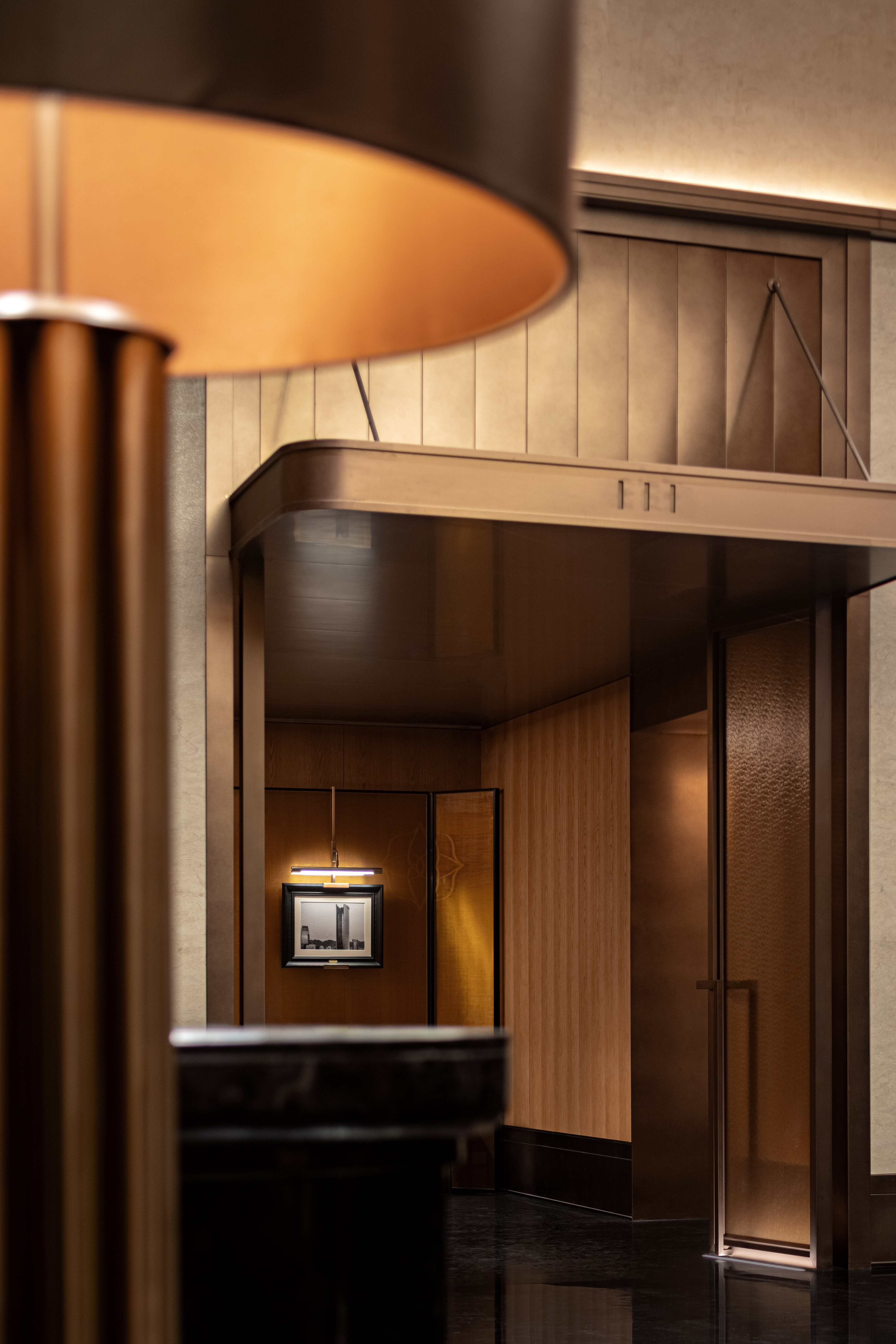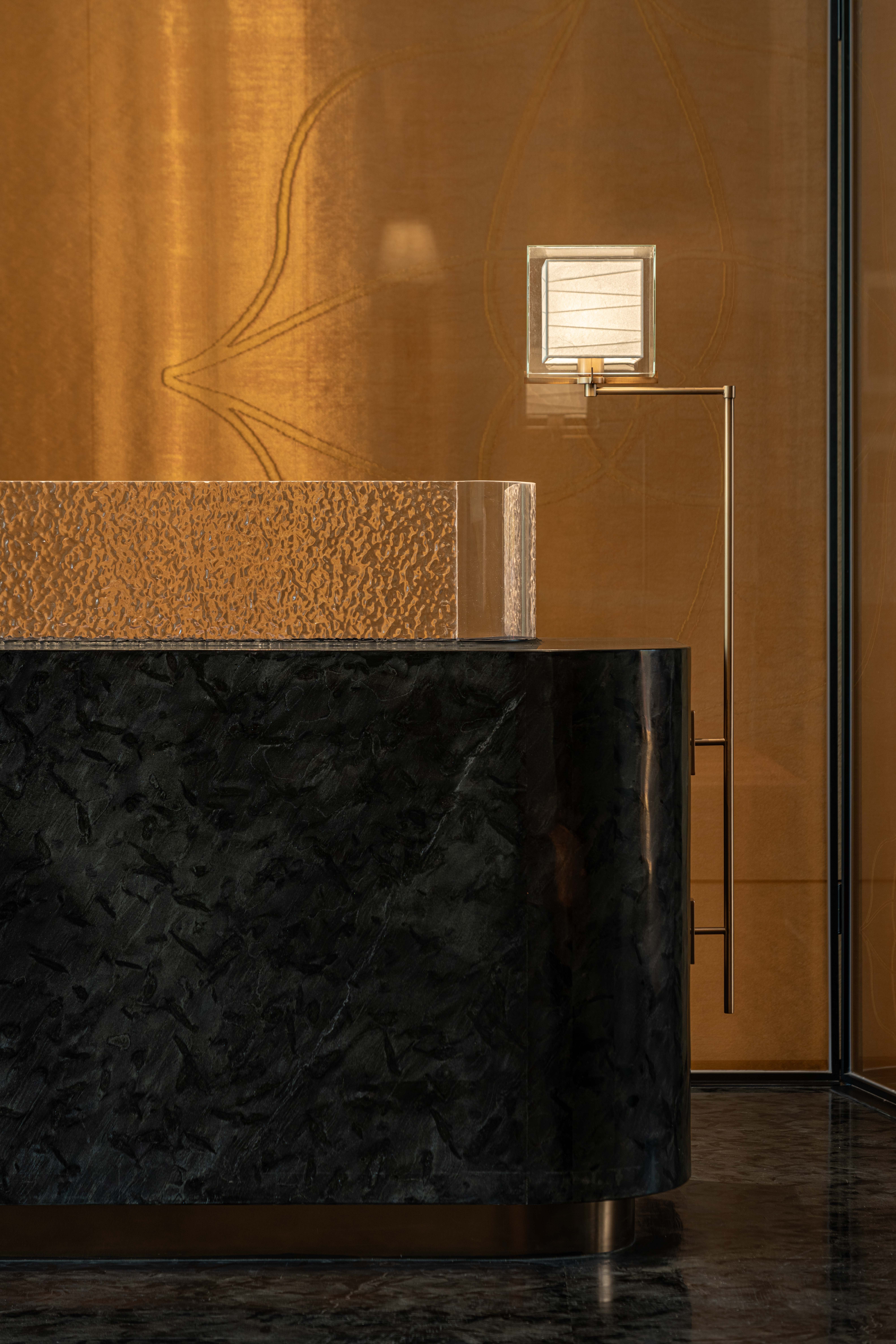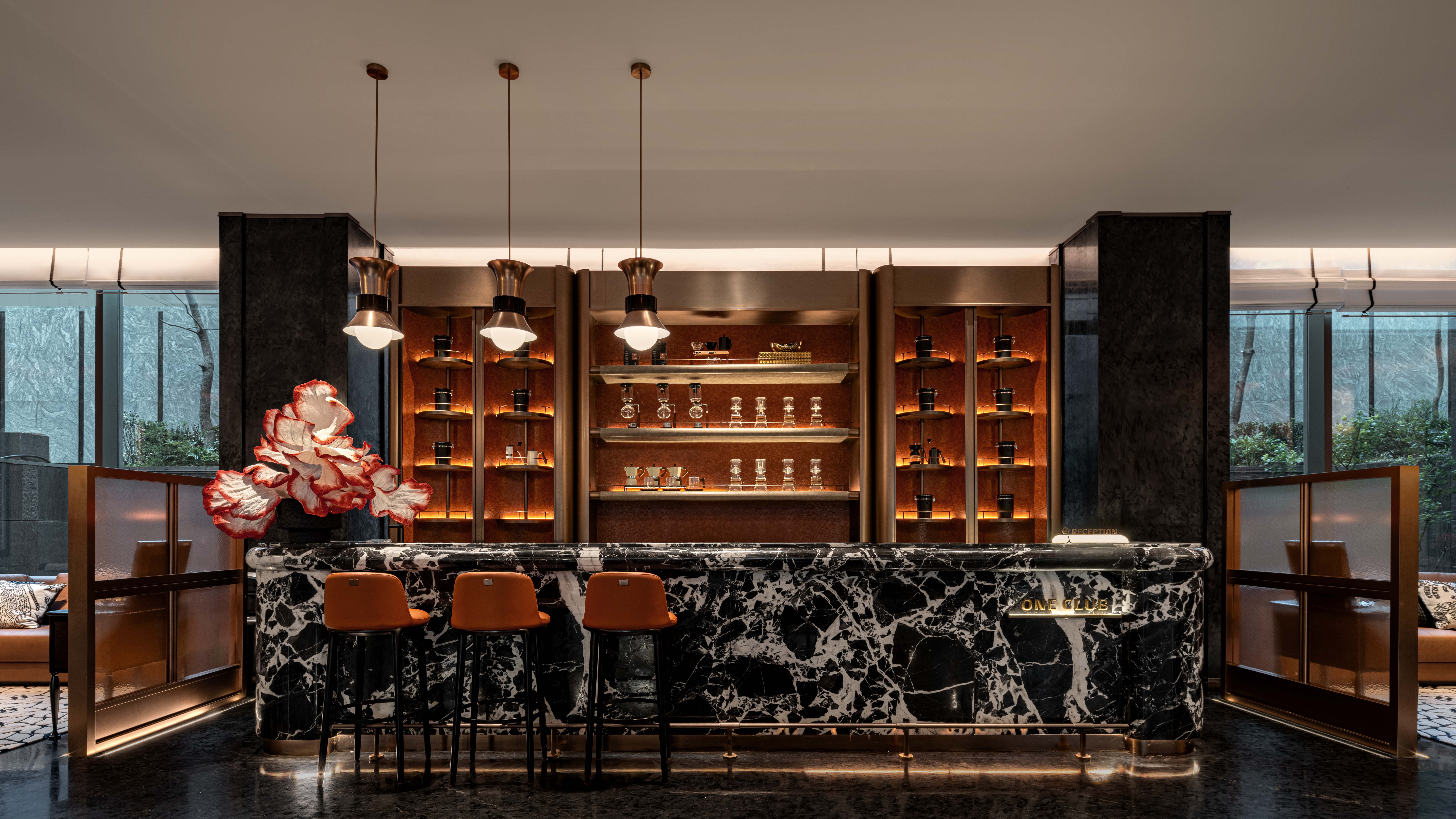 设计选材:通过排列有序的陈列区与展示墙,咖啡与美酒文化交织呈现,墙面米色石材与古铜金属细节巧妙呼应,水吧台选用宝格丽黑奢华石材,低调中透显奢华质感。