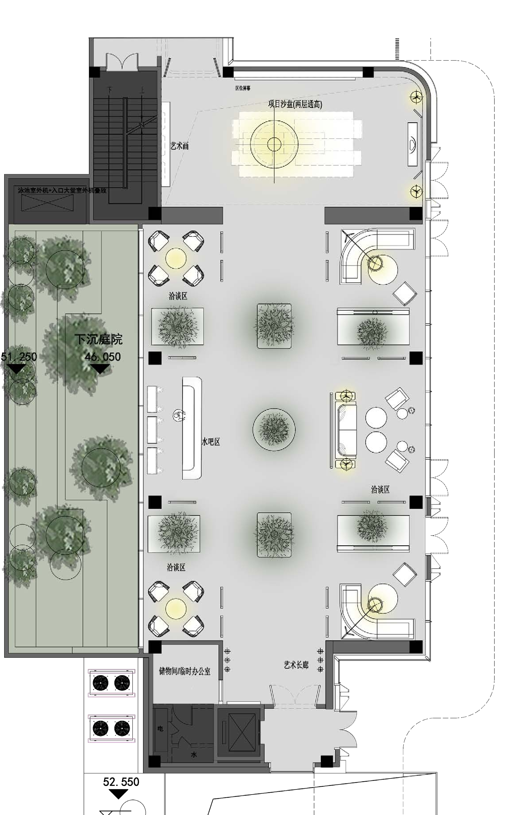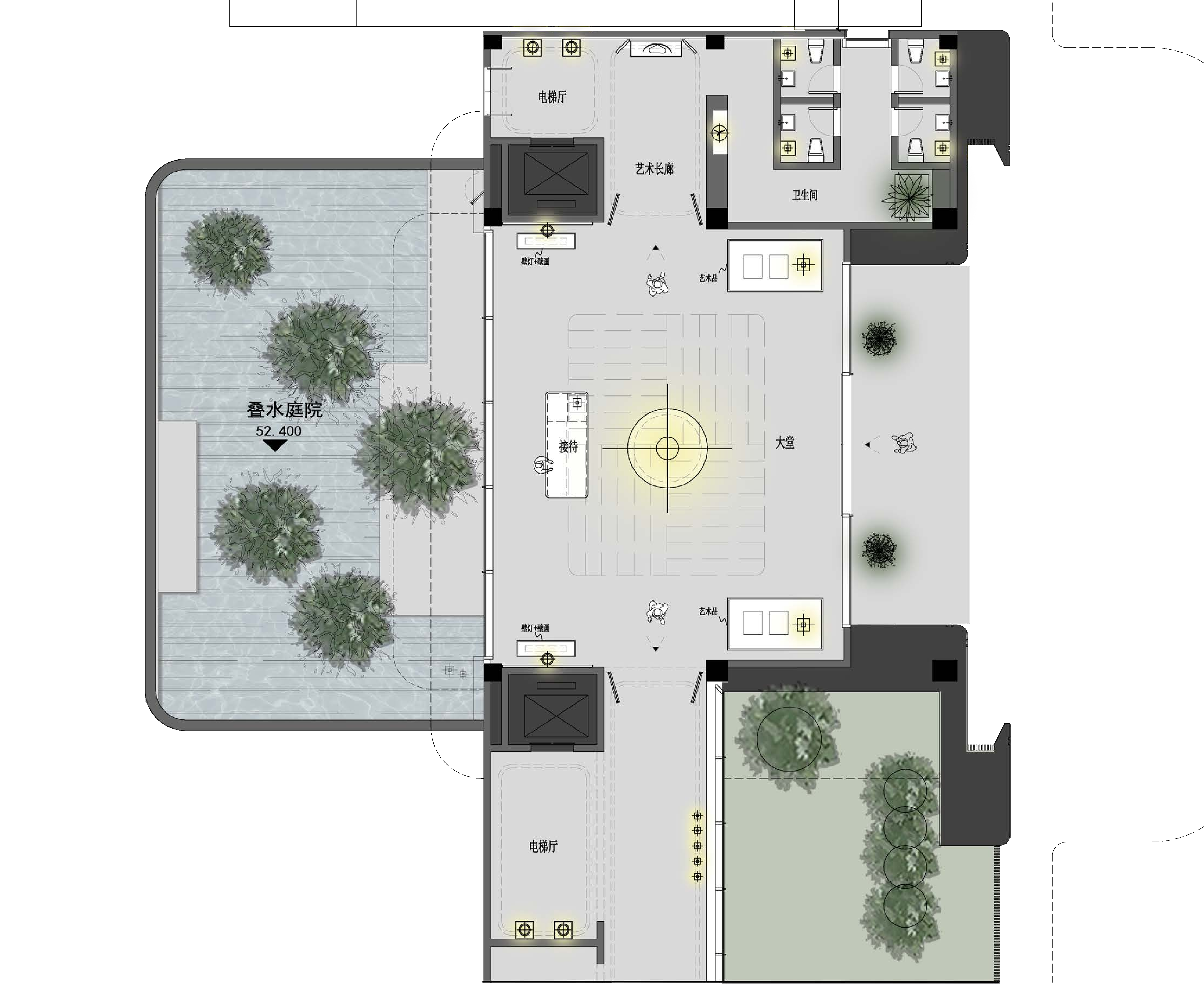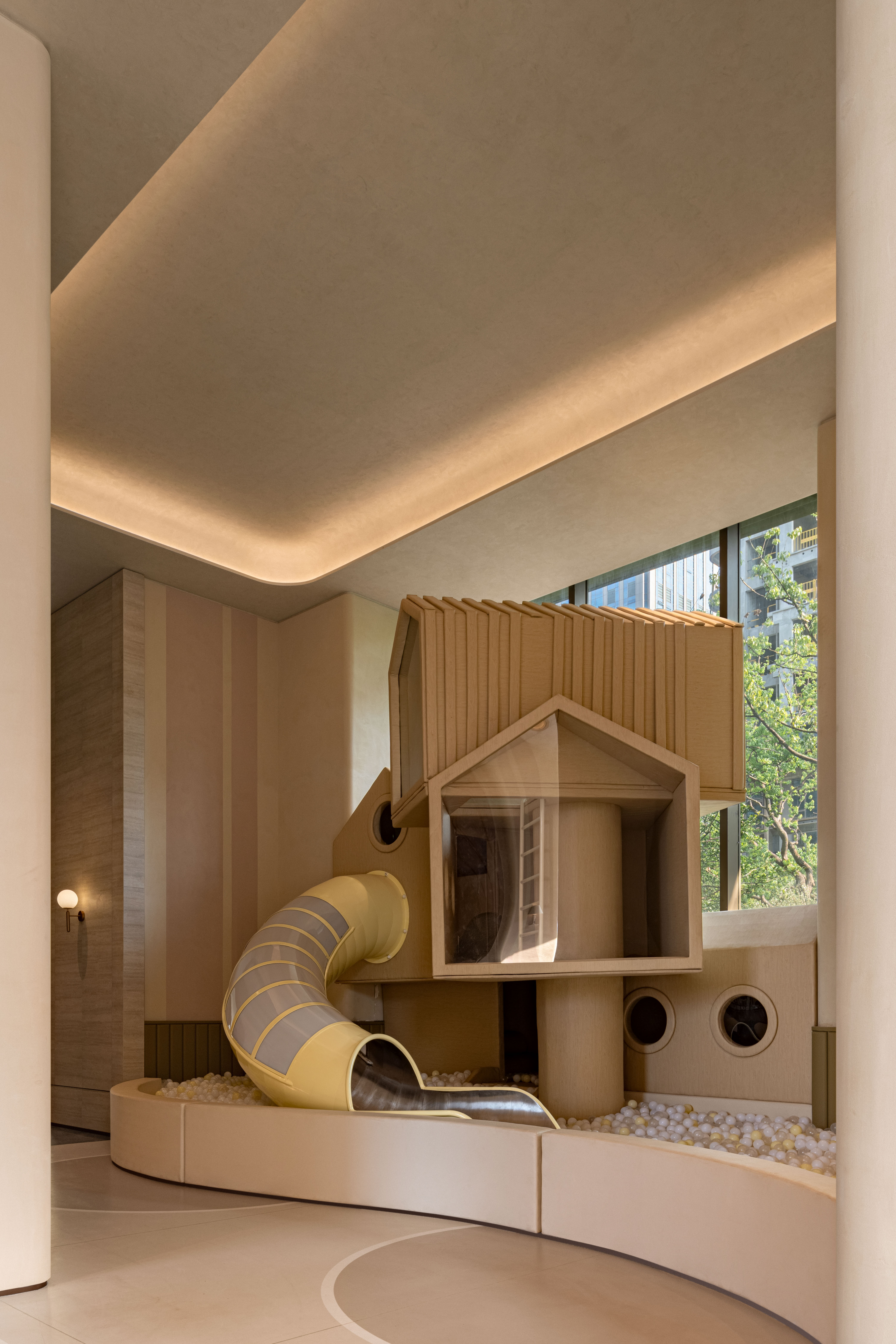 以功能对空间做分区,在社交艺术会所内还打造了私宴厅、悦读空间、业主会议厅、童趣单元等多个艺术主题空间。