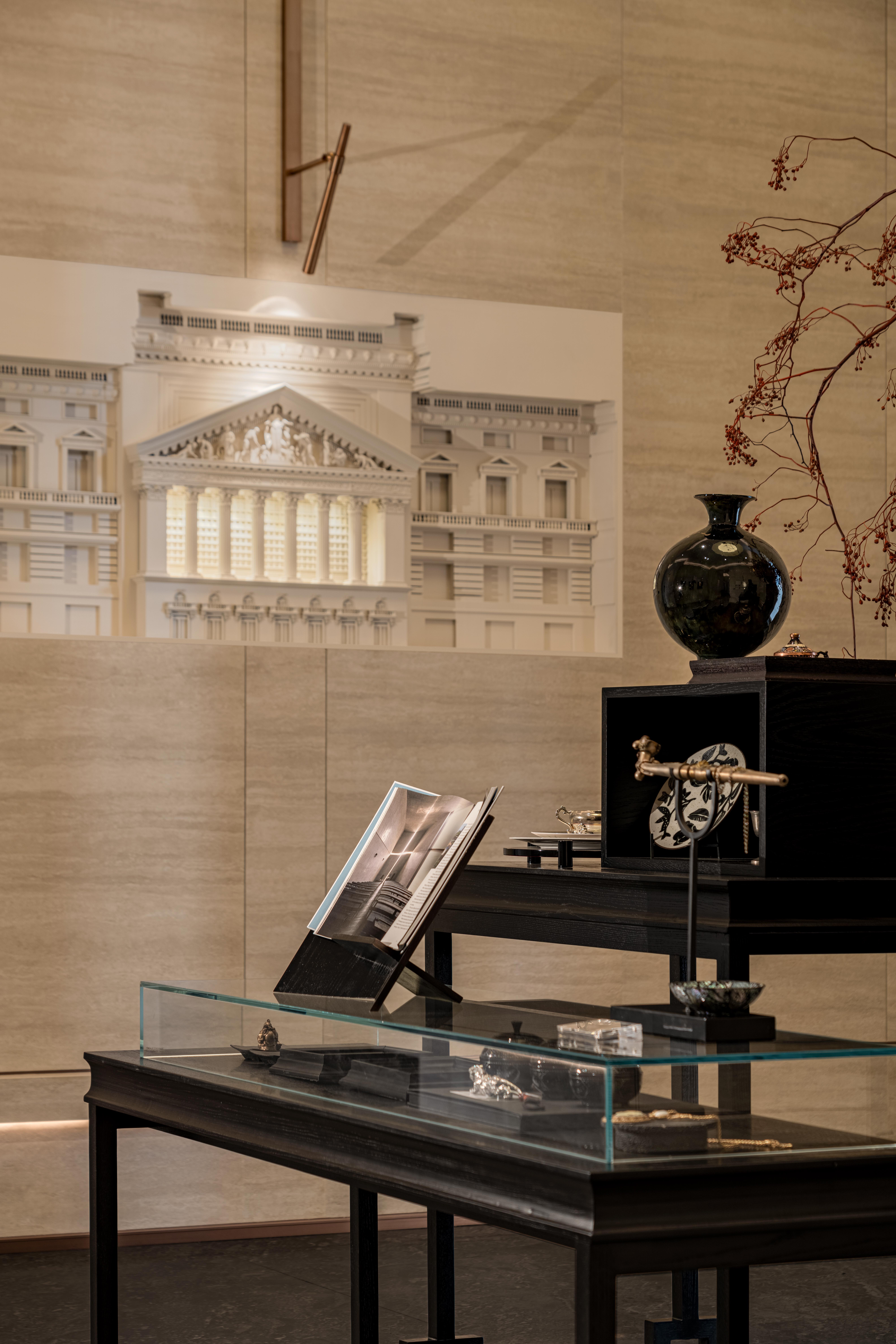 墙体两侧通过石雕的形式雕琢了纽约证券交易所以及英格兰银行的外形,展台中陈列了陶瓷、银器、发饰珠宝等金融时期的西洋藏品