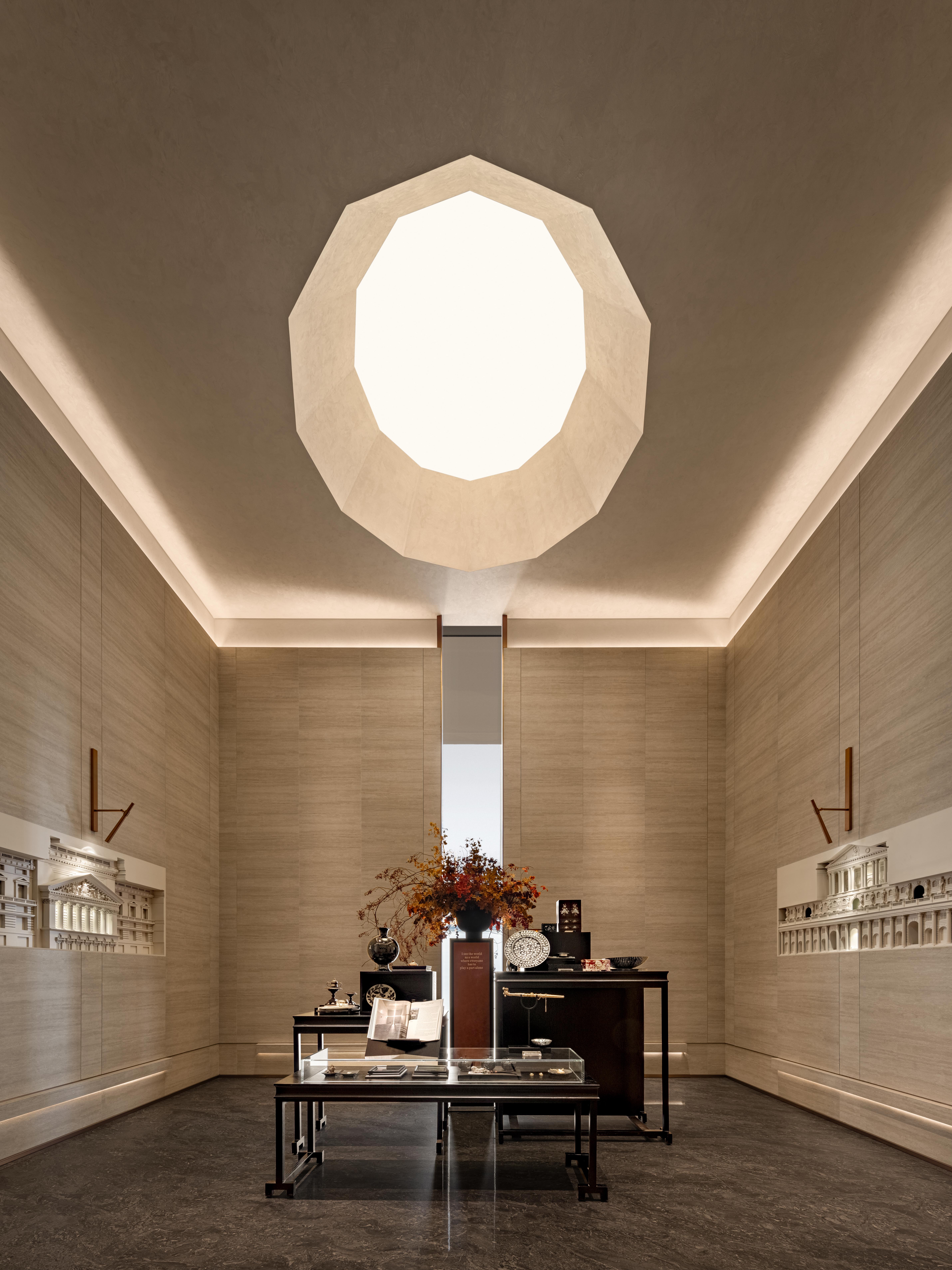 约九米高的入户大堂,构建了一个巨大的古罗马万神庙式艺术穹顶