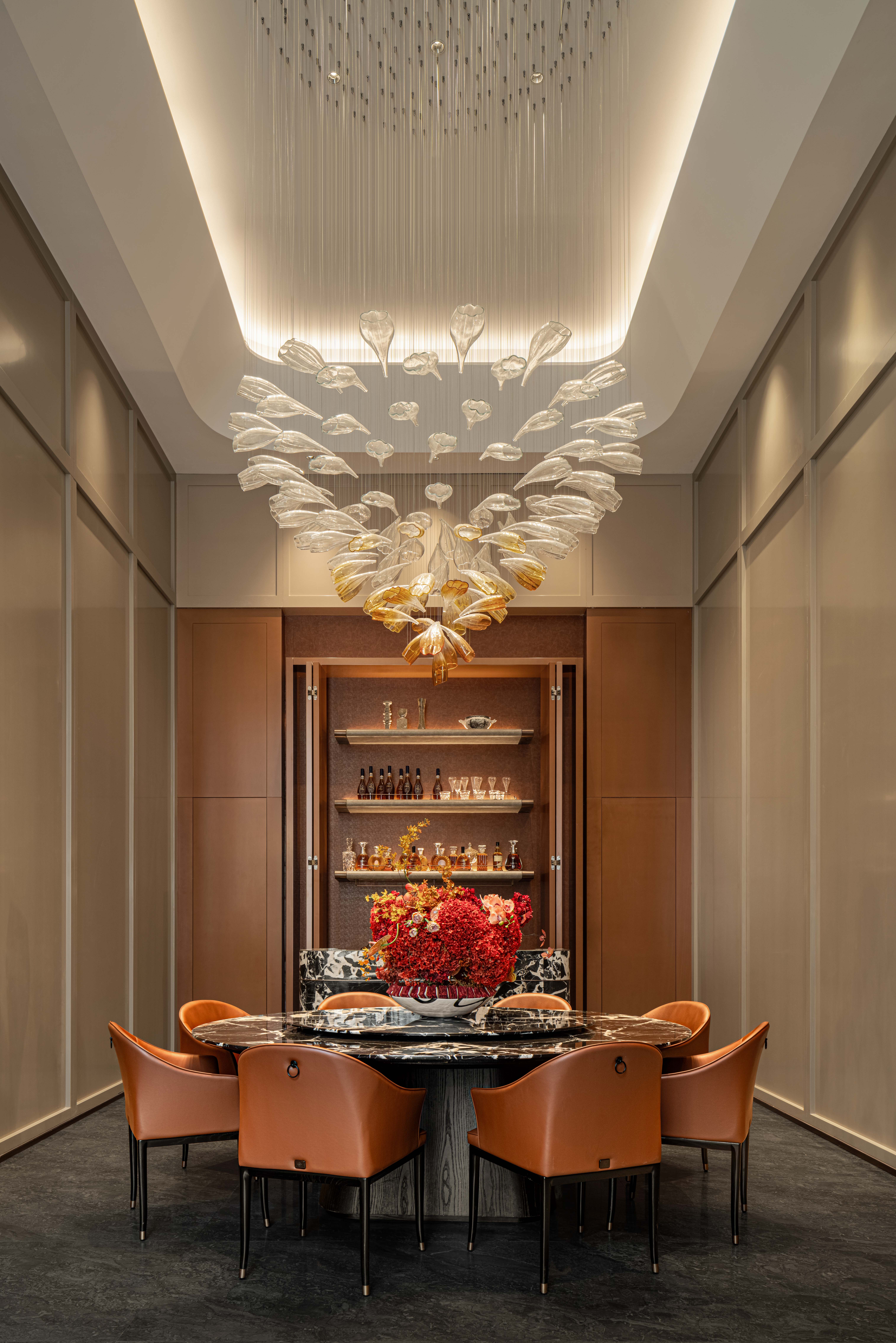 项目定位:在设计构建中,设计师秉持着打造独树一帜空间美学的策略稳步前行。整体以现代风格为基底,将空间打造成一个宝格丽珠宝盒的造型,从奢侈品的角度去认知空间,如同绸带穿起散落在金融中心的琳琅宝盒。将高端圈层向往的生活体验带入住宅,给客户提供体验多维生活场景,与艺术共创美好生活篇章的新范本。