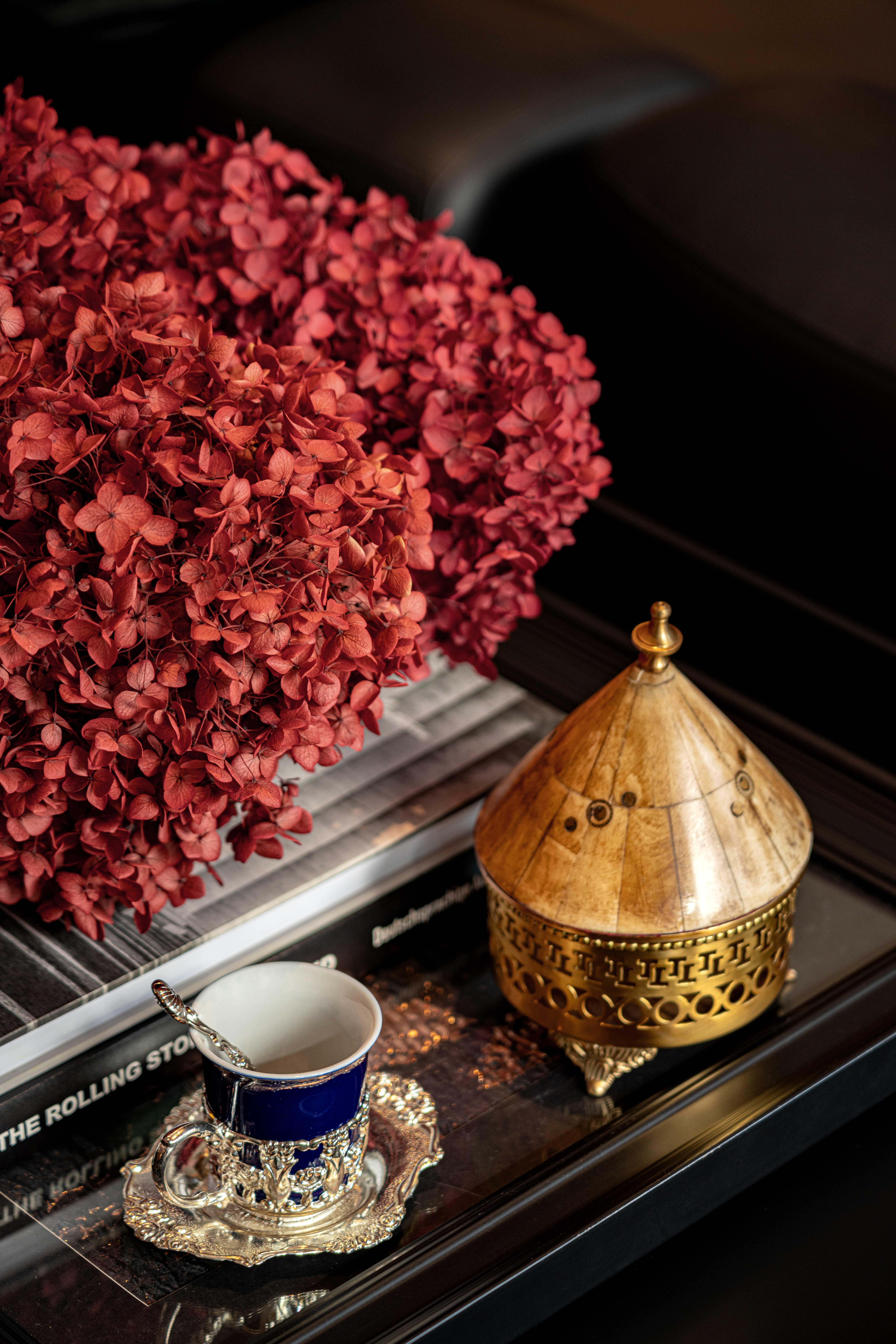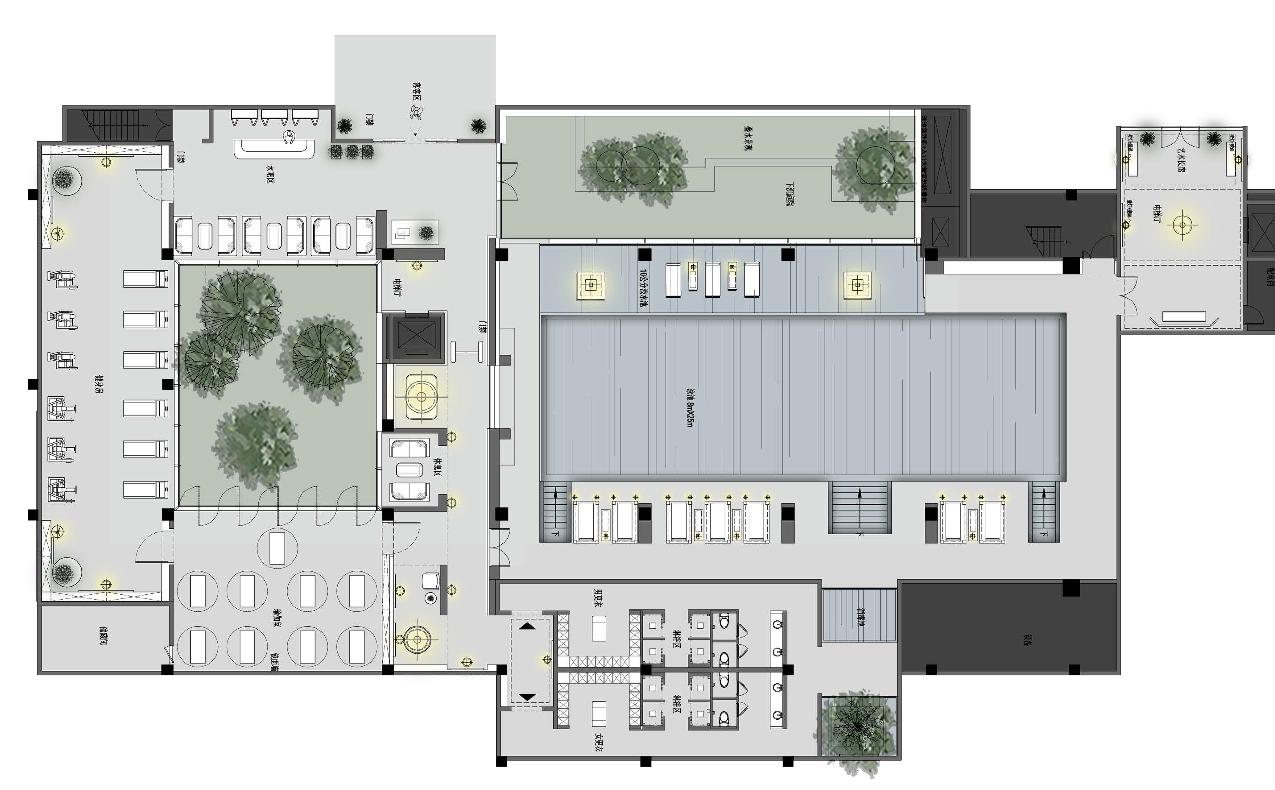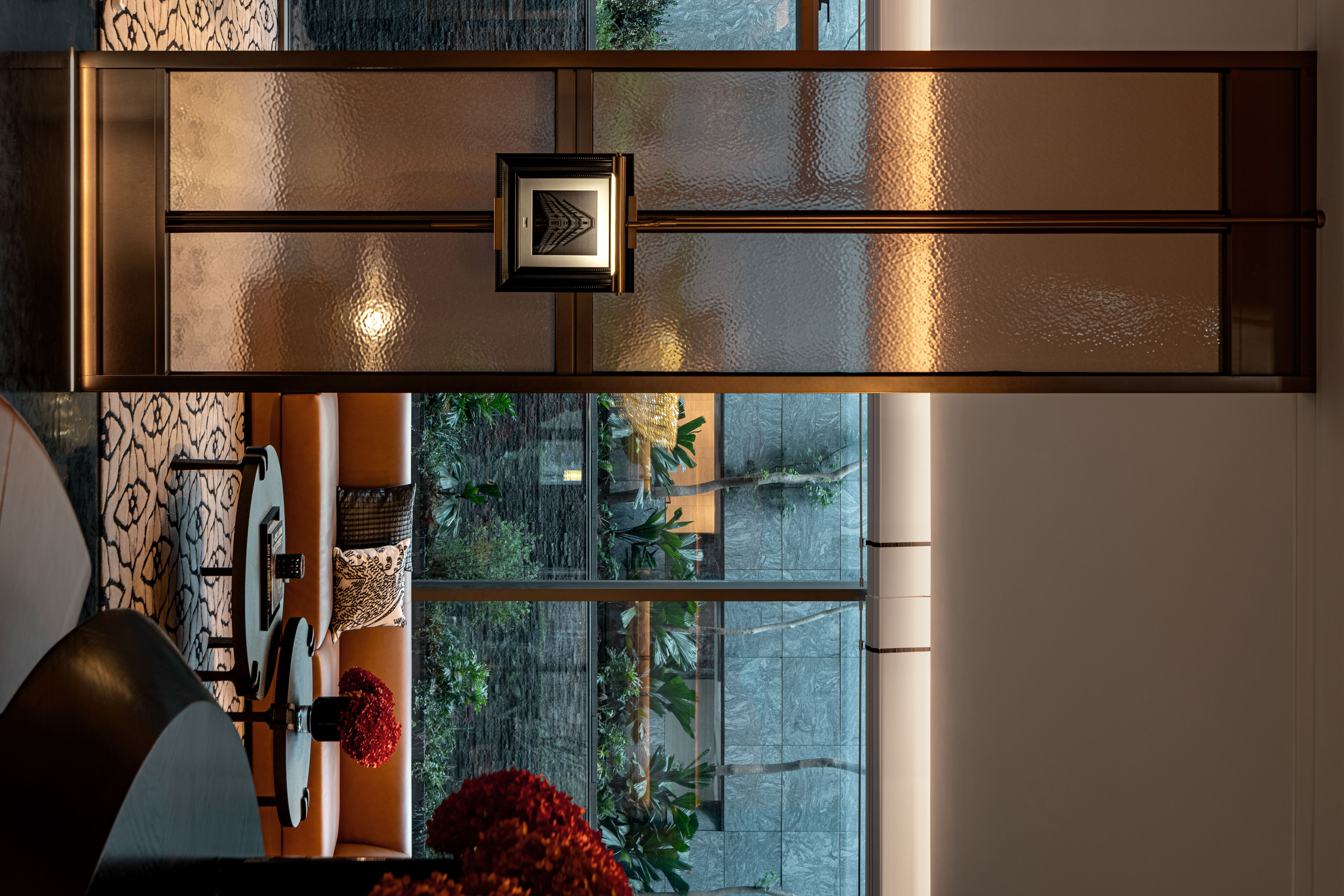 空间布局:空间功能结构复合叠加,家具的多样组合方式,使得空间即是咖啡厅也是休闲洽谈的空间,即是欣赏古典黑胶乐的乐场,也是花艺欣赏的多功能复合空间。在空间布局走位上,遵循动静结合、疏密有致的原则,半通透的金属屏风元素来做空间隔断,被灵活运用于隔断与装饰细节,划分空间功能之余,为流畅的现代线条增添了一抹灵动的古韵,玻璃夹丝屏风高低错落,使得空间隔而不断,在满足了一定私密性的同时,视觉上也更加丰富通透。大面积通透玻璃幕墙的设置,将自然采光充分引入室内,不仅节能环保,更营造出明亮开阔、亲近自然的氛围感,让访客从踏入的瞬间便心生舒畅。