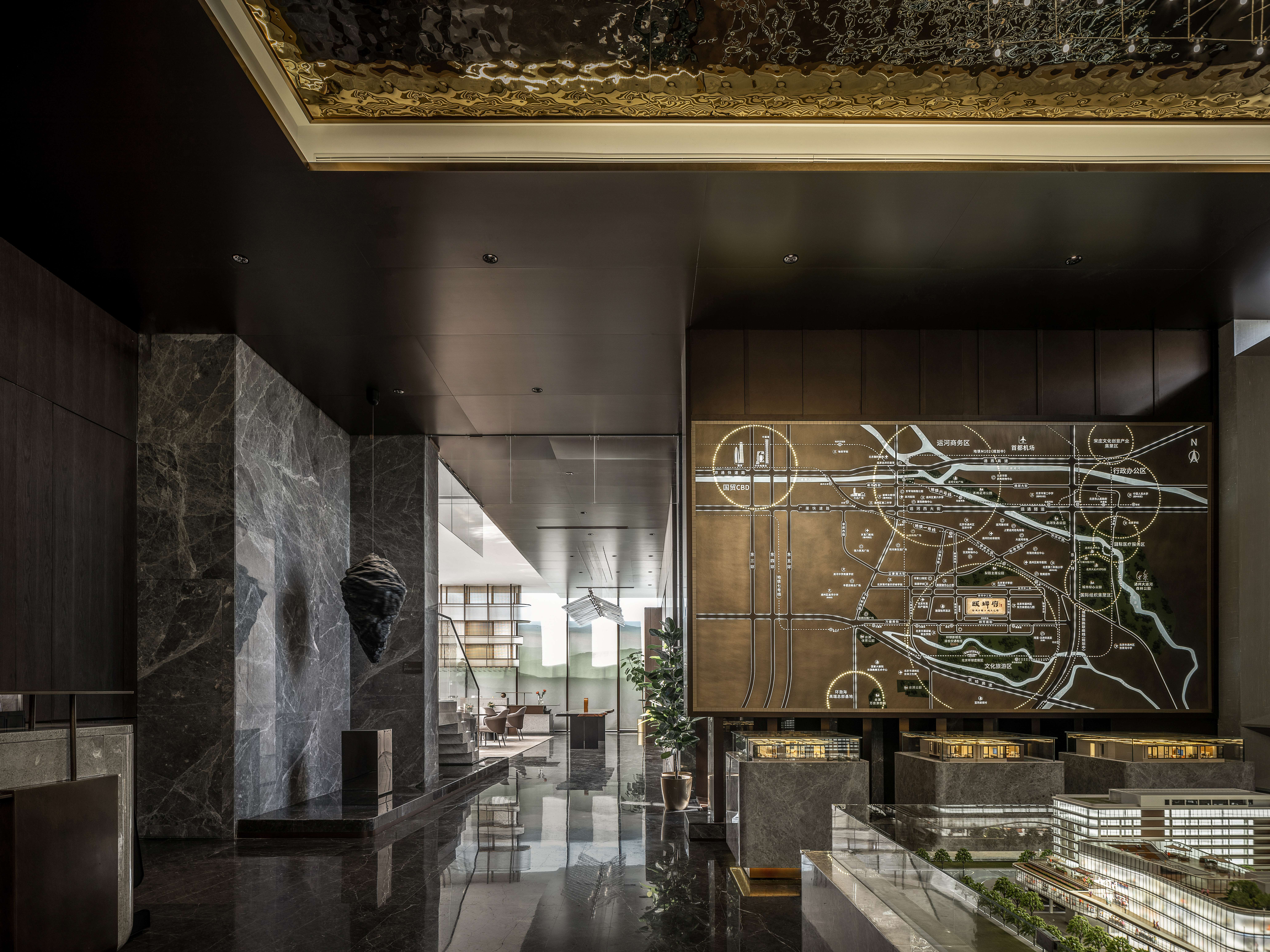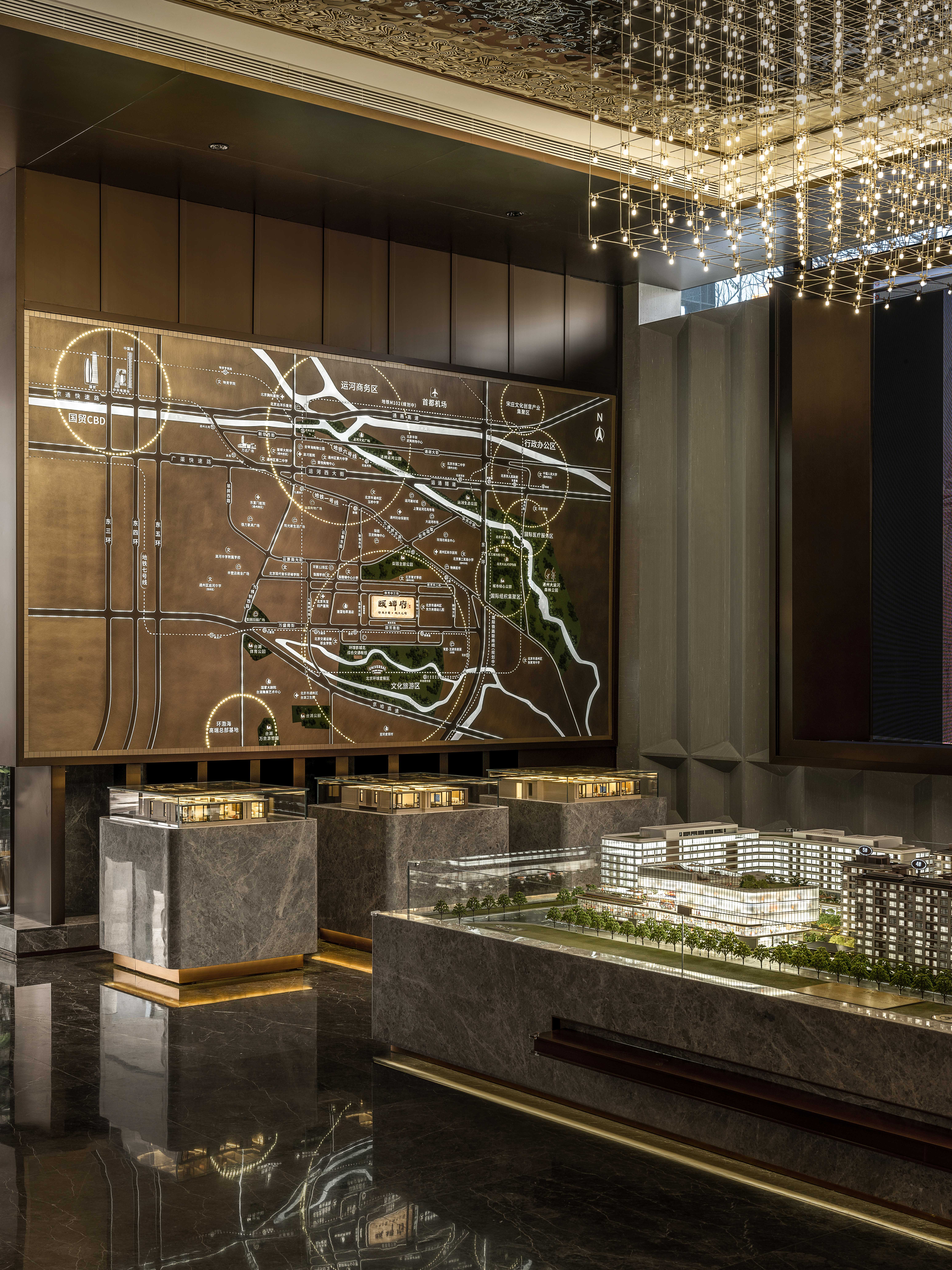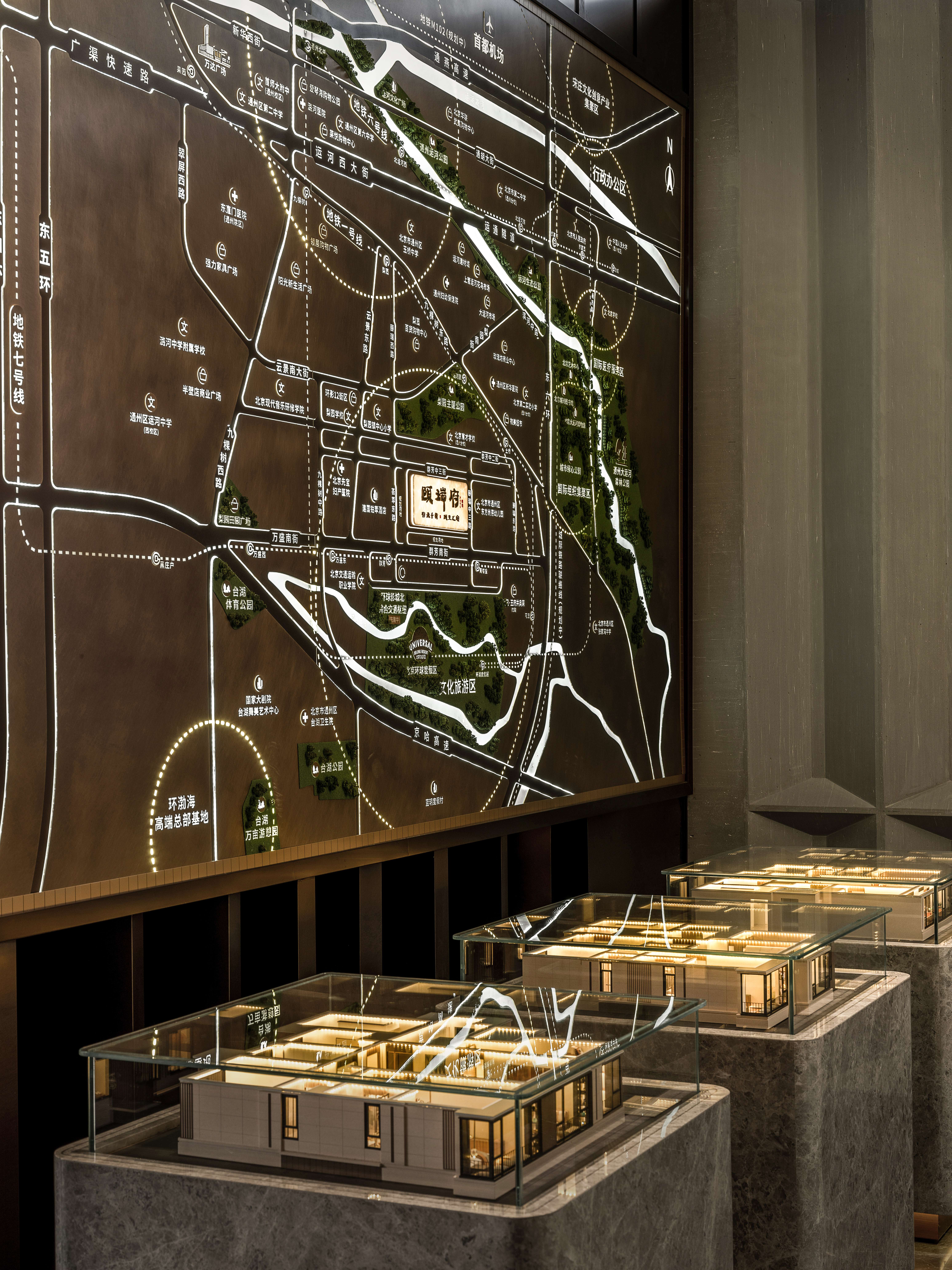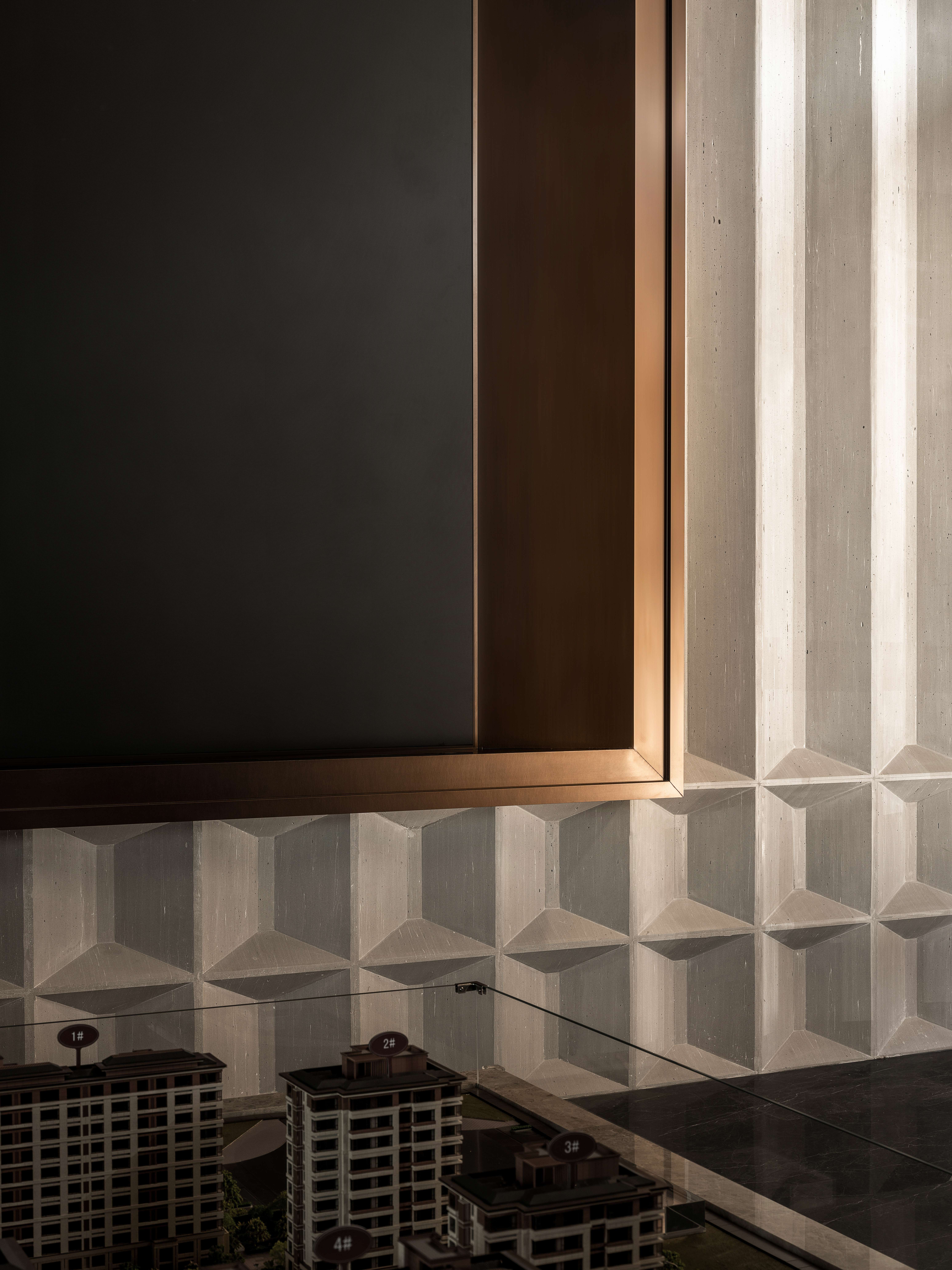 空间布局:进入售楼处空间,沉稳的绅士灰调贯穿了整个空间。简明有序的功能分布通过设计构成方式自然过渡,又被肌理与色彩语言统一起来,形成一个富于魅力的整体开放区与后场块面相对,比例平衡、张力毕现。进入内部,城市与自然的意象逐一显露,山、水、亭、宅被材料肌理解构重塑,千年古城的历史暗藏在厚重粗粝的天然石材深处;山水楼榭的自然意趣凝练于静止的装置与物象中;优雅的东方文脉在空间的自我表述和光线的变化中逐一显现。空间与自然、历史与当下、人与所居之所纯粹简净地融为一体。