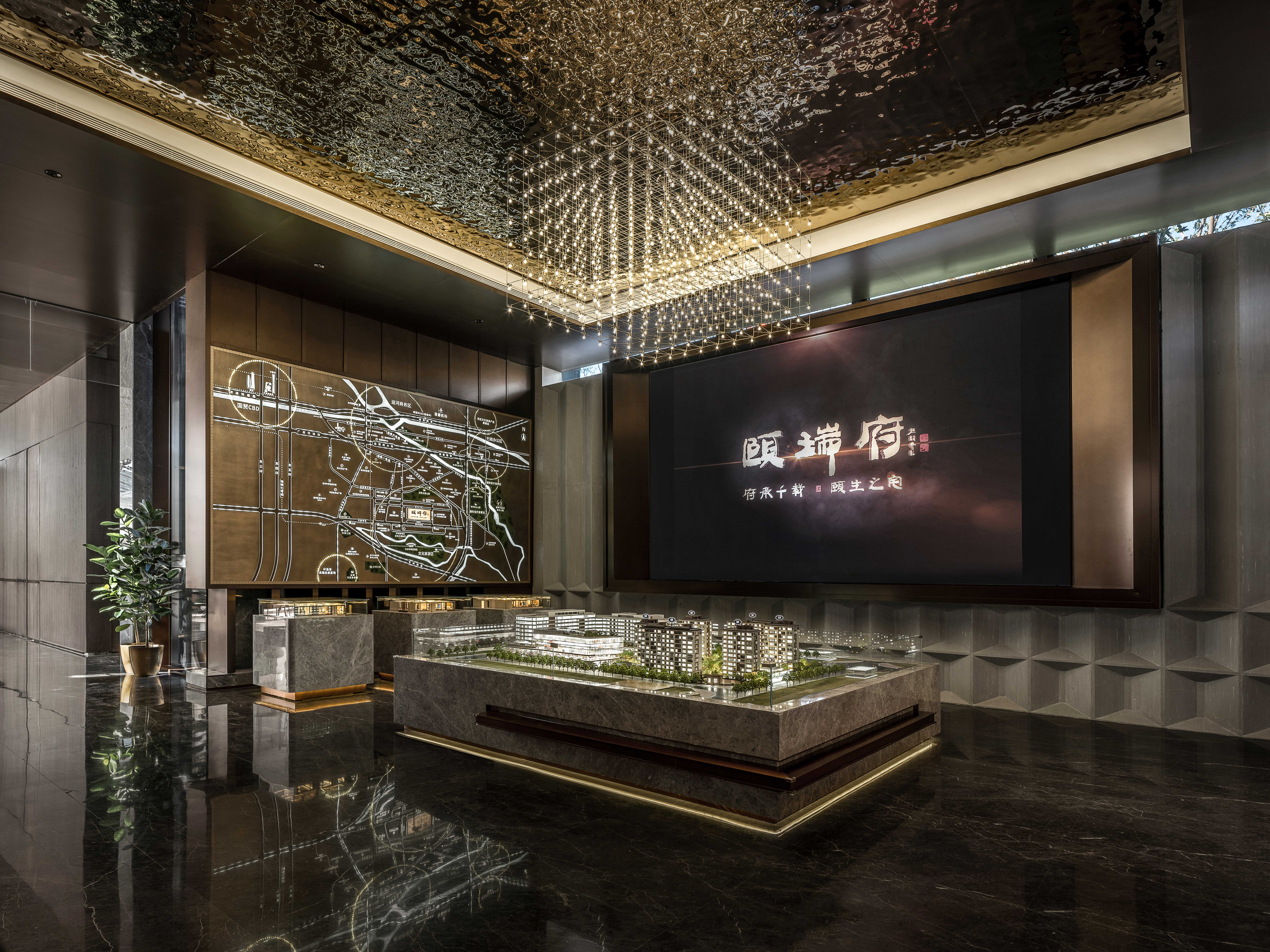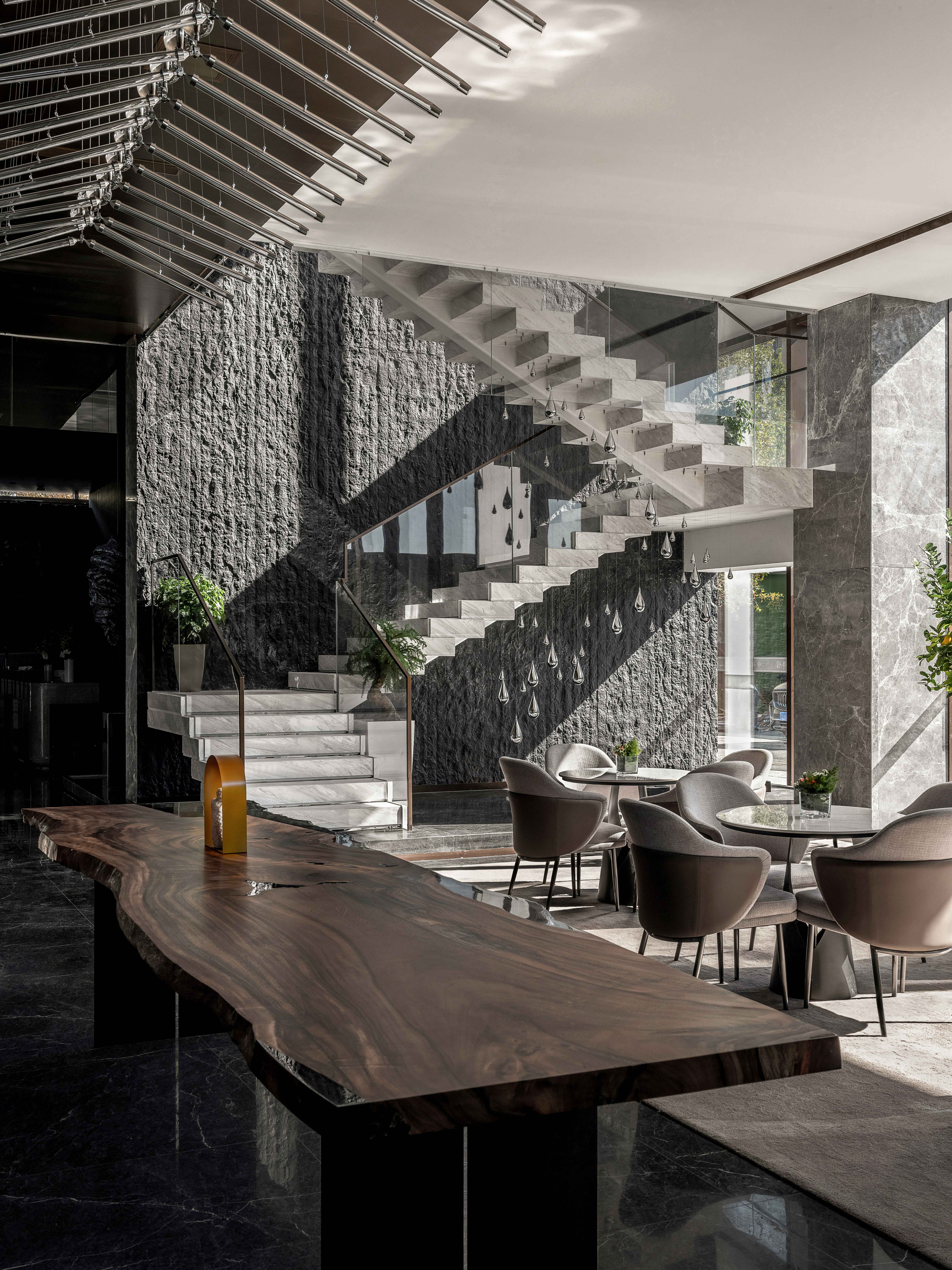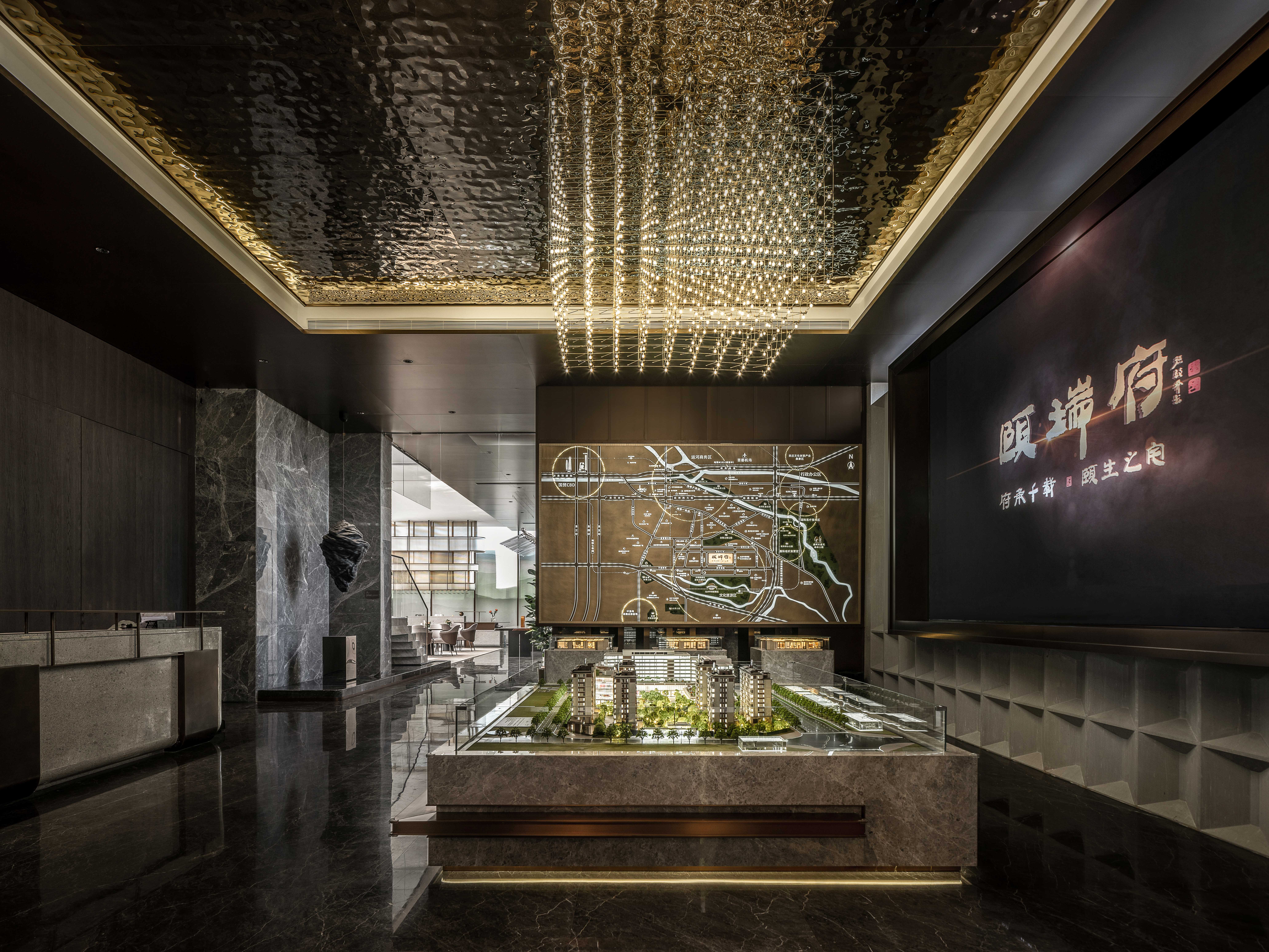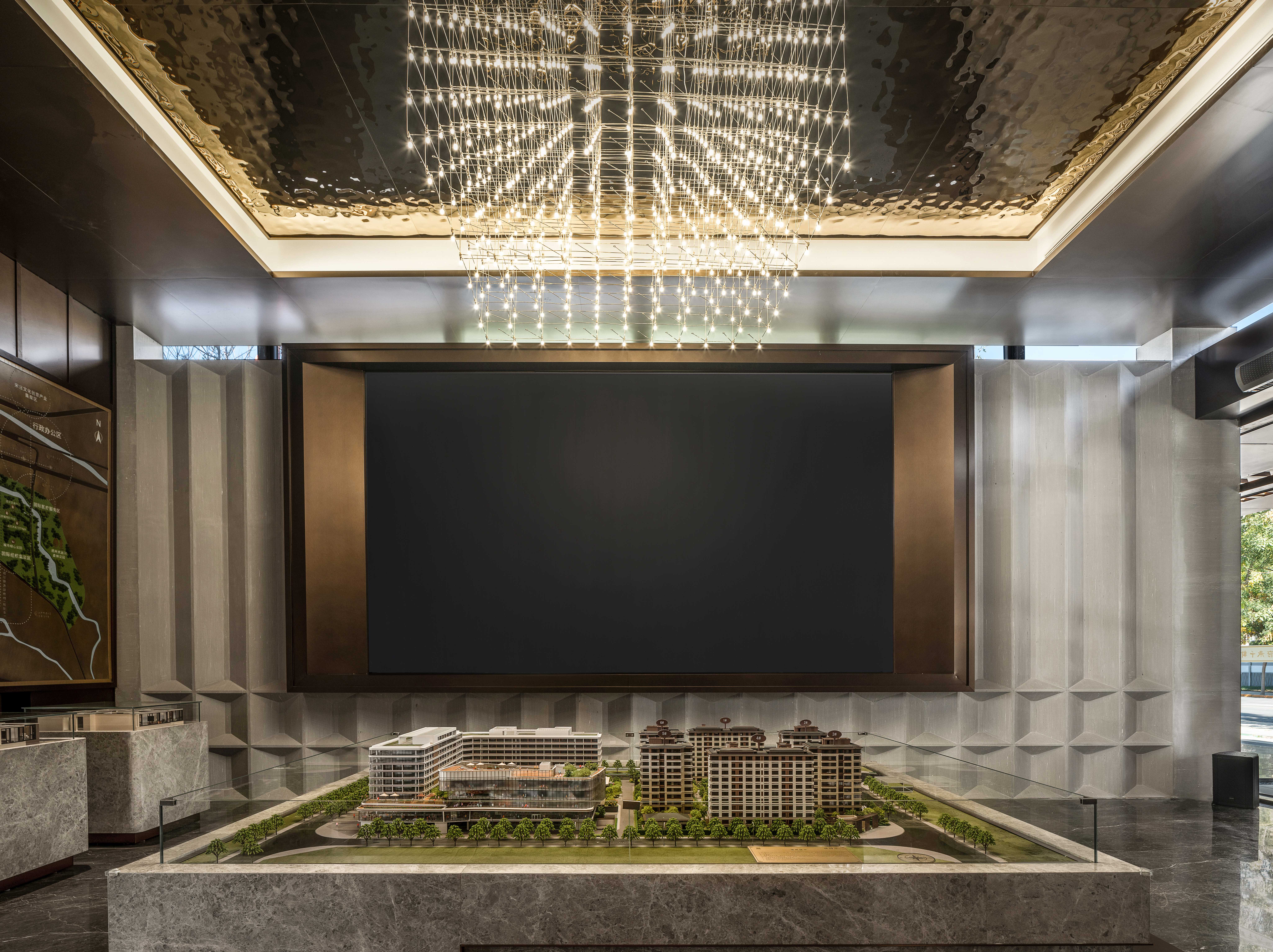 空间布局:进入售楼处空间,沉稳的绅士灰调贯穿了整个空间。简明有序的功能分布通过设计构成方式自然过渡,又被肌理与色彩语言统一起来,形成一个富于魅力的整体开放区与后场块面相对,比例平衡、张力毕现。进入内部,城市与自然的意象逐一显露,山、水、亭、宅被材料肌理解构重塑,千年古城的历史暗藏在厚重粗粝的天然石材深处;山水楼榭的自然意趣凝练于静止的装置与物象中;优雅的东方文脉在空间的自我表述和光线的变化中逐一显现。空间与自然、历史与当下、人与所居之所纯粹简净地融为一体。