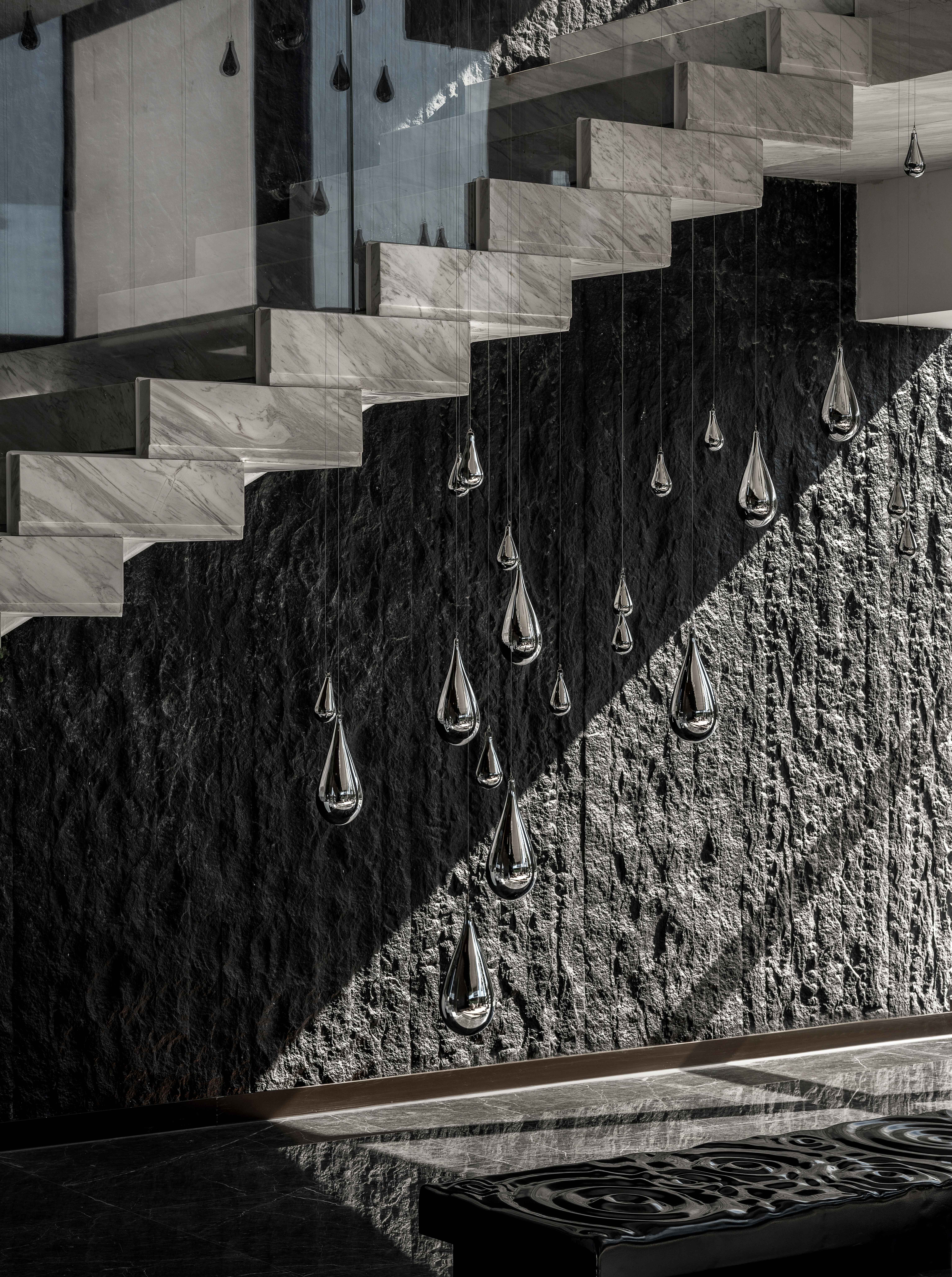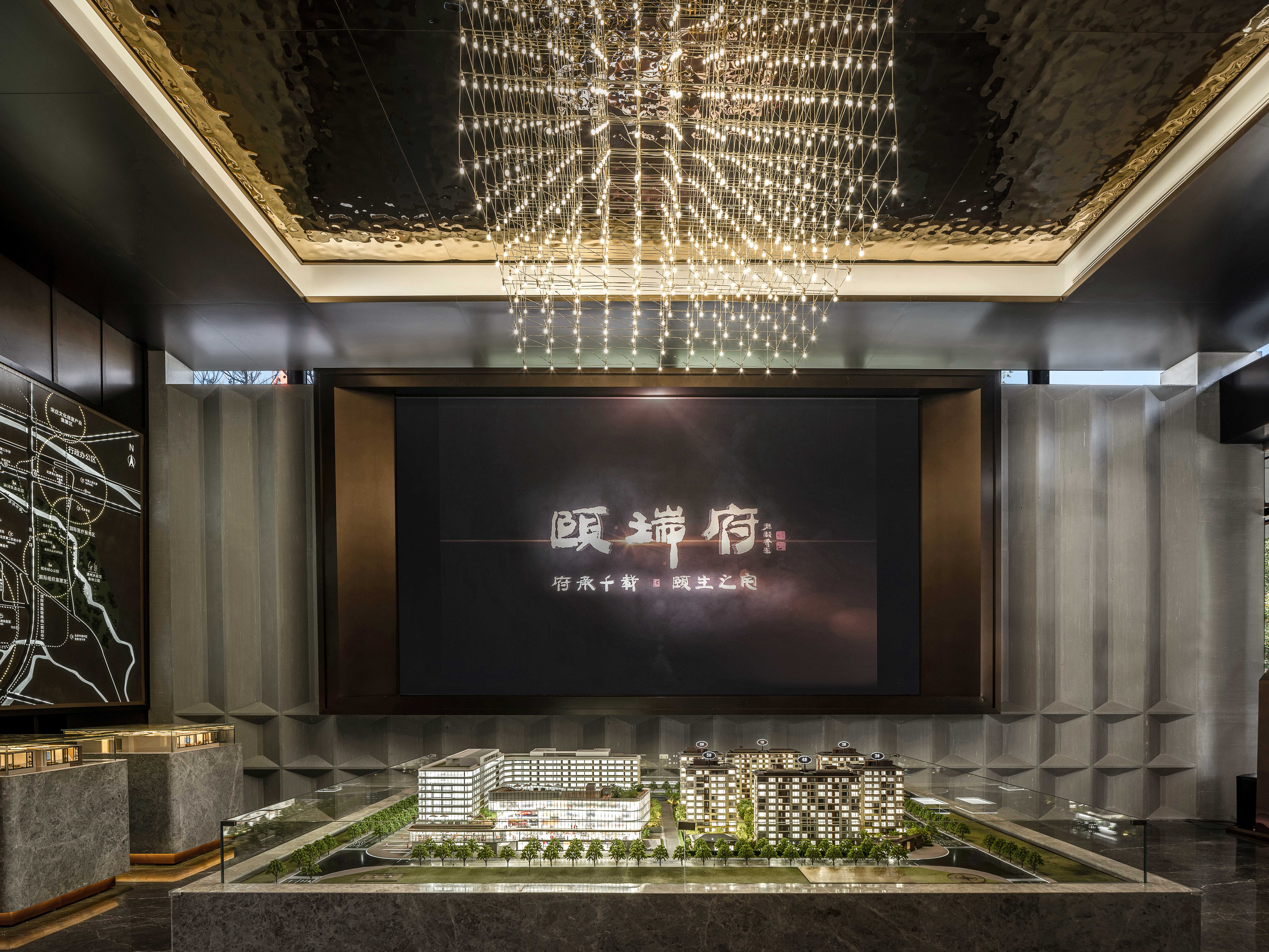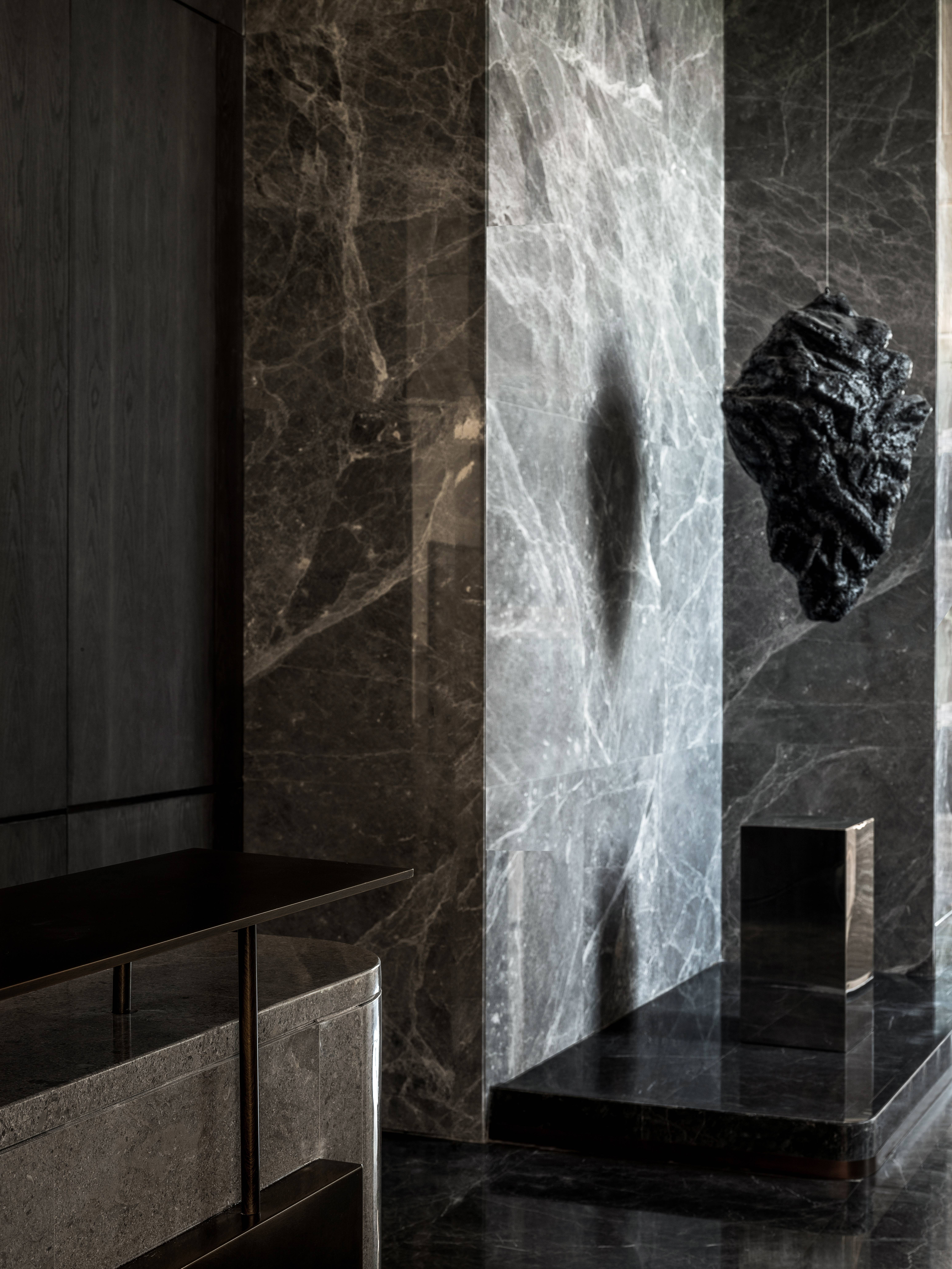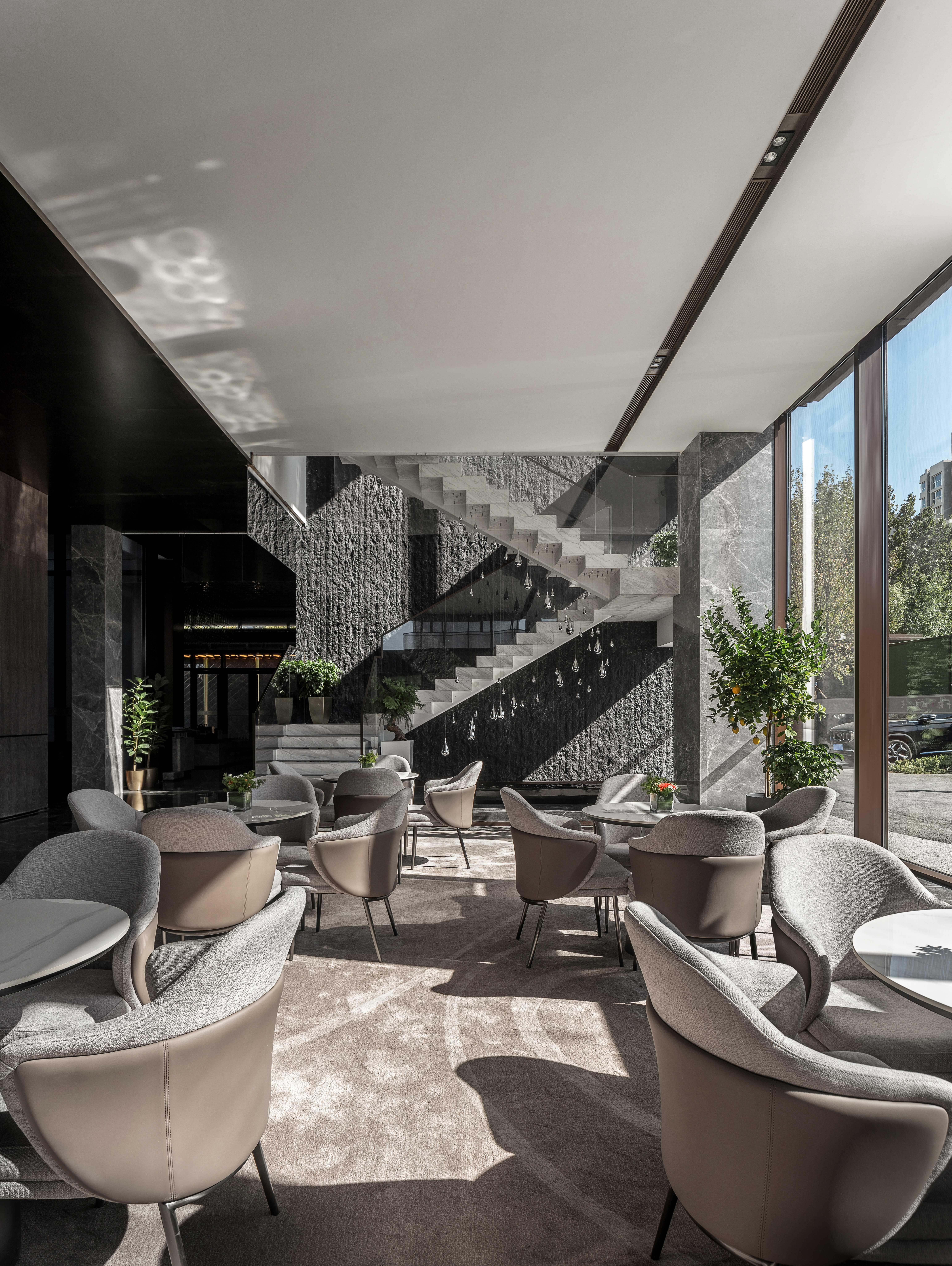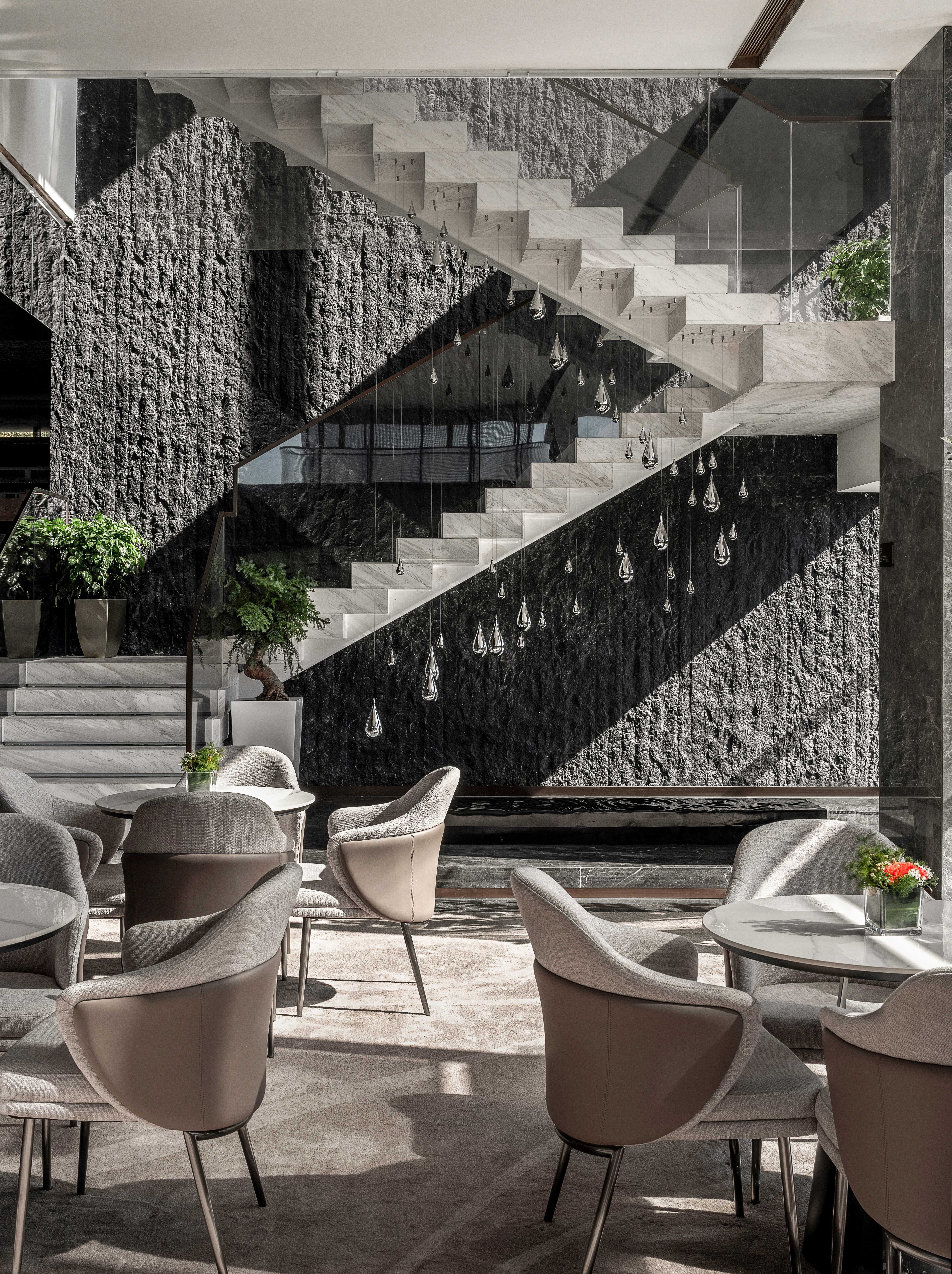 空间布局:进入售楼处空间,沉稳的绅士灰调贯穿了整个空间。简明有序的功能分布通过设计构成方式自然过渡,又被肌理与色彩语言统一起来,形成一个富于魅力的整体开放区与后场块面相对,比例平衡、张力毕现。进入内部,城市与自然的意象逐一显露,山、水、亭、宅被材料肌理解构重塑,千年古城的历史暗藏在厚重粗粝的天然石材深处;山水楼榭的自然意趣凝练于静止的装置与物象中;优雅的东方文脉在空间的自我表述和光线的变化中逐一显现。空间与自然、历史与当下、人与所居之所纯粹简净地融为一体。