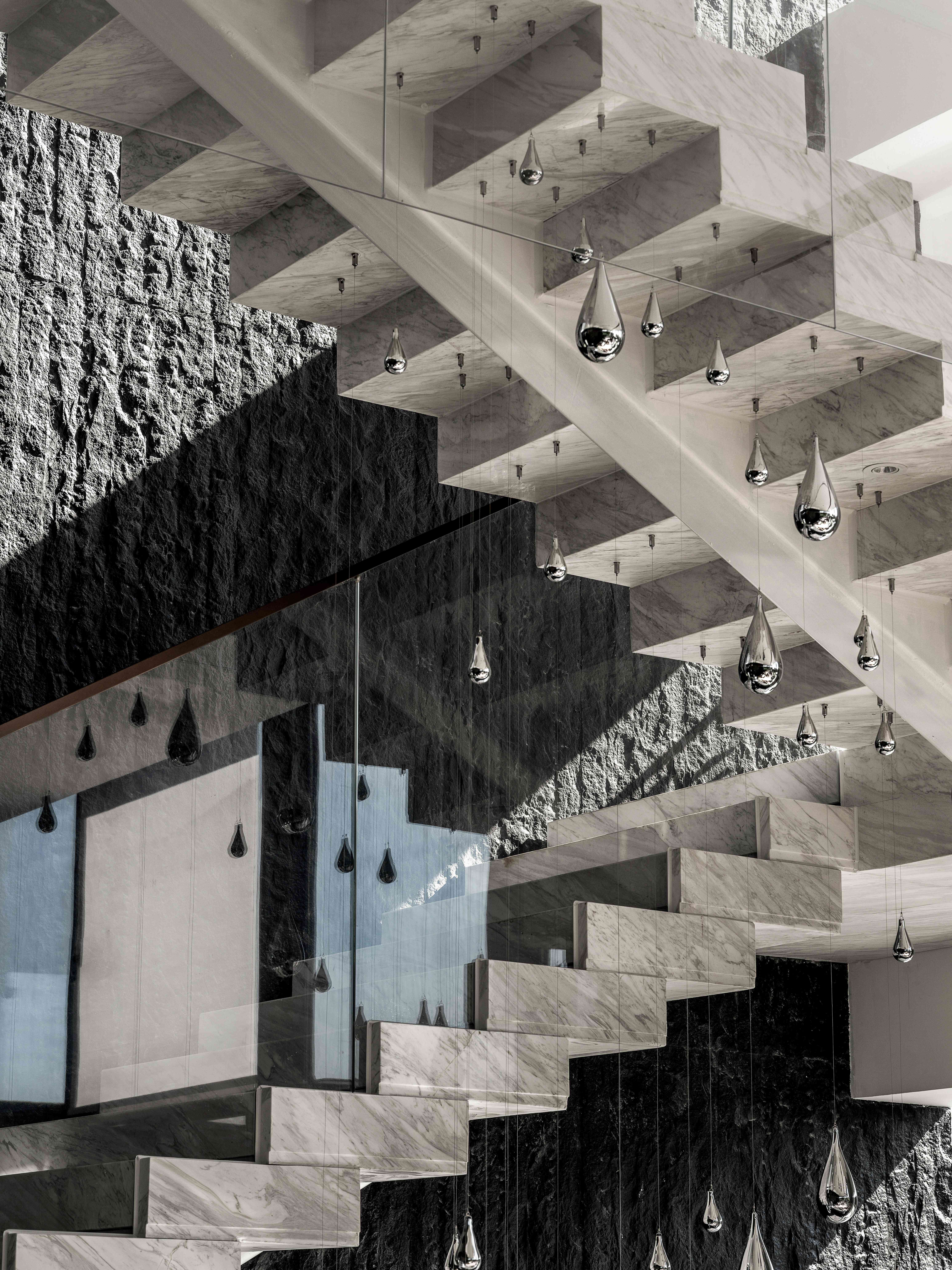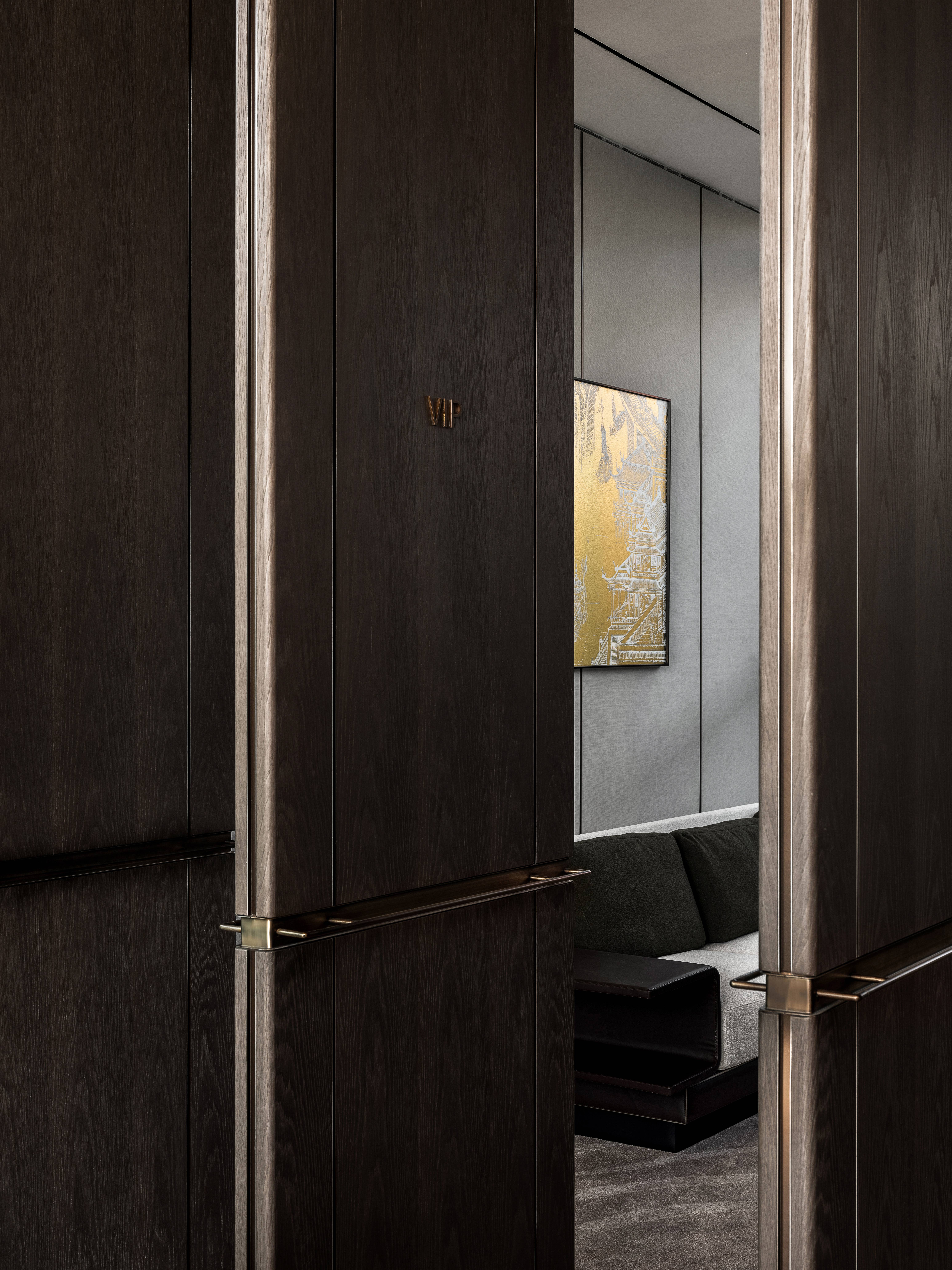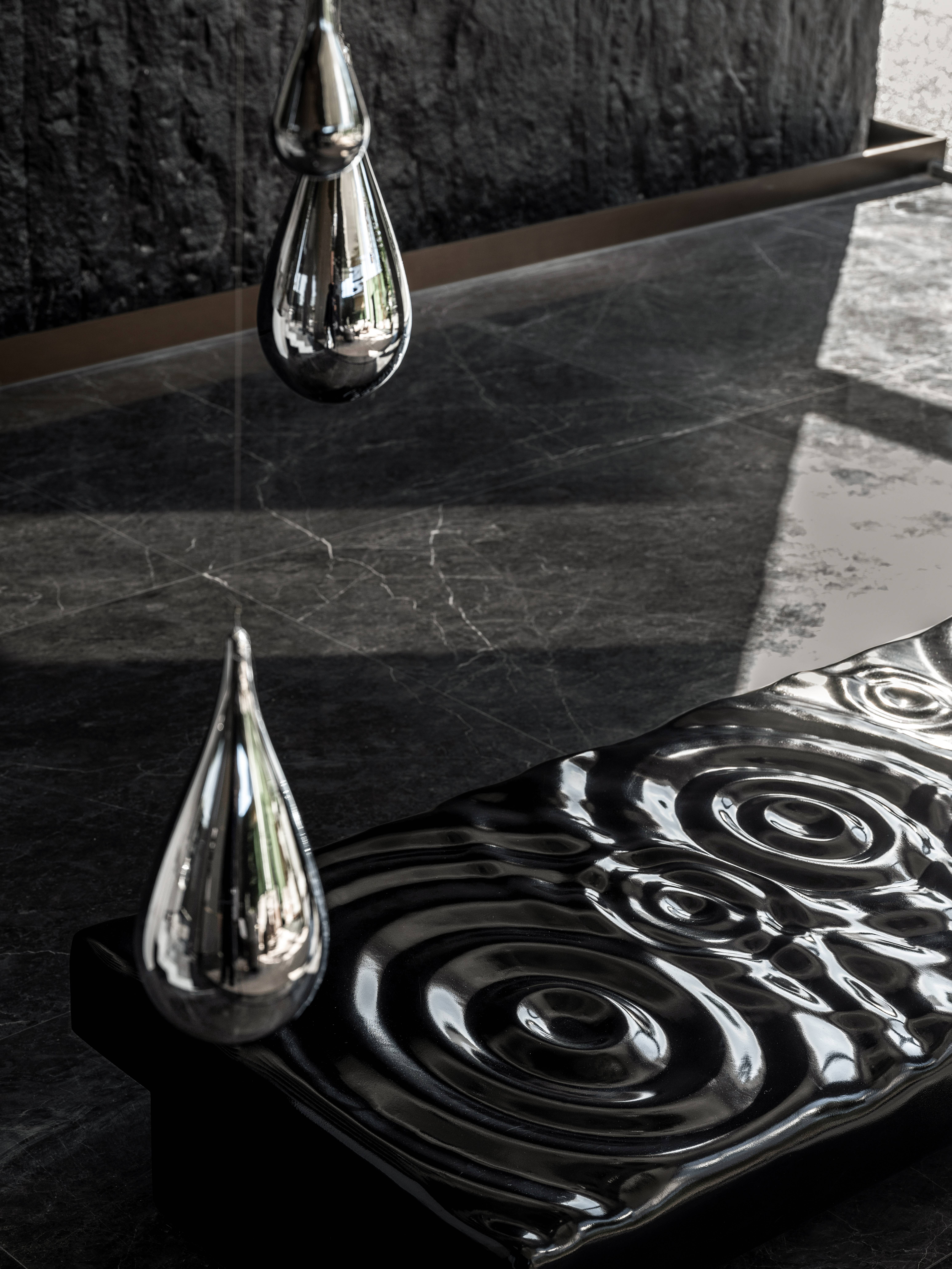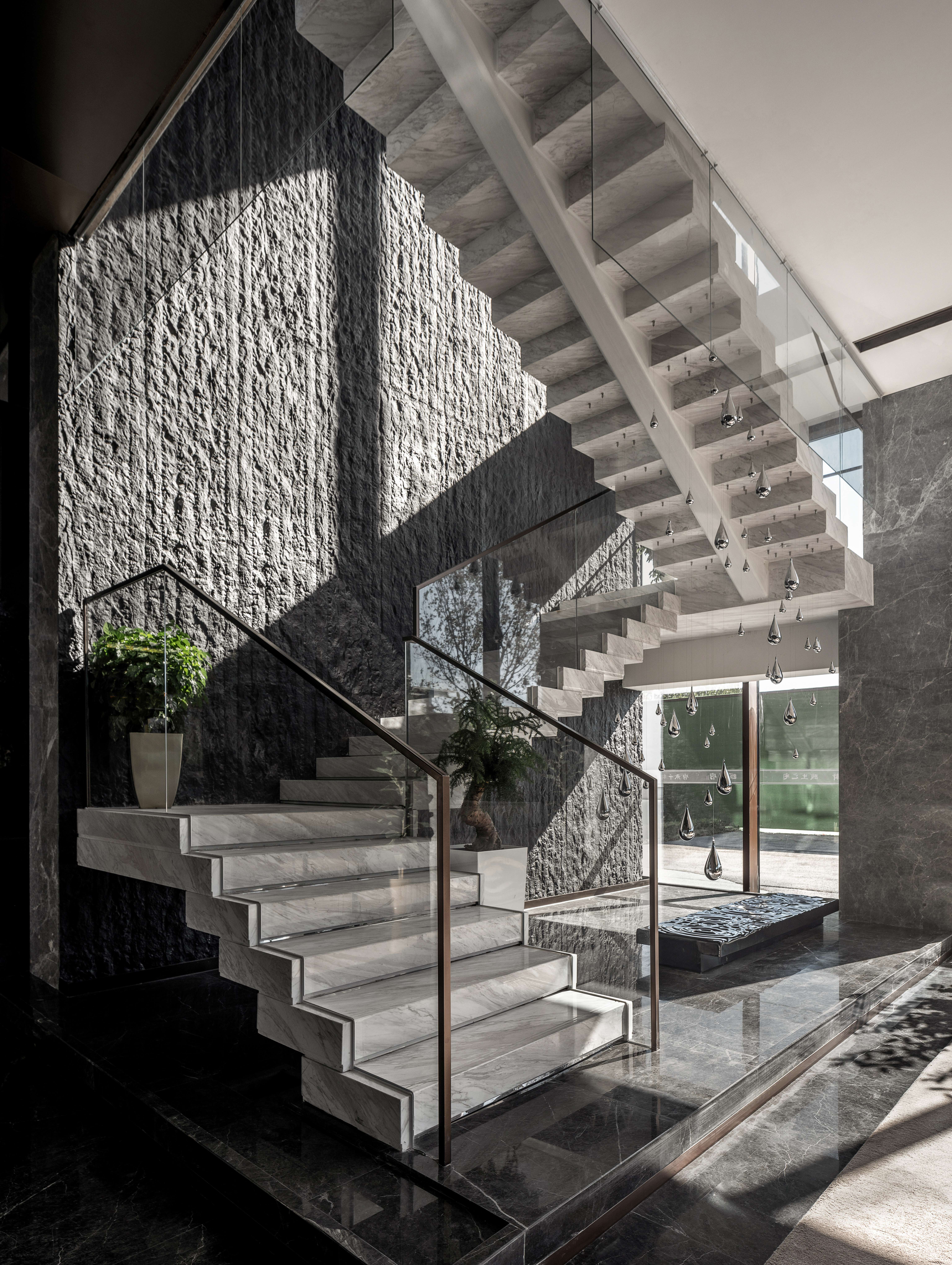 空间布局:进入售楼处空间,沉稳的绅士灰调贯穿了整个空间。简明有序的功能分布通过设计构成方式自然过渡,又被肌理与色彩语言统一起来,形成一个富于魅力的整体开放区与后场块面相对,比例平衡、张力毕现。进入内部,城市与自然的意象逐一显露,山、水、亭、宅被材料肌理解构重塑,千年古城的历史暗藏在厚重粗粝的天然石材深处;山水楼榭的自然意趣凝练于静止的装置与物象中;优雅的东方文脉在空间的自我表述和光线的变化中逐一显现。空间与自然、历史与当下、人与所居之所纯粹简净地融为一体。