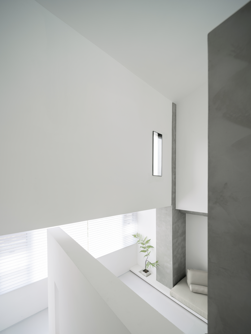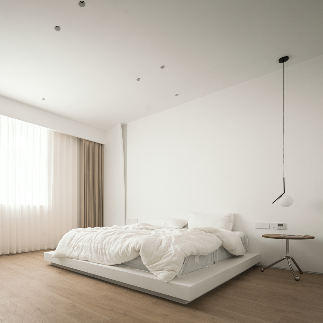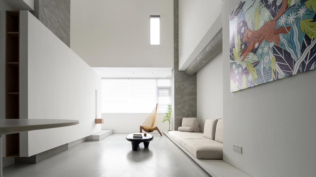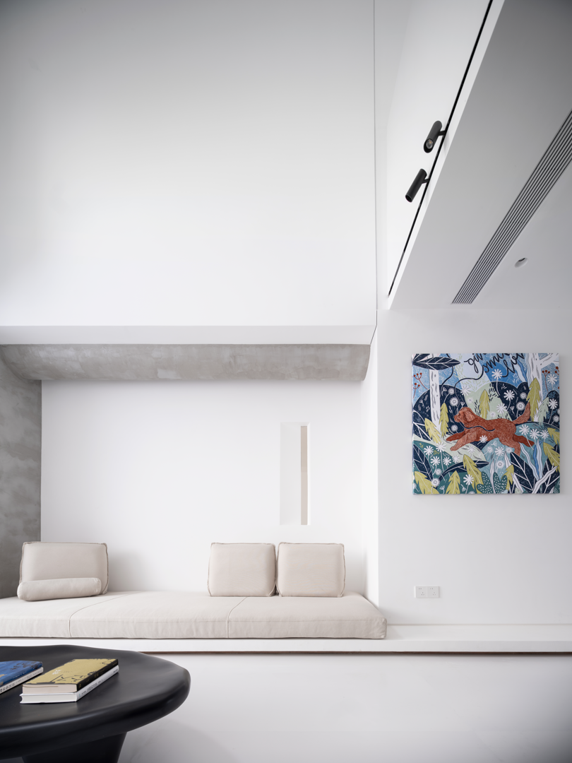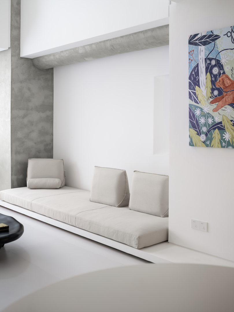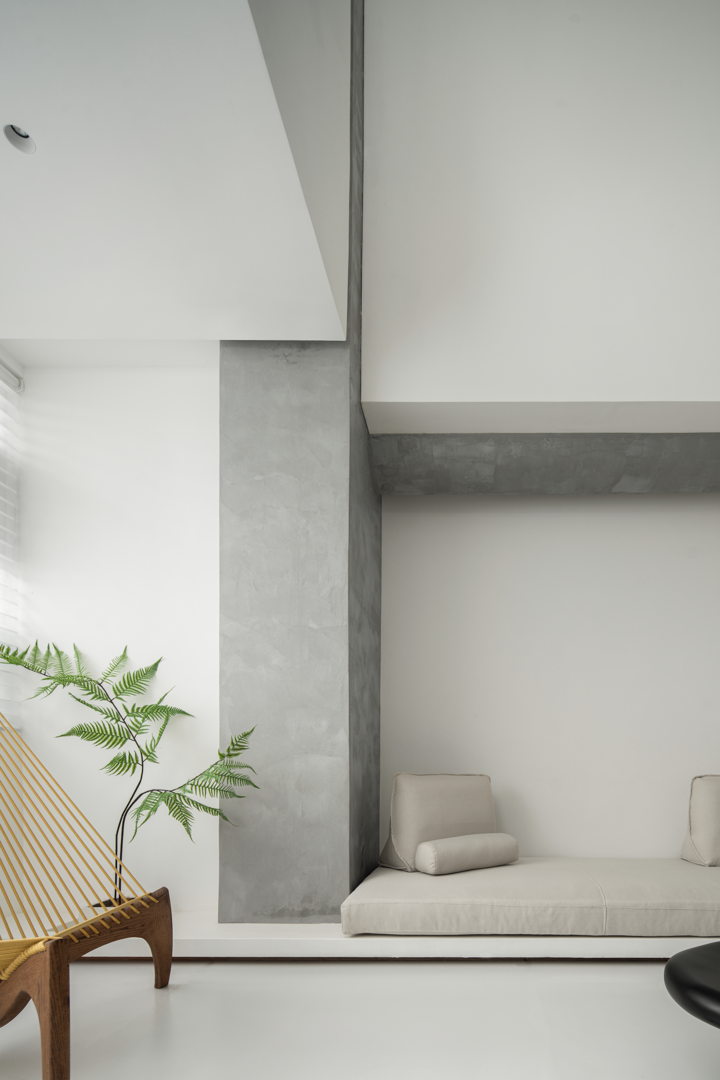 采用简单素雅的白以及裸露在外的浅灰水泥,简约实用美观的同时,可修复性强,使用年限长。辅以绿植以及布艺等软装,空间自然且易更换。