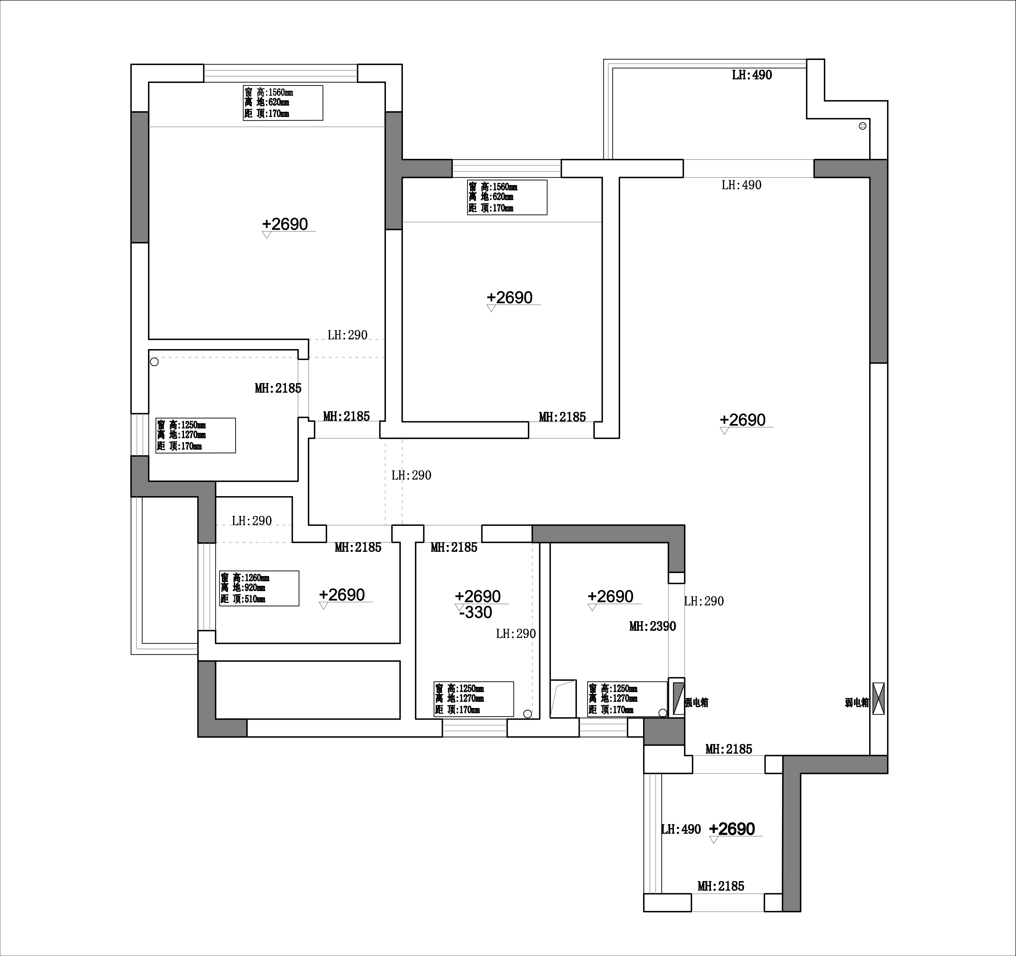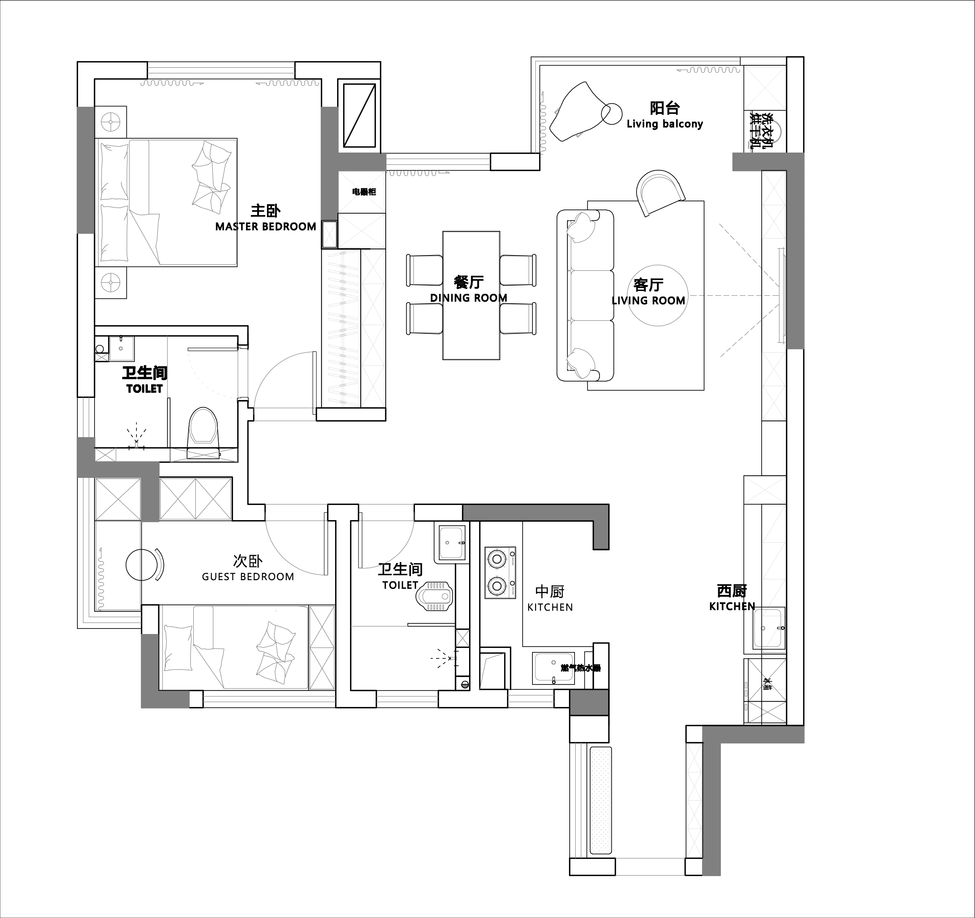 空间布局:三房改两房,竖向客厅改成大横厅,为业主女儿提供更多的活动空间,小户型也同时拥有中厨和西厨。