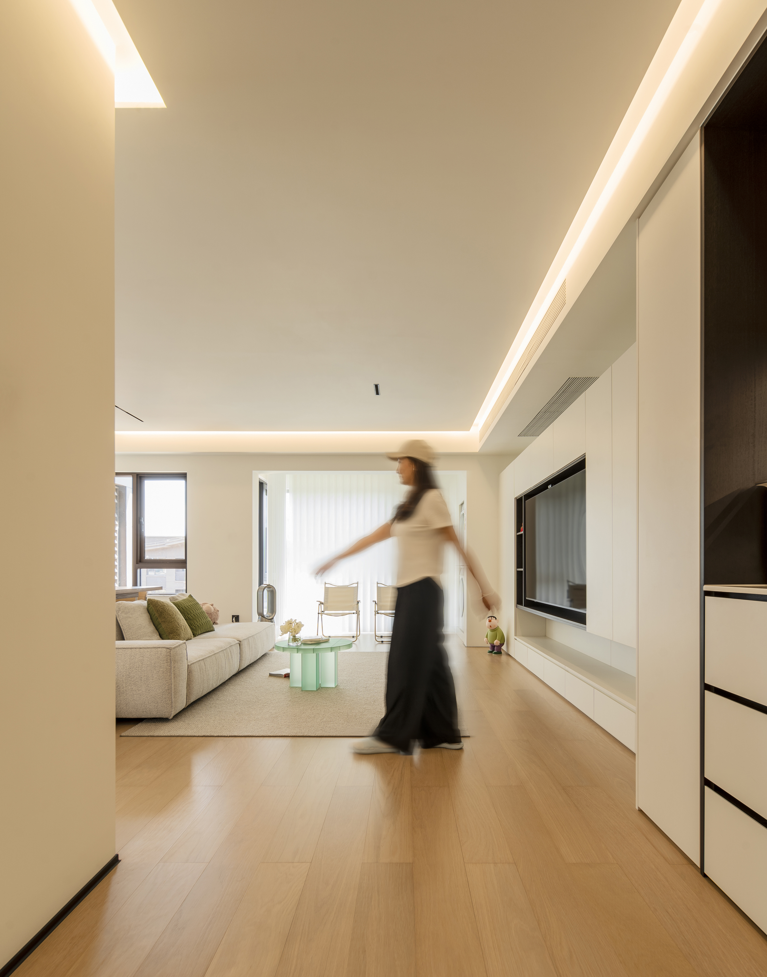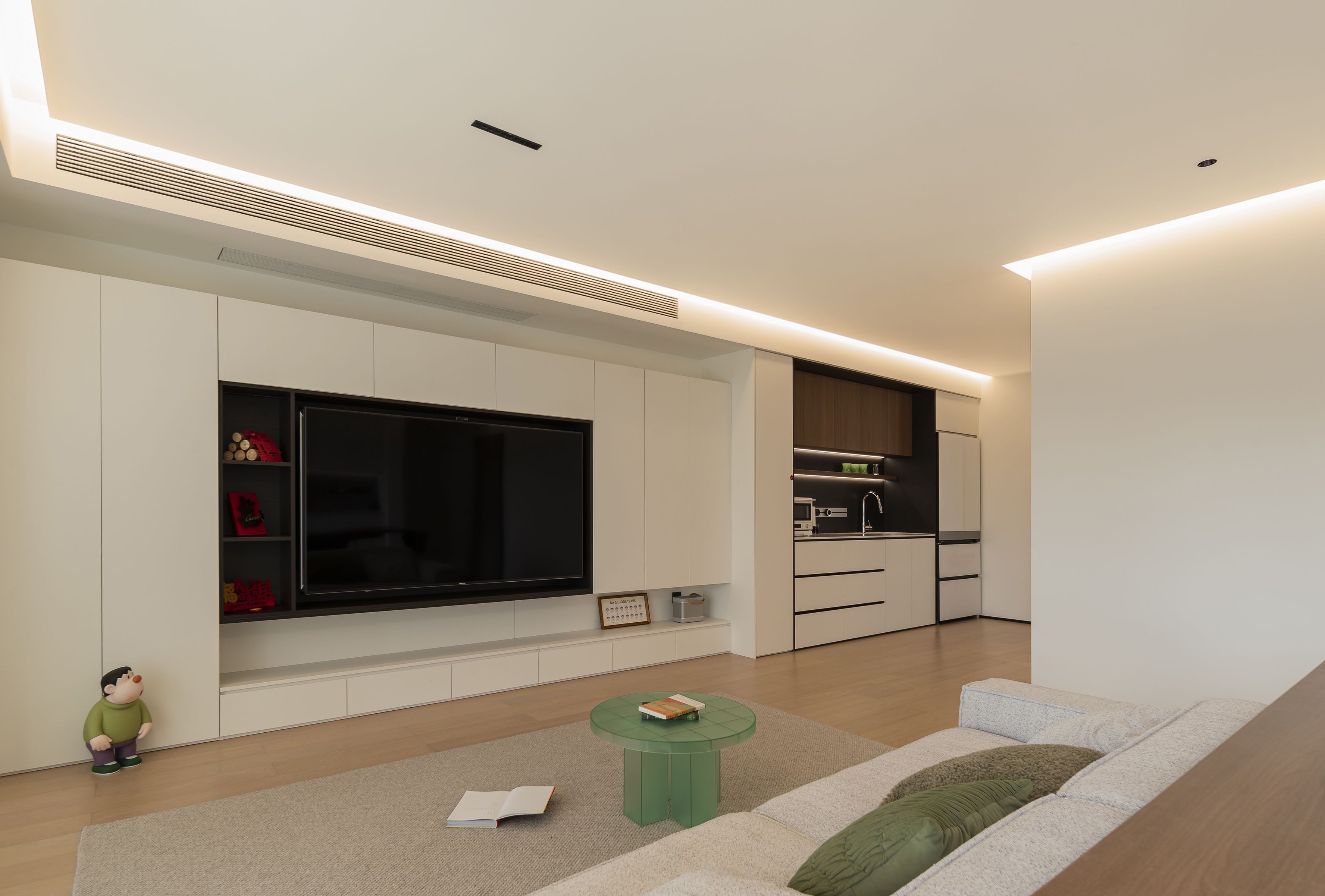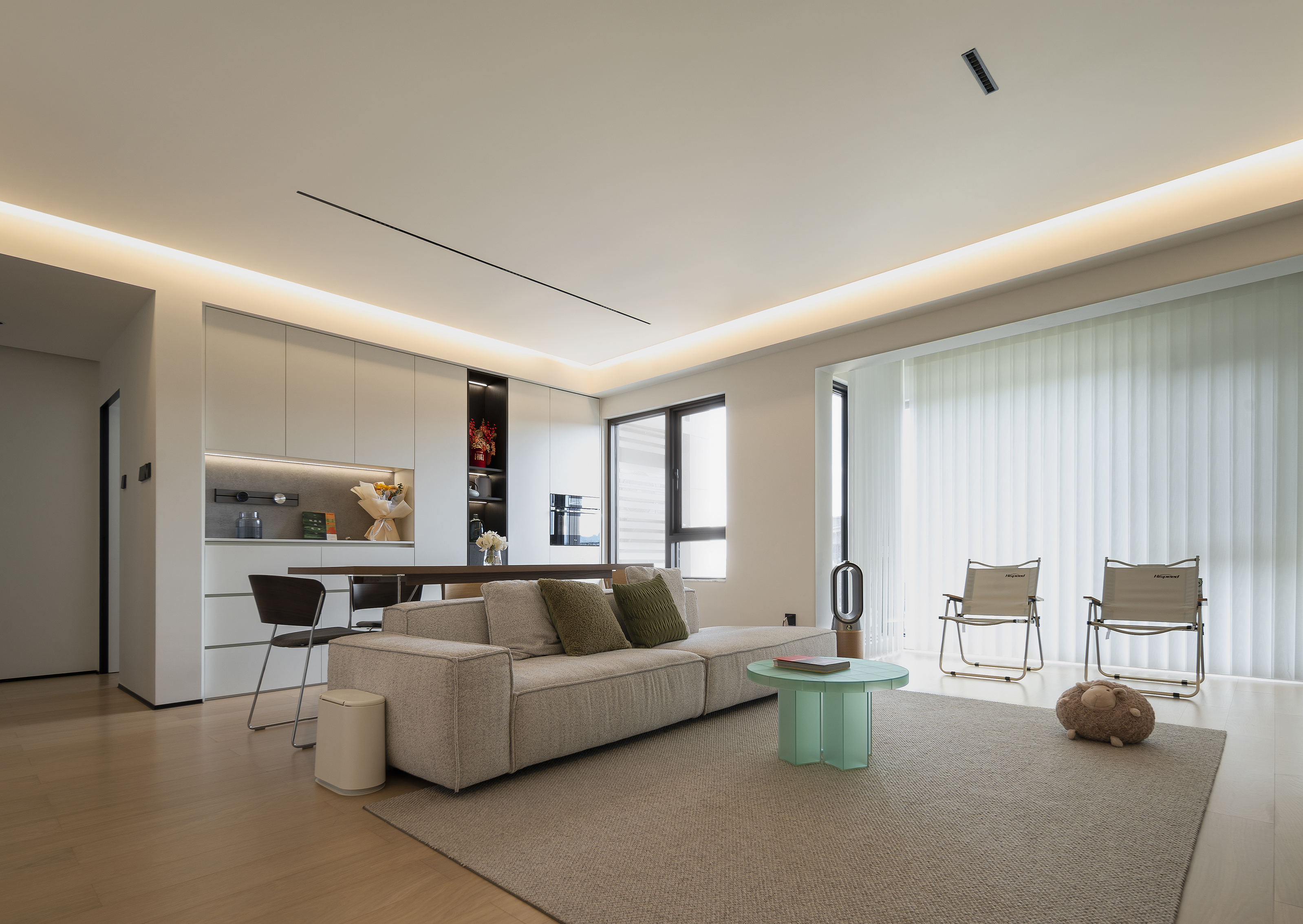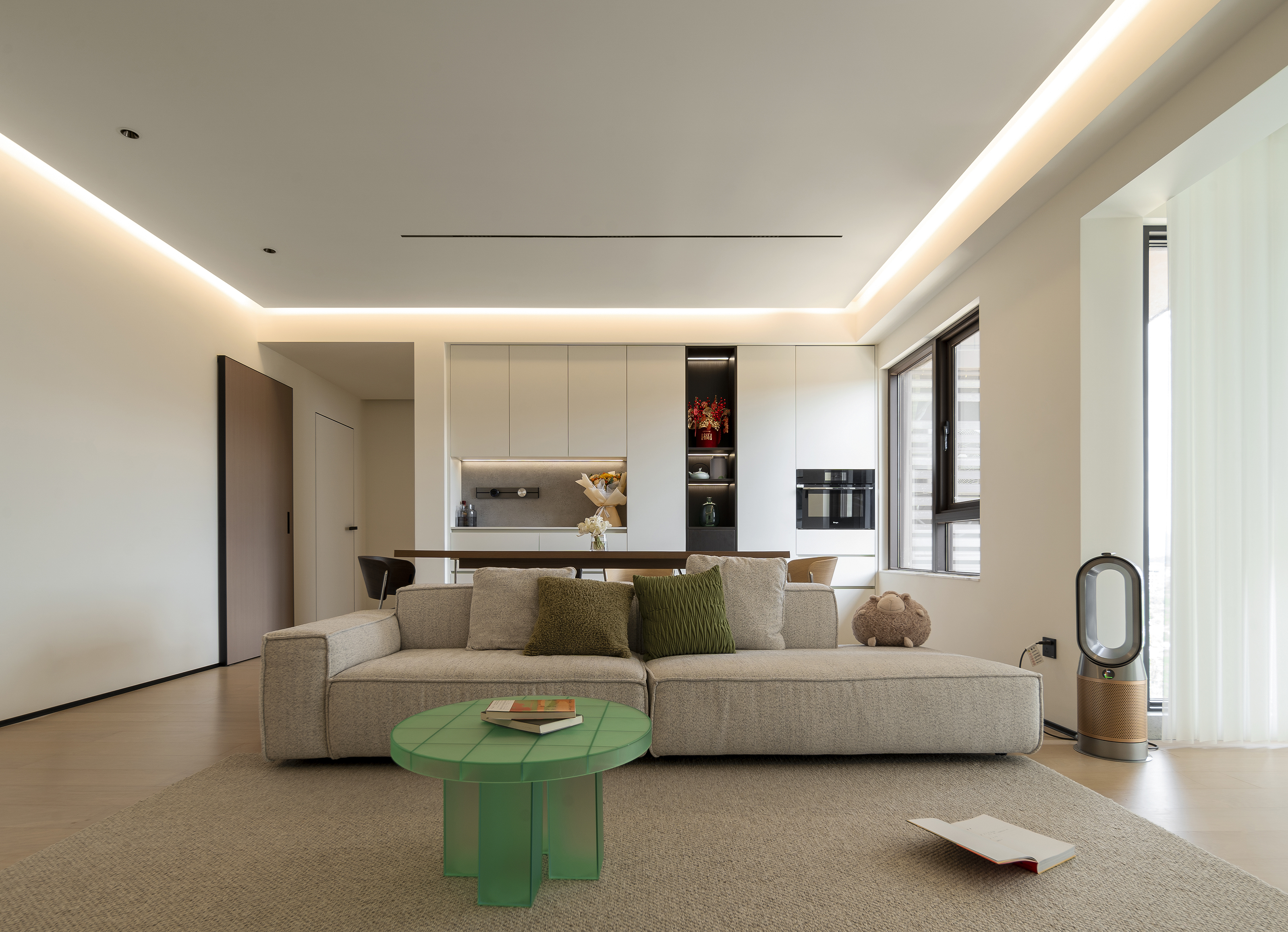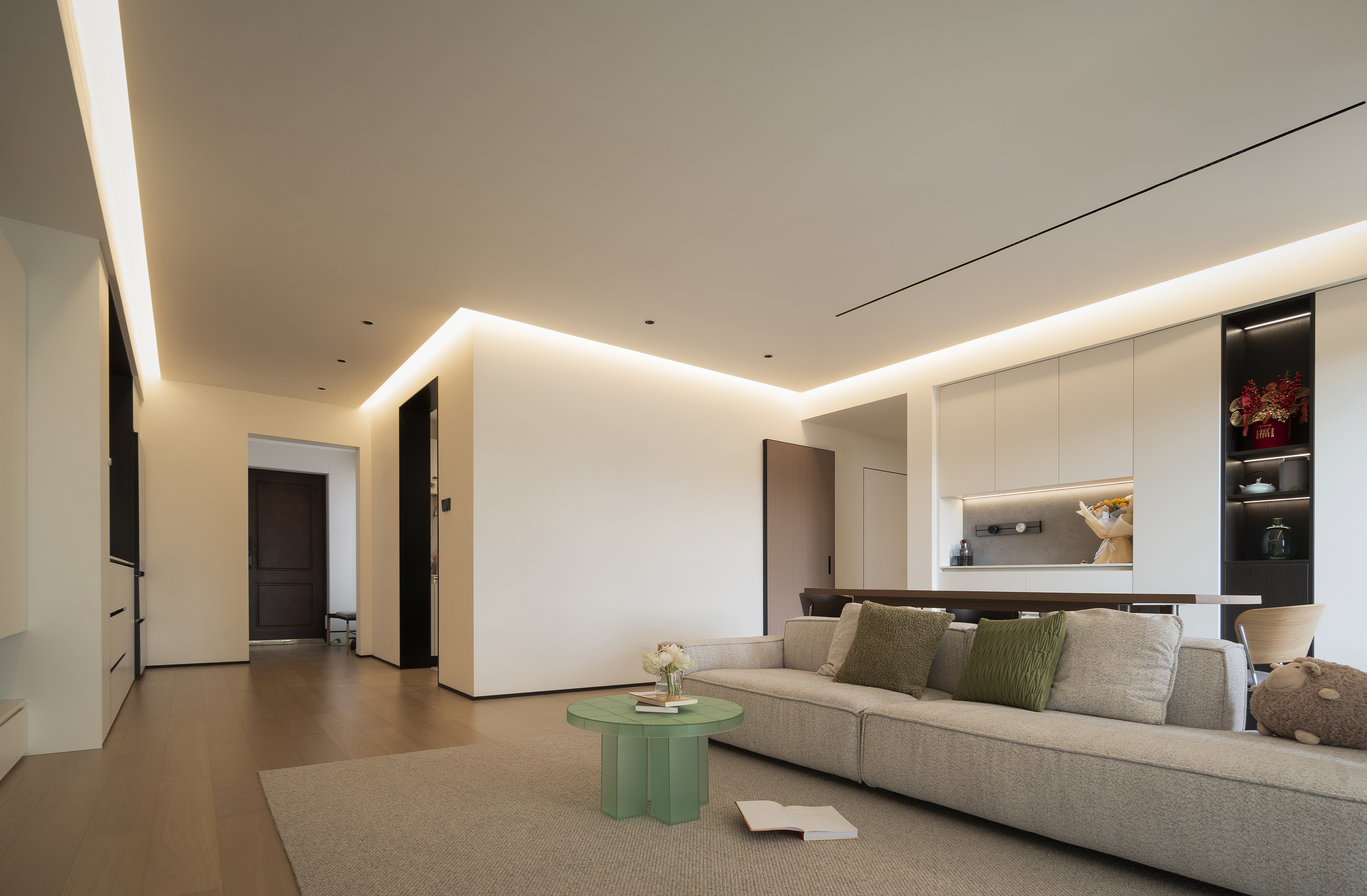 照明上,以隐藏式灯带提供基础光,搭配射灯作重点照明,光影层次丰富。冰绿色圆几点缀,带来生机,让居住者于极简中享受高品质生活,感受内心宁静。 -