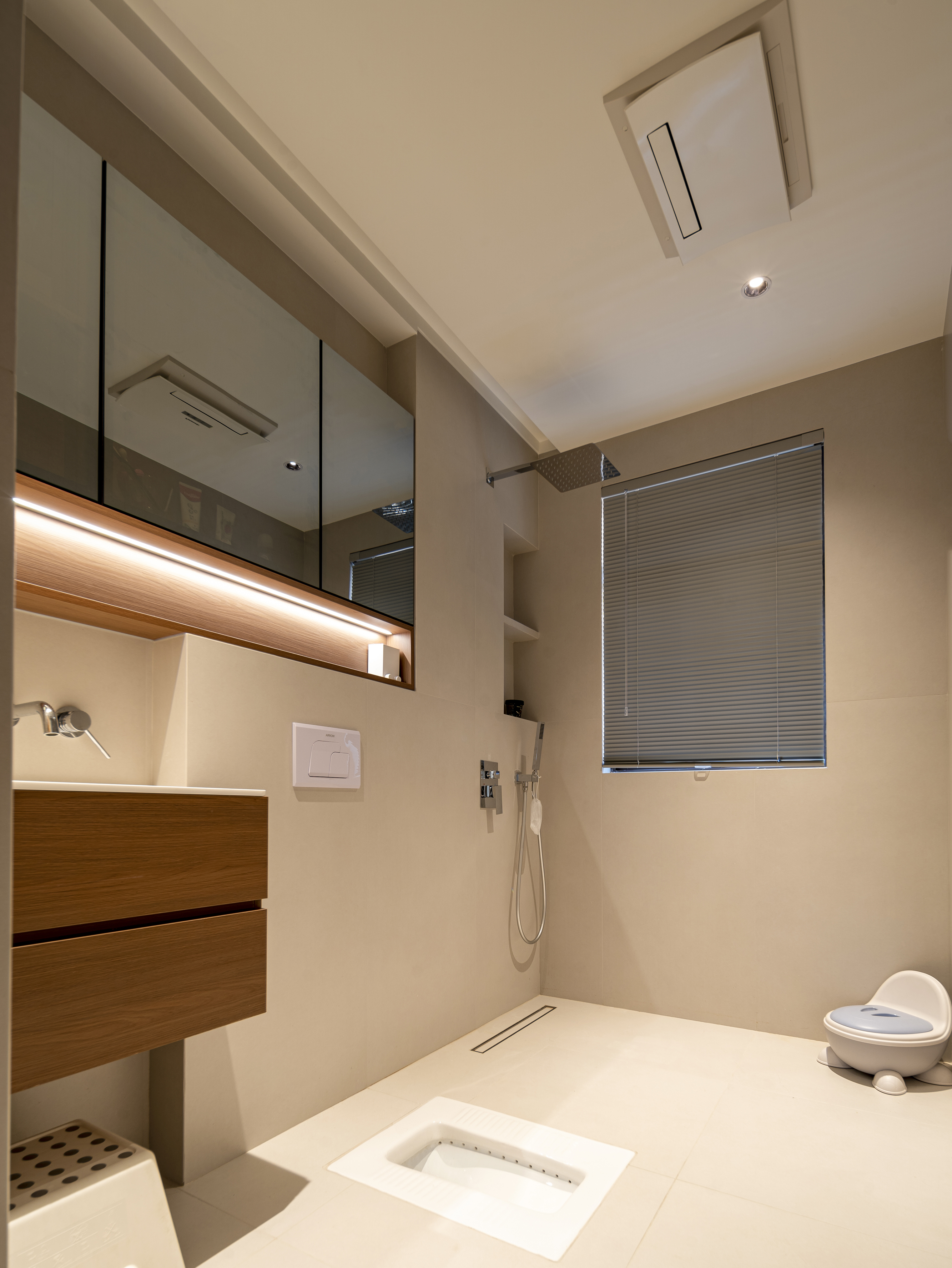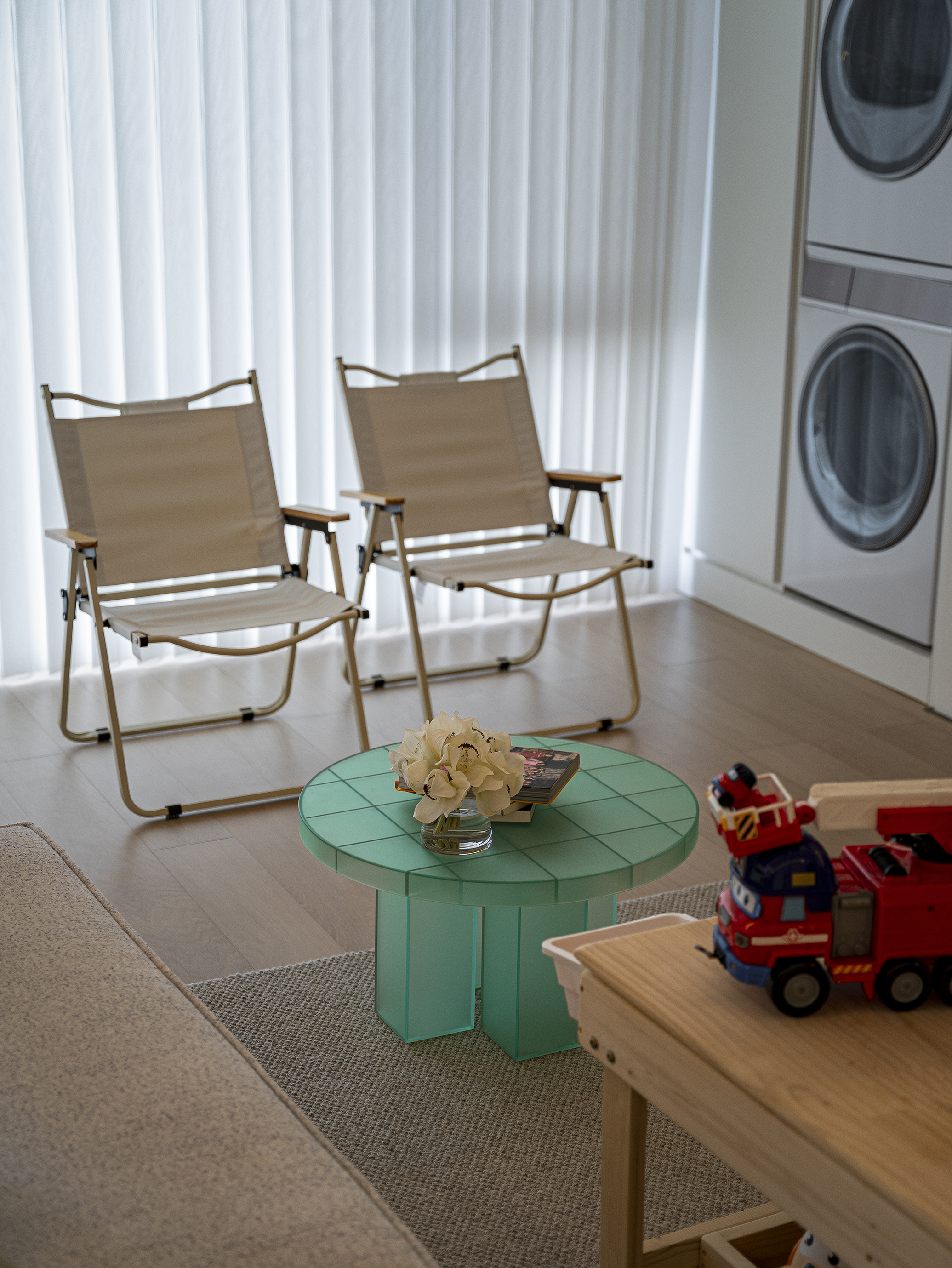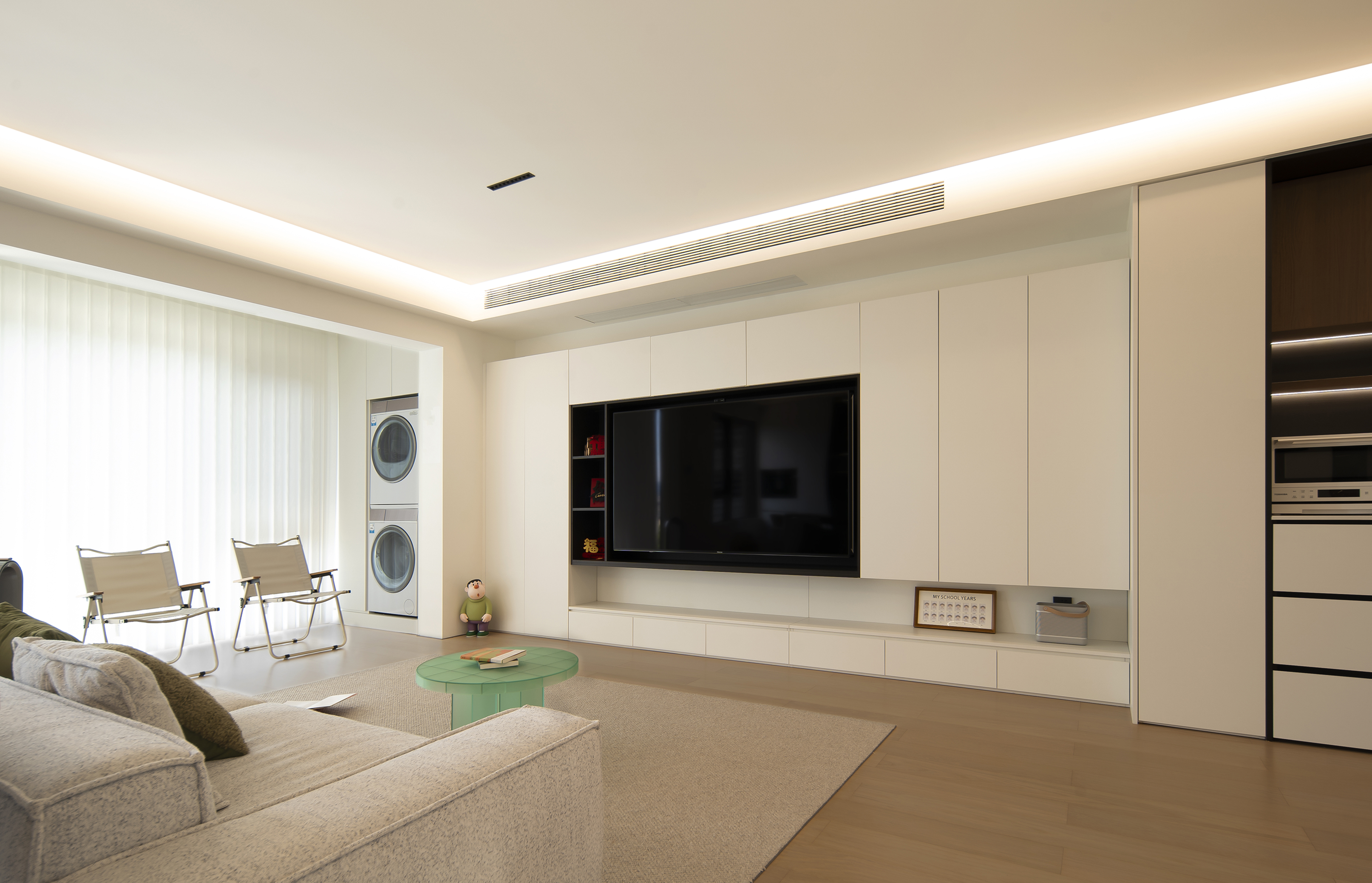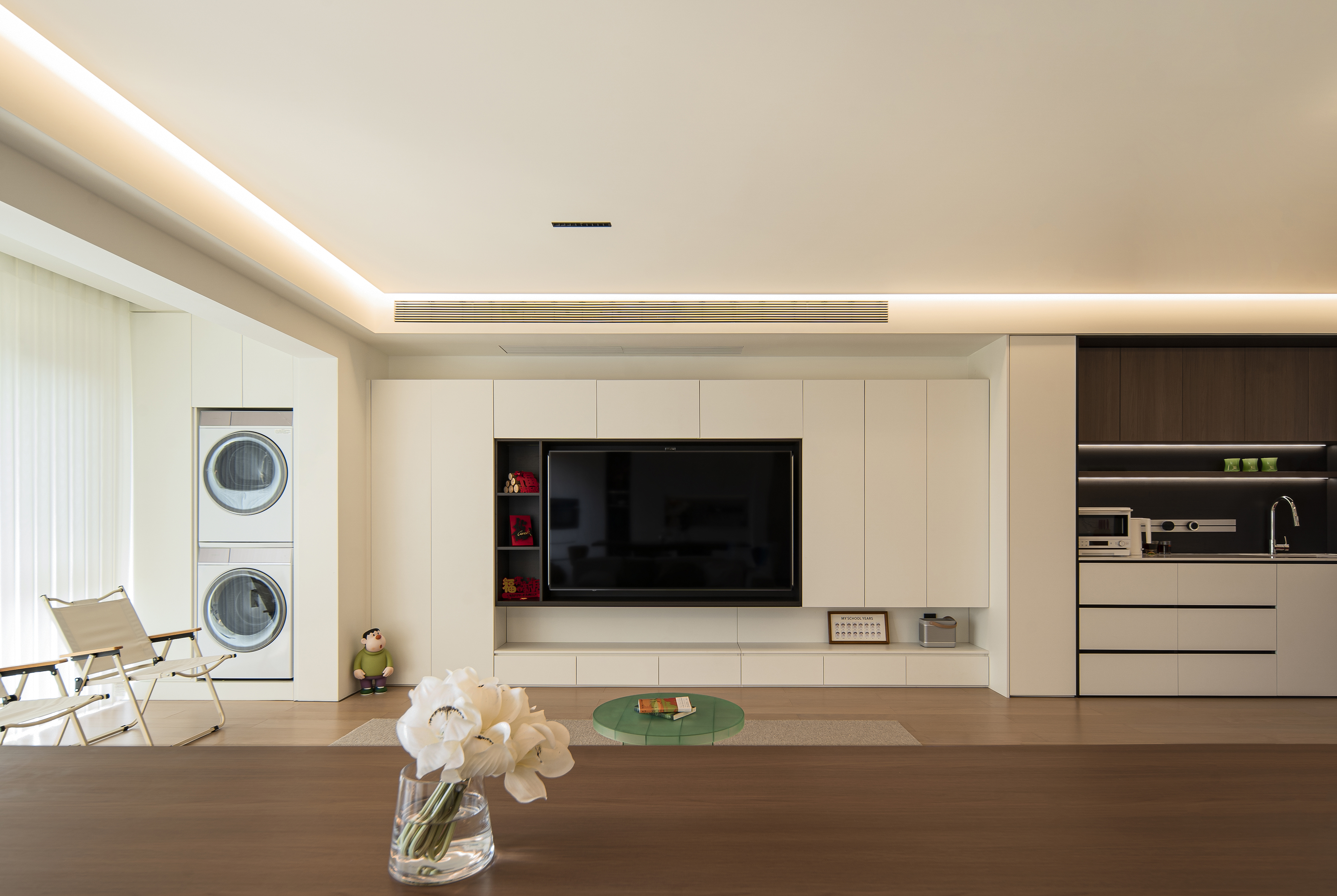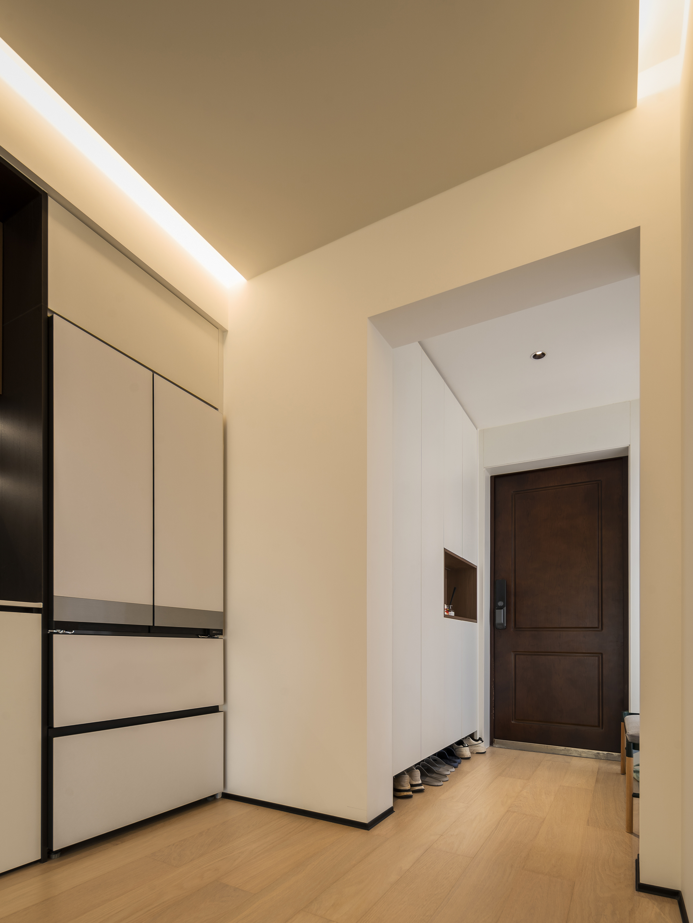 照明上,以隐藏式灯带提供基础光,搭配射灯作重点照明,光影层次丰富。冰绿色圆几点缀,带来生机,让居住者于极简中享受高品质生活,感受内心宁静。 -