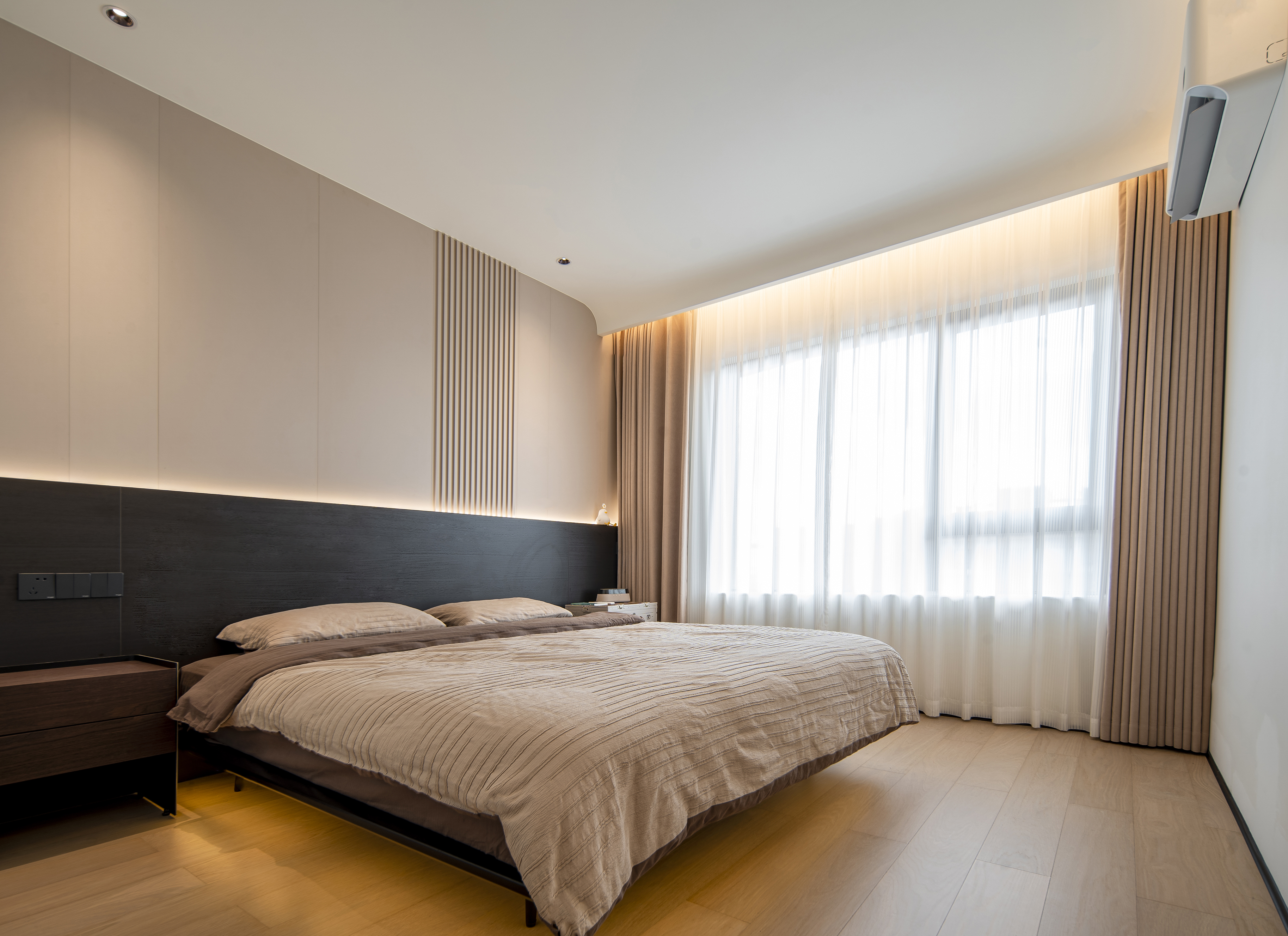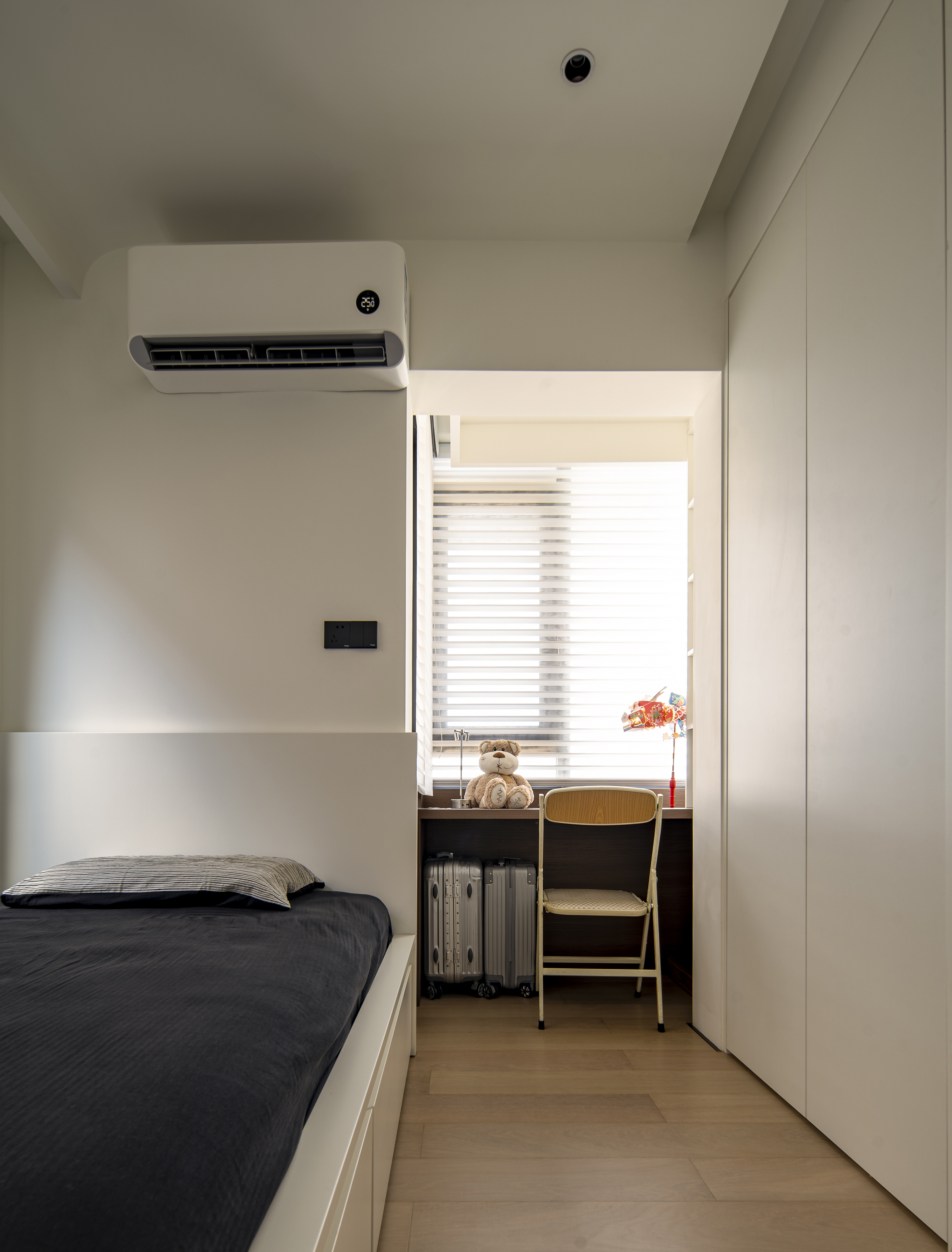 卧室延续极简风,无床头板设计,床品选素色棉麻材质,触感舒适。