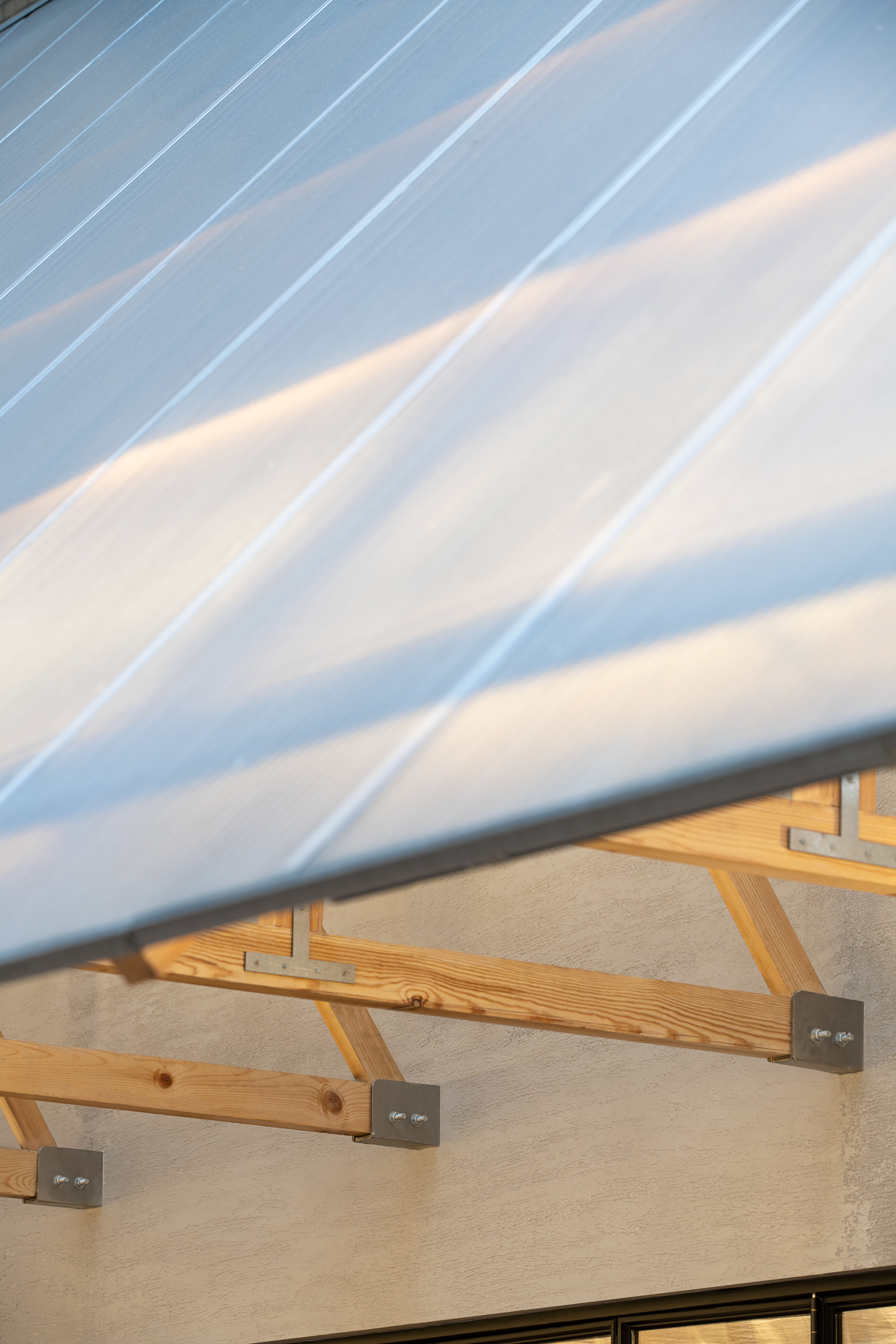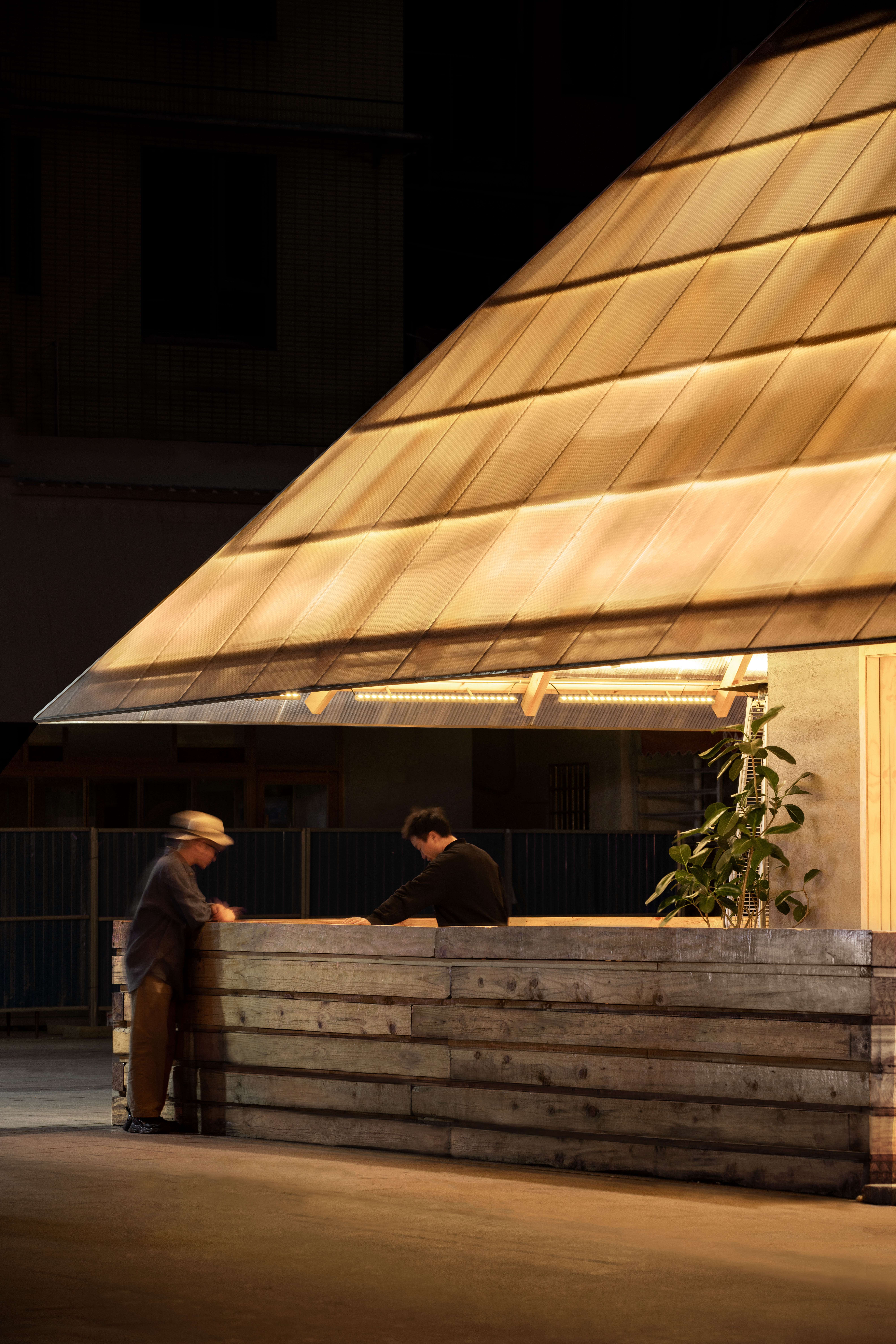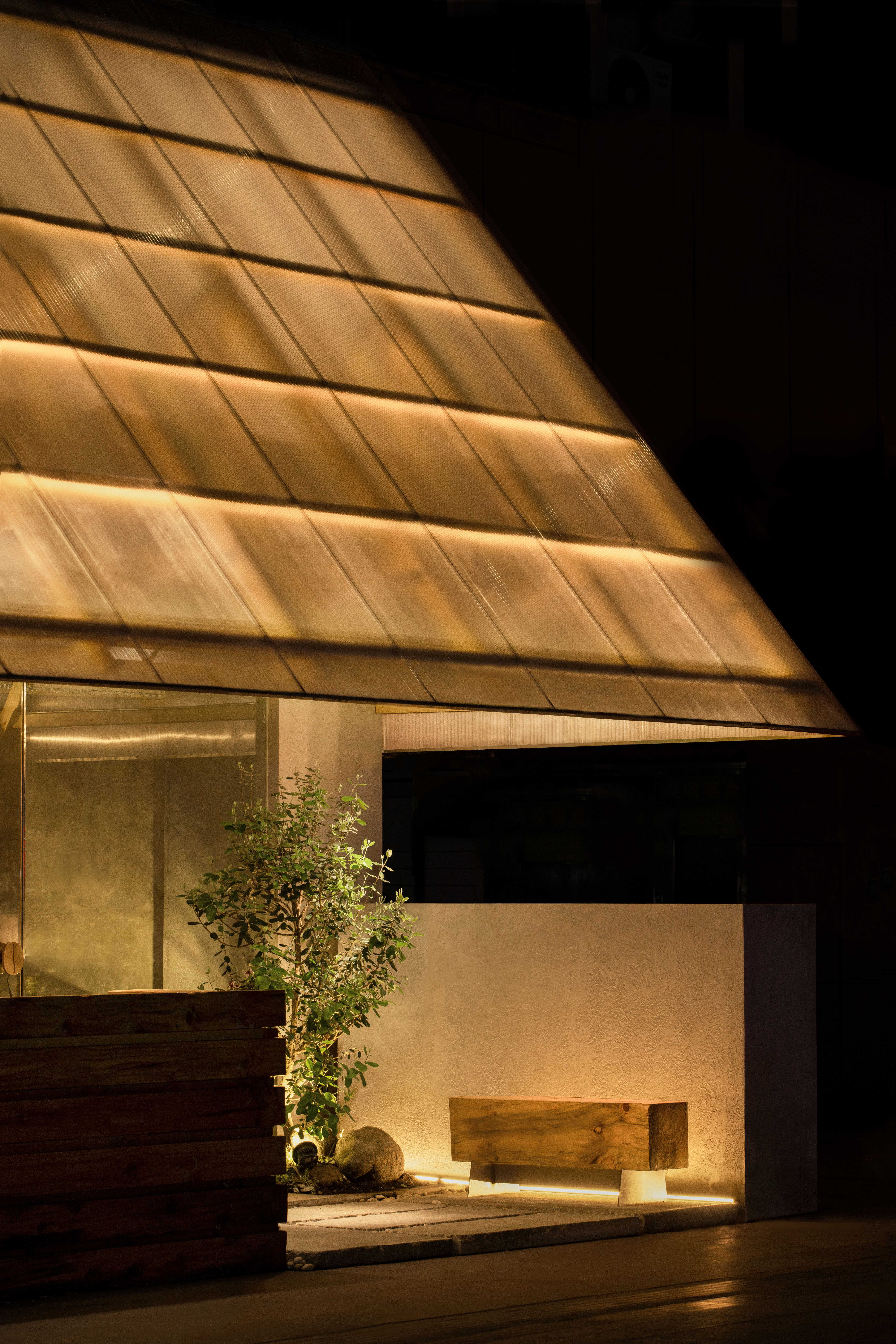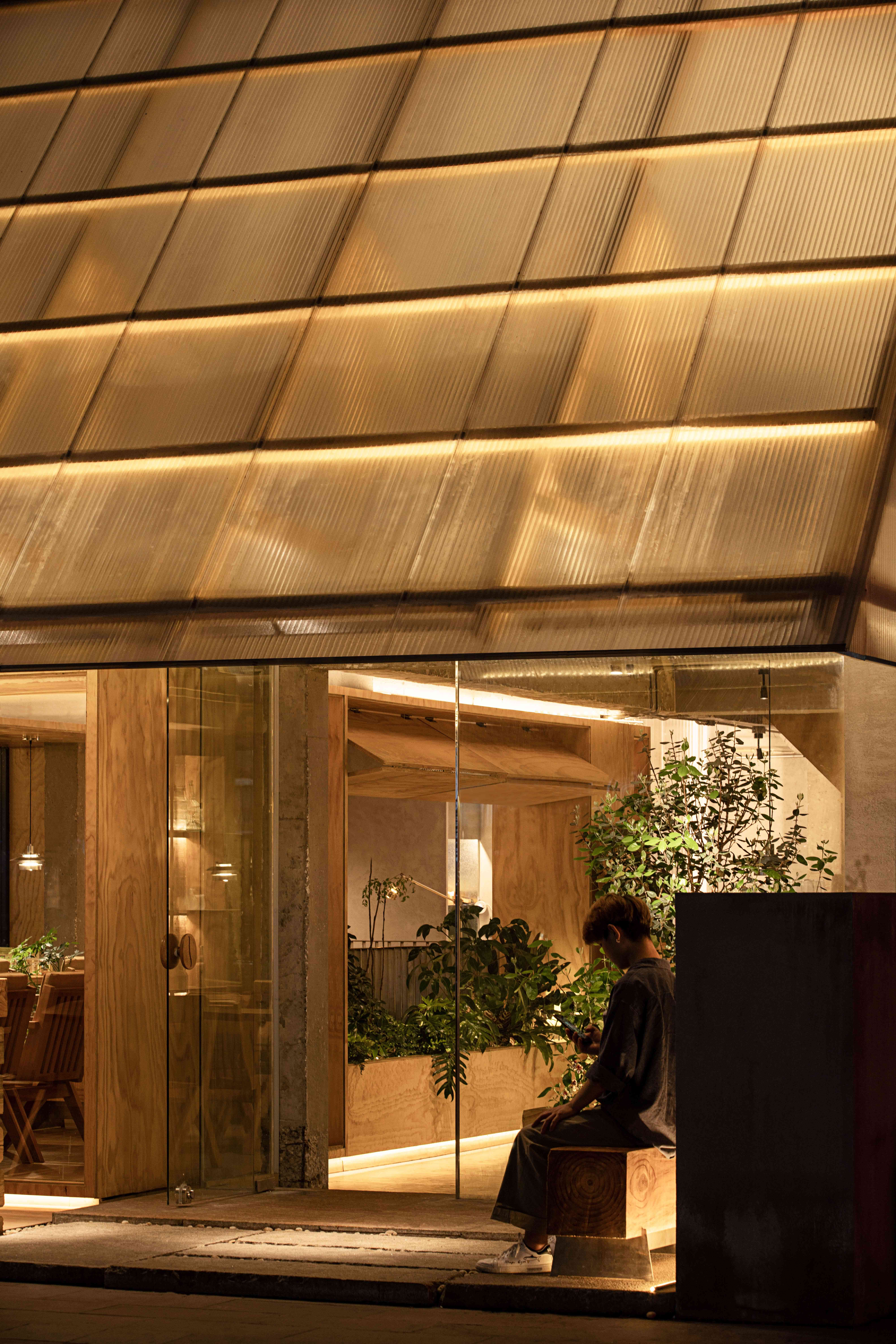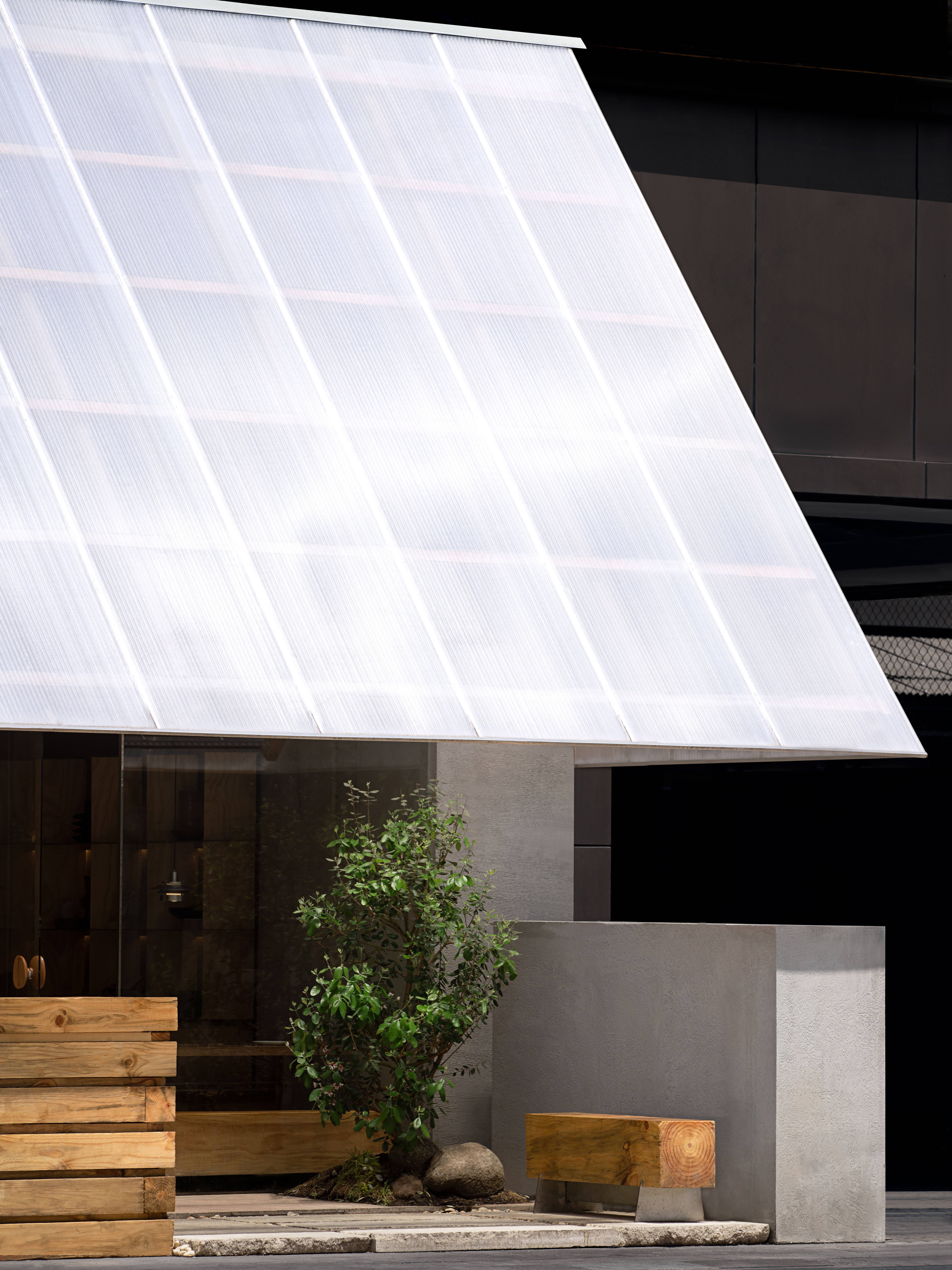 设计选材:阳光板与木结构是天生的搭子。条状排列的木材与阳光板结合,既使得阳光能从半透状的板中透过,光线反射在自然的原木色上,显得格外温暖。