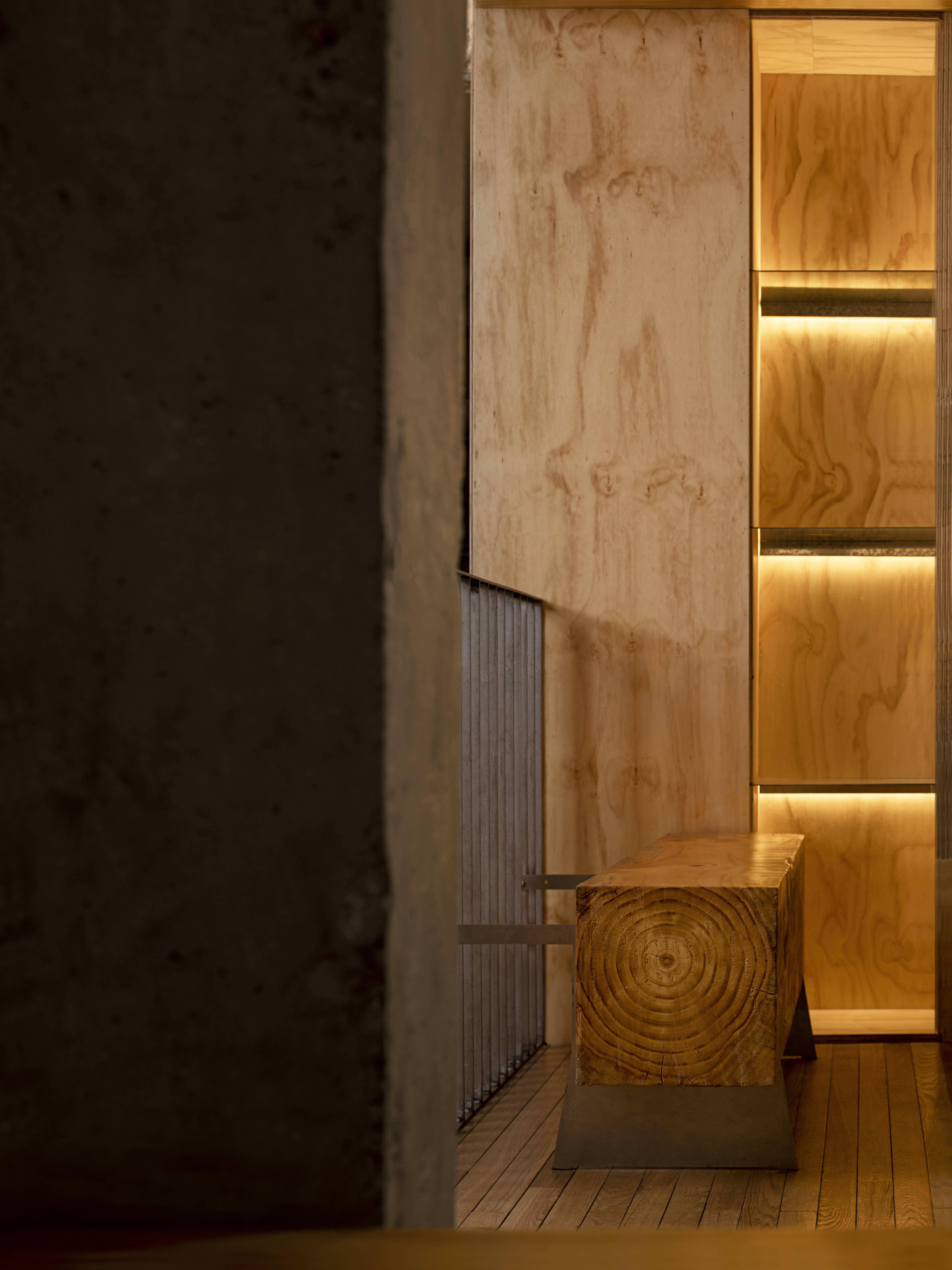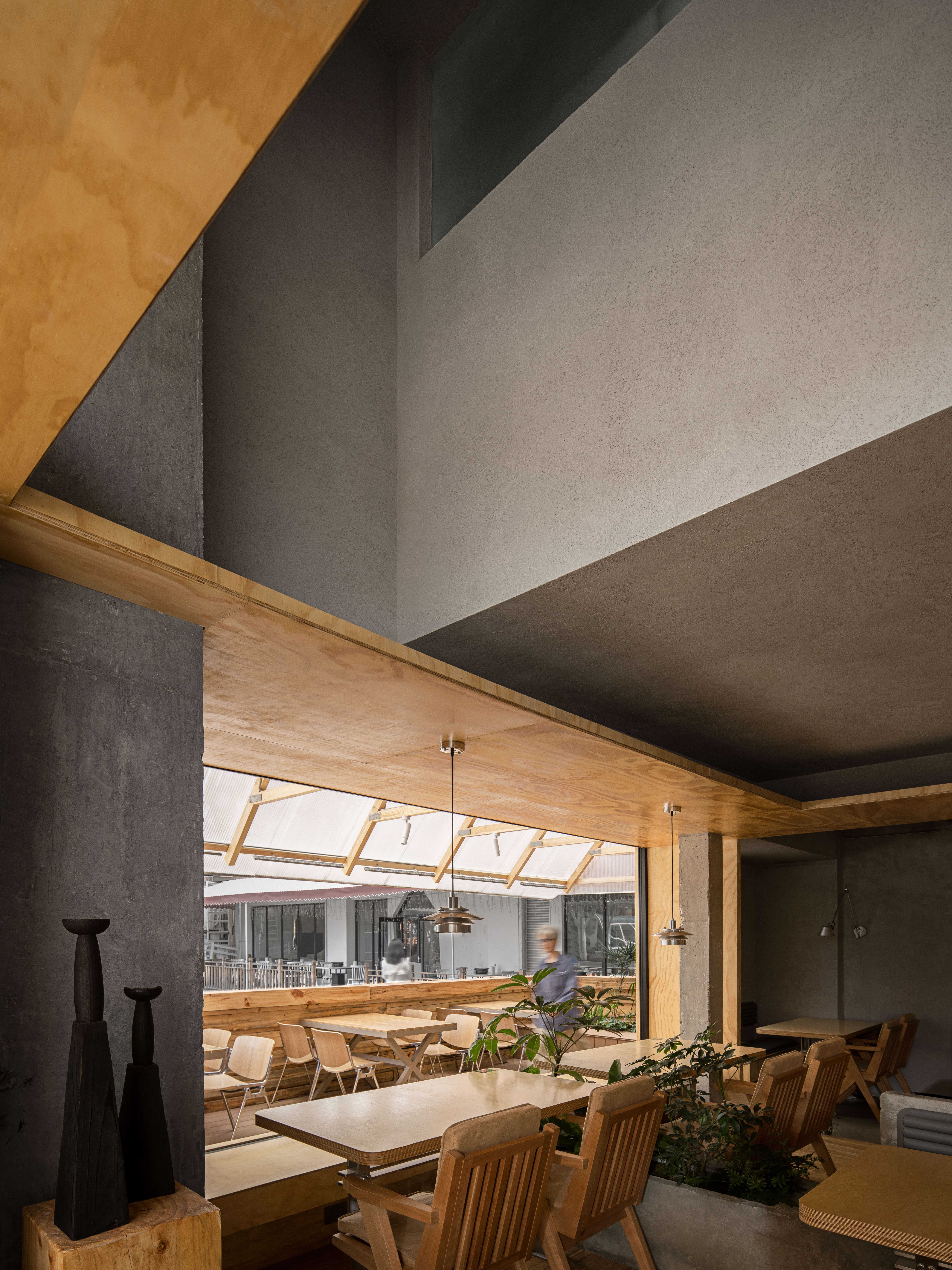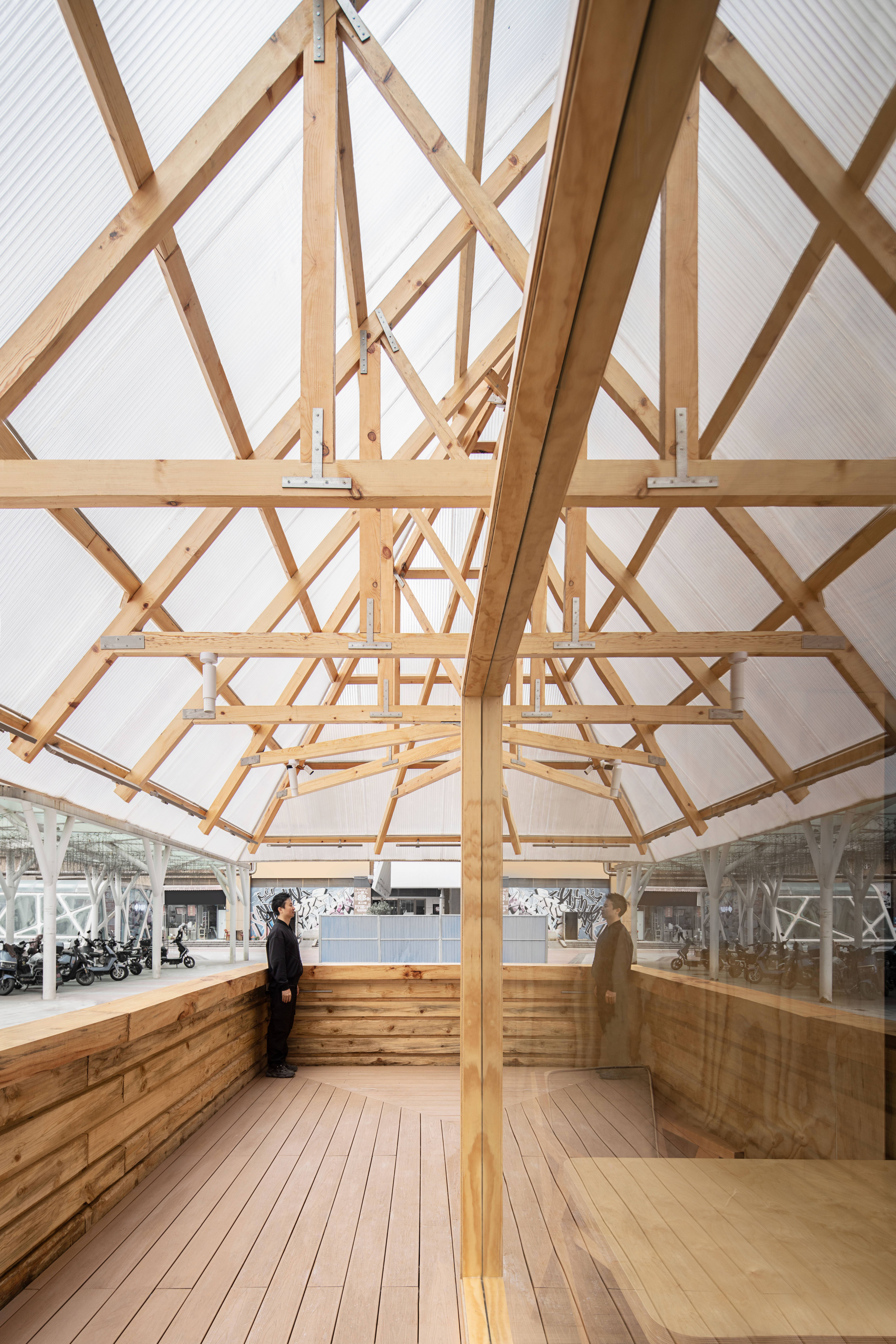 空间布局:屋顶的三角形钢结构有序排列,粗细有致的木线条互相延伸,形成人工构建的序列感。