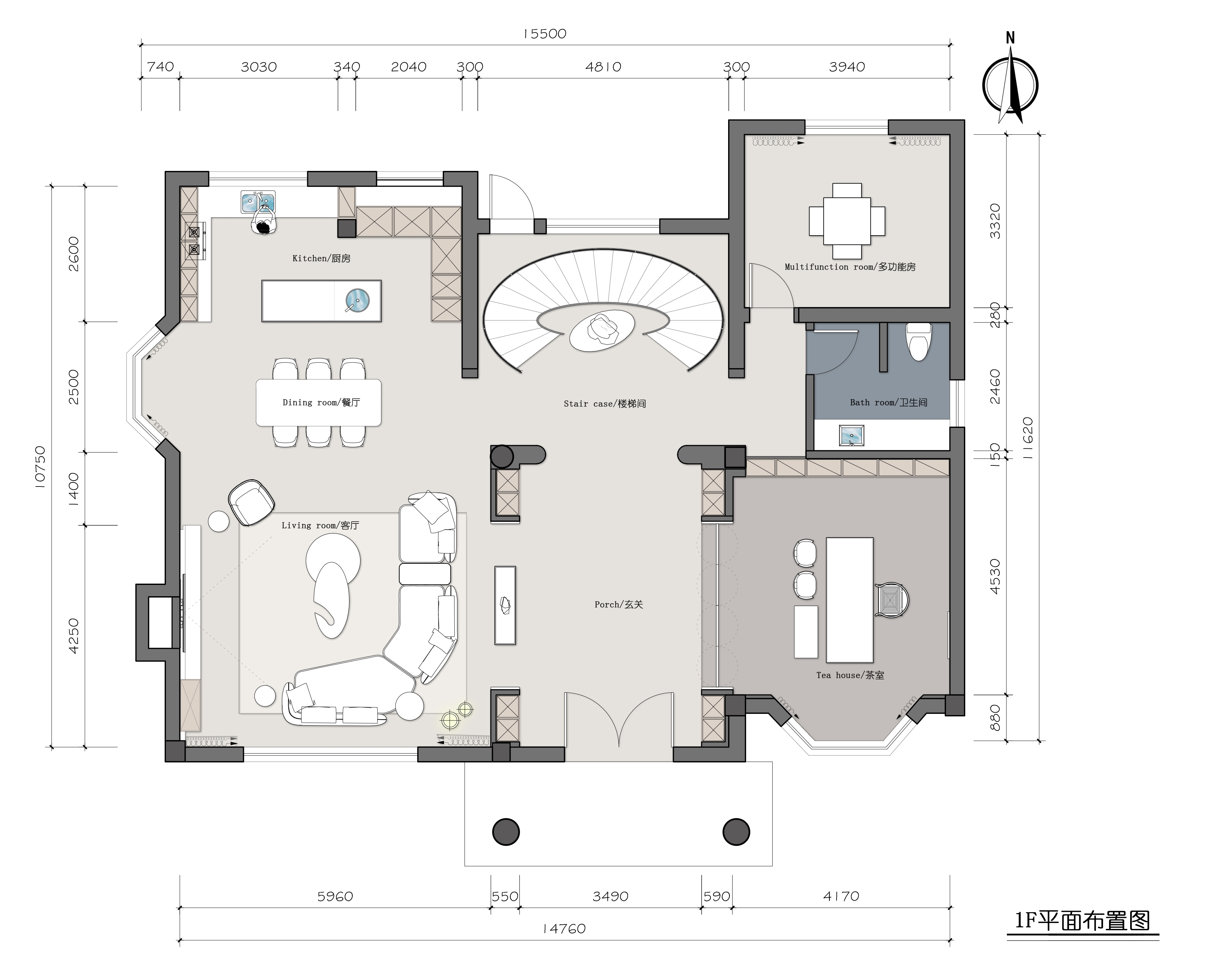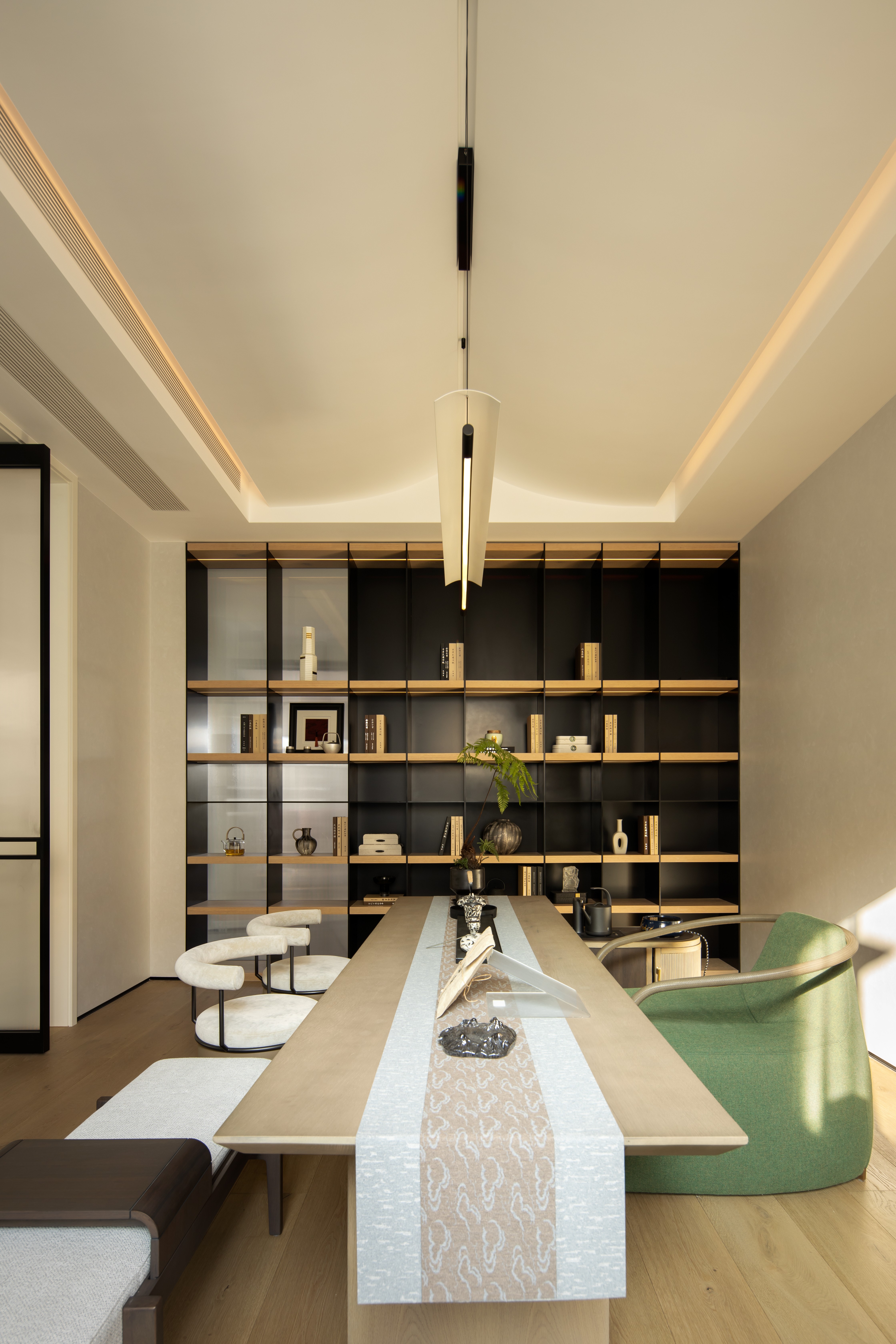 空间布局以楼梯为主轴,一楼做了全开放空间会客、品茶、用餐、棋牌休闲等功能依次排布,满足家庭生活的社交需要。