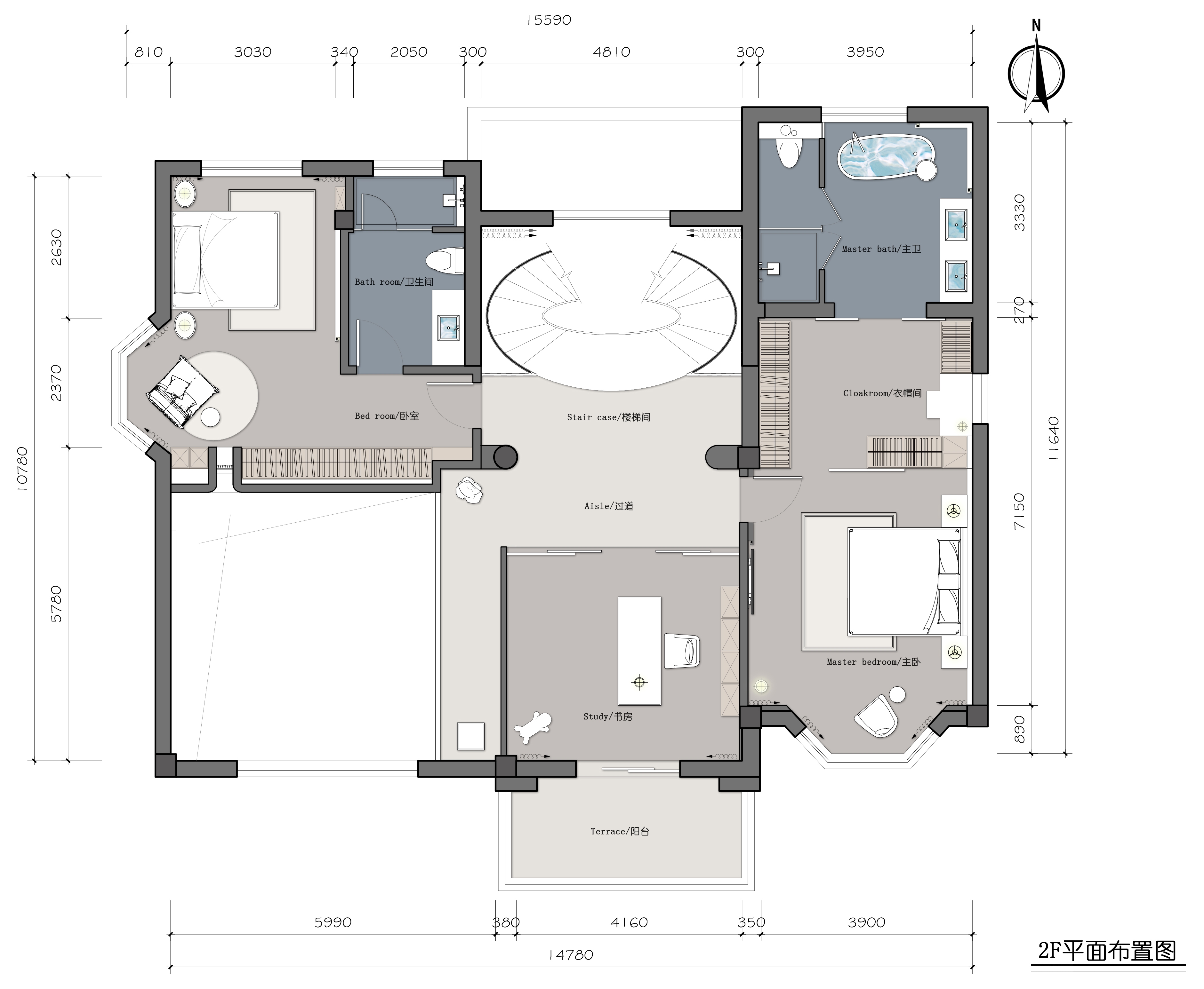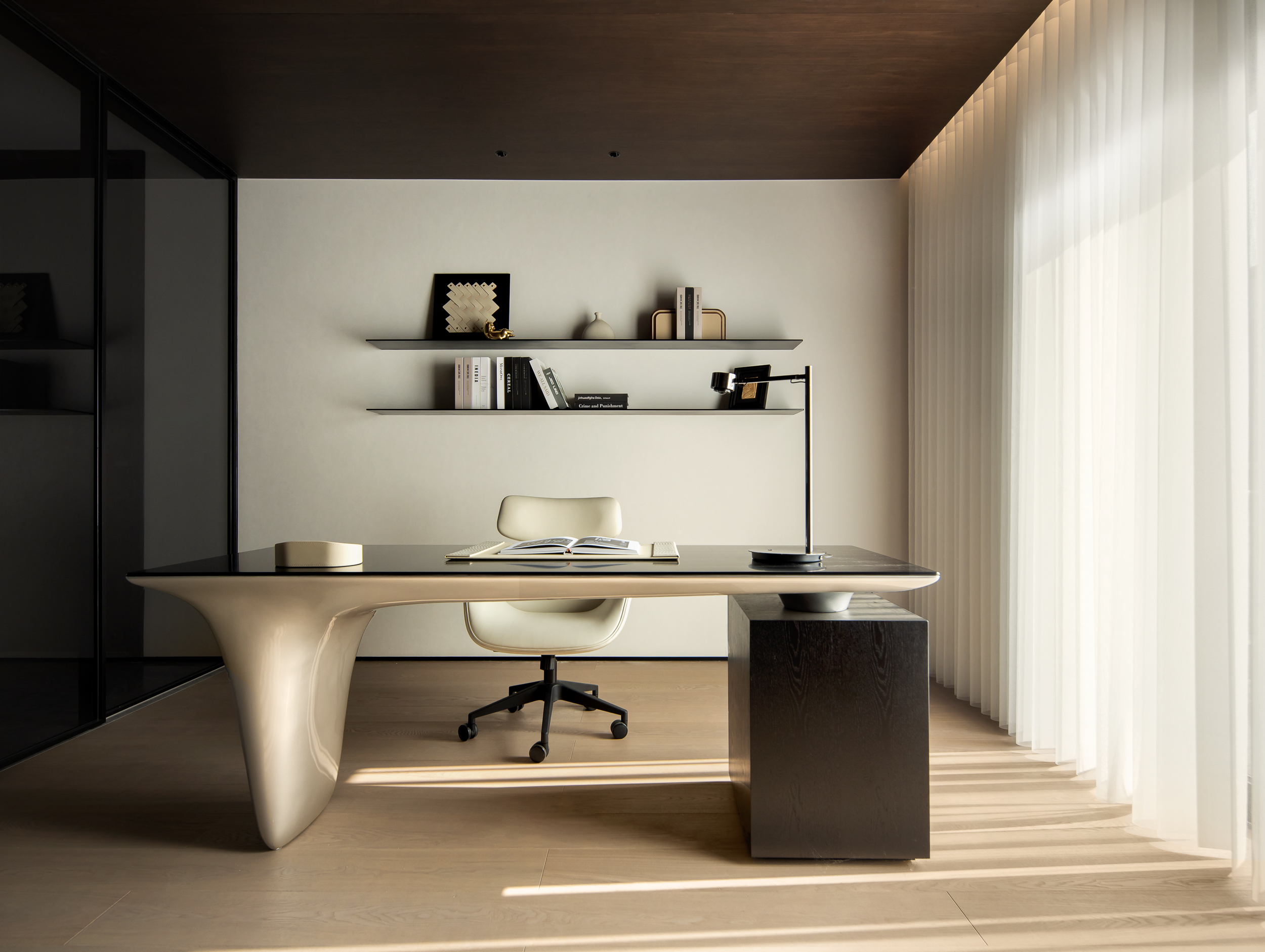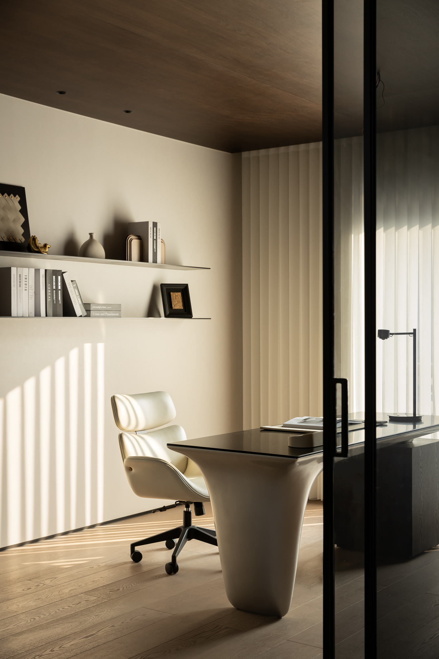 循着楼梯步入二层,映入眼帘的便是一个具有未来性的异型书房。东西两侧设置了主卧和次卧。