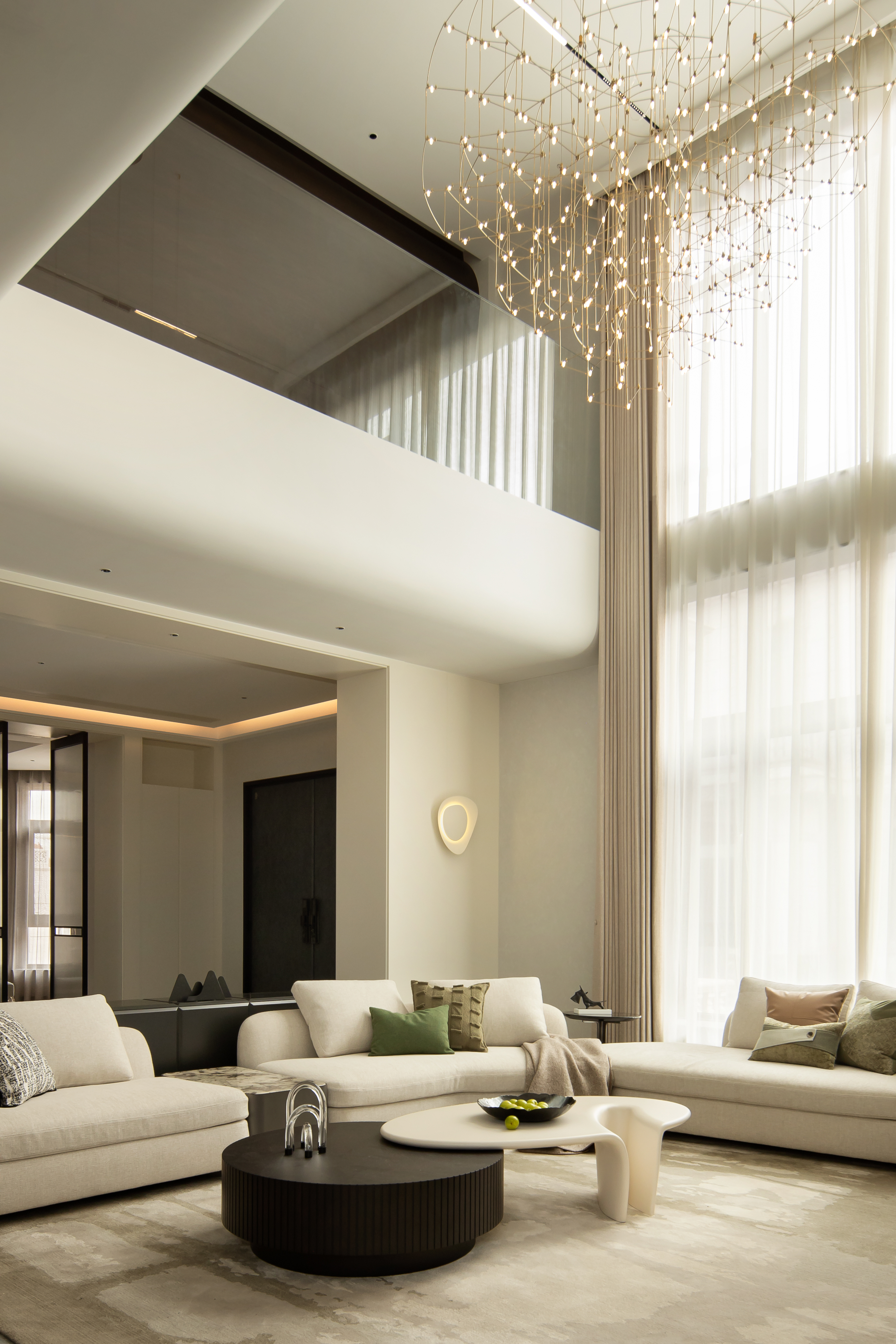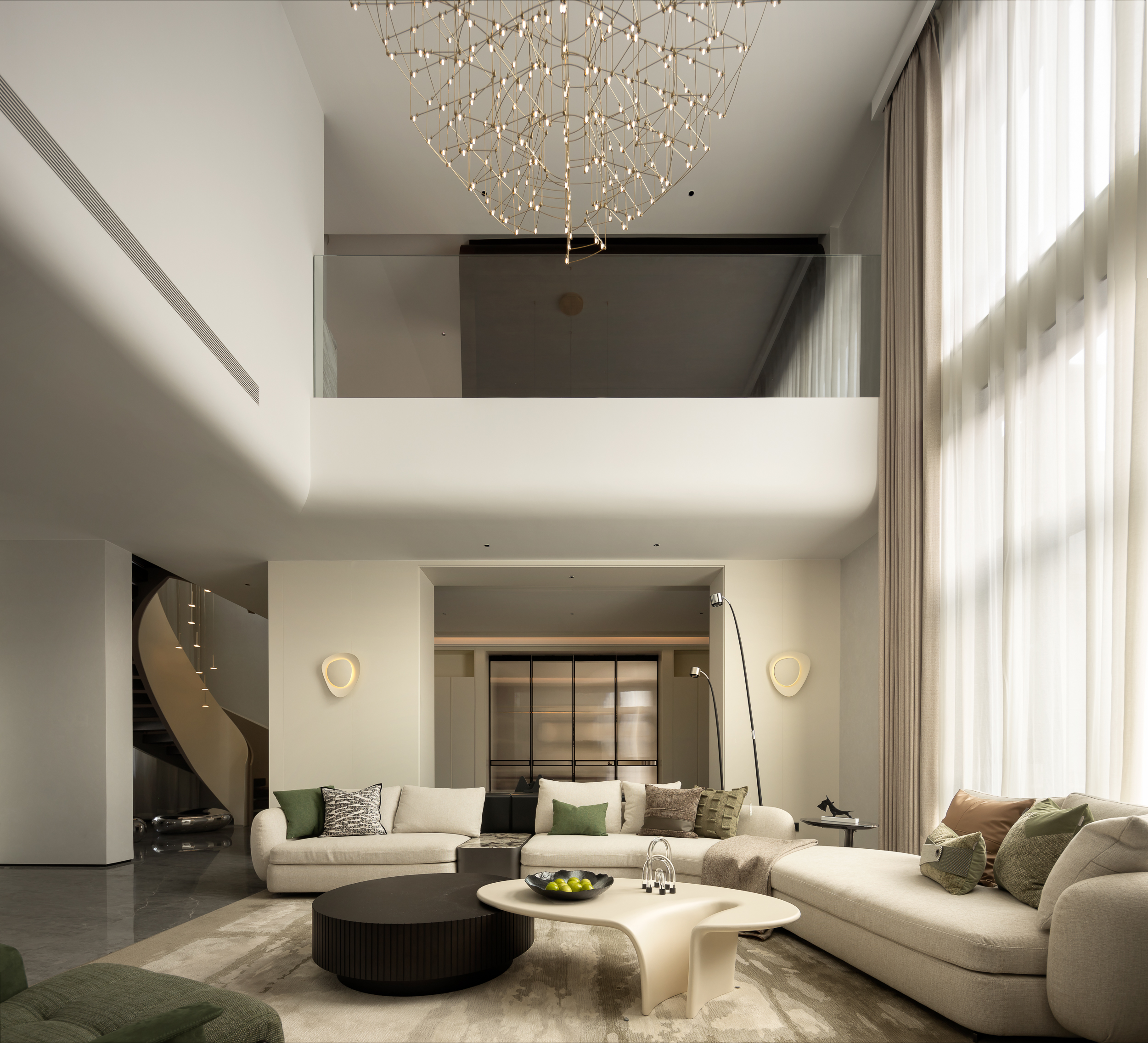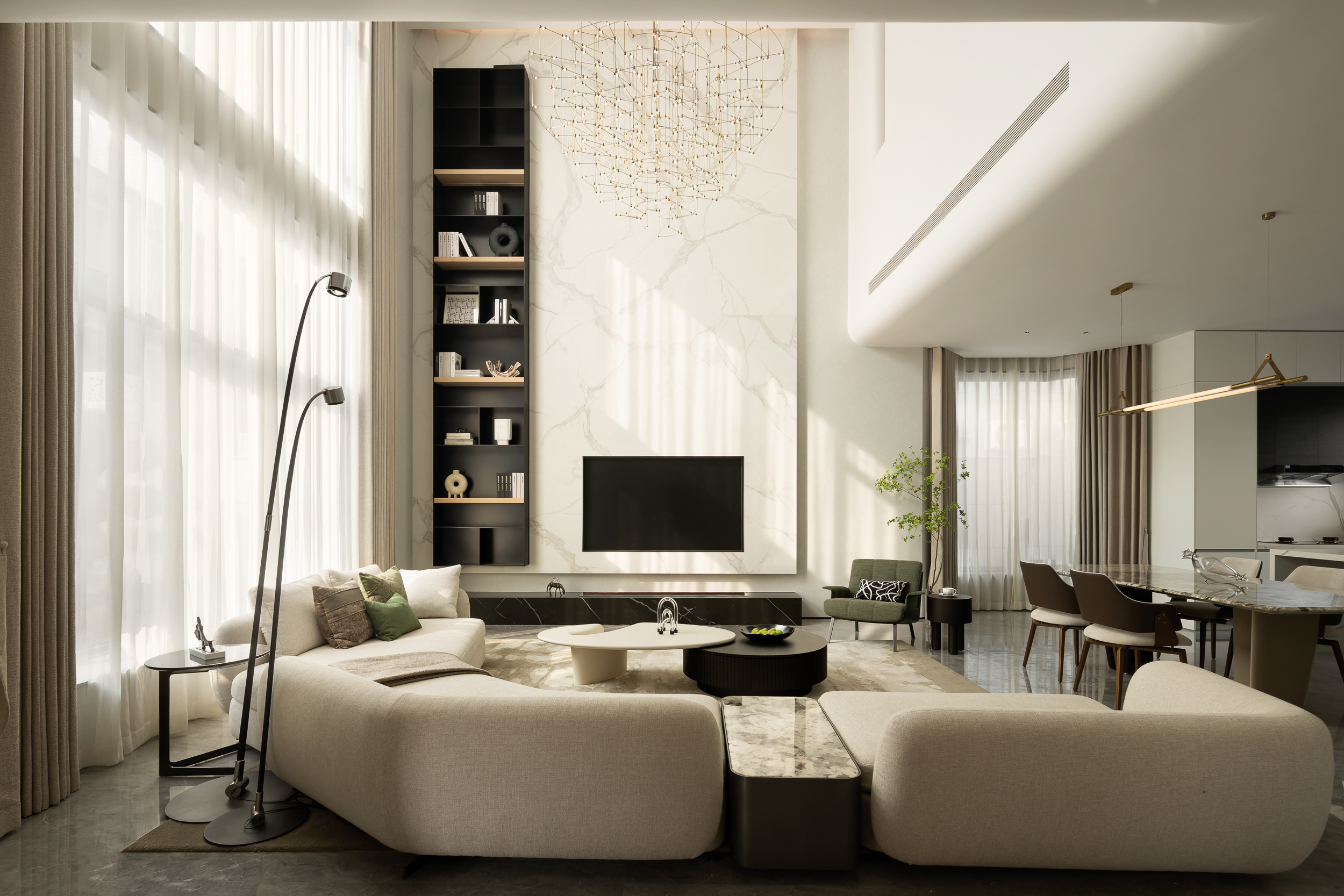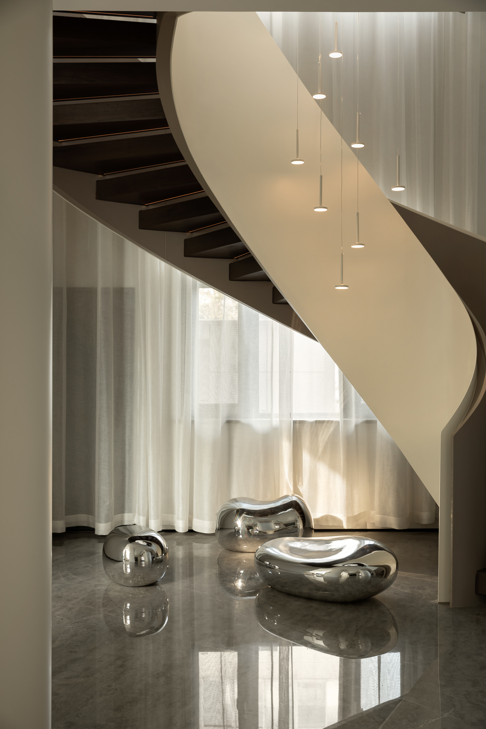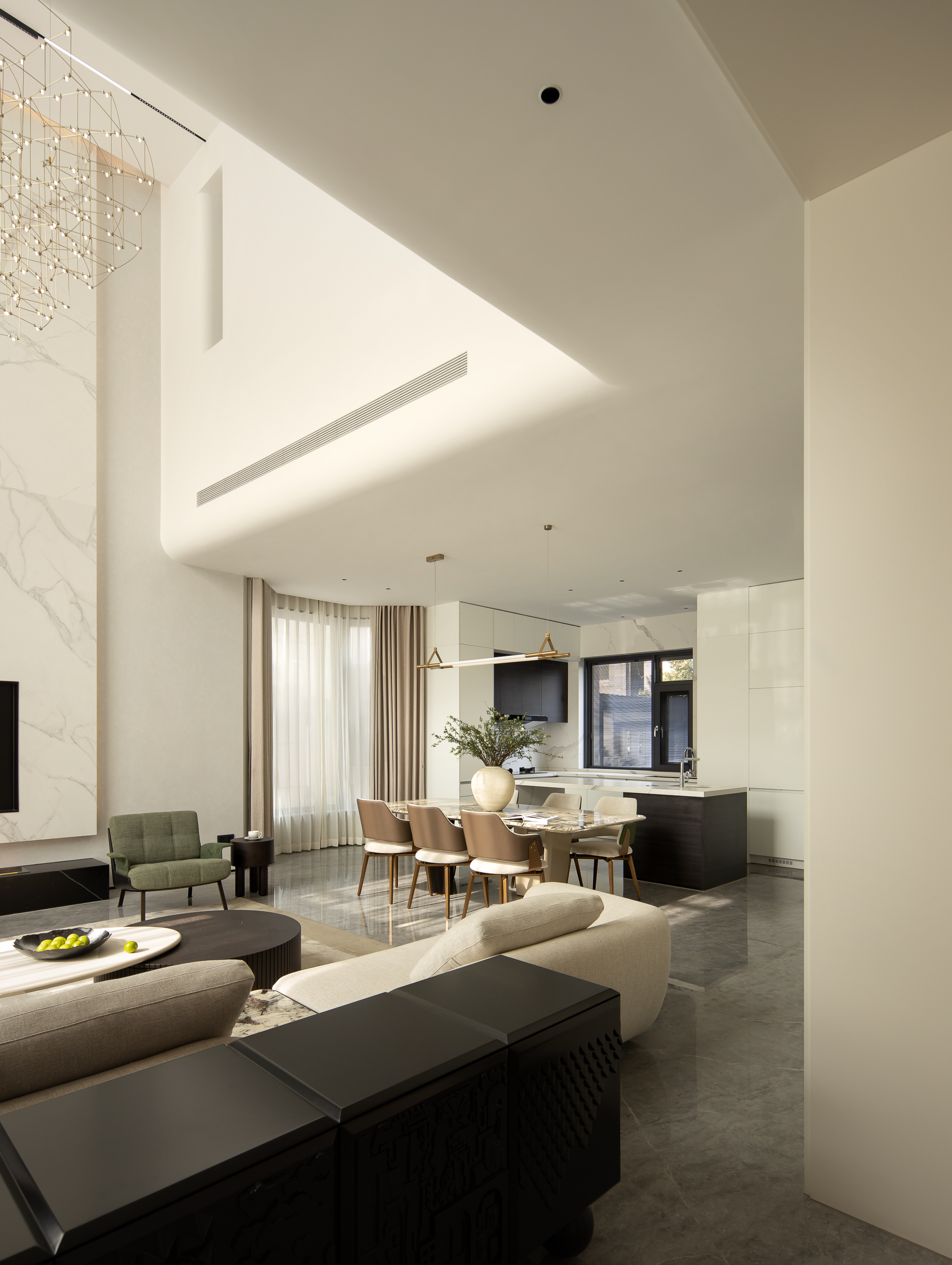 设计师首先对建筑的外立面进行微改,用石材干挂的形式延续原建筑的表面肌理,保持建筑和整体环境的协调性。同时,合理优化室内的空间格局和动线,充分利用空间的挑高的优势,以朗阔的空间尺度,营造大气的氛围、自由的动线和通透的视线,并在界面处理上以曲线勾勒柔和优雅的姿态,打造自由松弛、浪漫且富有未来感的住宅。