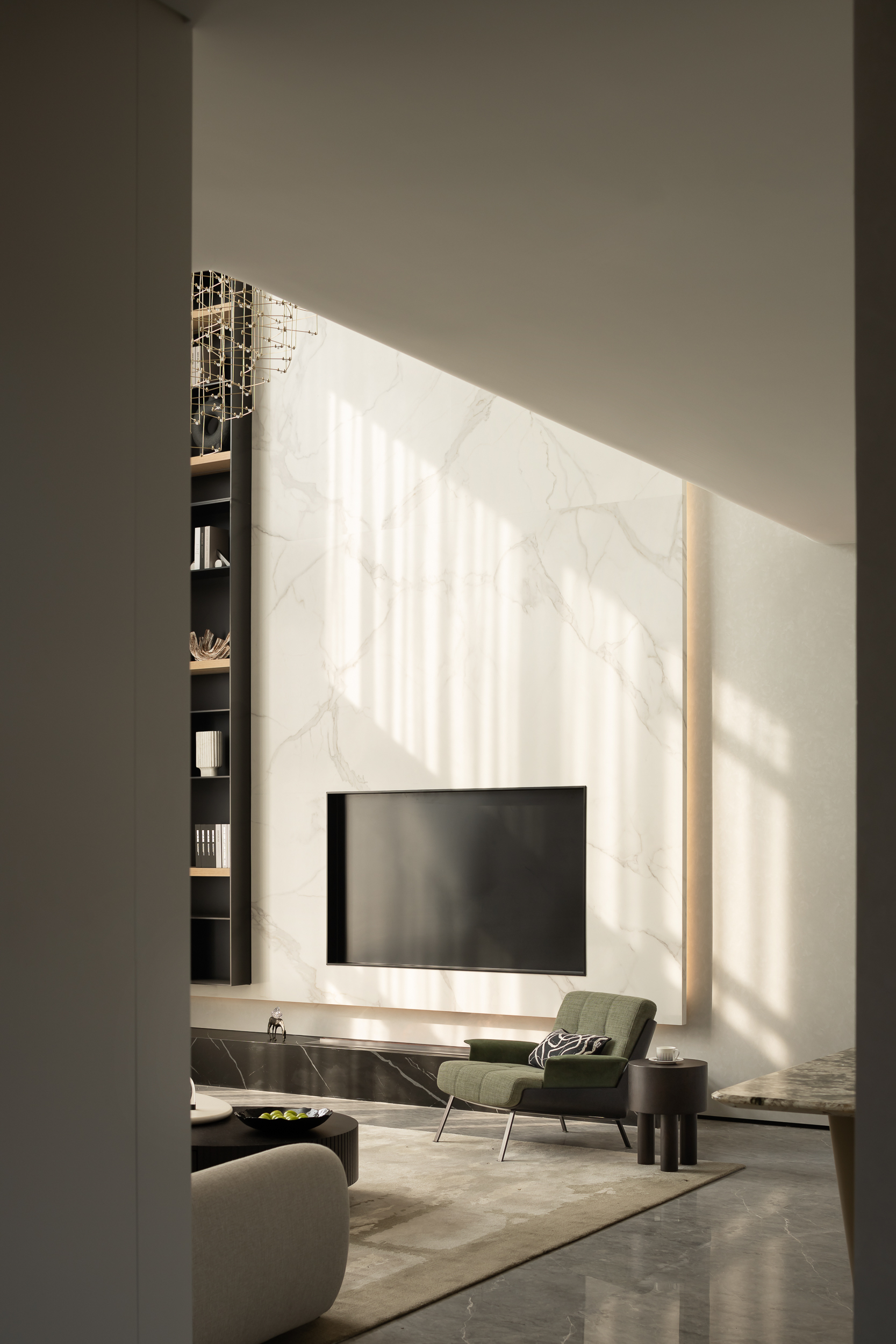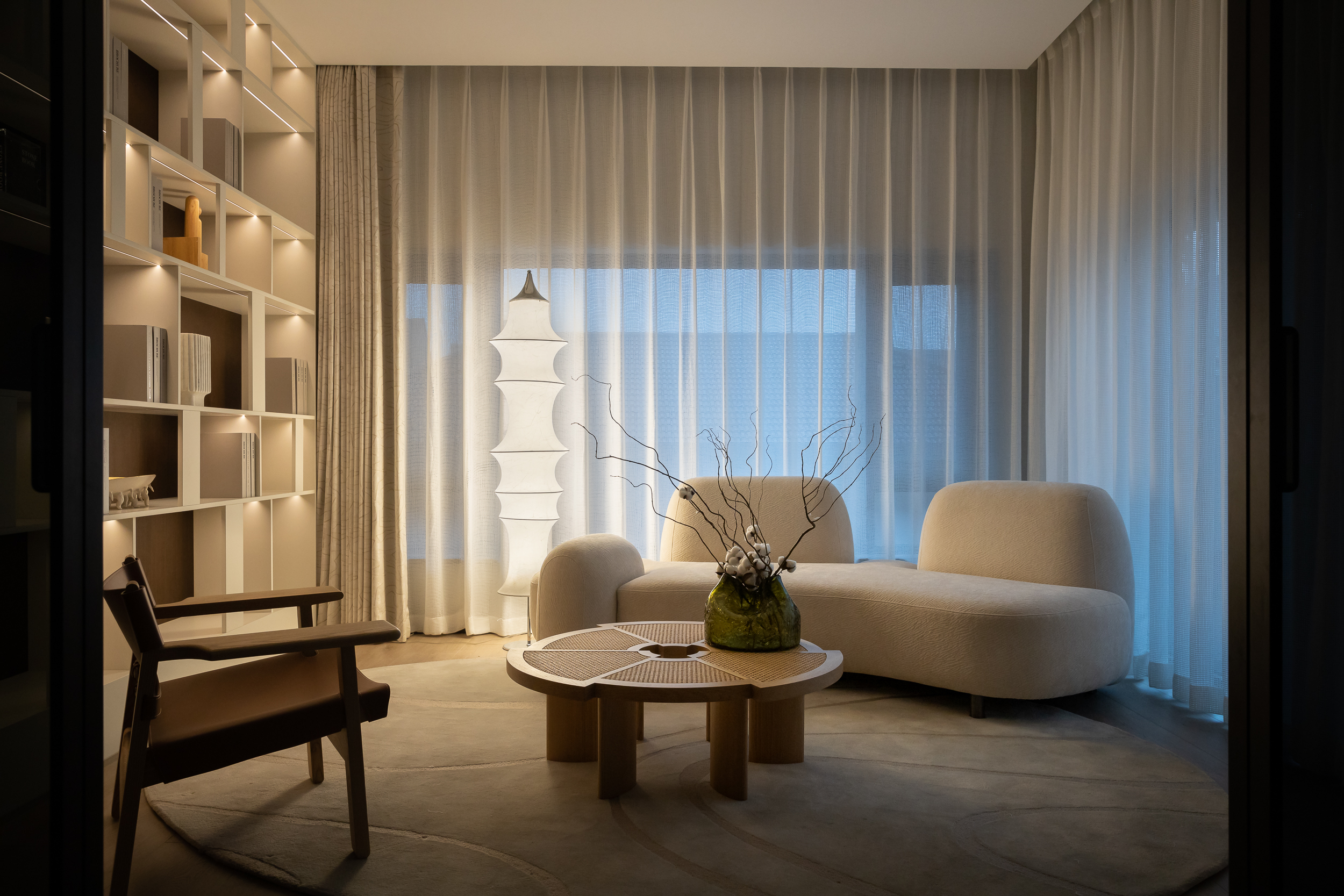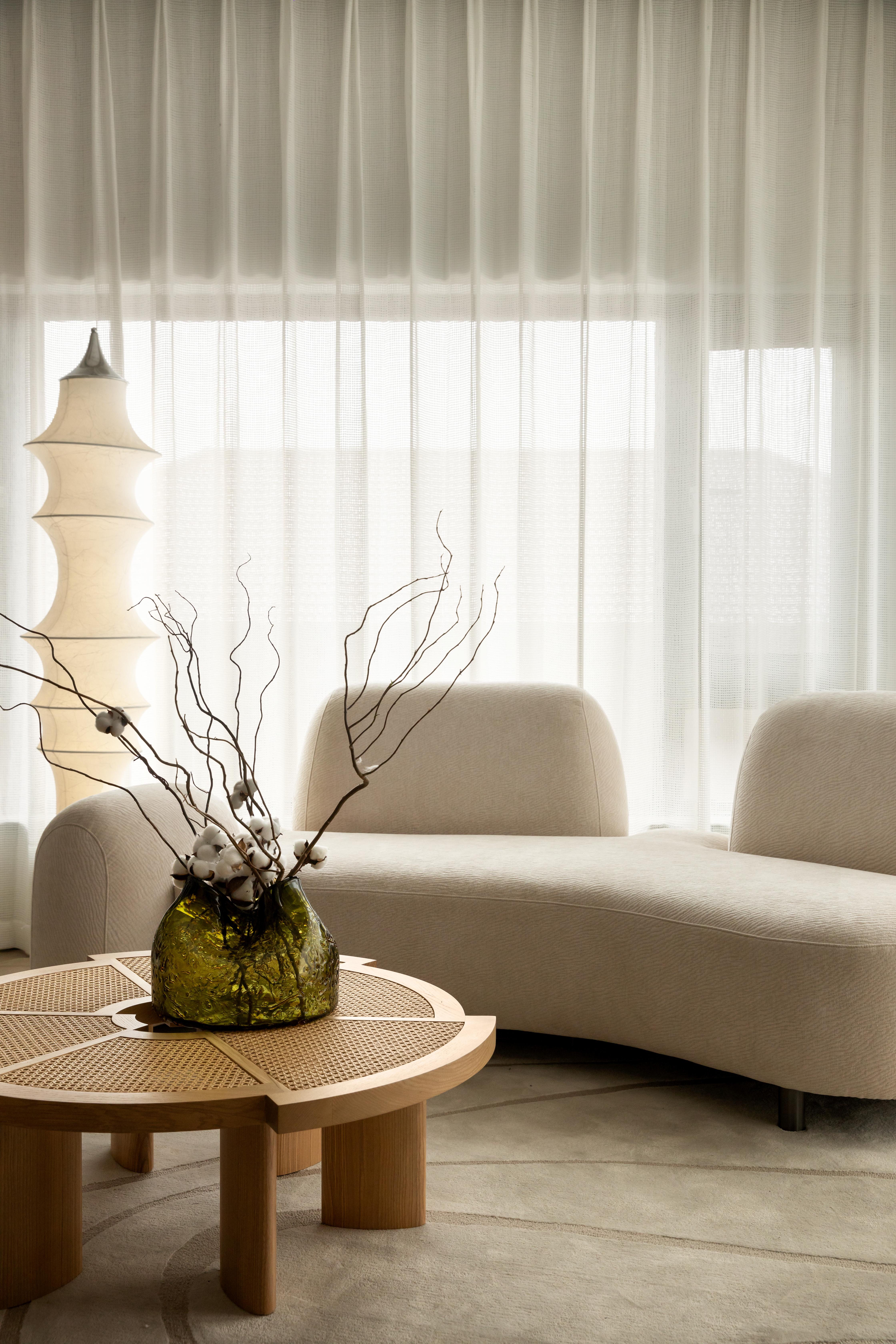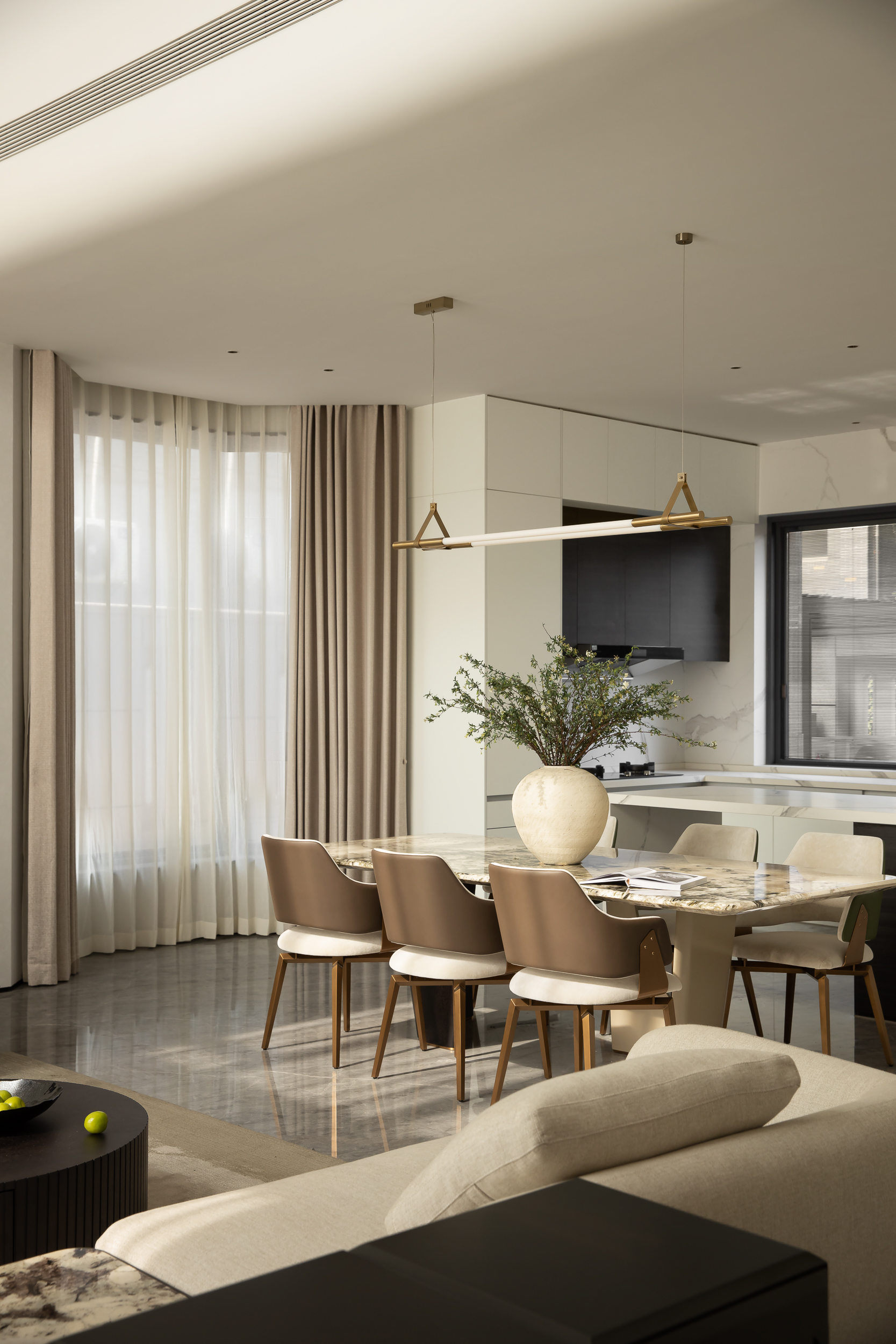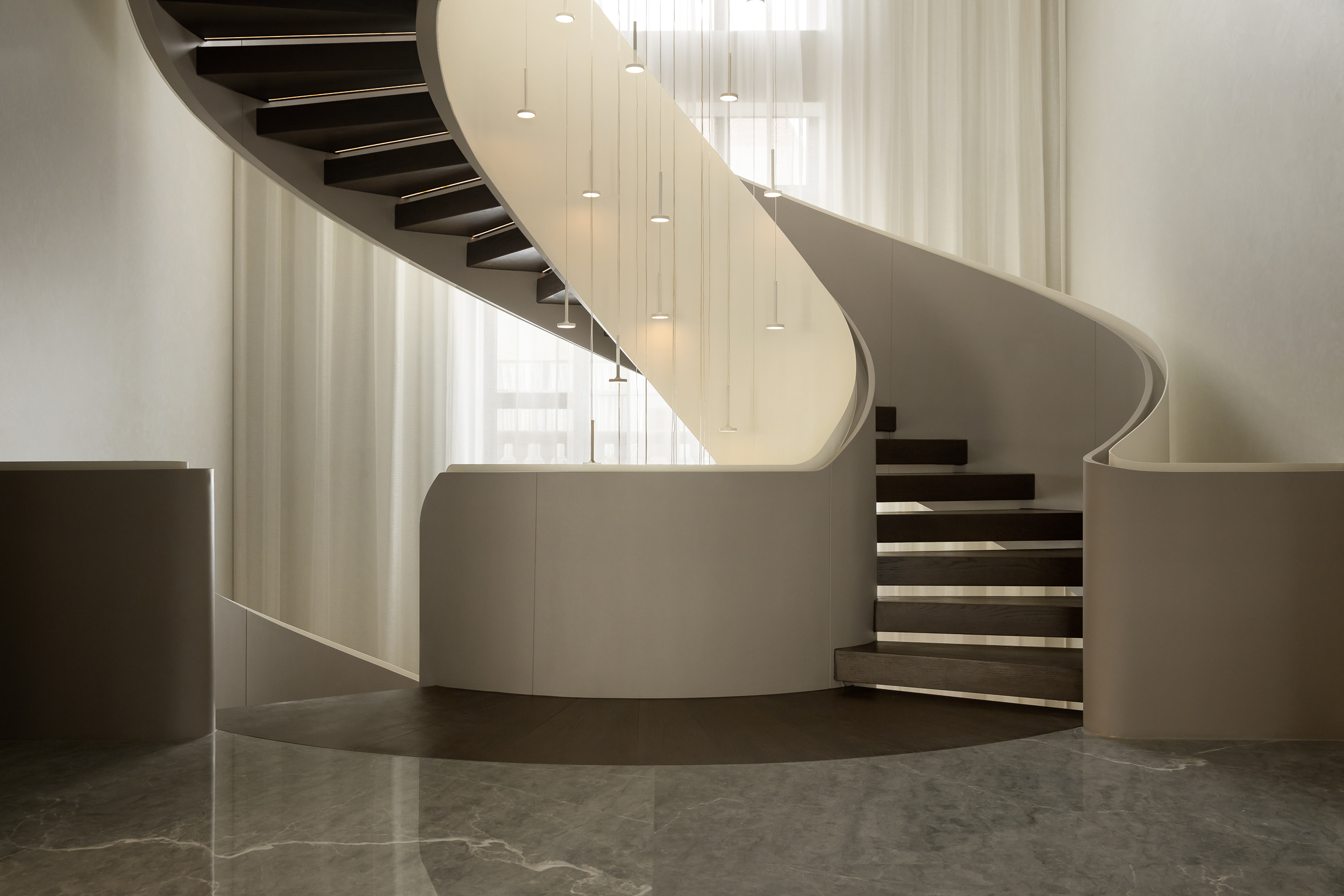 设计师首先对建筑的外立面进行微改,用石材干挂的形式延续原建筑的表面肌理,保持建筑和整体环境的协调性。同时,合理优化室内的空间格局和动线,充分利用空间的挑高的优势,以朗阔的空间尺度,营造大气的氛围、自由的动线和通透的视线,并在界面处理上以曲线勾勒柔和优雅的姿态,打造自由松弛、浪漫且富有未来感的住宅。