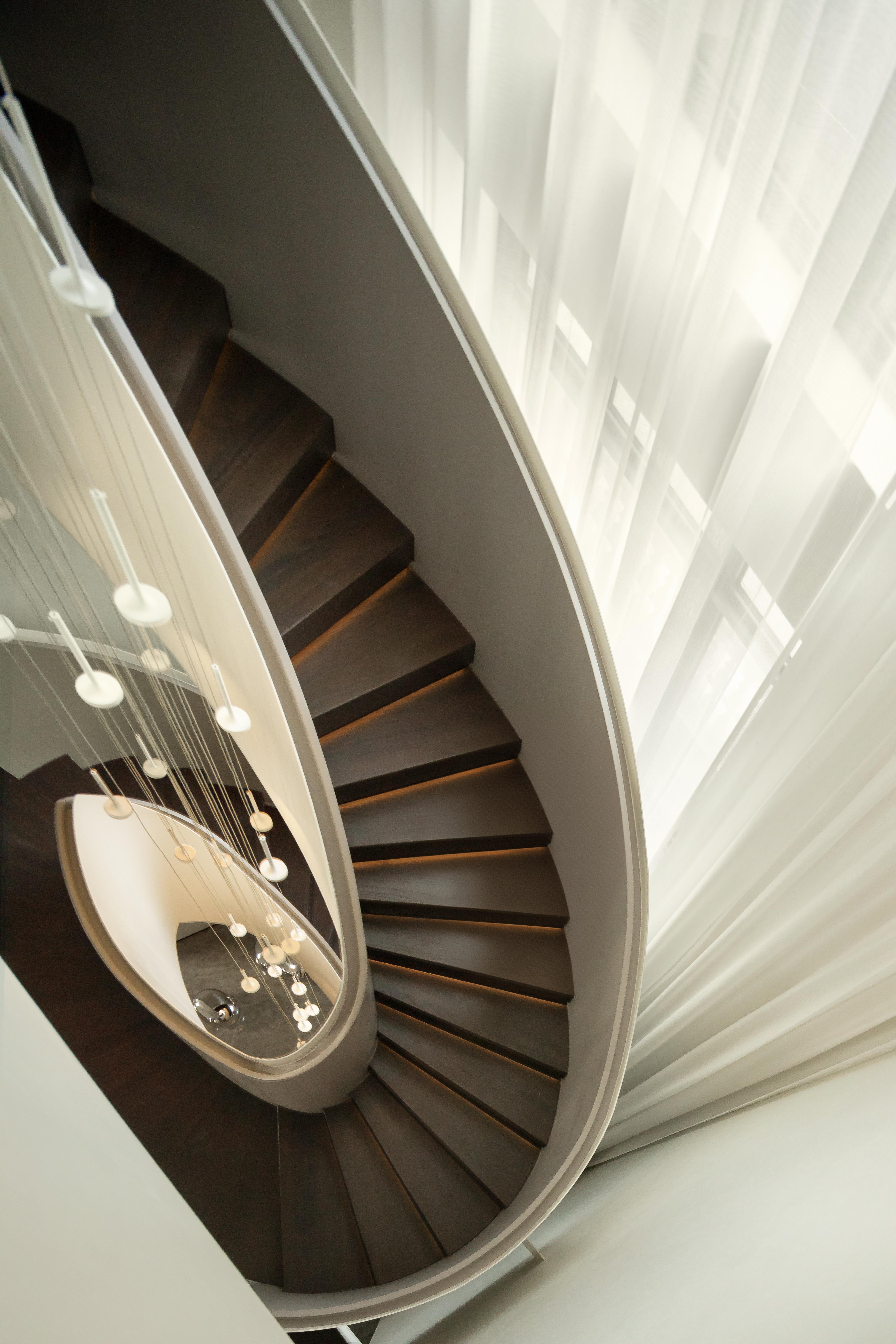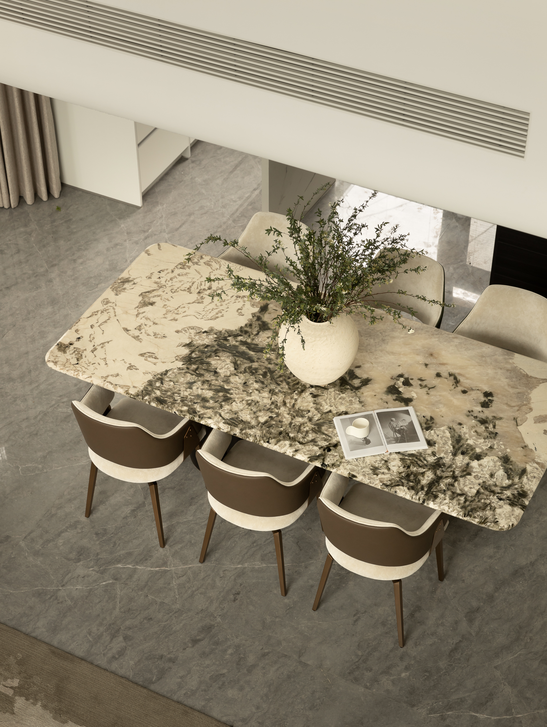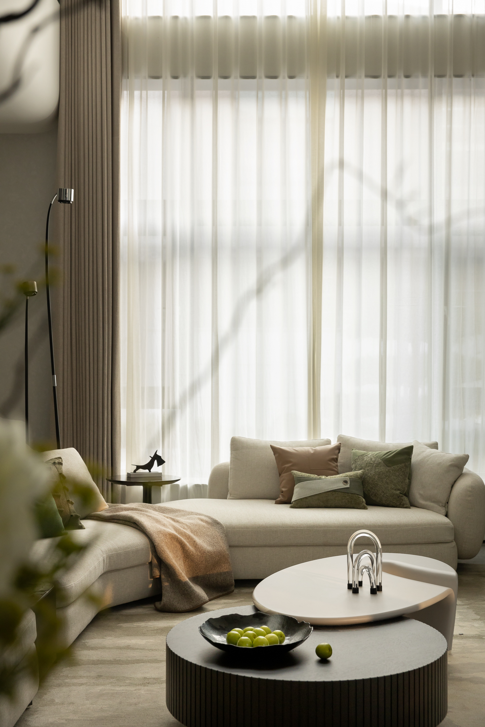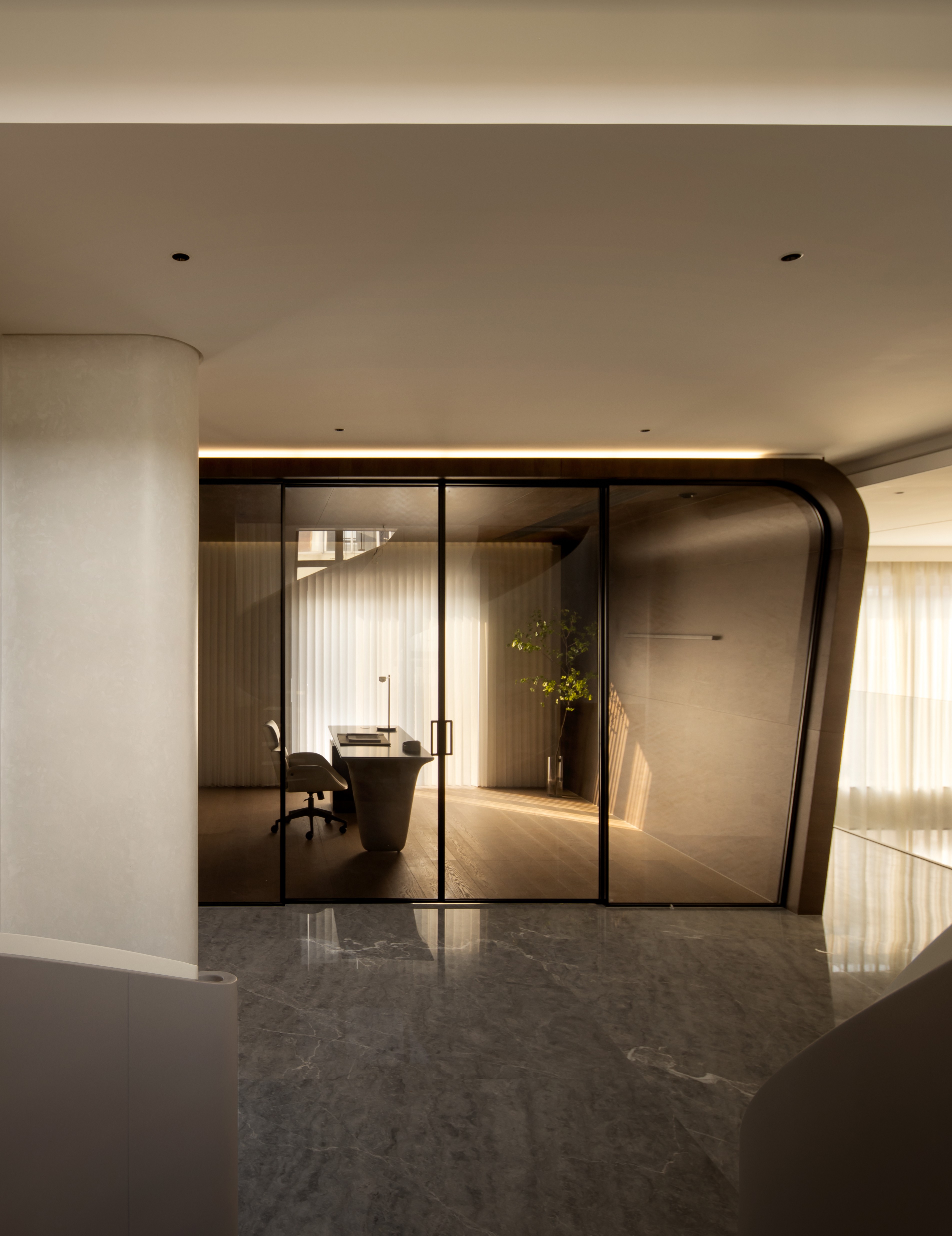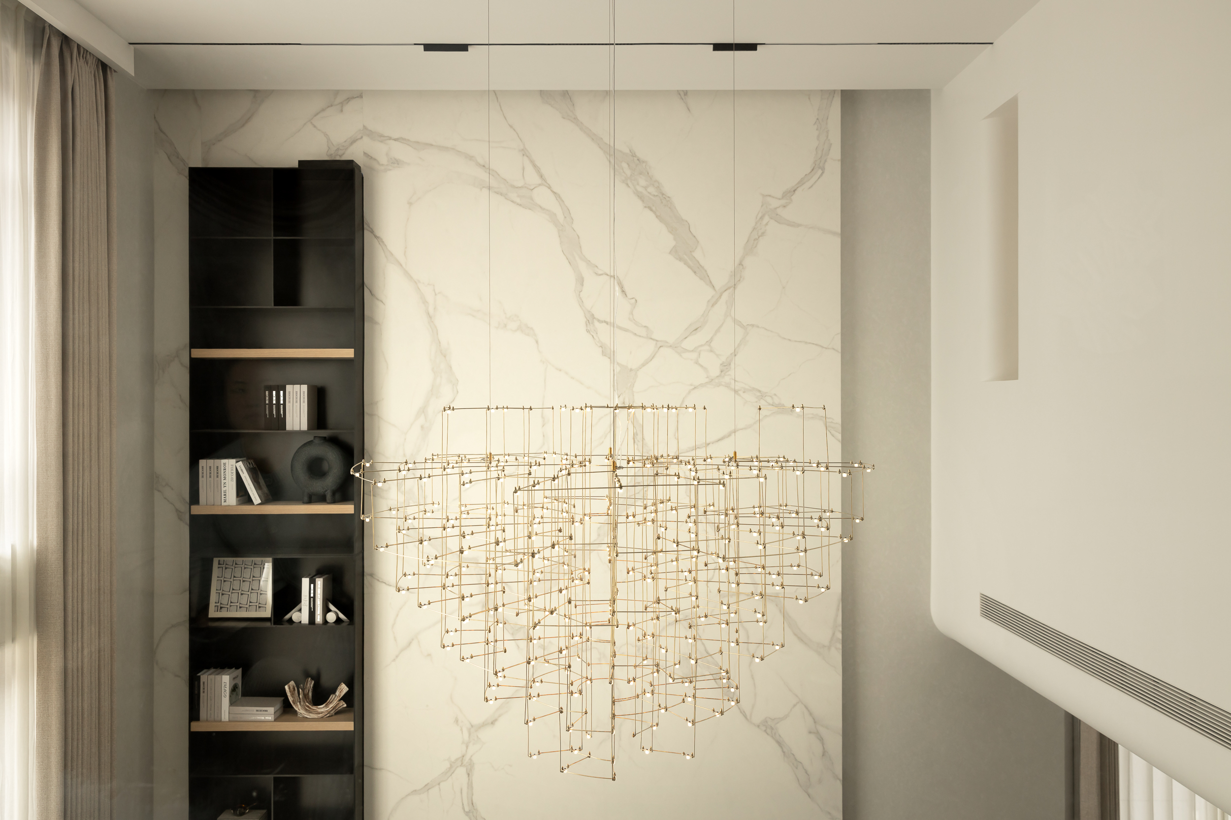 设计师首先对建筑的外立面进行微改,用石材干挂的形式延续原建筑的表面肌理,保持建筑和整体环境的协调性。同时,合理优化室内的空间格局和动线,充分利用空间的挑高的优势,以朗阔的空间尺度,营造大气的氛围、自由的动线和通透的视线,并在界面处理上以曲线勾勒柔和优雅的姿态,打造自由松弛、浪漫且富有未来感的住宅。