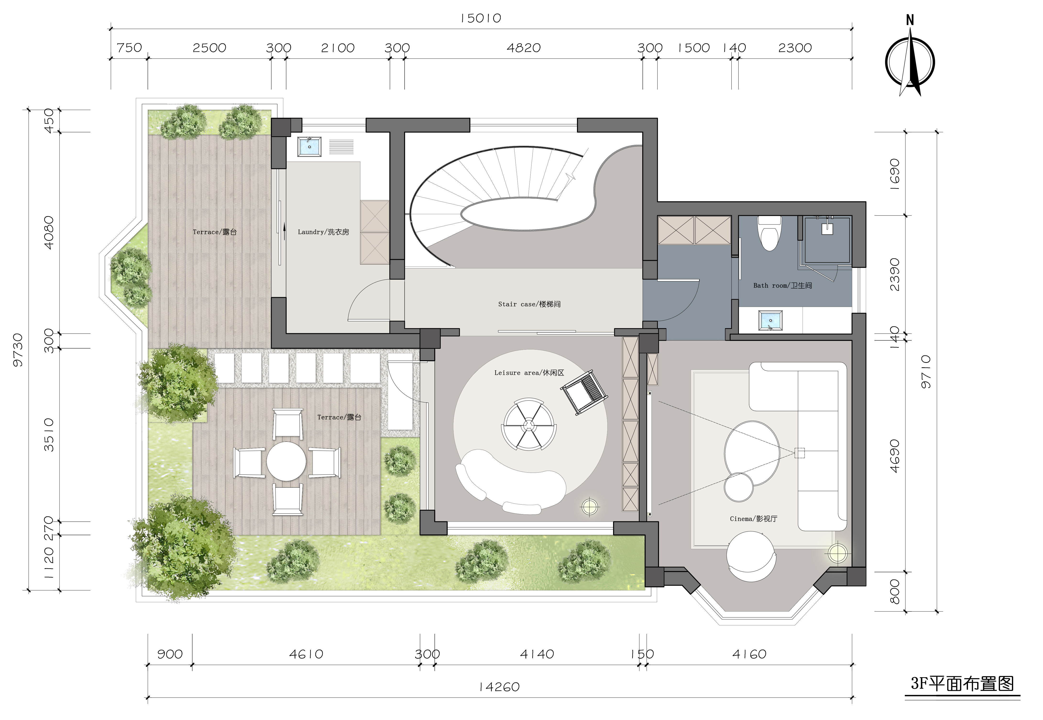 三层是一个休闲、惬意的休闲空间。由影音室、休闲厅和露台组成。