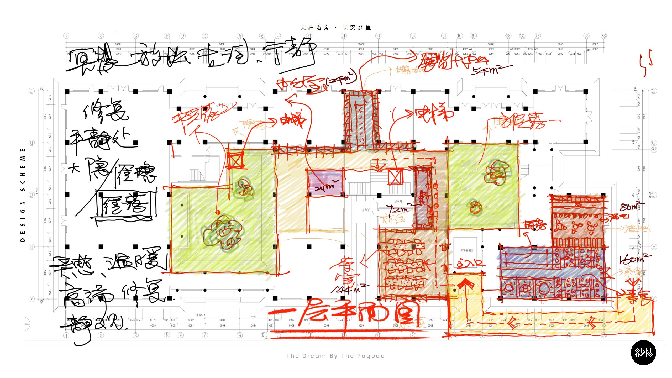 Li Bai, a poet of the Tang Dynasty, once employed personification to depict geese as understanding human emotions and carrying away sorrow. Drawing from this idea, we envision the traveler within this remarkable pagoda-viewing landscape as a wild goose soaring above Ci'en Temple, gazing upon the pagoda, valleys, flowing water, crowds, and bustling markets. As the sky changes, so does the scenery, shifting with each step. Our simple yet heartfelt hope is that all visitors and guests who come here will experience this sense of ease and tranquility.