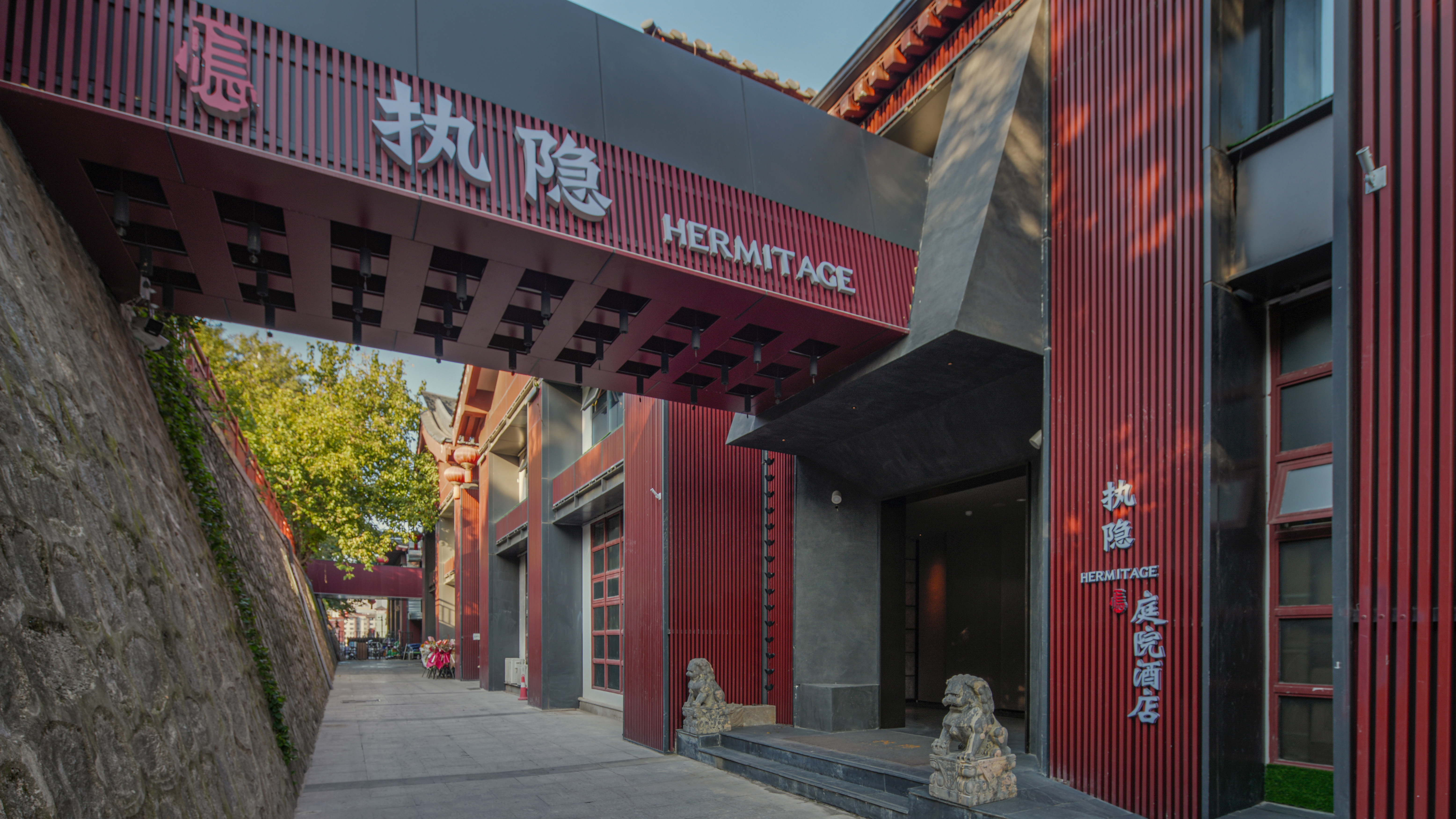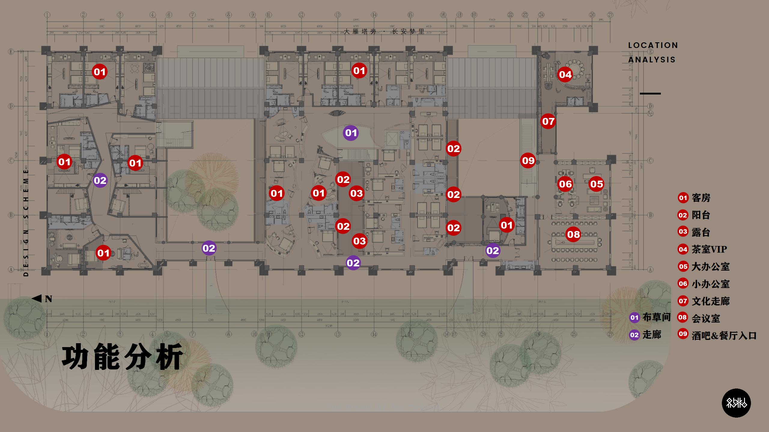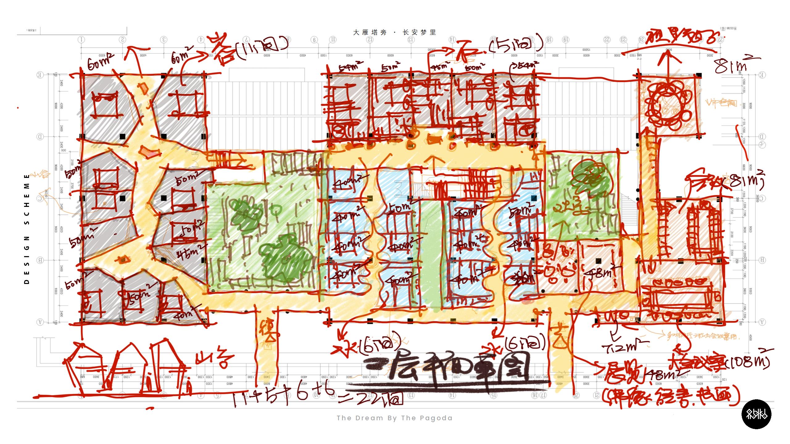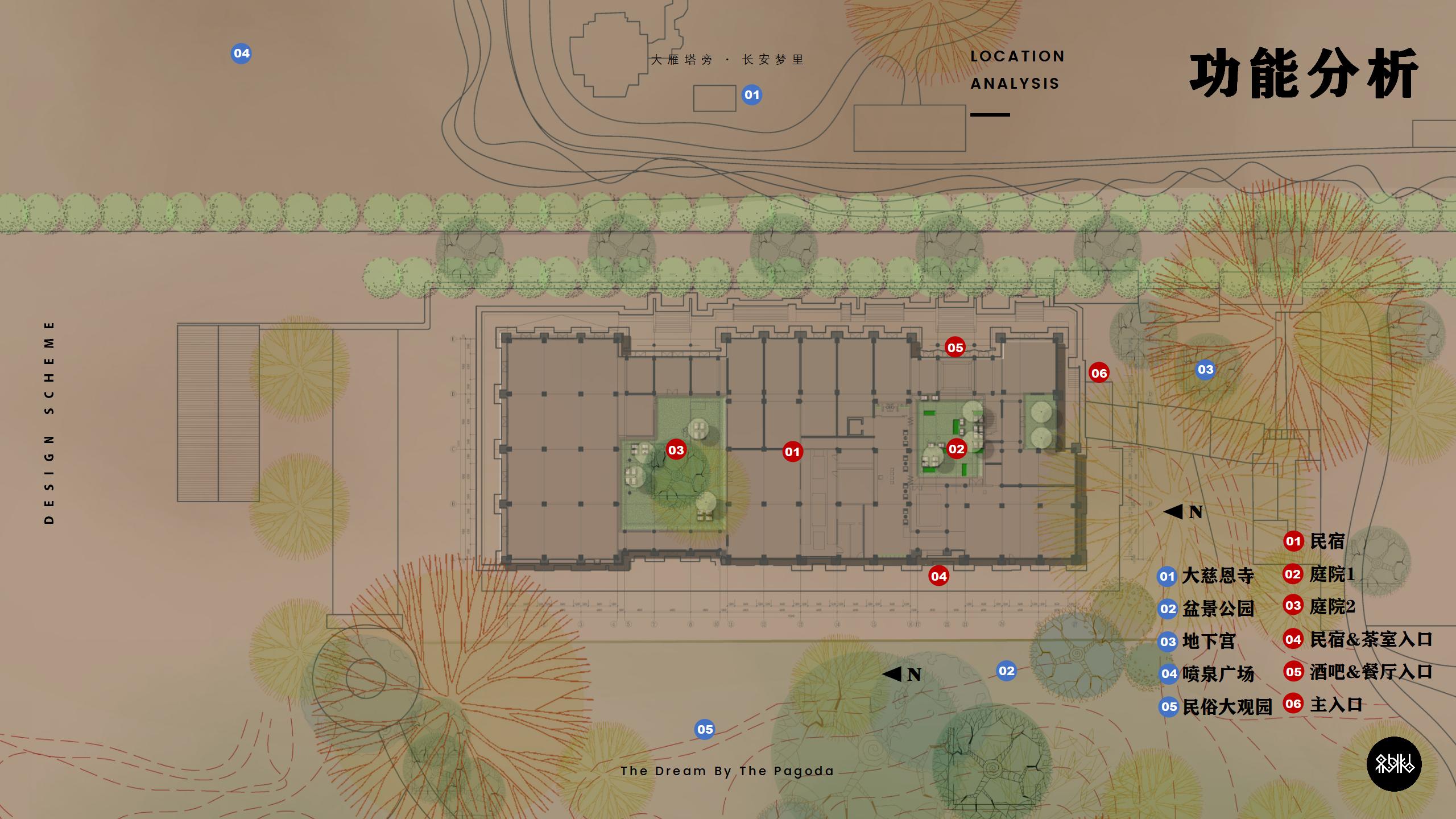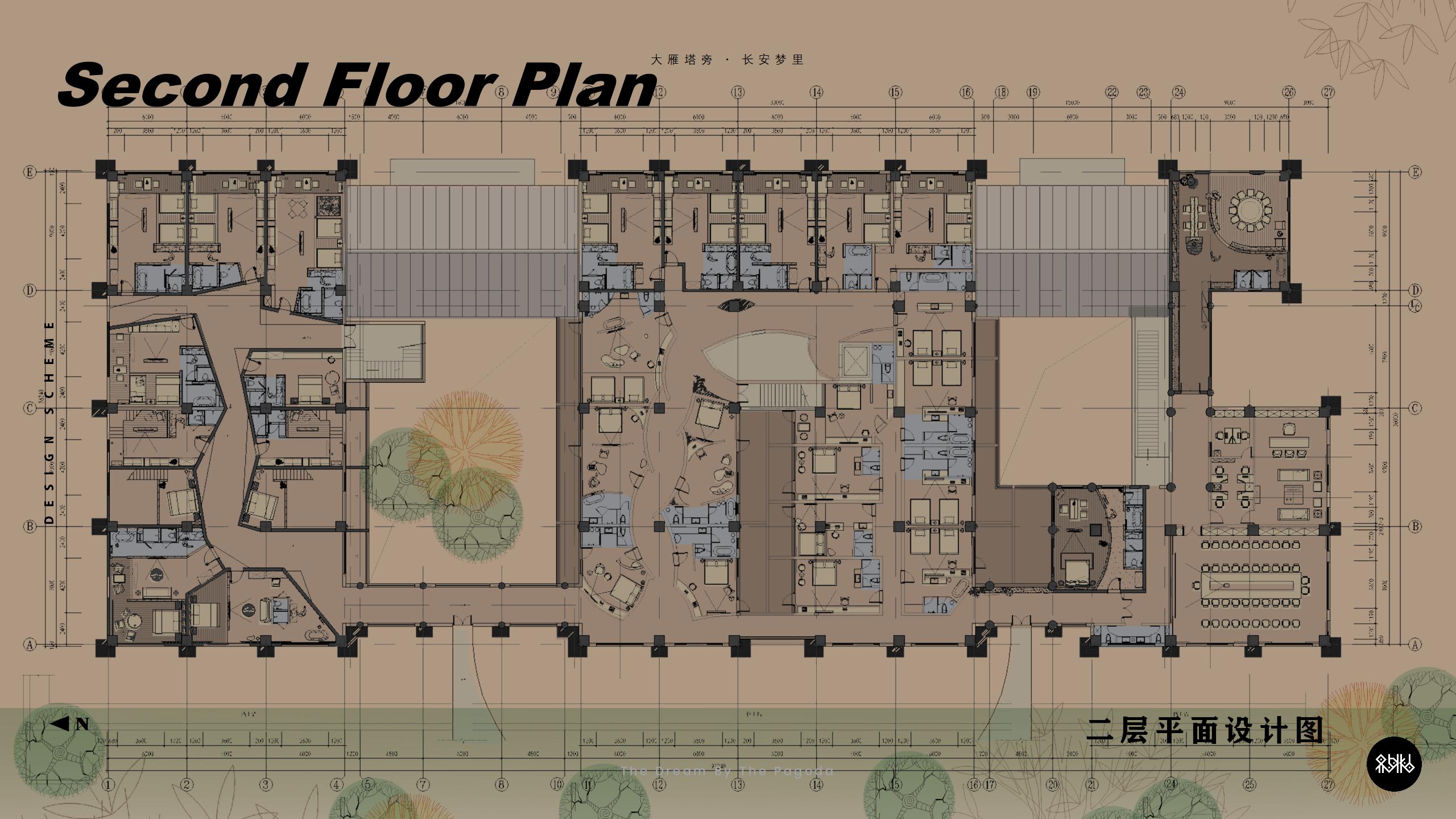 建筑单体位于大雁塔景区的心脏位置,距离大雁塔仅有200米的直线距离,一栋双回字独栋建筑位于大雁塔正东侧,现浇混凝土仿古式设计,建筑面积3000平方米。大雁塔及大慈恩寺国家级5A景区的历史与人文气息共同烘托下,业主希望这个民宿设计承接景区与住宿功能的转化,在景区中闹中取静,在禅意生活与市井趣味中产生联结,平面呈双内庭的双回形建筑给民宿空间带来了丰富的可能性。