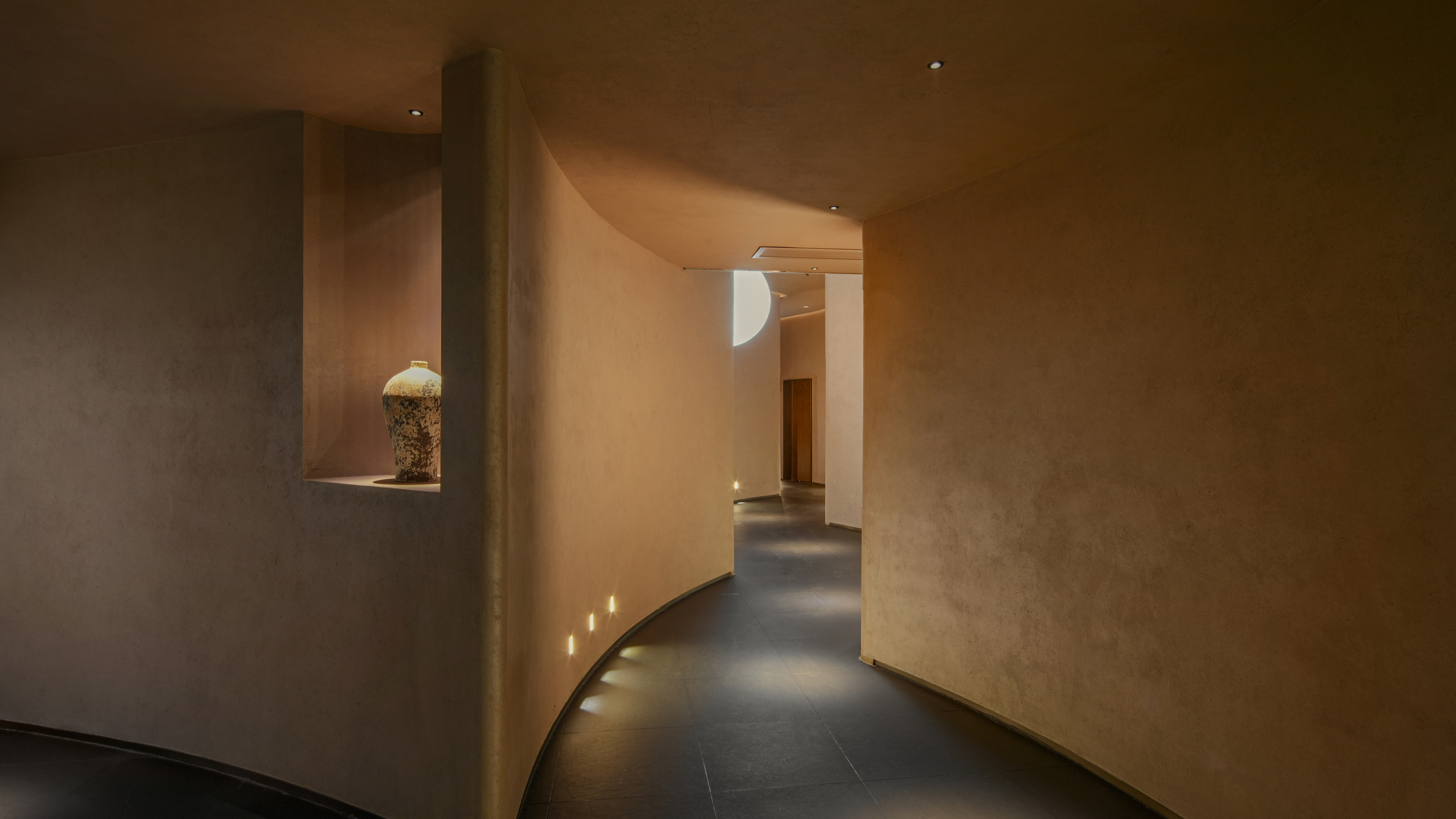 洞石与水磨石的质感与颜色变化很多,但又不张扬,整好符合不同区域的客房在细节上的区分,多种洞石和水磨石配色方案的变化为空间点睛,搭配素色的软装与暗调的房间形成统一又跳脱的空间性格。