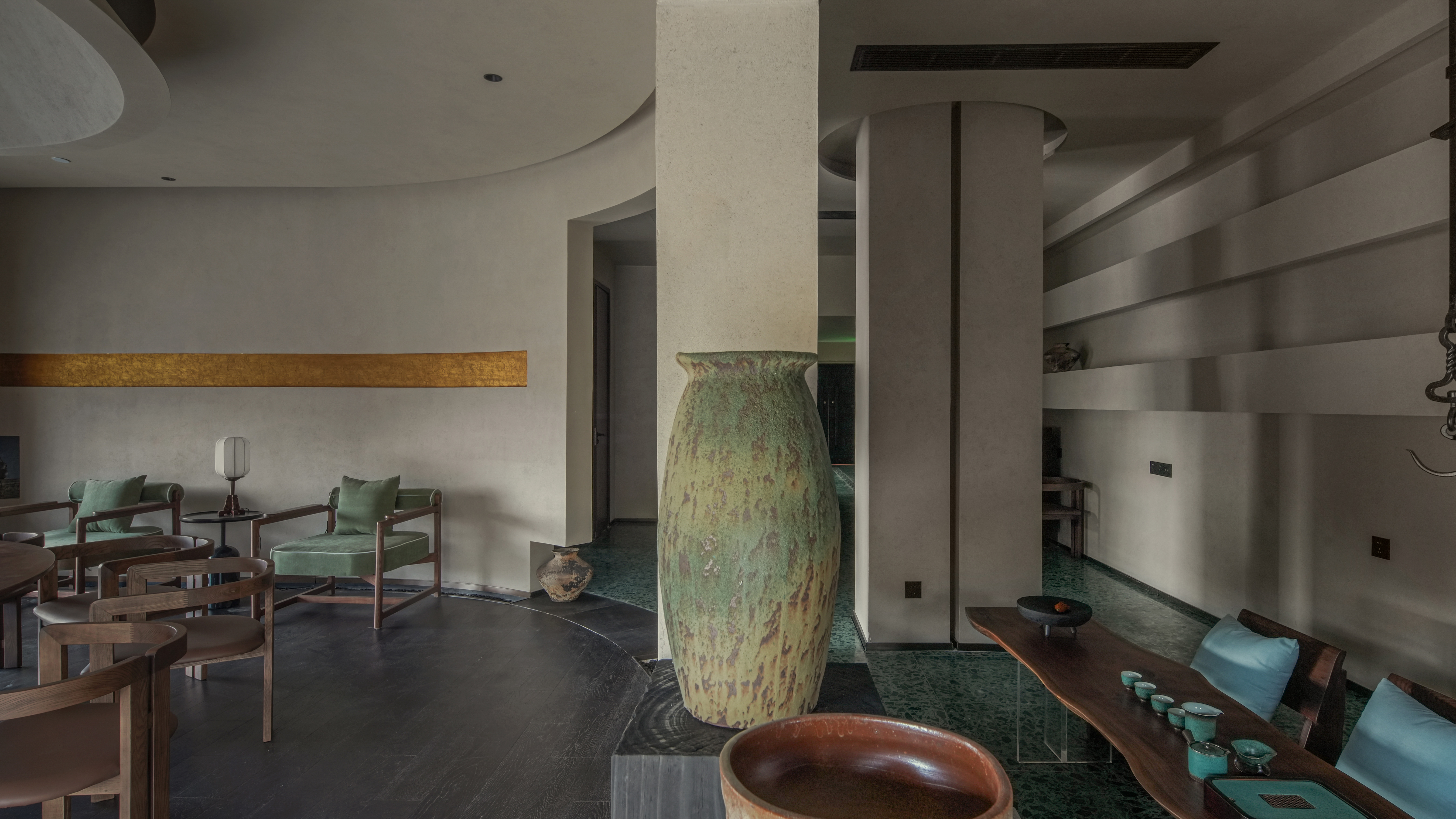 The welcoming pine and landscape stone at the main entrance symbolize a tranquil retreat amidst the bustle, while the continuous sound of wind chimes beneath the covered bridge entices guests to explore the venue further. The design's foundation is established on a new order, where the recessed positioning of the main entrance allows for a well-organized flow of movement, providing guests with a sense of ceremony and exclusive privacy.