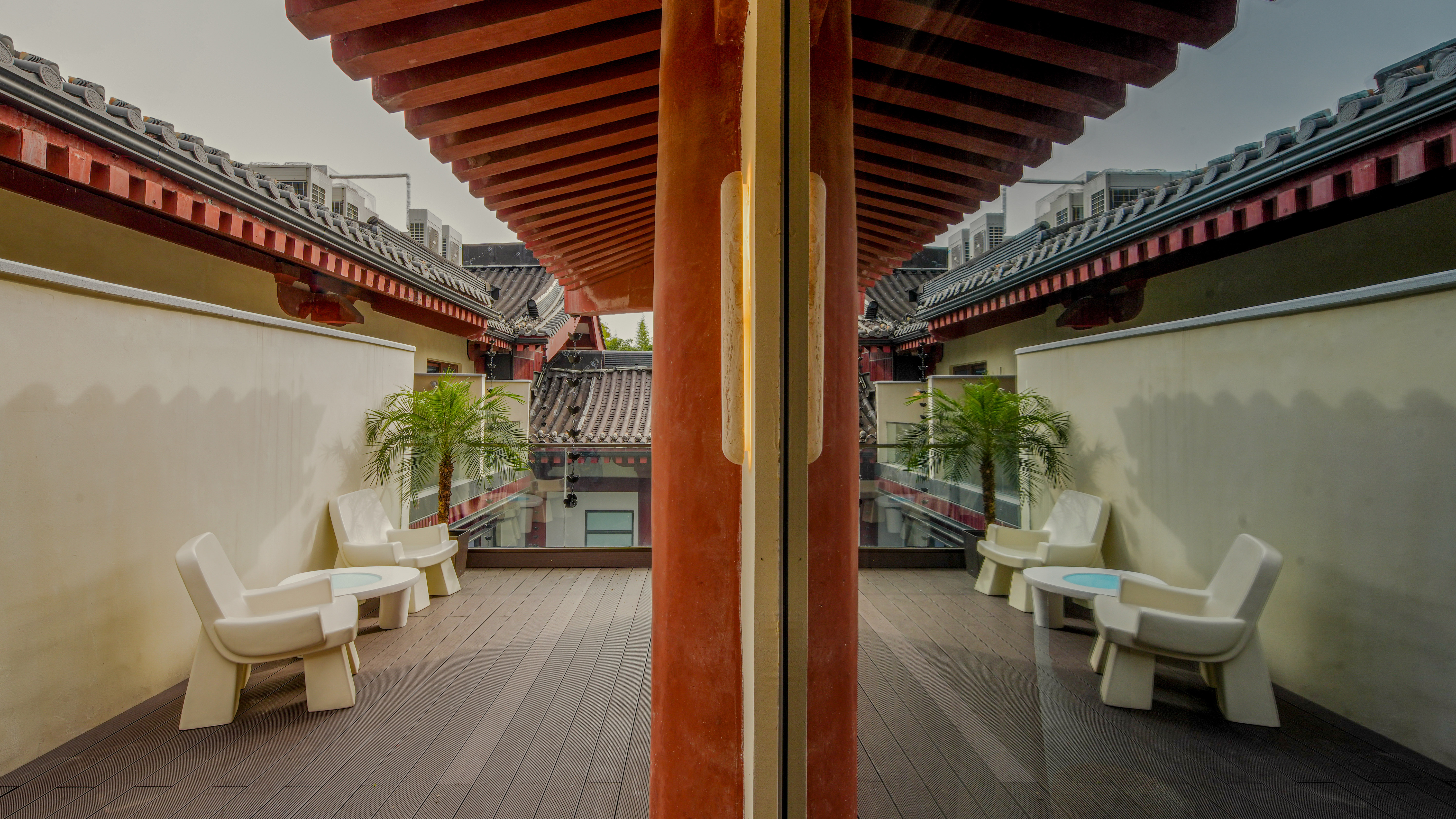 Key design considerations include: how to harmoniously integrate the building’s uniquely recreated rustic exterior within the scenic context with the entrance to the homestay; how to make the concrete structure with its lofty ceilings and sloping roof more suitable for guest accommodation and daily living; and how to maximize the number of rooms offering pleasant views of the Big Wild Goose Pagoda. -