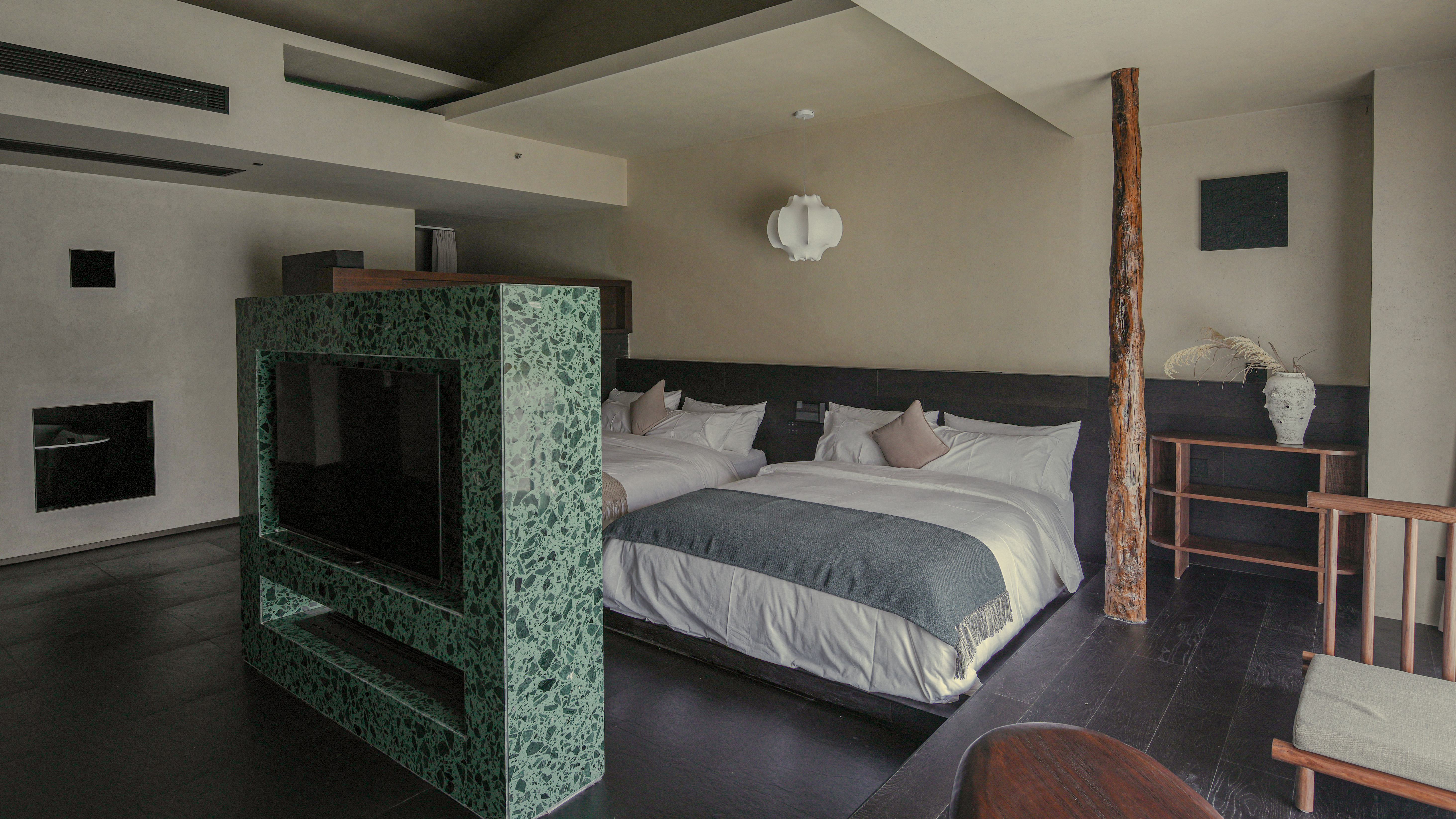 The textures and colors of travertine and terrazzo offer a variety of changes without being ostentatious, allowing for subtle distinctions in the details of guest rooms across different areas. The diverse color schemes of travertine and terrazzo provide the finishing touches to the space, while the combination of neutral-toned soft furnishings with darker rooms creates a cohesive yet distinct spatial character.