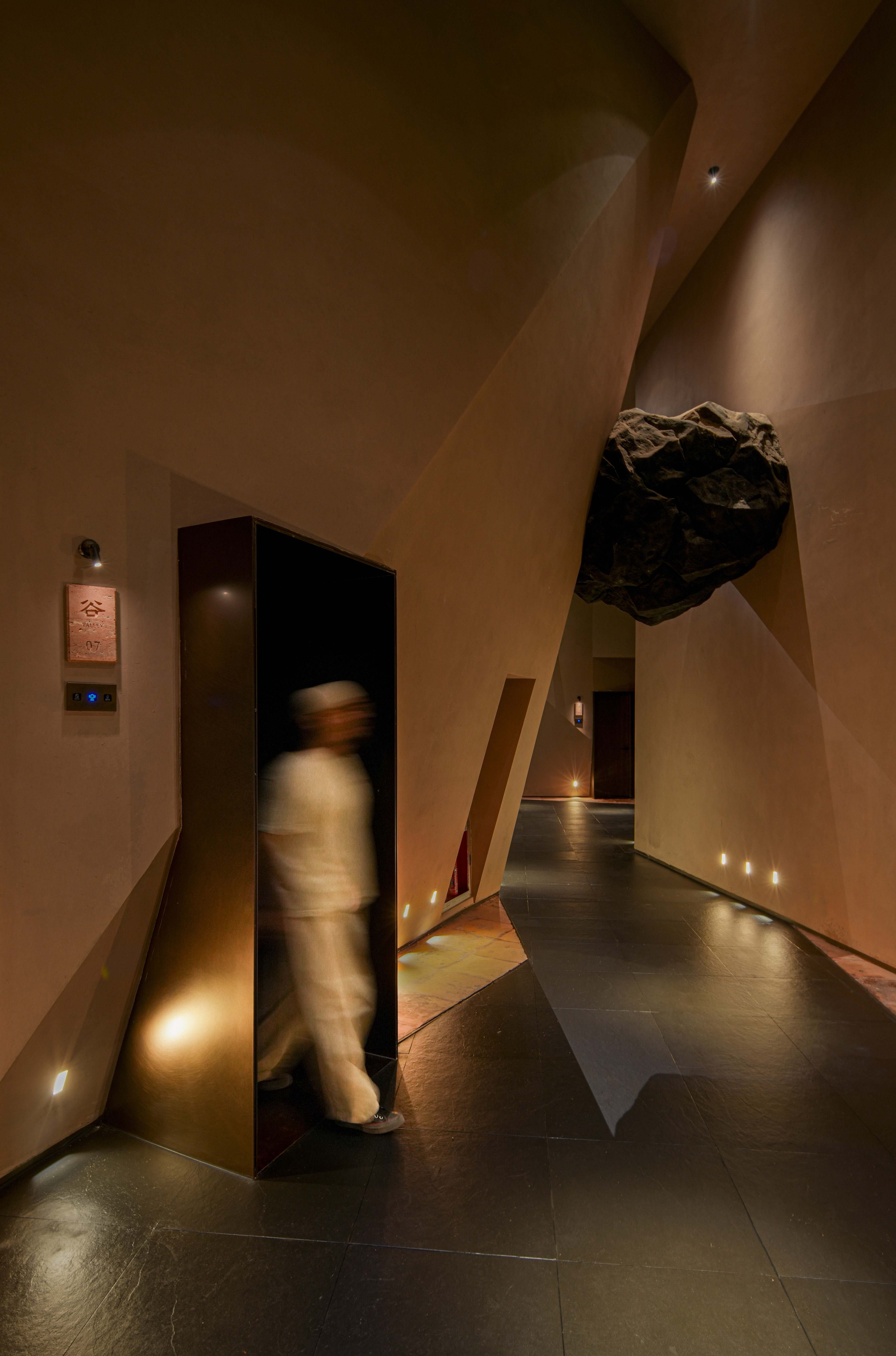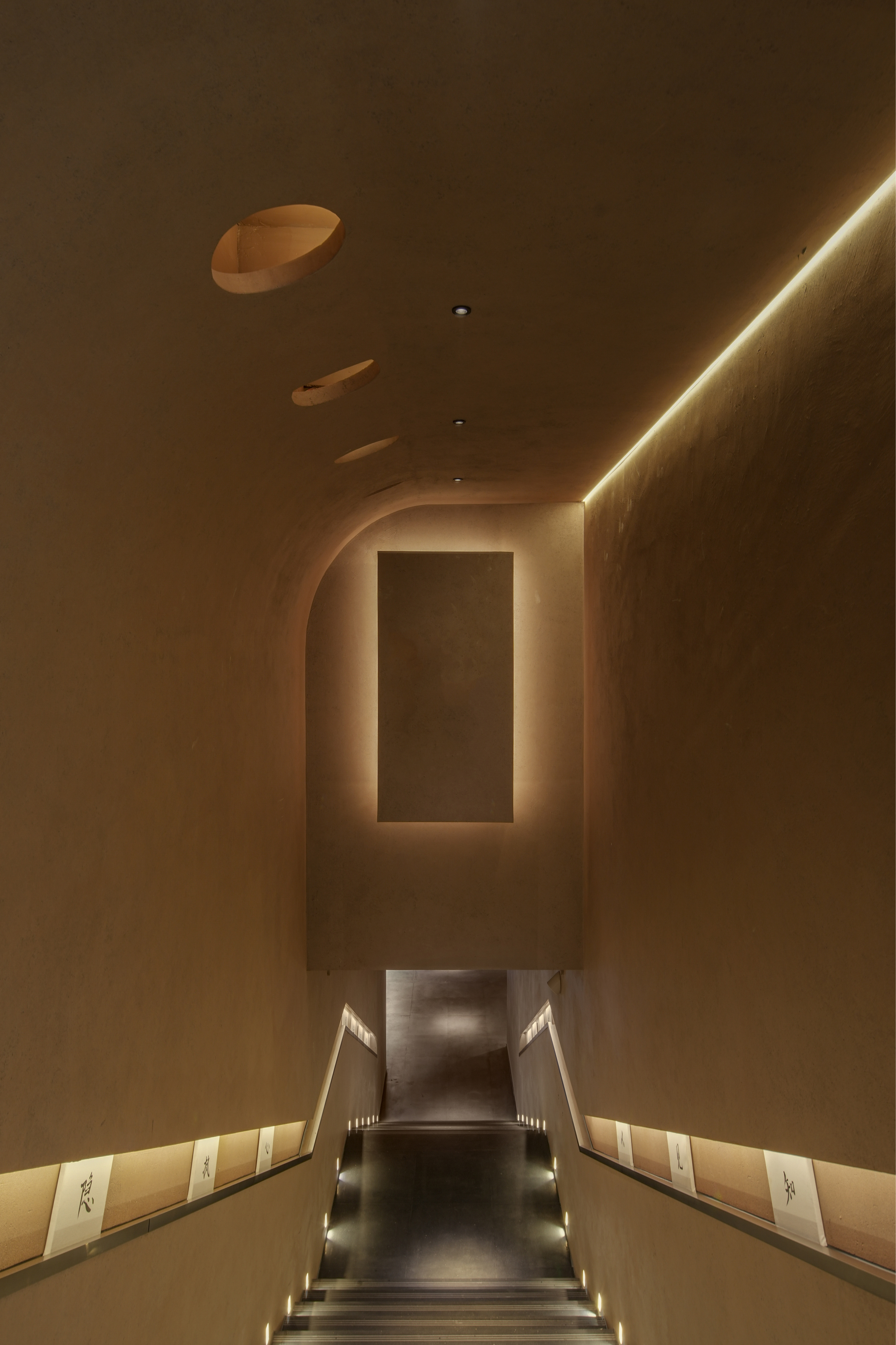 The imagery of wild geese flying overhead has become the central theme of this design, drawing inspiration from natural elements such as "valley," "water," "stone," "light," and "fog" to guide the spatial zoning. Each public space is imbued with its own unique natural design attributes, transforming the environment into a dynamic interplay of heights and depths, brightness and shadows, flowing lines and jagged edges, rugged or narrow valleys, streams, boulders, skylights, or dense mist. Through the use of internal structures and custom textures, the space is designed to evoke a sense of timelessness, liberating visitors from the fast-paced rhythm of urban life. It aims to lead the mind inward, allowing a brief escape from reality through these natural elements and fostering an experience of wandering through nature. -