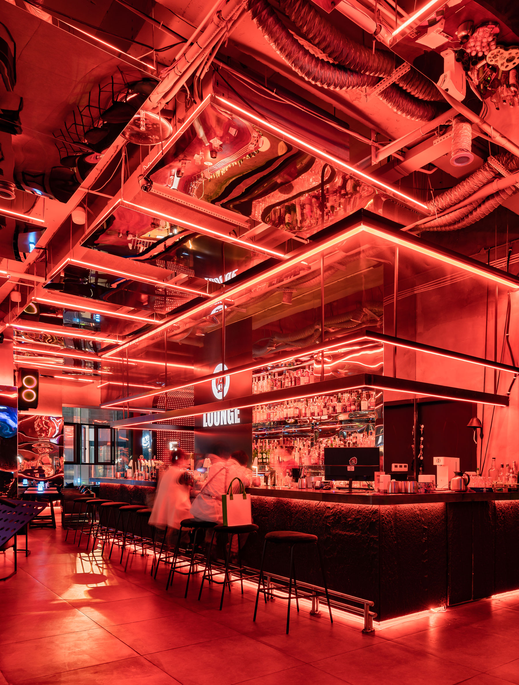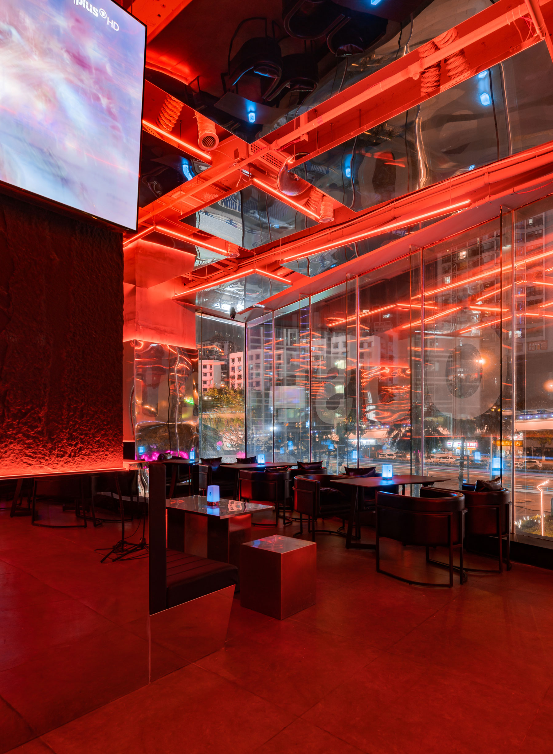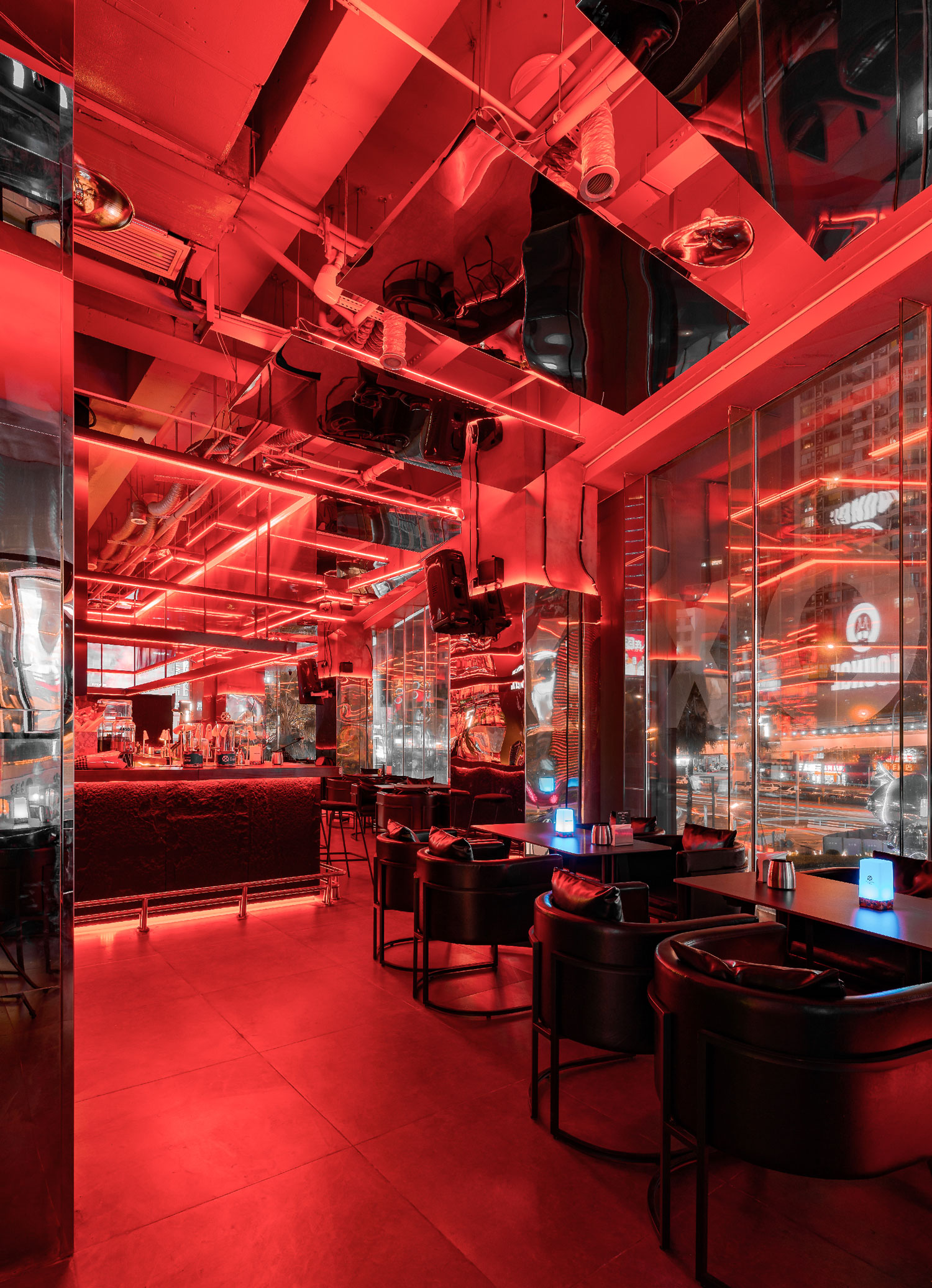 我们并没有运用过多的、复杂的材质,通过红色灯光与镜面元素的巧妙结合,打造出一个时尚、现代、充满魅力、富有层次感的酒吧空间。空间布局与灯光氛围相得益彰,塑造出一个既具现代感又充满时尚气息的酒吧环境。整个设计注重空间的布局、光影的搭配以及材质的选择,力求为顾客带来一次别具一格的沉浸式体验。同时,关注顾客的舒适度与安全性,确保酒吧成为一个高品质的娱乐场所。