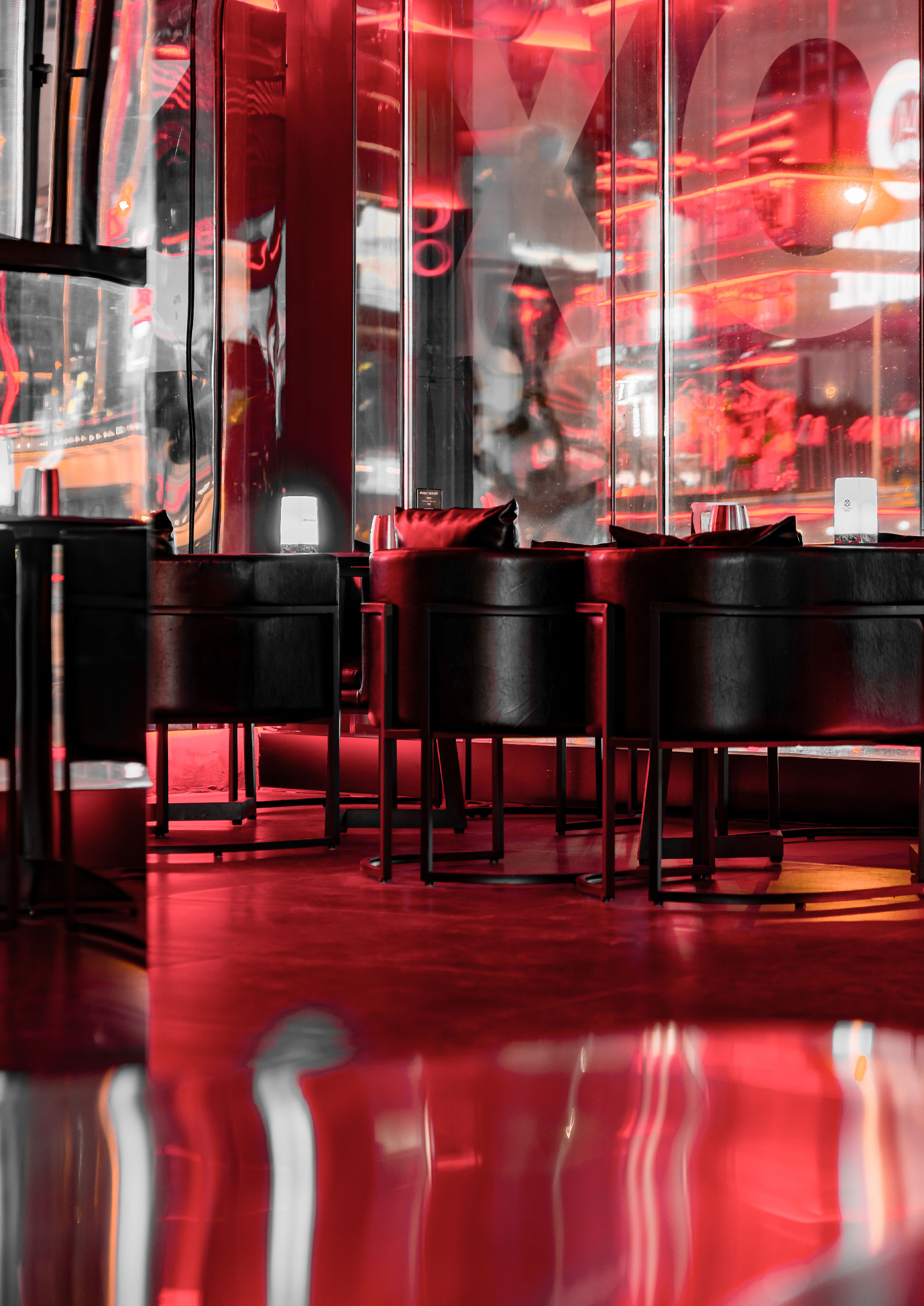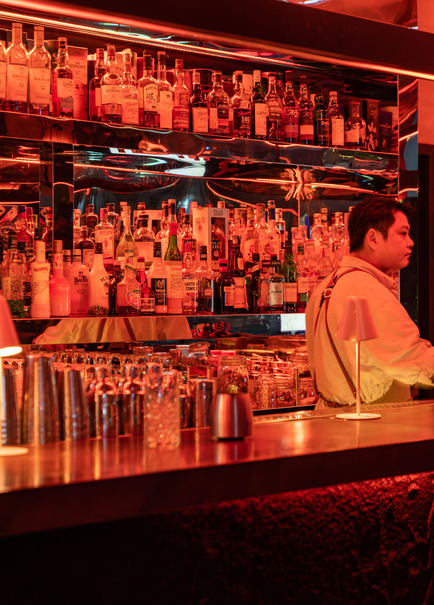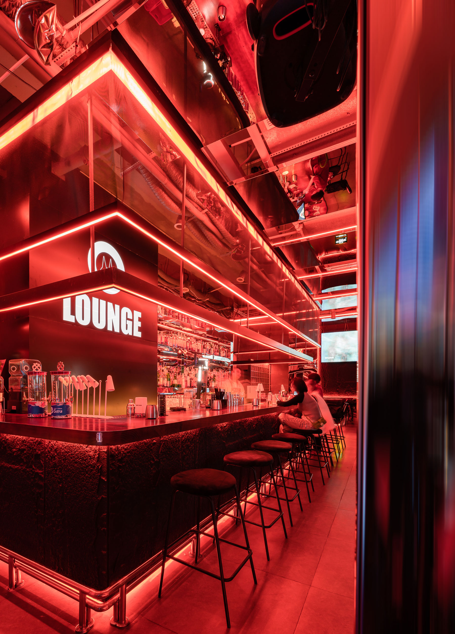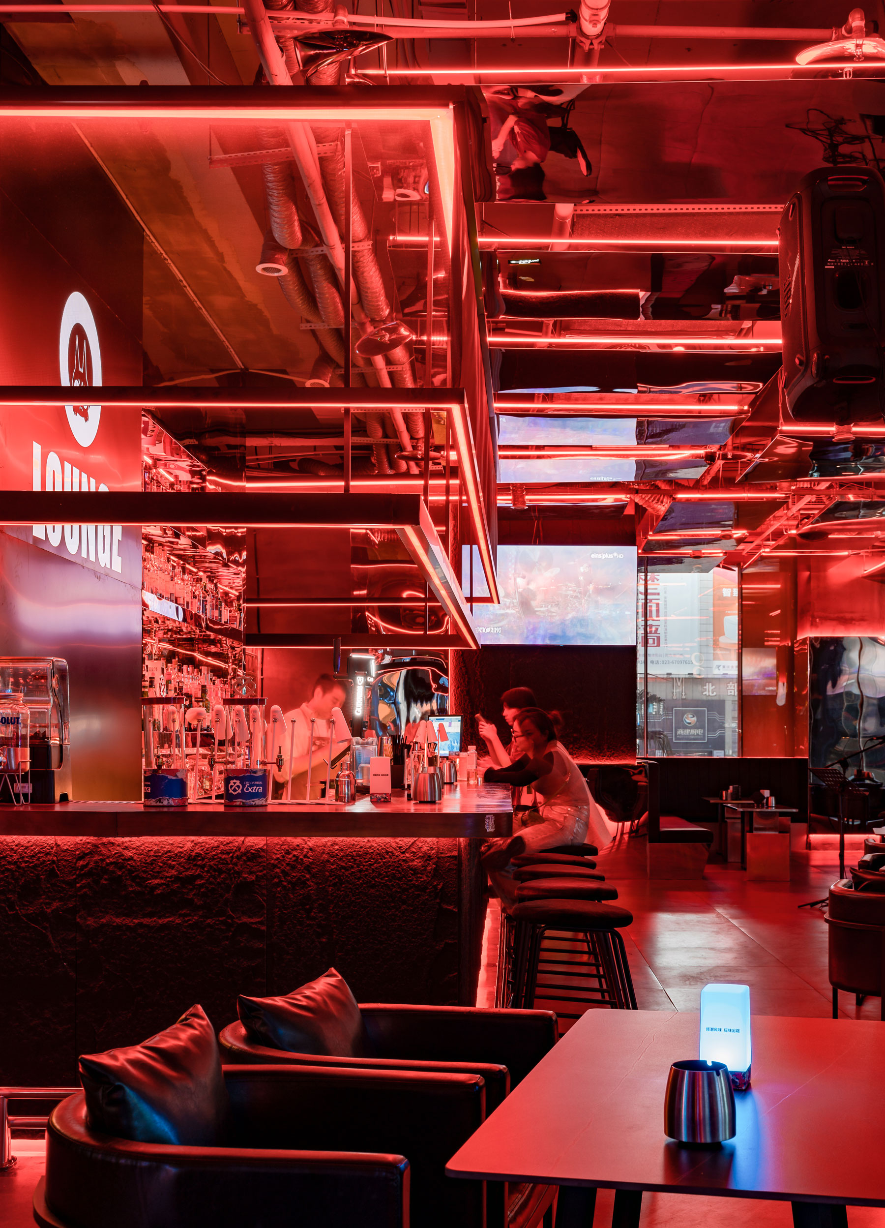 我们并没有运用过多的、复杂的材质,通过红色灯光与镜面元素的巧妙结合,打造出一个时尚、现代、充满魅力、富有层次感的酒吧空间。空间布局与灯光氛围相得益彰,塑造出一个既具现代感又充满时尚气息的酒吧环境。整个设计注重空间的布局、光影的搭配以及材质的选择,力求为顾客带来一次别具一格的沉浸式体验。同时,关注顾客的舒适度与安全性,确保酒吧成为一个高品质的娱乐场所。