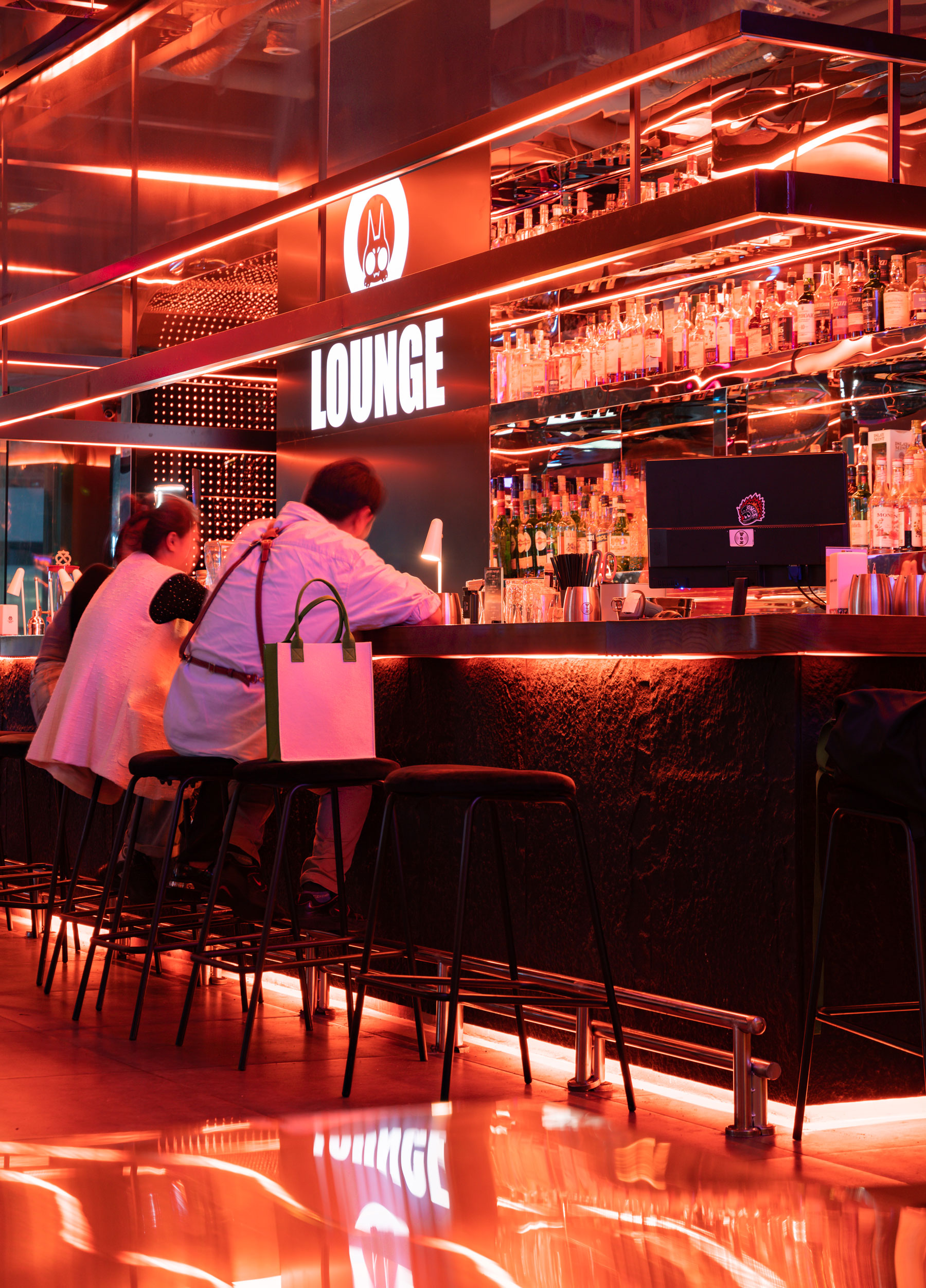 由于是一个狭长的空间,吧台作为酒吧的核心区域,将采用开放式设计,便于顾客与调酒师之间的互动。整个就坐区域全部靠落地窗,让客人既能感受酒精香气、迷人音乐的流光溢彩,又能直观窗外的车水马龙。
