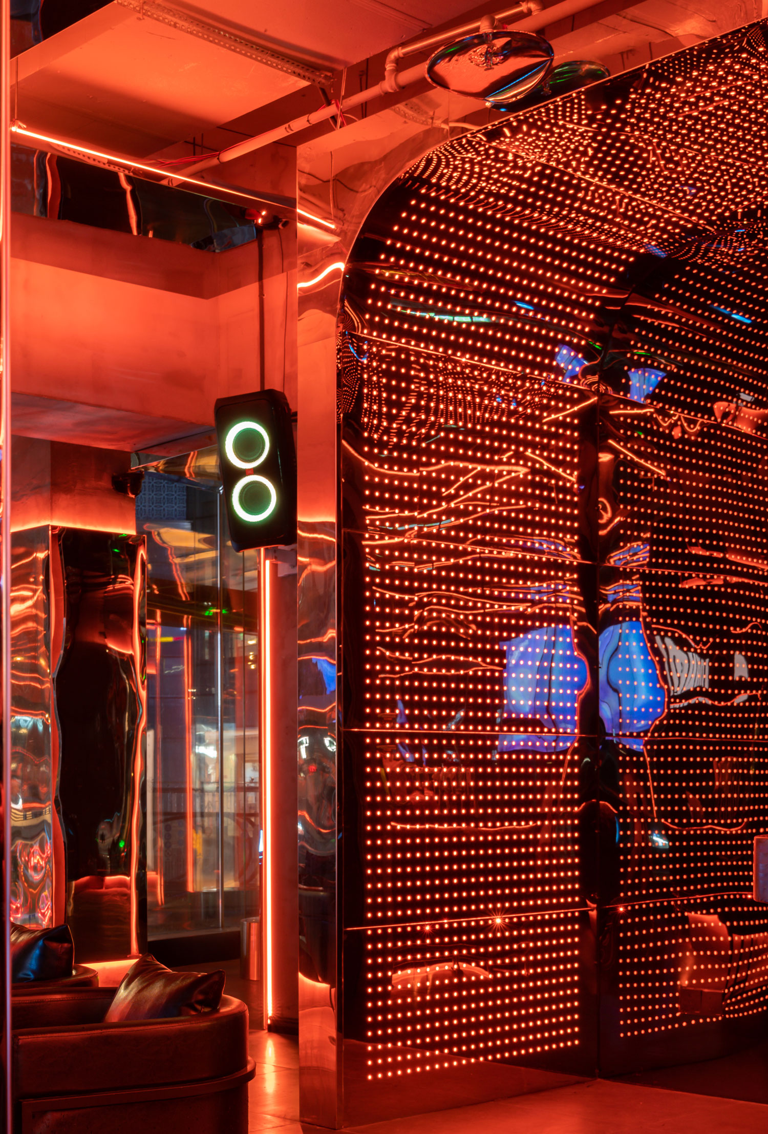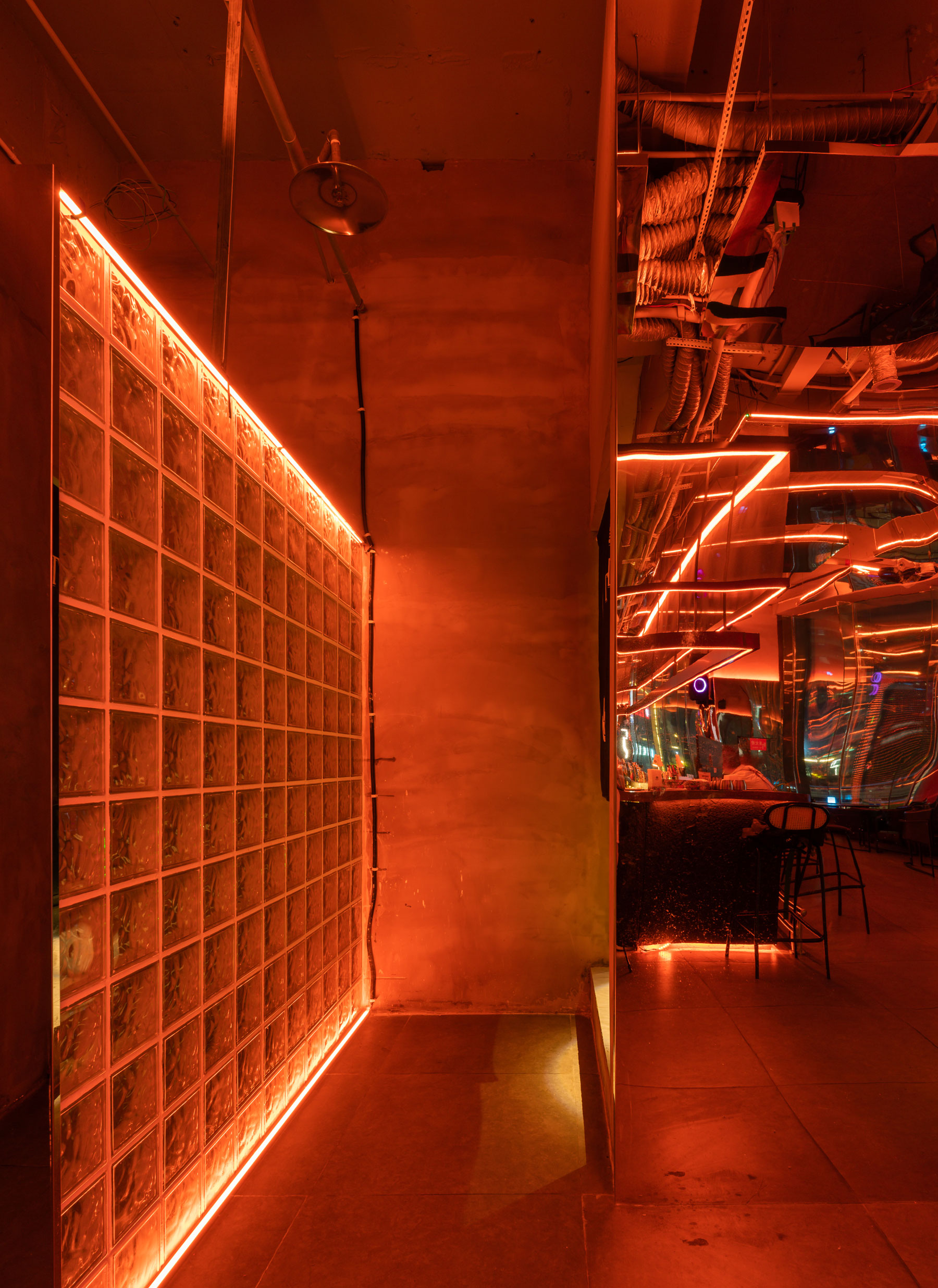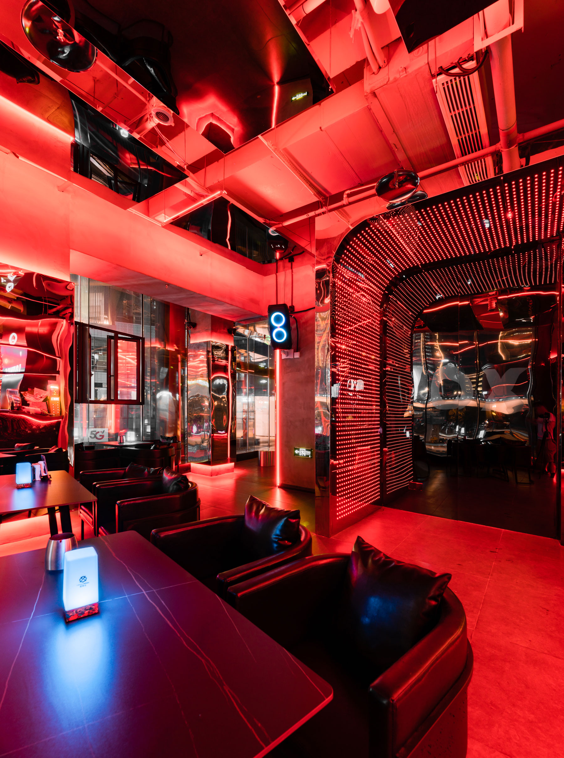 用最少的投入,打造出了最具氛围感的空间,当灯光在镜面上跳跃、闪烁,仿佛整个空间都被赋予了生命,让人流连忘返。通过红色灯光与镜面元素的巧妙结合,营造出一种独特而富有魅力的氛围。