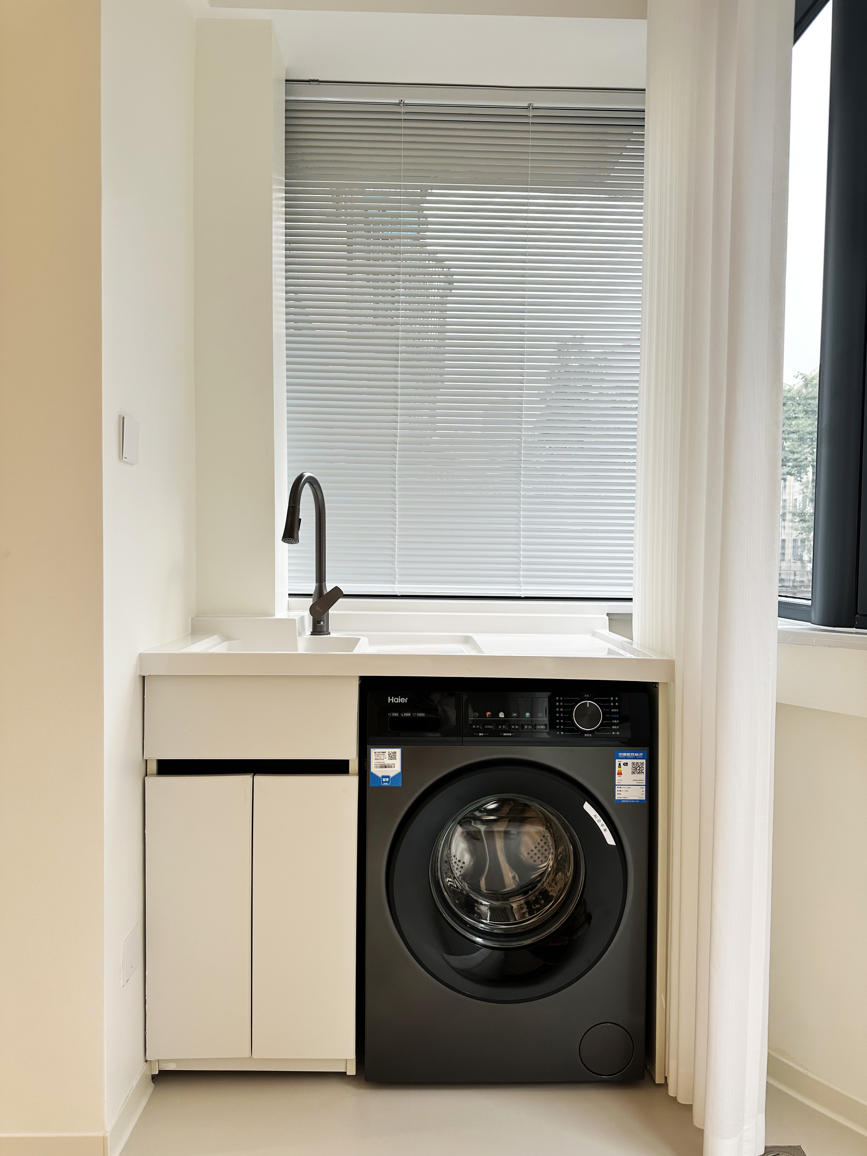 空间布局:旧房改造能动空间不大,重点在洗手间改造上,之前门洞小,洗手盆放不下,把洗手盆两边切角。