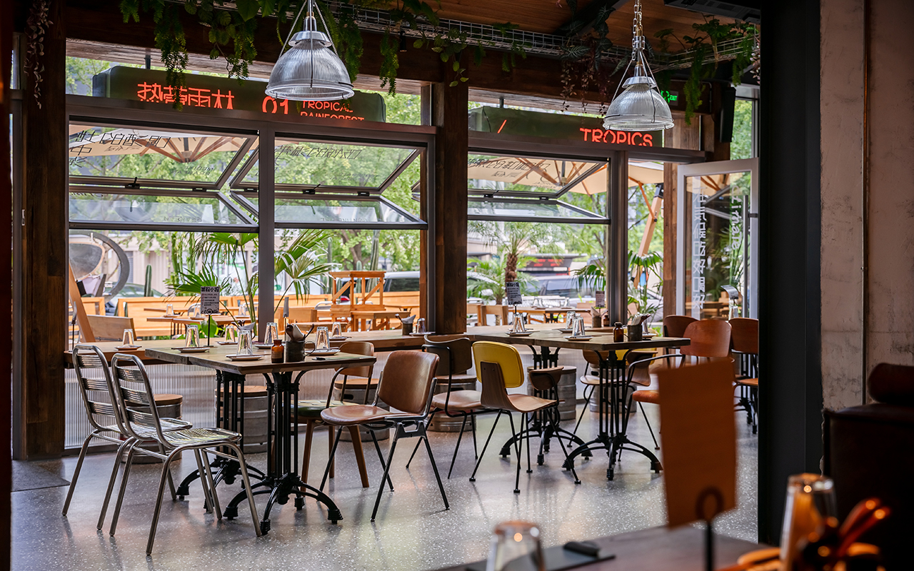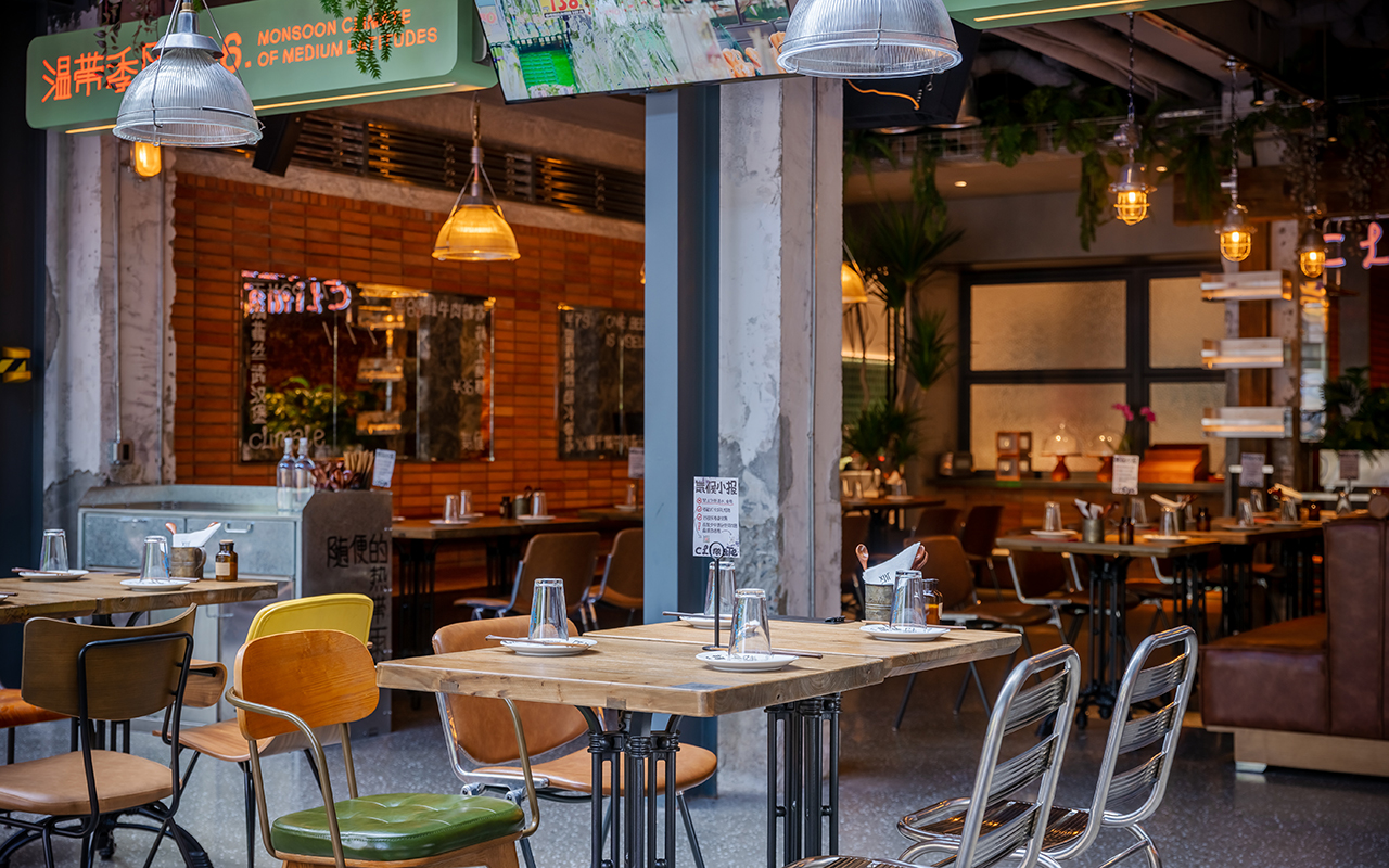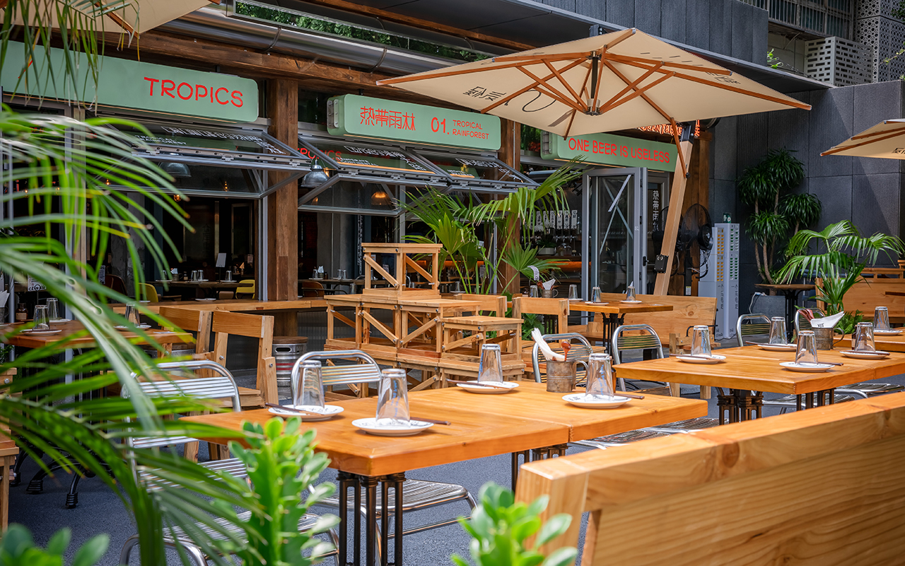 空间场景:将餐厅与外部花园打开,呈现沉浸式的季风与热带雨林体验,将“场景+餐+酒”的形式进行融合,全时段、全场景经营,增加坪效,打造更多附加值。