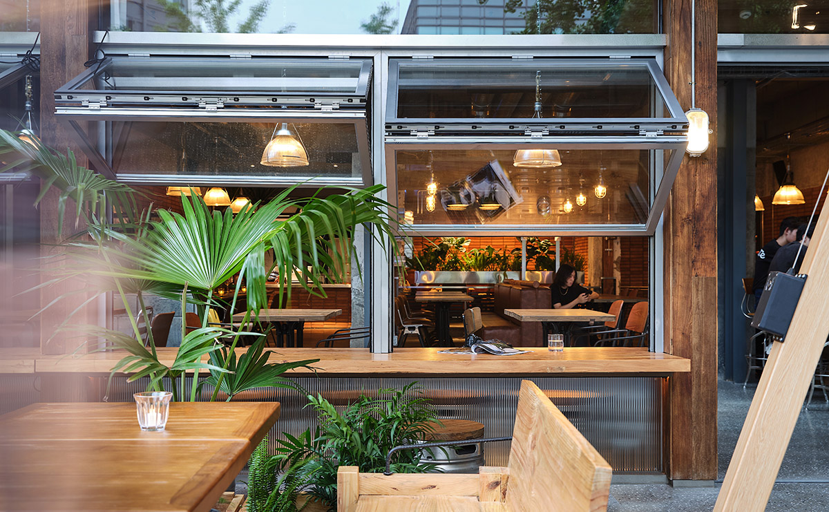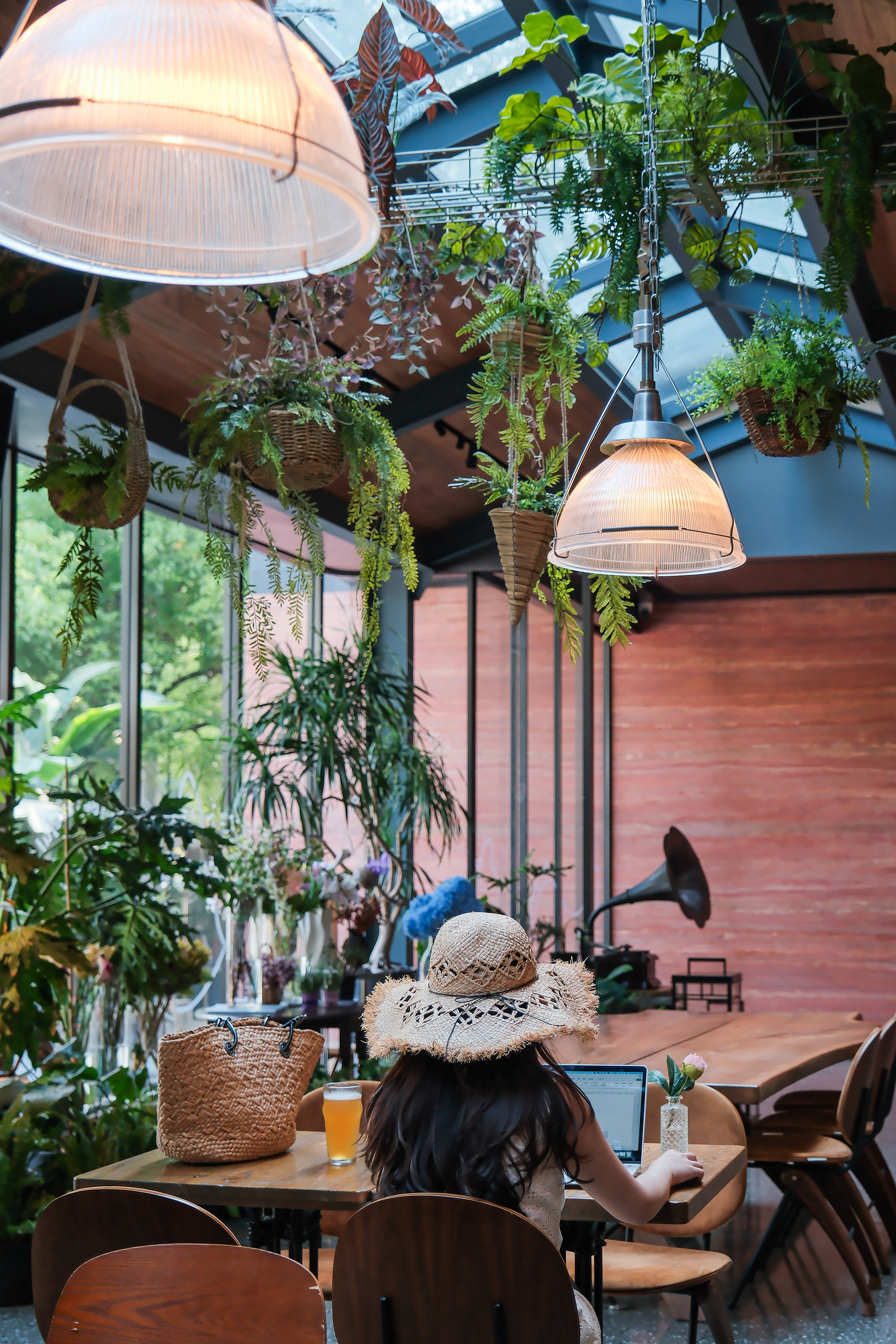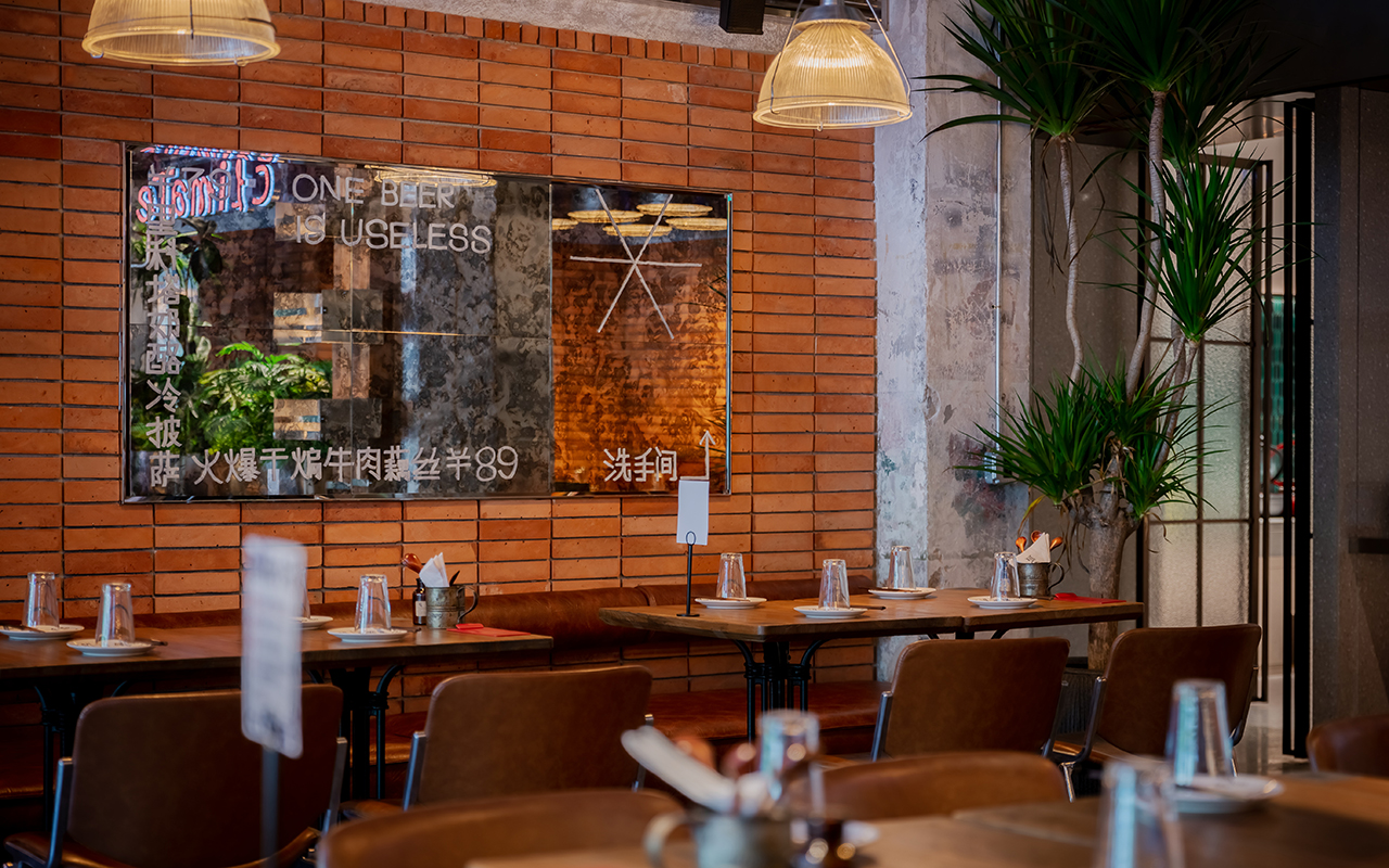 设计选材:用木头与红砖营造出空间的时代感,木质桌椅与金属底座搭配,简洁又容易打理,大量热带绿植围绕,营造出都市中的雨林花房场景