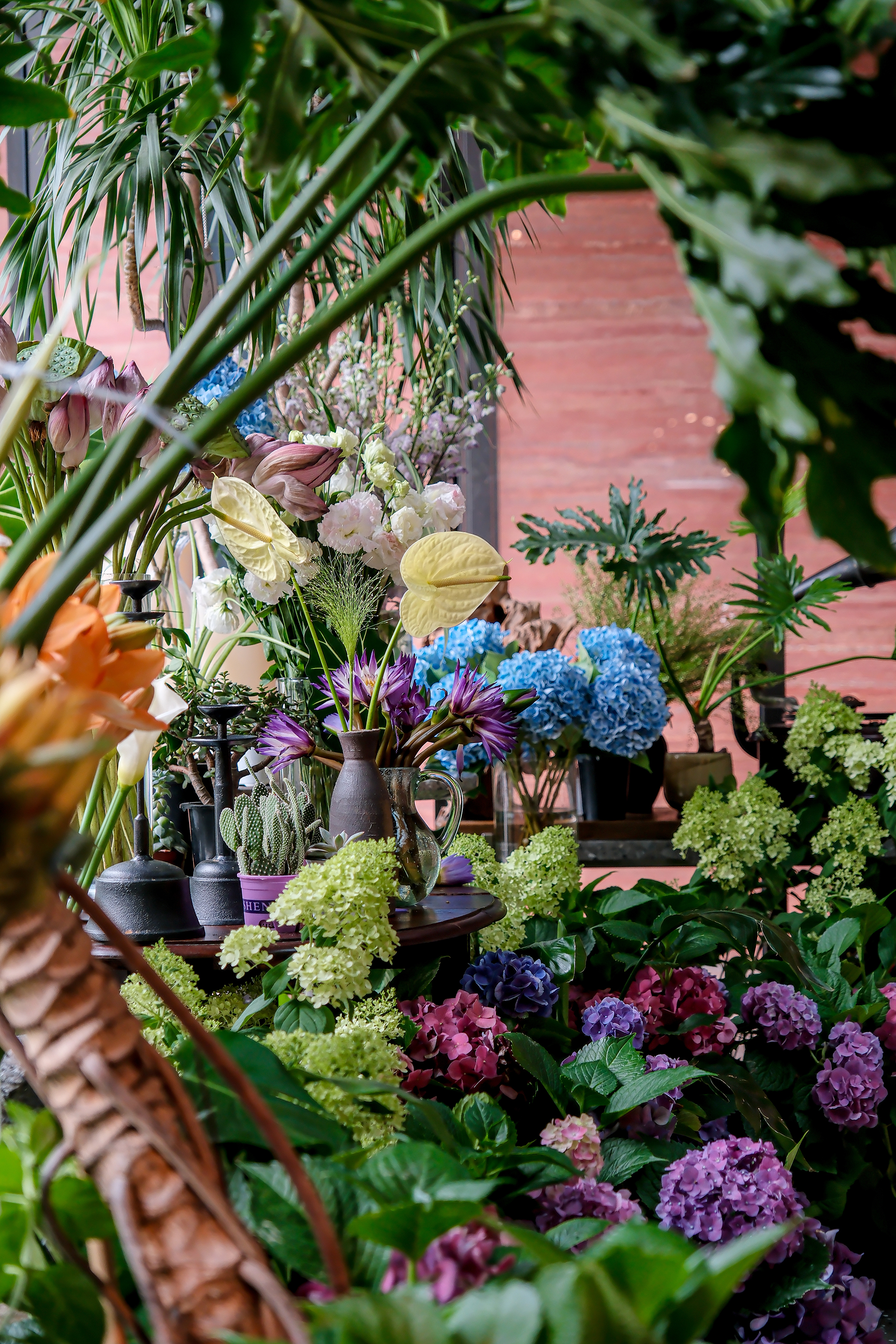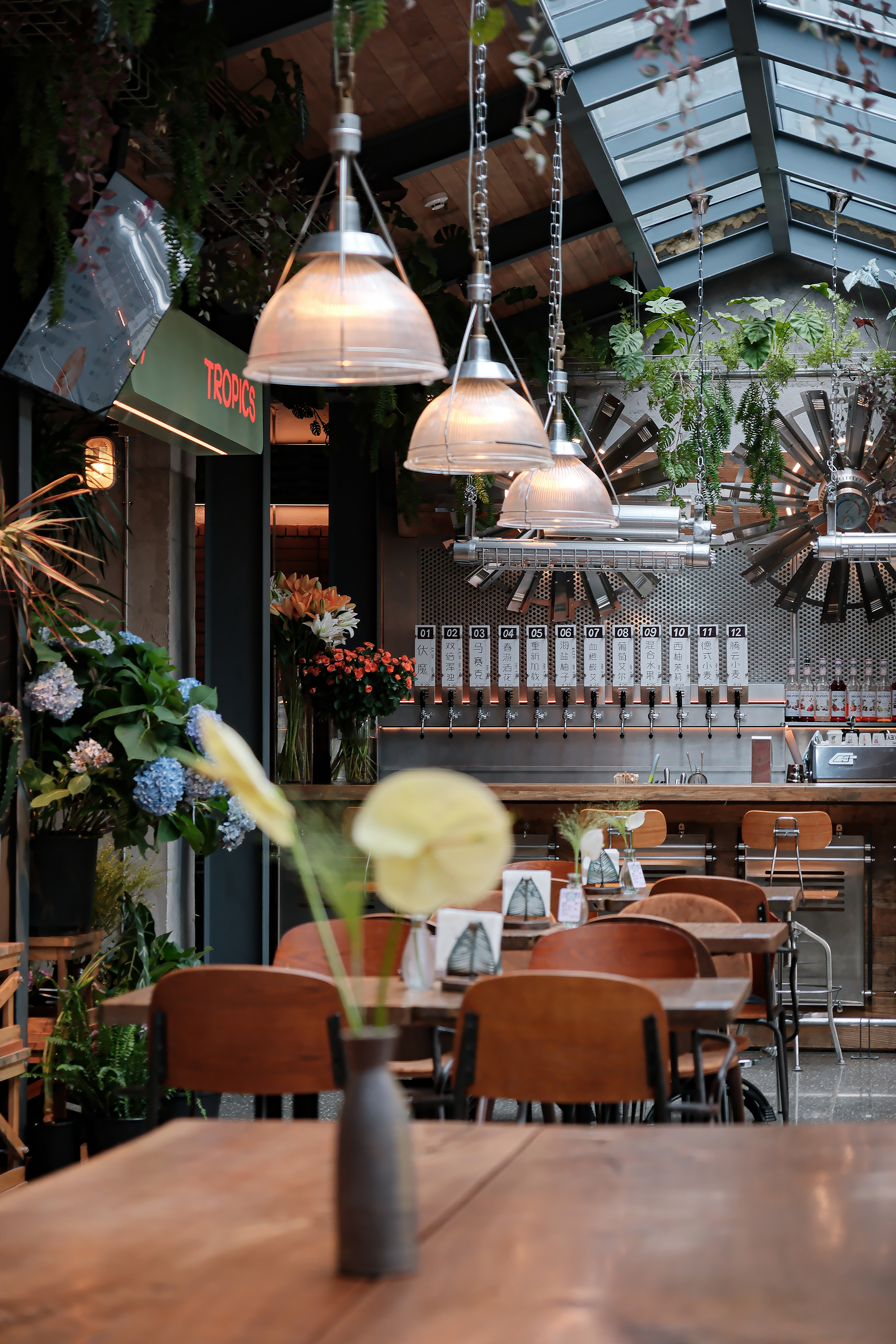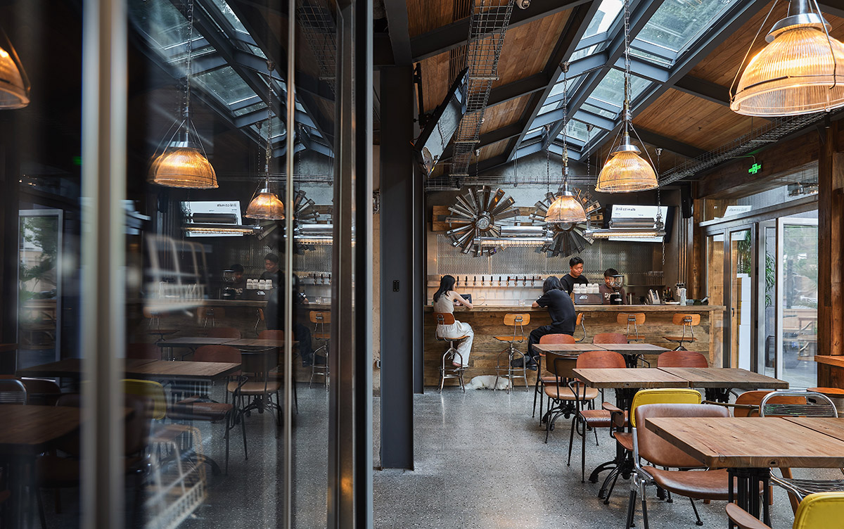 设计选材:用木头与红砖营造出空间的时代感,木质桌椅与金属底座搭配,简洁又容易打理,大量热带绿植围绕,营造出都市中的雨林花房场景