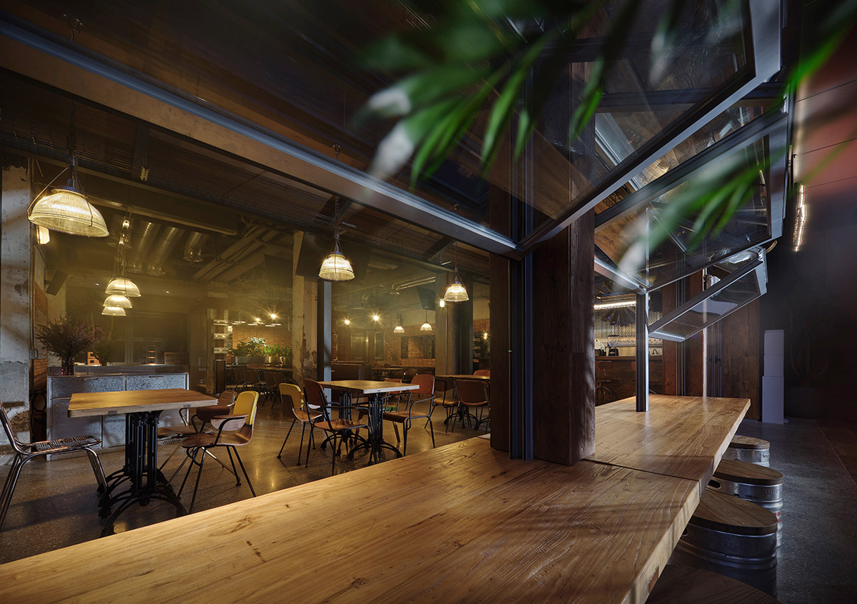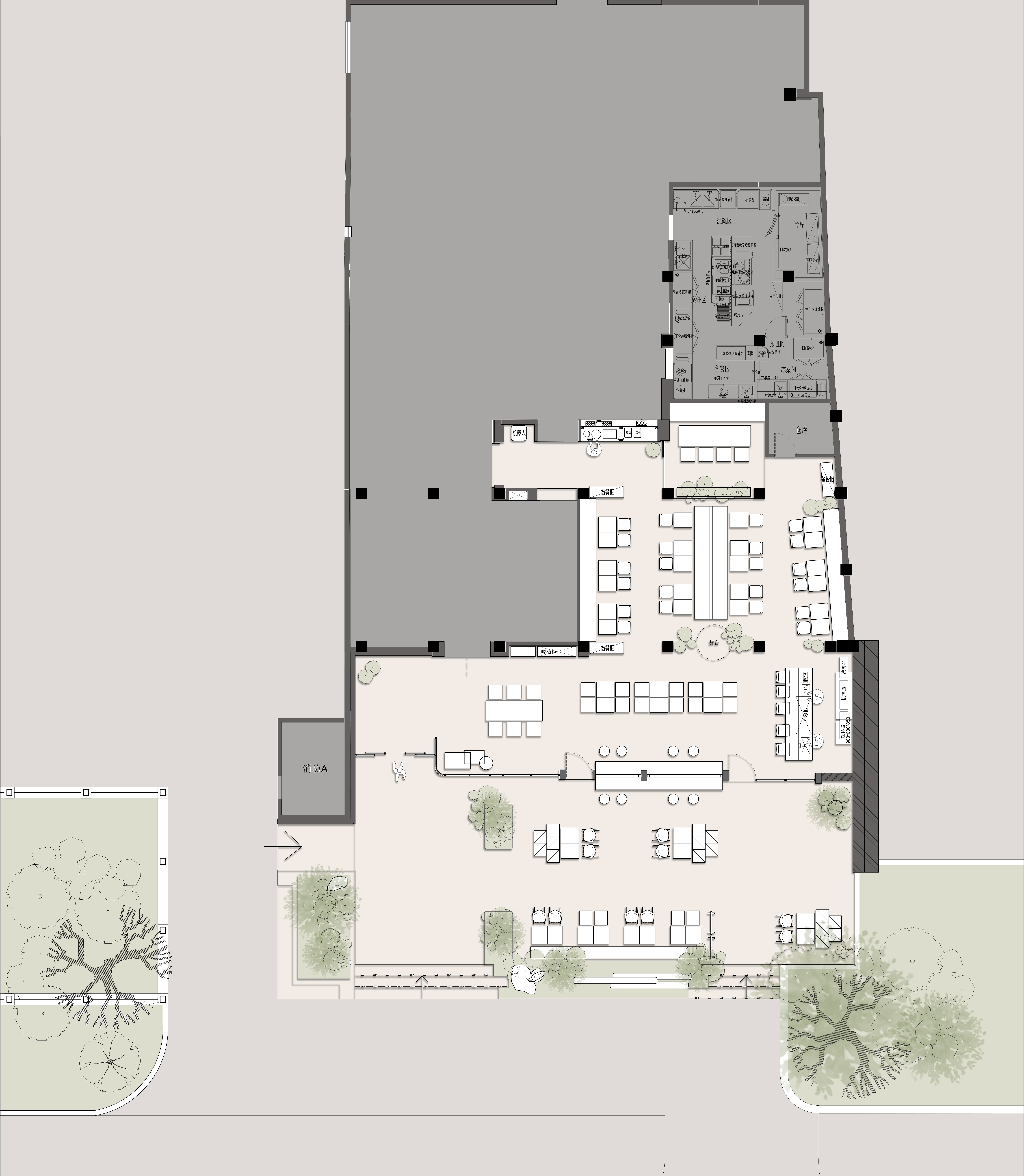 空间布局:餐吧入口处热带沙漠场景花园,方便顾客与路人进来休息或者打卡拍照,当折叠窗打开,雨林主题的室内空间又与室外交融延伸,融为一体