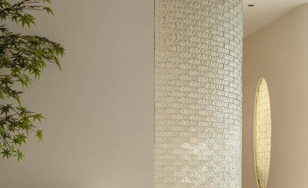 本案用微水泥,玻璃砖等可以让空间温柔的材质为主调,穿插几何曲线造型,再通过婆娑的光影变化与伊人形成一幅美伦画面。