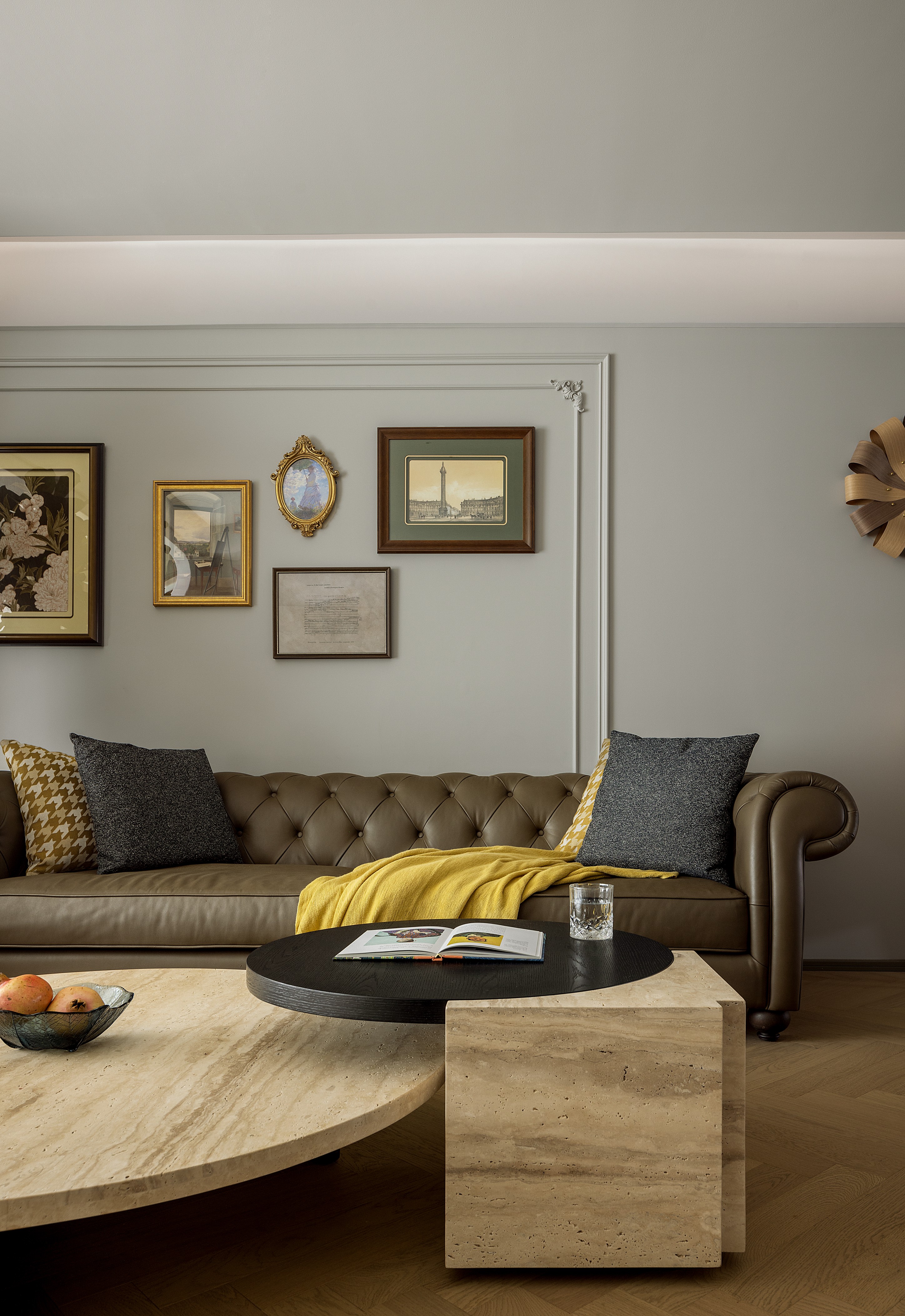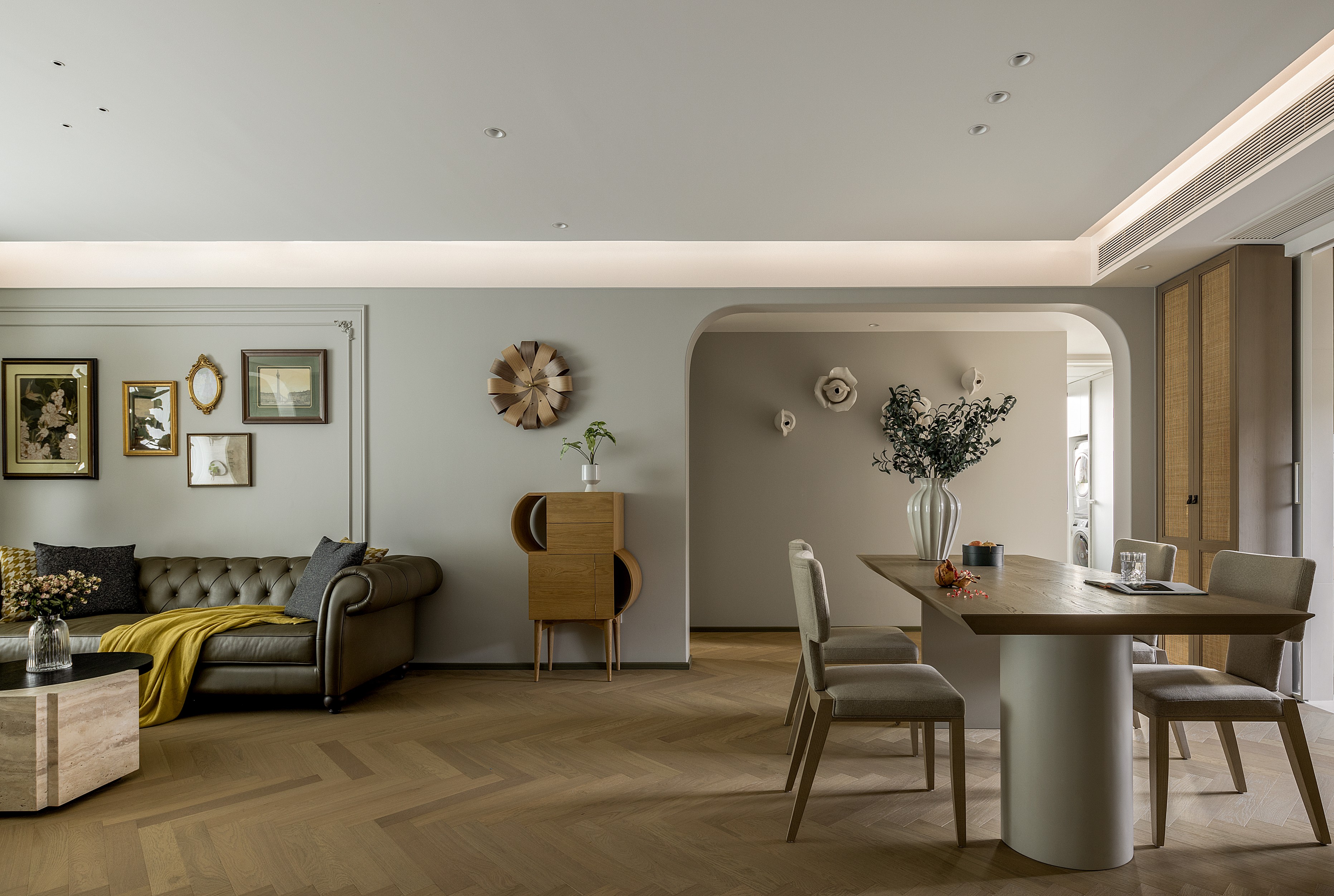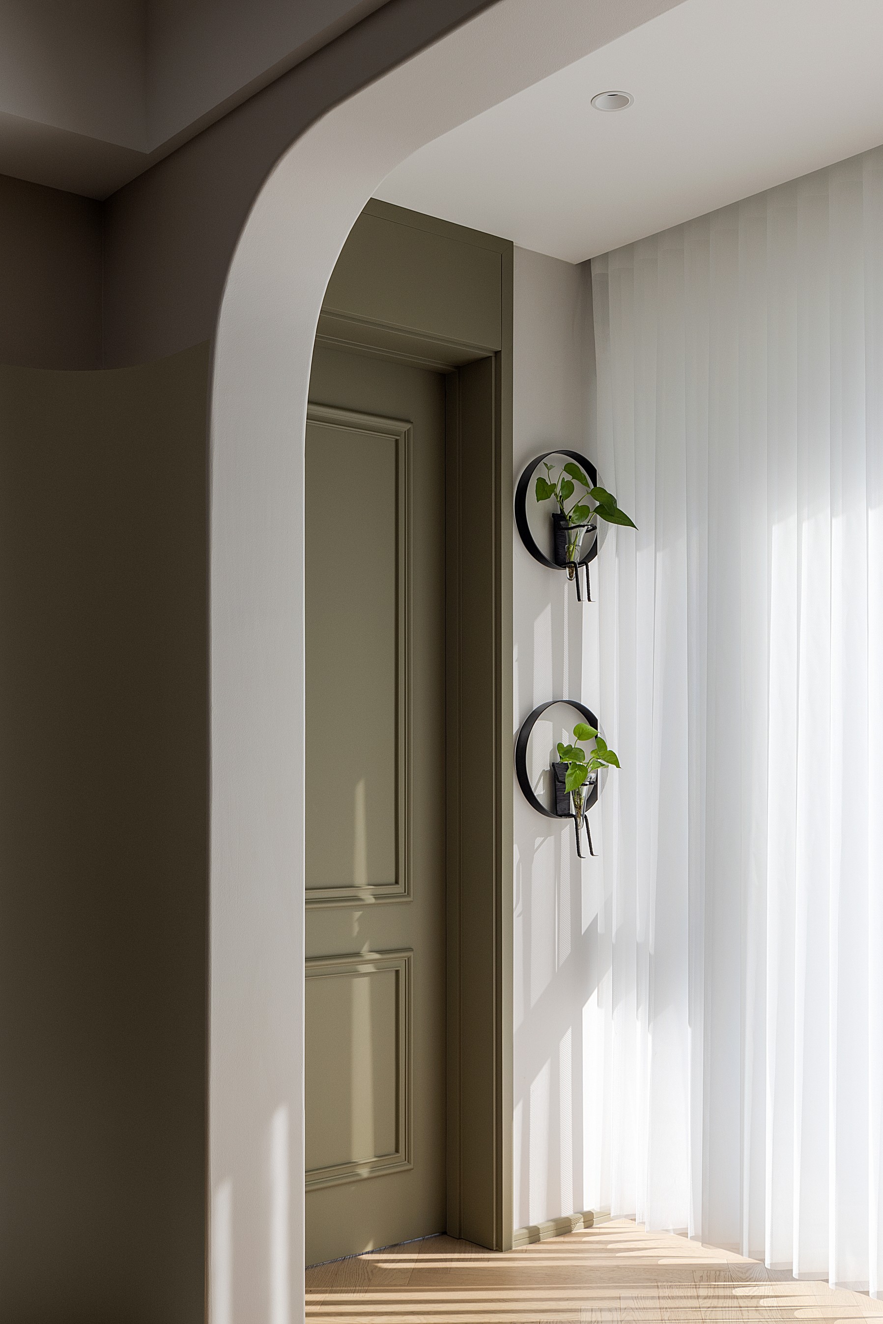 空间意境:从一套橄榄绿色的皮革沙发开始,根据沙发选定出墙面和门的颜色,引入了美式风格的石膏线线条,为了让家更具生活的气息,在现代简约的横平竖直的基础上融入了更多的原木元素,利用不规则的储物柜,别致造型的时钟,一定程度的提升了空间整体的艺术气息,洞石元素的加入,更是为整个空间赋予了岁月静好的安逸感。