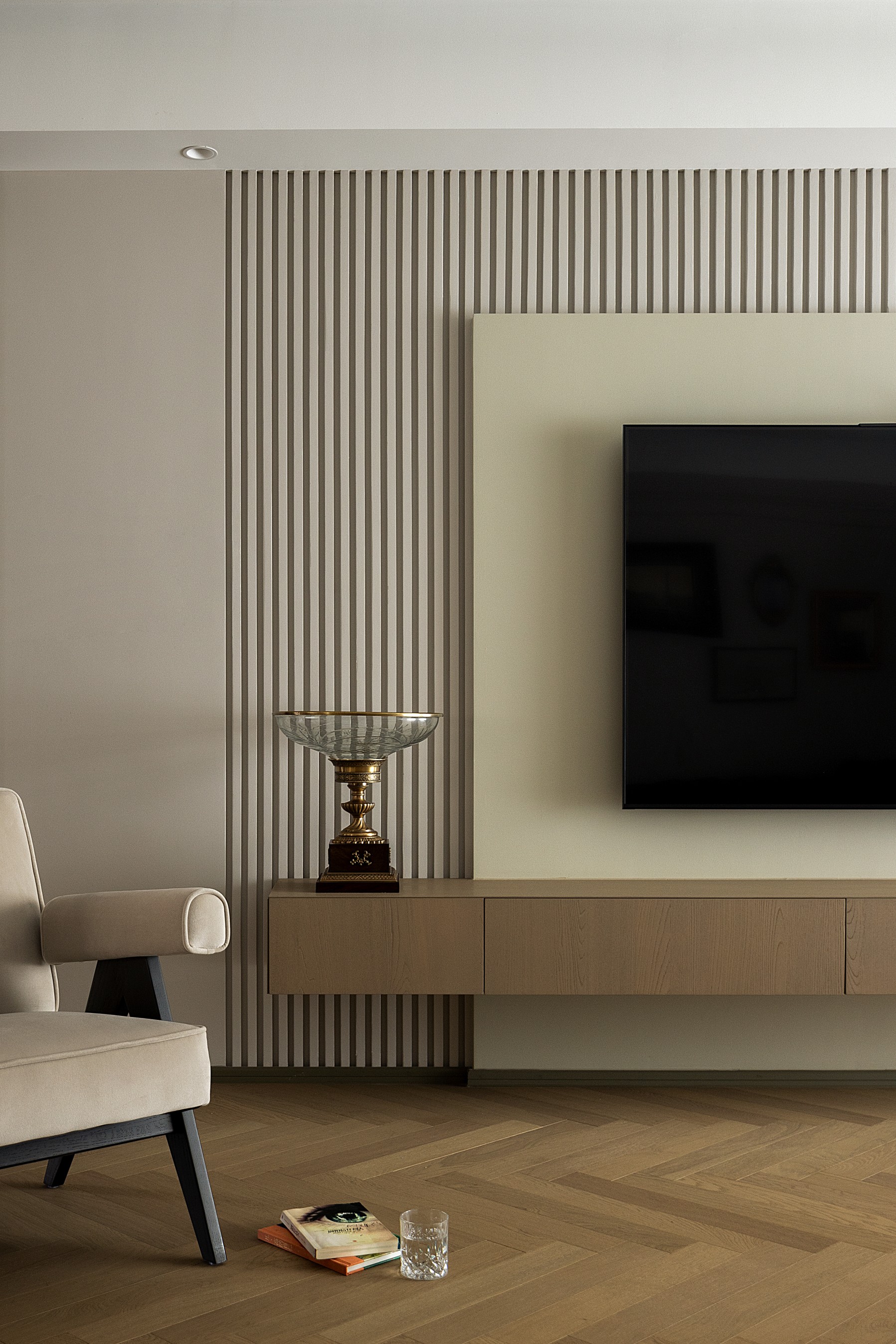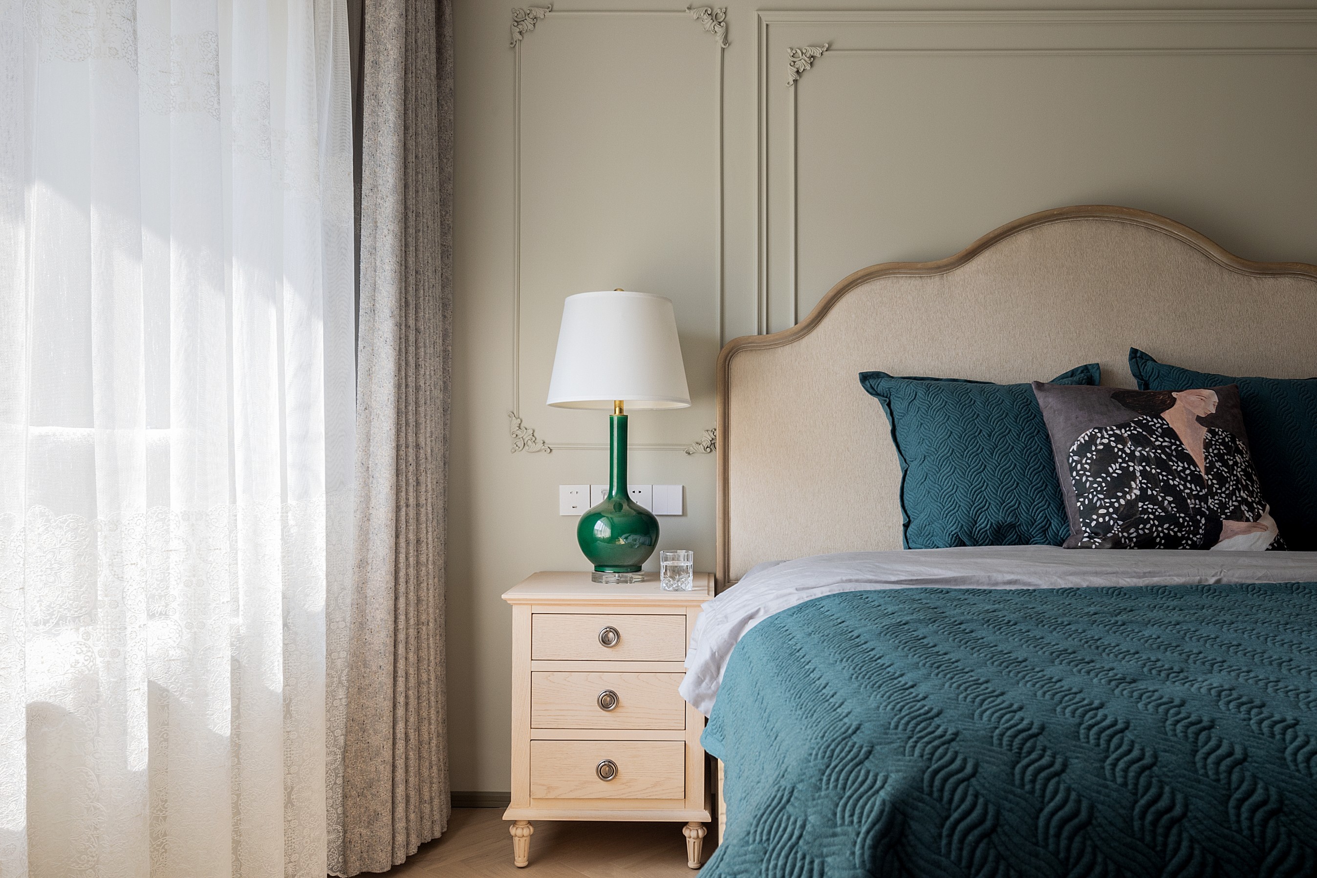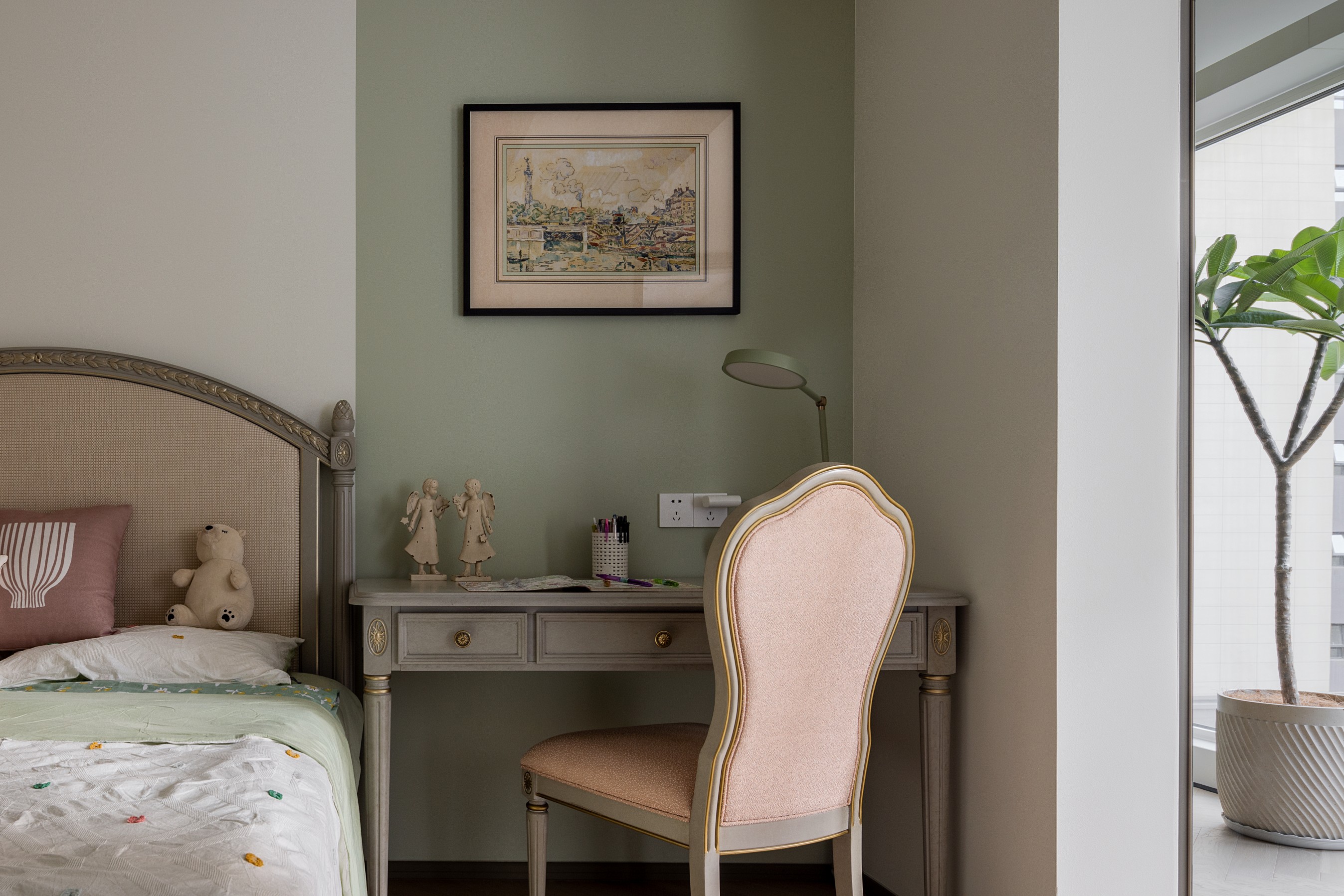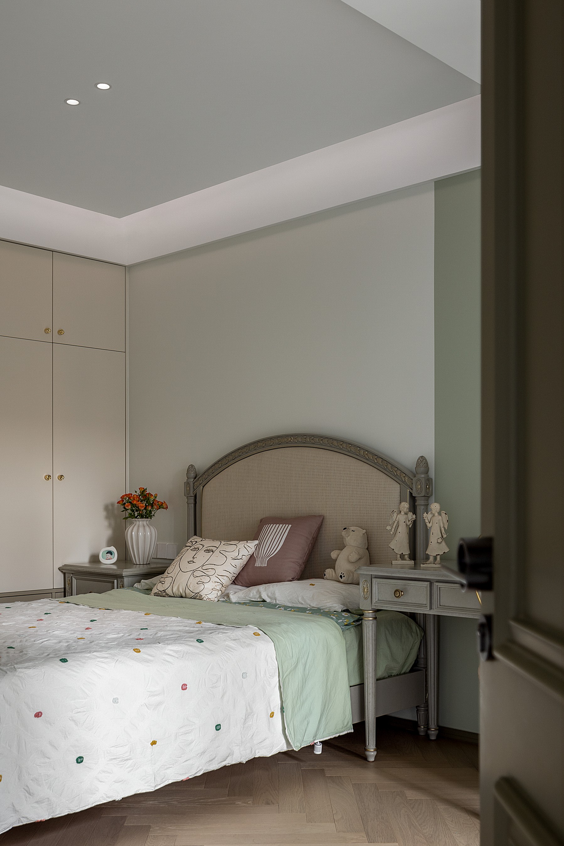 空间意境:从一套橄榄绿色的皮革沙发开始,根据沙发选定出墙面和门的颜色,引入了美式风格的石膏线线条,为了让家更具生活的气息,在现代简约的横平竖直的基础上融入了更多的原木元素,利用不规则的储物柜,别致造型的时钟,一定程度的提升了空间整体的艺术气息,洞石元素的加入,更是为整个空间赋予了岁月静好的安逸感。